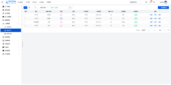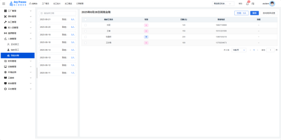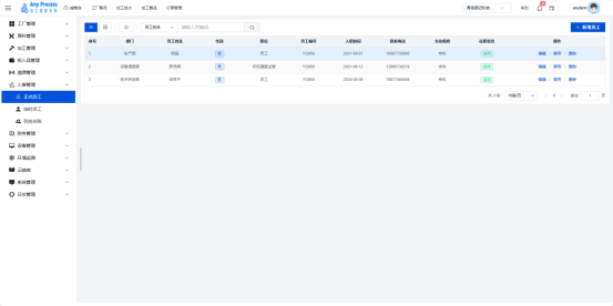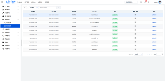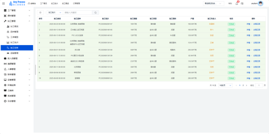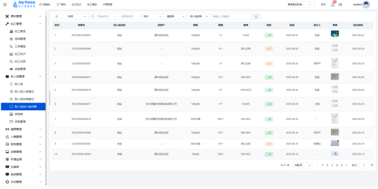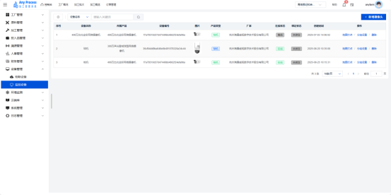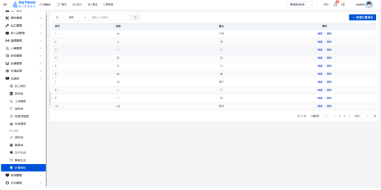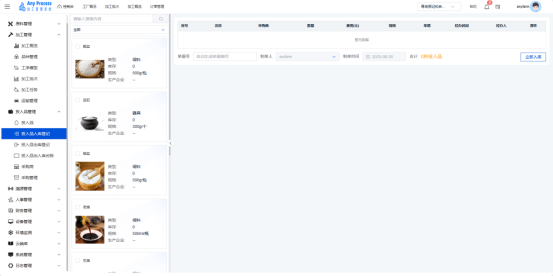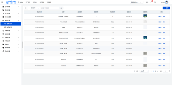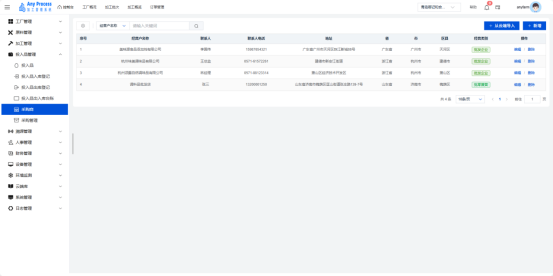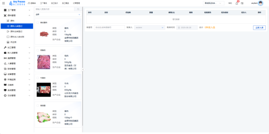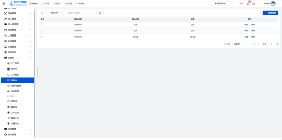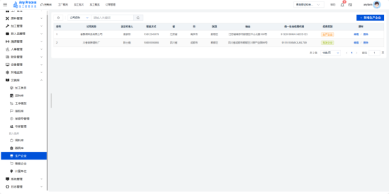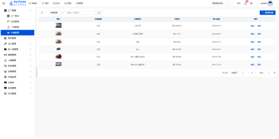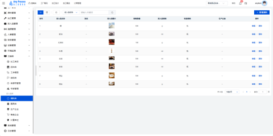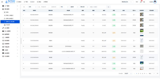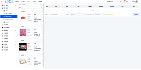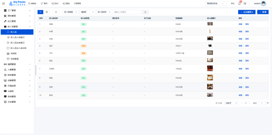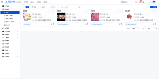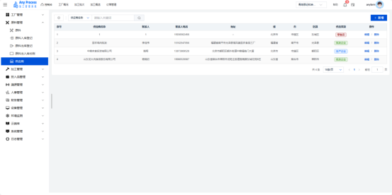 一、工厂管理 1.1工厂概况 该界面作为加工厂的首页及控制台界面,为用户呈现了加工厂的整体概况信息。该界面还为用户提供了便捷的操作入口,例如可以进行加工厂的编辑操作以及新增员工等常用功能,方便用户对加工厂的基本信息进行快速地了解和管理。  图1-1.1 点击首页的编辑则可跳转到编辑界面,该界面可以对加工厂的详细信息进行修改和补充,保证了加工厂信息的正确性和更新性。首页的告警信息板块也会时刻将加工厂出现的问题以醒目的方式展示出来,方便用户能第一时间看到信息,及时对加工厂出现的问题进行第一时间处理,保证加工厂的稳定运营。 1.2区域管理 区域管理模块是工厂管理板块的基础功能,聚焦工厂物理空间的区域化划分与管理。通过定义、维护工厂内不同作业区域(如东部、西部),为生产布局优化、设备管理、人员调度提供空间维度的数据支撑,助力企业规范工厂空间资源,提升生产运营效率 。  图1-2.1 新增:用户需要对加工厂进行新的区域划分时,可以点击新增进行新的区域的添加。 编辑:加工厂区域的信息存在缺失或有误,可以点击编辑对相关信息进行修改。 搜索:用户需要搜索某一区域的相关信息时,可以点击关键字搜索进行查询。 1.3厂房管理 厂房管理模块是工厂管理板块的核心功能,聚焦工厂厂房资源的数字化管理。通过整合厂房基础信息(数量、面积、区域分布)、空间布局与使用状态,为生产规划、资源调度、成本核算提供空间维度的数据支撑,助力企业优化厂房资源配置,提升生产运营效率 。  图1-3.1 在该界面点击厂房管理,则会跳转到厂房管理界面,该界面能对加工厂的每一个厂房的信息进行整合,让用户时刻把握每一个厂房的基本情况以及设备情况。若用户需要添加新的厂房,该界面也提供了相应的添加功能,点击添加,将新厂房的信息进行补录,保存即可。  图1-3.2 1.4车辆管理 车辆管理模块是工厂管理板块的重要组成,专注于工厂运输车辆资源的标准化管理。通过建档车辆基础信息(品牌、型号、车牌号 )、购置时间与状态,为物流调度、成本核算、设备维护提供数据支撑,助力企业规范车辆资源,保障原料运输、产品配送等环节高效运转 。  图1-4.1 新增车辆:用户需要增添新的车辆时,可以点击新增车辆进行添加,完善相关信息,点击保存即可添加新的车辆到该界面。 编辑:当该界面某一车辆信息出现错误或缺失时,点击编辑可以对该车辆的信息进行修改及补充。 删除:日常生产中,某些车辆会应现实因素导致不再需要,用户可以点击删除来删除该车辆的信息,保证该界面的简洁性。 搜索:需要某一车辆的大致信息时,可以通过关键字搜索来进行信息查询。 二、原料管理 2.1原料 原料模块是原料管理板块的核心功能,聚焦加工业务所需原料的标准化建档与全周期管理。通过记录原料基础信息(名称、类型、登记证号 )、生产企业、包装规格等,为原料采购、库存管控、生产配料提供数据支撑,助力企业规范原料资源,保障产品质量与生产流程顺畅 。  图2-1.1 新增:用户需要增加新的原料时,可以点击新增,填充新的原料相关信息,点击保存即可添加新原料到该界面。 编辑:若某些原料的信息有误或缺失,用户可以对相应原料点击编辑进行修改及补充,保证原料信息的完整性和正确性。 删除:存在不需要的原料信息时,可以点击删除来删除该原料的全部信息。 搜索:需要查找某一原料信息时,可以通过关键字的形式进行搜索,找到其相关信息。 用户如果需要原料的信息更直观更突出,也可以选择卡片式分布信息,该界面能极大程度上展示各个原料的信息,让用户能够对各个原料信息的精准定位。  图2-1.2 2.2原料入库登记 原料入库登记模块是原料管理板块的关键功能,聚焦加工业务原料入库环节的数字化流程管理。通过录入原料基础信息(名称、类型、库存 )、关联供应商、检验报告等,实现原料入库的规范化、可追溯化,为库存管理、生产配料提供准确的初始数据支撑 。 搜索:用户需要搜索目标原料进行入库时,可以在左侧列表上方搜索关键字来进行查询。 入库登记:将目标原料进行勾选后,将入库的相关信息进行补充后,点击立即入库,该原料的入库信息会被保存。  图2-2.1 2.3原料出库登记 原料出库登记模块是原料管理板块的关键功能,聚焦加工业务原料出库环节的数字化流程管理。通过录入原料出库信息(名称、规格、数量 )、关联检验报告、经办人等,实现原料出库的规范化、可追溯化,为生产配料、成本核算提供准确数据支撑,保障生产流程与库存管理的协同性 。 搜索:用户需要搜索目标原料进行出库时,可以在左侧列表上方搜索关键字来进行查询。 出库登记:将目标原料进行勾选后,将出库的相关信息进行补充后,点击立即出库,该原料的出库信息会被保存。  图2-3.1 2.4原料出入库台账 原料出入库台账模块是加工管理系统原料管理板块的核心功能,聚焦原料出入库全流程数据的集中化管理与追溯。通过整合入库、出库业务数据(如单据号、原料信息、操作记录 ),形成完整的原料流转台账,为库存管控、成本核算、质量追溯提供精准数据支撑,保障原料管理的透明化与规范化 。  图2-4.1 搜索:用户需要查找某一原料产品出入库的详细信息时可以通过上方列表的关键字搜索进行查询。 筛选:有时原料的出入库信息过于繁