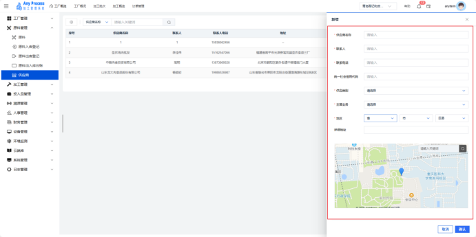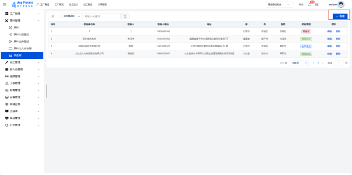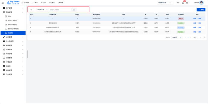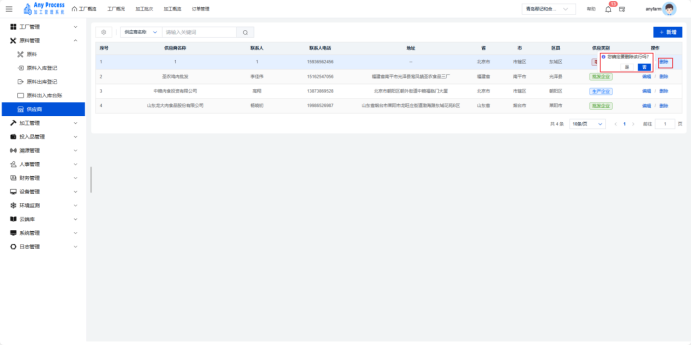 供应商模块是原料管理板块的重要组成,聚焦加工业务原料供应商的全维度信息管理。通过建档供应商基础信息(名称、联系人、地址)、经营资质(供应类别),为原料采购、供应链协同、供应商评估提供数据支撑,助力企业规范合作资源,保障原料供应稳定与合规 。  新增:点击右上角新增,出现新增弹窗,在新增弹窗中填写好相关信息,点击确认完成新增操作。   编辑:点击编辑,弹出编辑弹窗,将相应信息进行编辑修改,点击确认完成编辑操作。   删除:存在不需要的供应商信息时,用户可以点击删除,弹出提示界面,选择“是”,则删除该供应商信息,选择“否”则取消删除该供应商信息,用户需谨慎选择删除操作,避免造成损失。  搜索:在正上方选择供应商名称,输入供应商名称关键字,完成搜索操作。