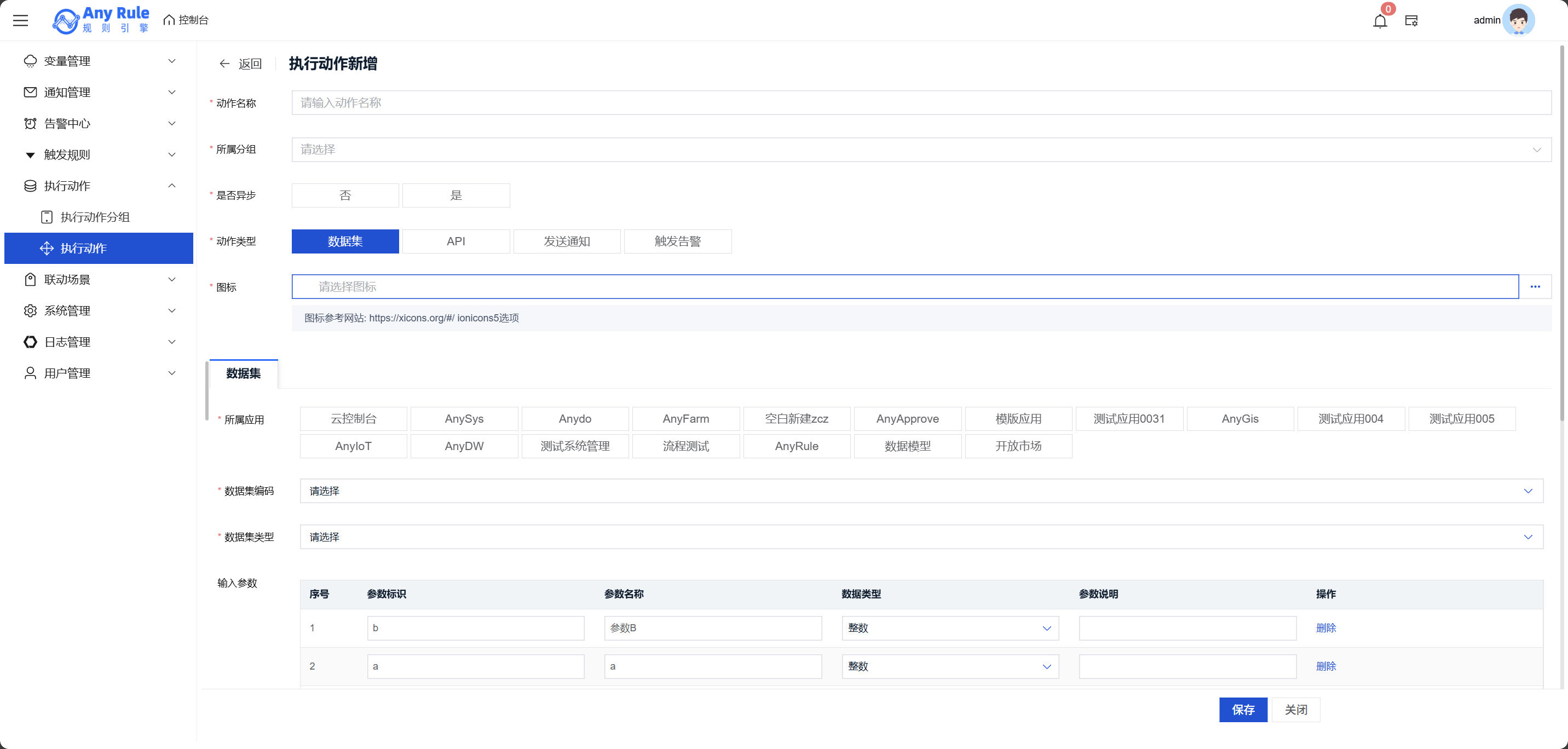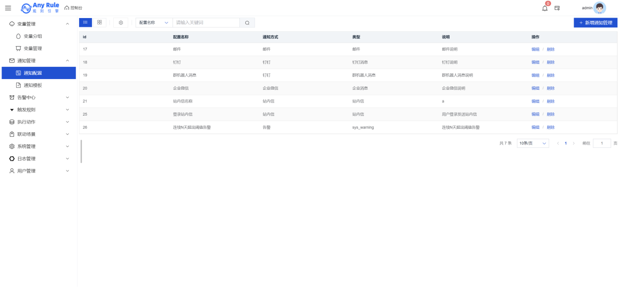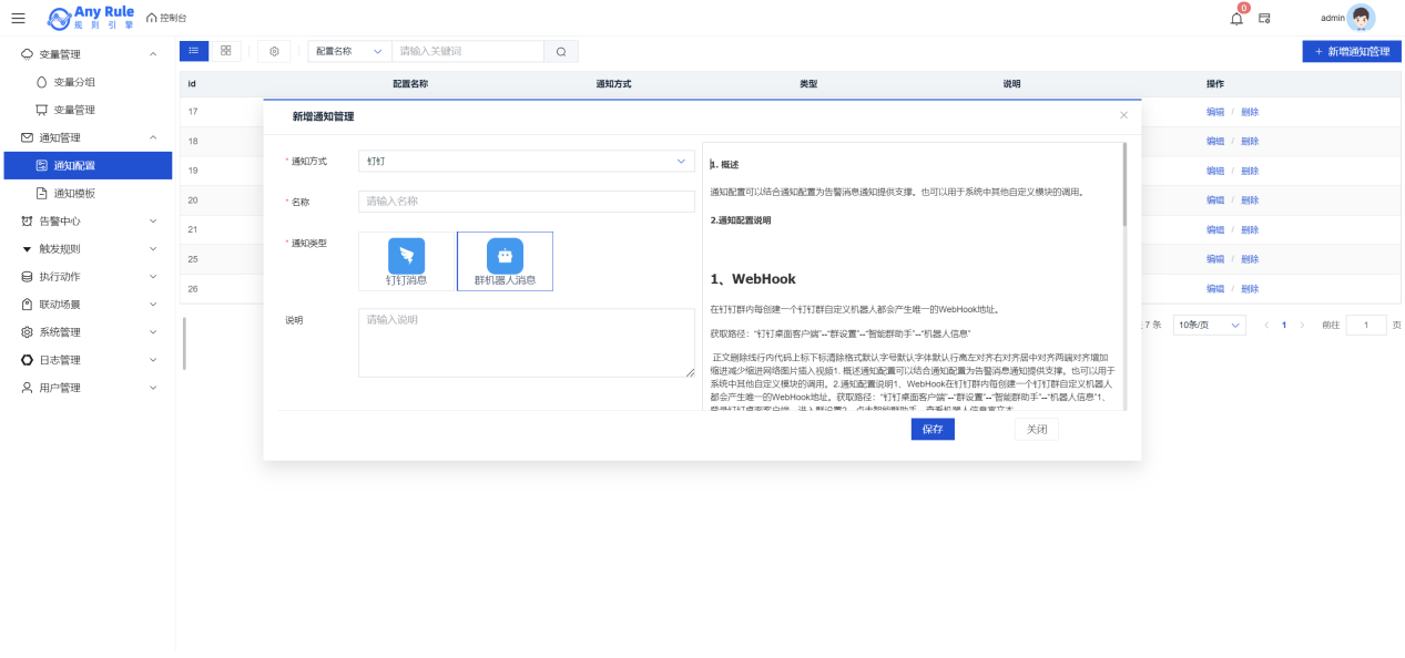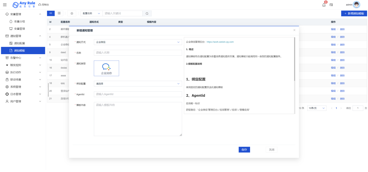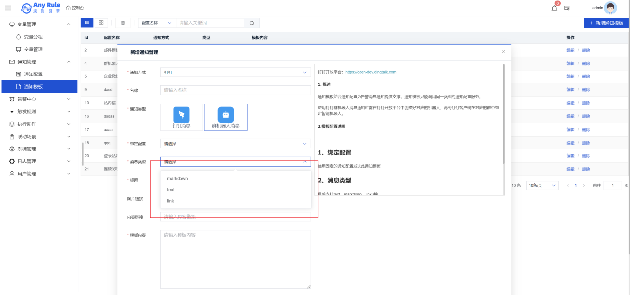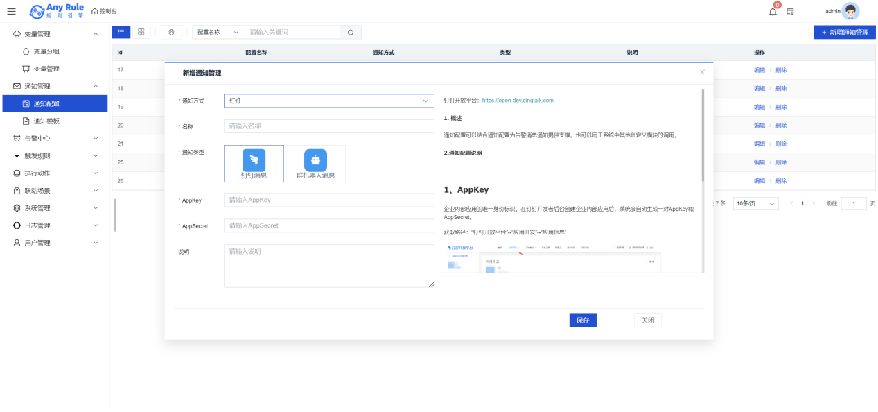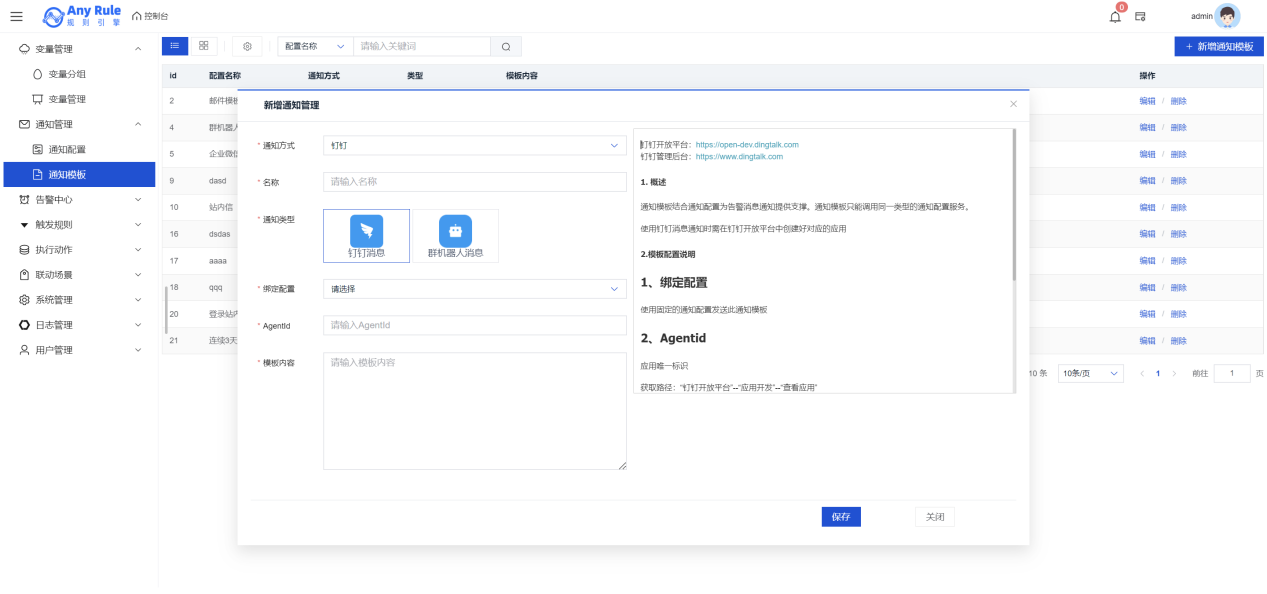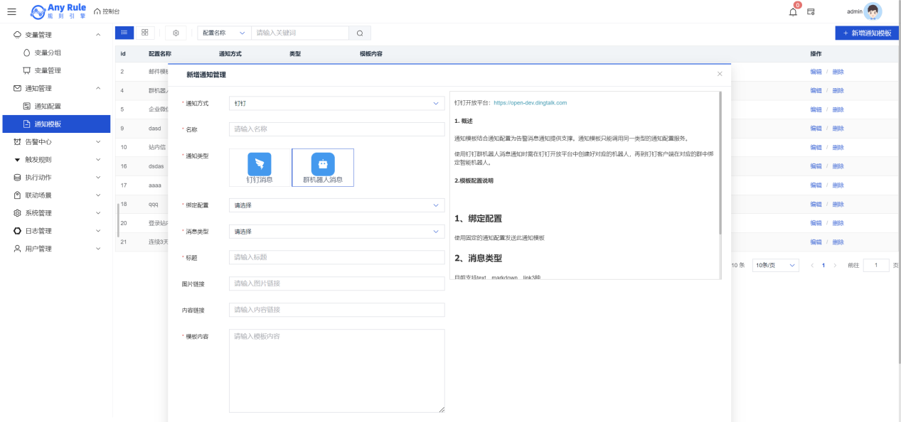 1.流程图  2.操作流程 2.1变量管理 2.1.1变量分组 将相关的变量分组在一起,可以更容易地管理和查找,在页面右上角有新增分组按钮。  点击新增分组打开新增分组弹窗,在新增分组弹窗中填写相对应的信息,点击保存完成分组的添加。在右侧还有编辑和删除的按钮可以对该行数据进行修改和删除的操作。   2.1.2变量管理 变量管理在规则引擎中负责存储、引用和传递数据,支持动态配置和数据模型设计,优化规则执行效率,并有助于错误处理和用户界面呈现,是实现业务规则自动化和灵活性的关键功能。  在右上角有新增变量按钮,点击按钮弹出新增变量弹窗,填写好相应的信息后点击保存完成变量新增。  这里的所属分组数据来自于变量分组中。  在变量管理右侧有设计按钮,点击设计进入变量设计页面,用户可以在此选择数据表和字段,配置变量名称、类型和值类型,并将选定的字段添加到变量中,最后通过点击“保存”按钮来保存变量配置。   2.2通知管理 2.2.1通知配置 通知配置可以结合通知配置为告警消息通知提供支撑。也可以用于系统中其他自定义模块的调用。  点击右上角的新增通知管理按钮,弹出新增通知管理弹窗,每个通知方式都有各自的配置信息,不同的通知类型也是。 通知方式:邮件 通知类型:邮件  通知方式:钉钉 通知类型:钉钉消息  通知方式:钉钉 通知类型:群机器人消息  通知方式:企业微信 通知类型:企业消息  通知方式:站内信 通知类型:站内信  可以根据不同的需求配置通知管理。 2.2.2通知模板 在规则引擎中,通知模板的作用是提供一种标准化和可配置的方式来生成和发送通知。  每个通知方式和通知类型都有各自的配置信息。 通知方式:钉钉 通知类型:钉钉消息  通知方式:钉钉 通知类型:群机器人消息  在群机器人中不同的消息类型也有不同的配置信息。  通知方式:企业微信 通知类型:企业消息  通知方式:邮件 通知类型:邮件  通知方式:站内信 通知类型:站内信  2.3告警中心 2.3.1告警级别配置 用户可以在此界面中查看、添加、编辑和删除告警级别,为每个级别设置名称、等级、颜色和图标,并通过搜索框快速查找特定告警级别,以便于管理和区分不同严重程度的告警事件。  2.3.2告警类型设置 告警类型在告警管理中的作用是将告警事件分类。  2.3.3告警设置 告警设置在告警管理中的作用是定义触发告警的具体条件、配置告警的严重级别、指定通知方式和内容。  点击右上角的新增告警设置按钮,跳转到告警设置新增页面,在这里可以配置告警类型、告警级别、告警名称、告警订阅的信息。告警类型信息来自于告警类型设置中,告警级别来自于告警级别设置好中。  2.4触发规则 2.4.1触发规则分组 触发规则分组可以将不同类型的触发规则归类到一起,使规则引擎的结构更加清晰、易于理解和维护。  2.4.2触发规则 触发规则负责根据预设的条件判断何时启动规则的执行。当满足特定的触发条件时,规则引擎会自动激活相应的规则逻辑,从而实现对数据的处理、决策的制定或业务流程的推进。  点击右上角的新增规则按钮弹出新增规则弹窗,输入好相应的信息点击保存完成触发规则的新增。  所属分组中的分组数据来自于触发规则分组当中。  点击右侧的设计进入规则设计页面。在规则设计页面中有两个板块,分别为绑定变量和功能。  在绑定变量中,选择所属的应用,接着选择数据表,选择完对应的数据表后在表字段中会显示该数据表中的所有字段,勾选需要的字段点击下方保存完成绑定变量。  (功能页面) 在这边可以给触发规则添加他的功能,点击右上角的新增功能按钮弹出新增功能弹窗。  新增功能弹窗分为两种,一种是数据集,一种是api。 功能类型:数据集 首先输入功能名称,选择功能类型为数据集,接着选择所属应用,选择完所属应用后在数据集ID中会显示该应用对应的数据集ID,选择好数据集ID接着在下方添加入参和出参,点击保存完成功能的添加。  功能类型:api  功能类型为api的则是在输入完功能名称后选择功能类型为api,选择需要的API_ID后添加入参和出参,点击保存即可完成功能添加。  2.5执行动作 2.5.1执行动作分组 执行动作分组可以将不同类型的执行动作归类到一起,使规则引擎的结构更加清晰、易于理解和维护。  2.5.2执行动作 执行动作是规则引擎中的核心功能组件,其作用在于当预定义的条件规则被满足时,自动触发预设的业务操作或逻辑处理(如数据更新、消息推送、流程跳转、外部接口调用等)。  点击右上角的新增动作按钮进入执行动作新增页面。 执行动作新增中每个动作类型有各自的动作类型配置。 执行动作:数据集   执行动作:API   执行动作:发送通知 在执行动作:发送通知中,有四种通知方式,分别为钉钉、企业微信、邮件、站内信,他们也有各自配置面板。 通知方式:钉钉 通知类型:钉钉消息  根据不同的需求填写对应的信息,点击下方保存完成执行动作的新增。 2.6联动场景 2.6.1场景联动分组 场景联动分组可以将不同类型的场景归类到一起,使规则引擎的结构更加清晰、易于理解和维护。  2.6.2场景联动 场景联动在规则引擎中通过定义条件触发的跨系统或跨流程协同机制,使规则引擎能够基于实时数据动态协调多个场景的交互与操作,从而实现复杂业务逻辑的自动化响应。它增强了规则引擎的灵活性与适