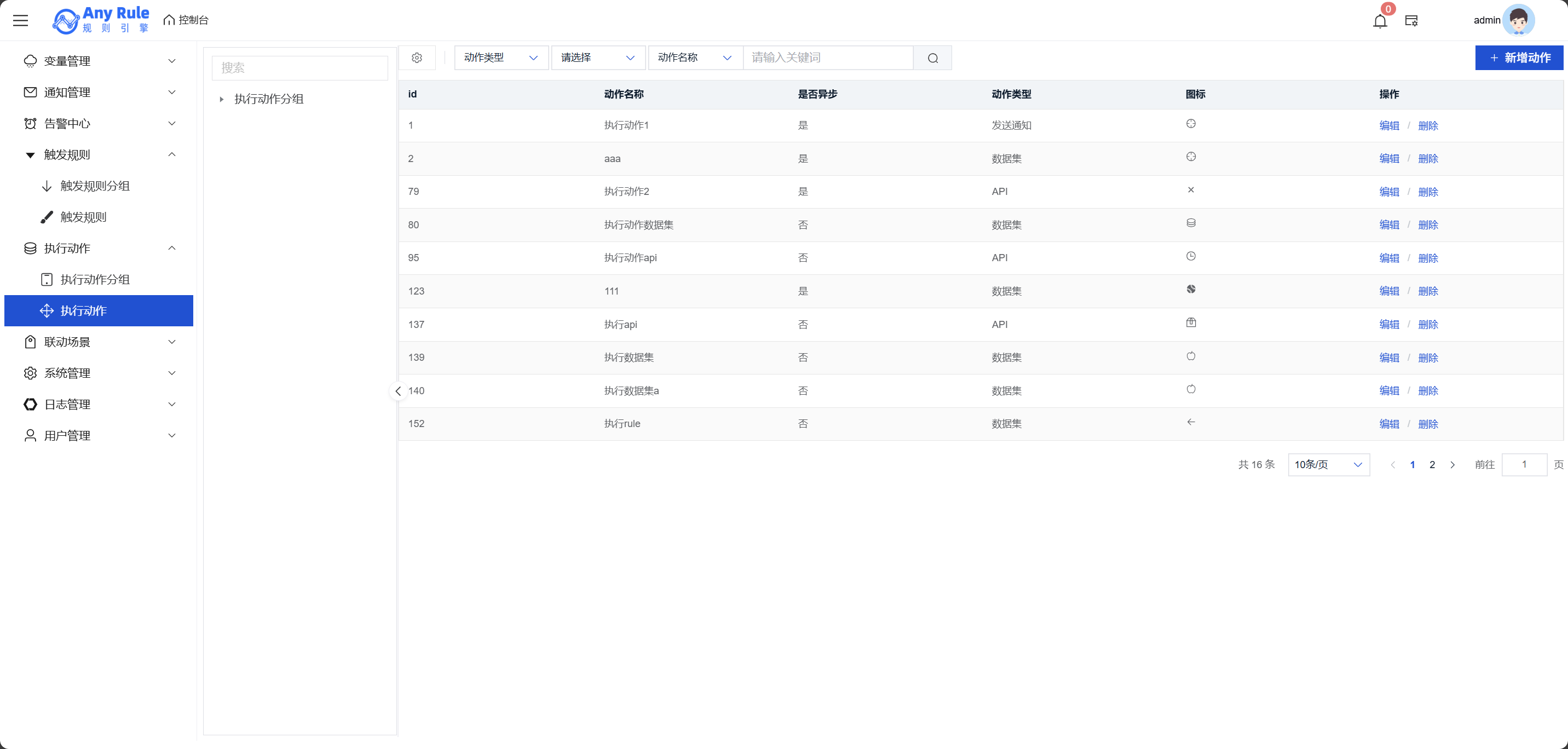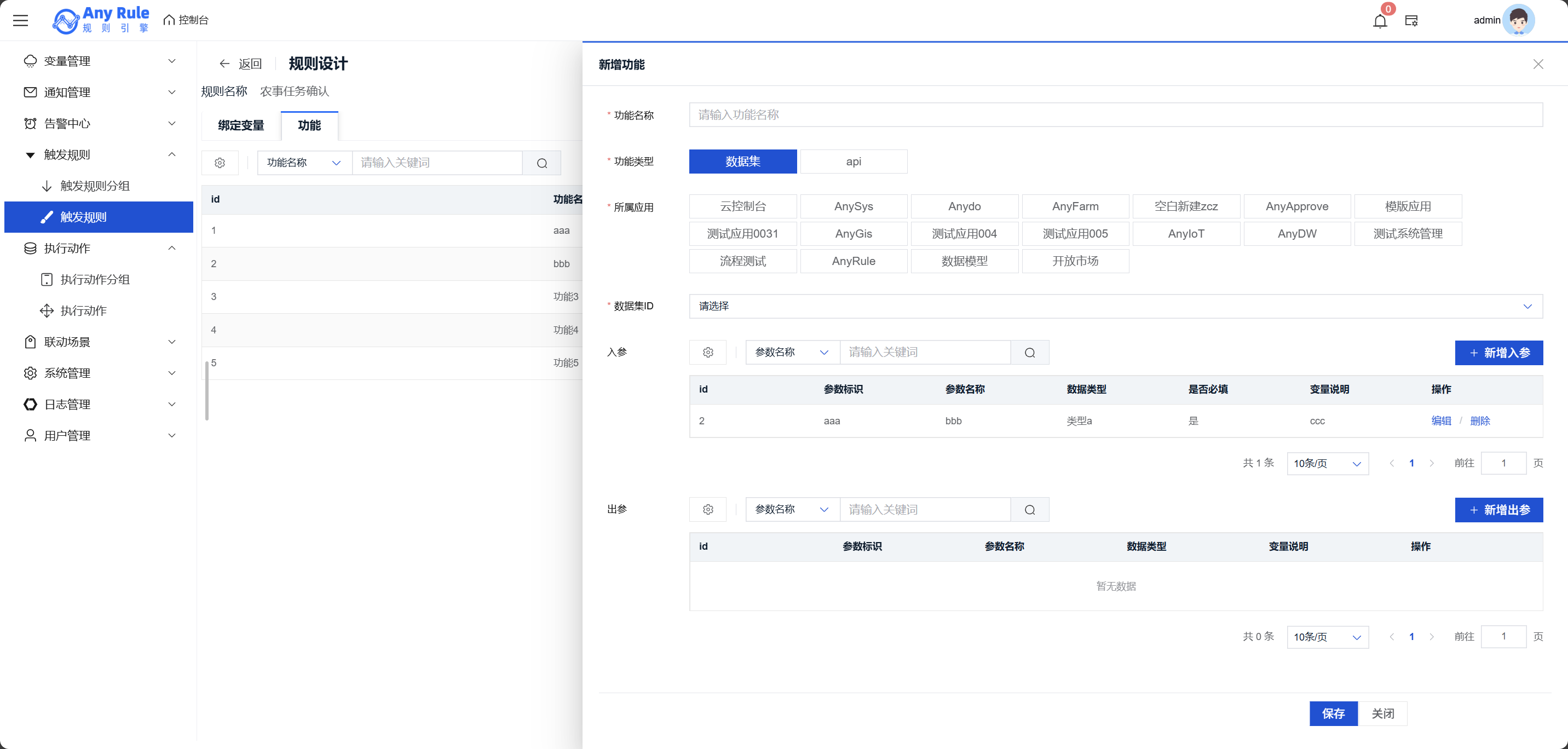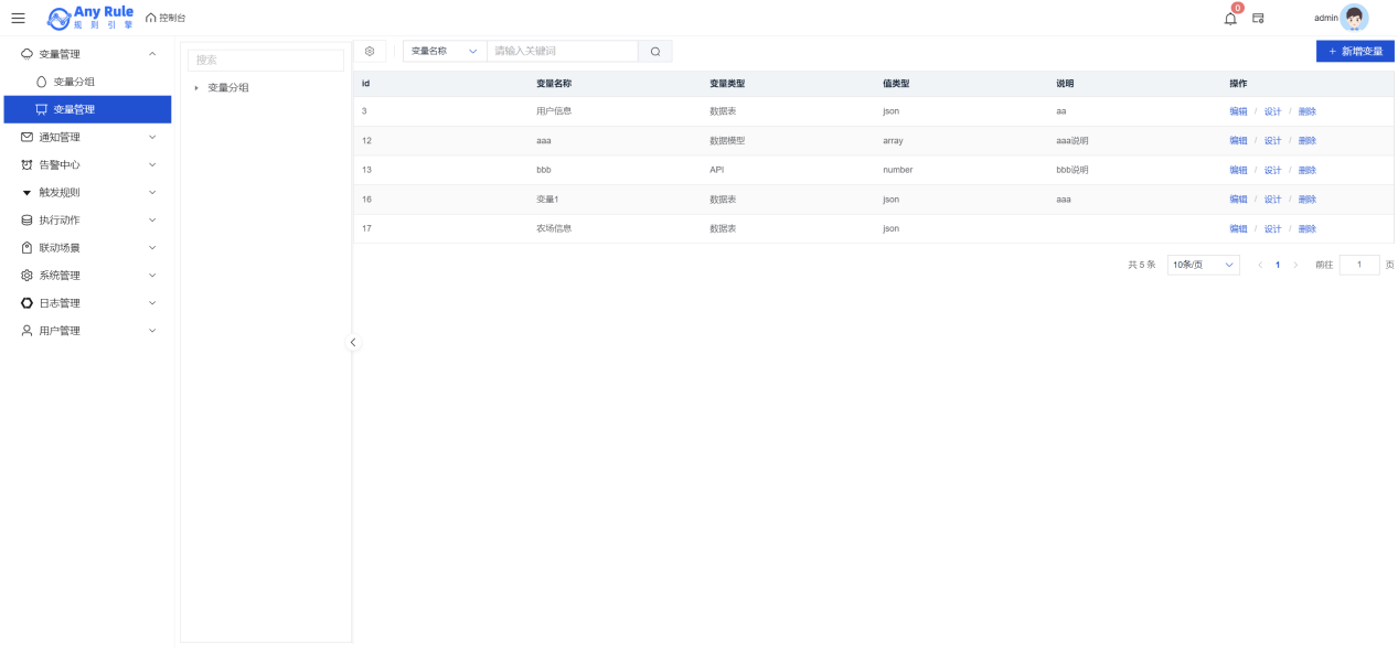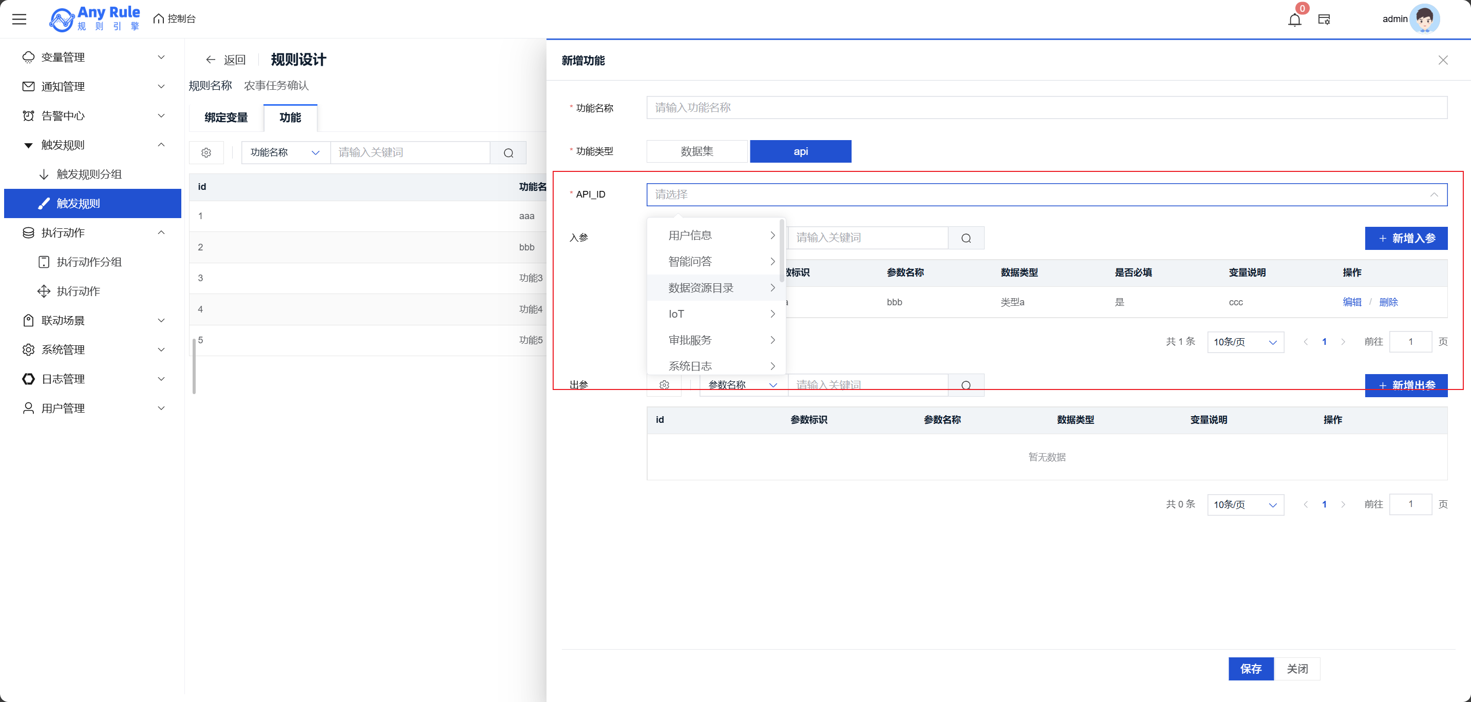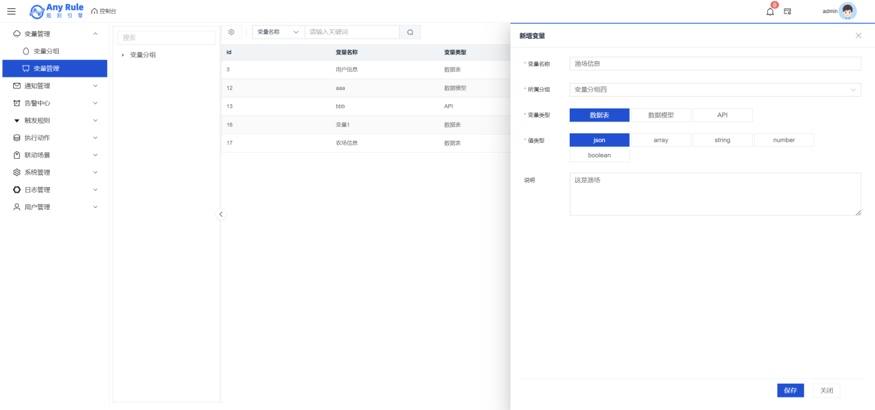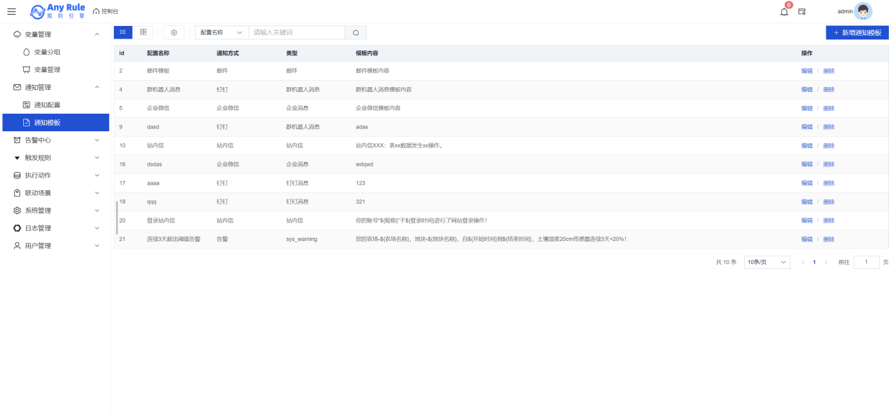 1.流程图  2.操作流程 2.1变量管理 2.1.1变量分组 将相关的变量分组在一起,可以更容易地管理和查找,在页面右上角有新增分组按钮。  点击新增分组打开新增分组弹窗,在新增分组弹窗中填写相对应的信息,点击保存完成分组的添加。在右侧还有编辑和删除的按钮可以对该行数据进行修改和删除的操作。   2.1.2变量管理 变量管理在规则引擎中负责存储、引用和传递数据,支持动态配置和数据模型设计,优化规则执行效率,并有助于错误处理和用户界面呈现,是实现业务规则自动化和灵活性的关键功能。  在右上角有新增变量按钮,点击按钮弹出新增变量弹窗,填写好相应的信息后点击保存完成变量新增。  这里的所属分组数据来自于变量分组中。  在变量管理右侧有设计按钮,点击设计进入变量设计页面,用户可以在此选择数据表和字段,配置变量名称、类型和值类型,并将选定的字段添加到变量中,最后通过点击“保存”按钮来保存变量配置。   2.2通知管理 2.2.1通知配置 通知配置可以结合通知配置为告警消息通知提供支撑。也可以用于系统中其他自定义模块的调用。  点击右上角的新增通知管理按钮,弹出新增通知管理弹窗,每个通知方式都有各自的配置信息,不同的通知类型也是。 通知方式:邮件 通知类型:邮件  通知方式:钉钉 通知类型:钉钉消息  通知方式:钉钉 通知类型:群机器人消息  通知方式:企业微信 通知类型:企业消息  通知方式:站内信 通知类型:站内信  可以根据不同的需求配置通知管理。 2.2.2通知模板 在规则引擎中,通知模板的作用是提供一种标准化和可配置的方式来生成和发送通知。  每个通知方式和通知类型都有各自的配置信息。 通知方式:钉钉 通知类型:钉钉消息  通知方式:钉钉 通知类型:群机器人消息  在群机器人中不同的消息类型也有不同的配置信息。  通知方式:企业微信 通知类型:企业消息  通知方式:邮件 通知类型:邮件  通知方式:站内信 通知类型:站内信  2.3告警中心 2.3.1告警级别配置 用户可以在此界面中查看、添加、编辑和删除告警级别,为每个级别设置名称、等级、颜色和图标,并通过搜索框快速查找特定告警级别,以便于管理和区分不同严重程度的告警事件。  2.3.2告警类型设置 告警类型在告警管理中的作用是将告警事件分类。  2.3.3告警设置 告警设置在告警管理中的作用是定义触发告警的具体条件、配置告警的严重级别、指定通知方式和内容。  点击右上角的新增告警设置按钮,跳转到告警设置新增页面,在这里可以配置告警类型、告警级别、告警名称、告警订阅的信息。告警类型信息来自于告警类型设置中,告警级别来自于告警级别设置好中。  2.4触发规则 2.4.1触发规则分组 触发规则分组可以将不同类型的触发规则归类到一起,使规则引擎的结构更加清晰、易于理解和维护。  2.4.2触发规则 触发规则负责根据预设的条件判断何时启动规则的执行。当满足特定的触发条件时,规则引擎会自动激活相应的规则逻辑,从而实现对数据的处理、决策的制定或业务流程的推进。  点击右上角的新增规则按钮弹出新增规则弹窗,输入好相应的信息点击保存完成触发规则的新增。  所属分组中的分组数据来自于触发规则分组当中。  点击右侧的设计进入规则设计页面。在规则设计页面中有两个板块,分别为绑定变量和功能。  在绑定变量中,选择所属的应用,接着选择数据表,选择完对应的数据表后在表字段中会显示该数据表中的所有字段,勾选需要的字段点击下方保存完成绑定变量。  (功能页面) 在这边可以给触发规则添加他的功能,点击右上角的新增功能按钮弹出新增功能弹窗。  新增功能弹窗分为两种,一种是数据集,一种是api。 功能类型:数据集 首先输入功能名称,选择功能类型为数据集,接着选择所属应用,选择完所属应用后在数据集ID中会显示该应用对应的数据集ID,选择好数据集ID接着在下方添加入参和出参,点击保存完成功能的添加。  功能类型:api  功能类型为api的则是在输入完功能名称后选择功能类型为api,选择需要的API_ID后添加入参和出参,点击保存即可完成功能添加。  2.5执行动作 2.5.1执行动作分组 执行动作分组可以将不同类型的执行动作归类到一起,使规则引擎的结构更加清晰、易于理解和维护。  2.5.2执行动作 执行动作是规则引擎中的核心功能组件,其作用在于当预定义的条件规则被满足时,自动触发预设的业务操作或逻辑处理(如数据更新、消息推送、流程跳转、外部接口调用等)。  点击右上角的新增动作按钮进入执行动作新增页面。 执行动作新增中每个动作类型有各自的动作类型配置。 执行动作:数据集   执行动作:API   执行动作:发送通知 在执行动作:发送通知中,有四种通知方式,分别为钉钉、企业微信、邮件、站内信,他们也有各自配置面板。 通知方式:钉钉 通知类型:钉钉消息  根据不同的需求填写对应的信息,点击下方保存完成执行动作的新增。 2.6联动场景 2.6.1场景联动分组 场景联动分组可以将不同类型的场景归类到一起,使规则引擎的结构更加清晰、易于理解和维护。  2.6.2场景联动 场景联动在规则引擎中通过定义条件触发的跨系统或跨流程协同机制,使规则引擎能够基于实时数据动态协调多个场景的交互与操作,从而实现复杂业务逻辑的自动化响应。它增强了规则引擎的灵活性与适
