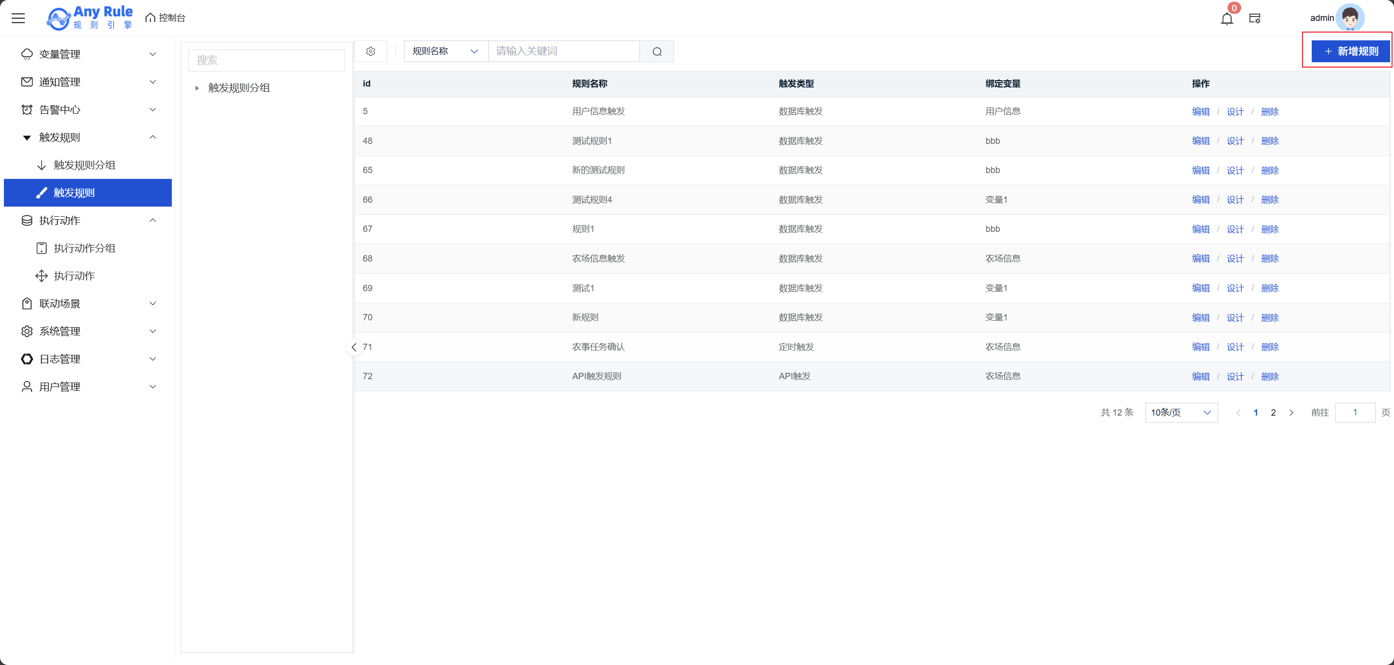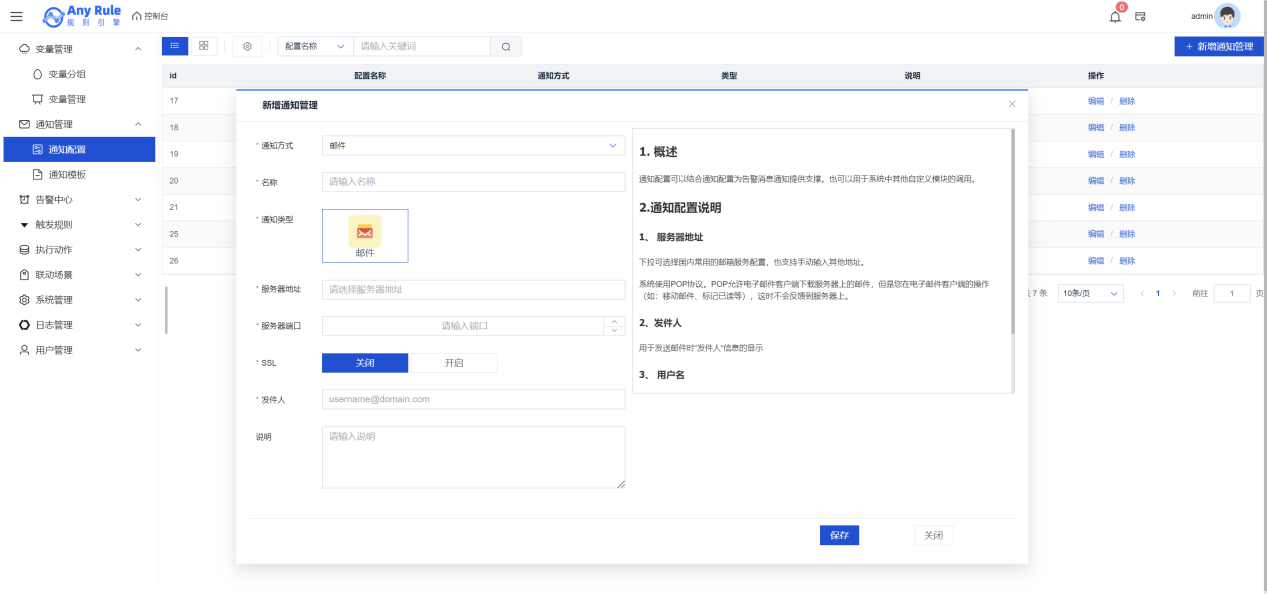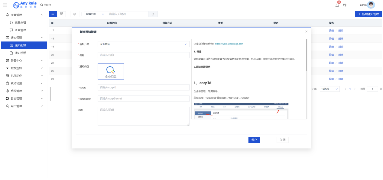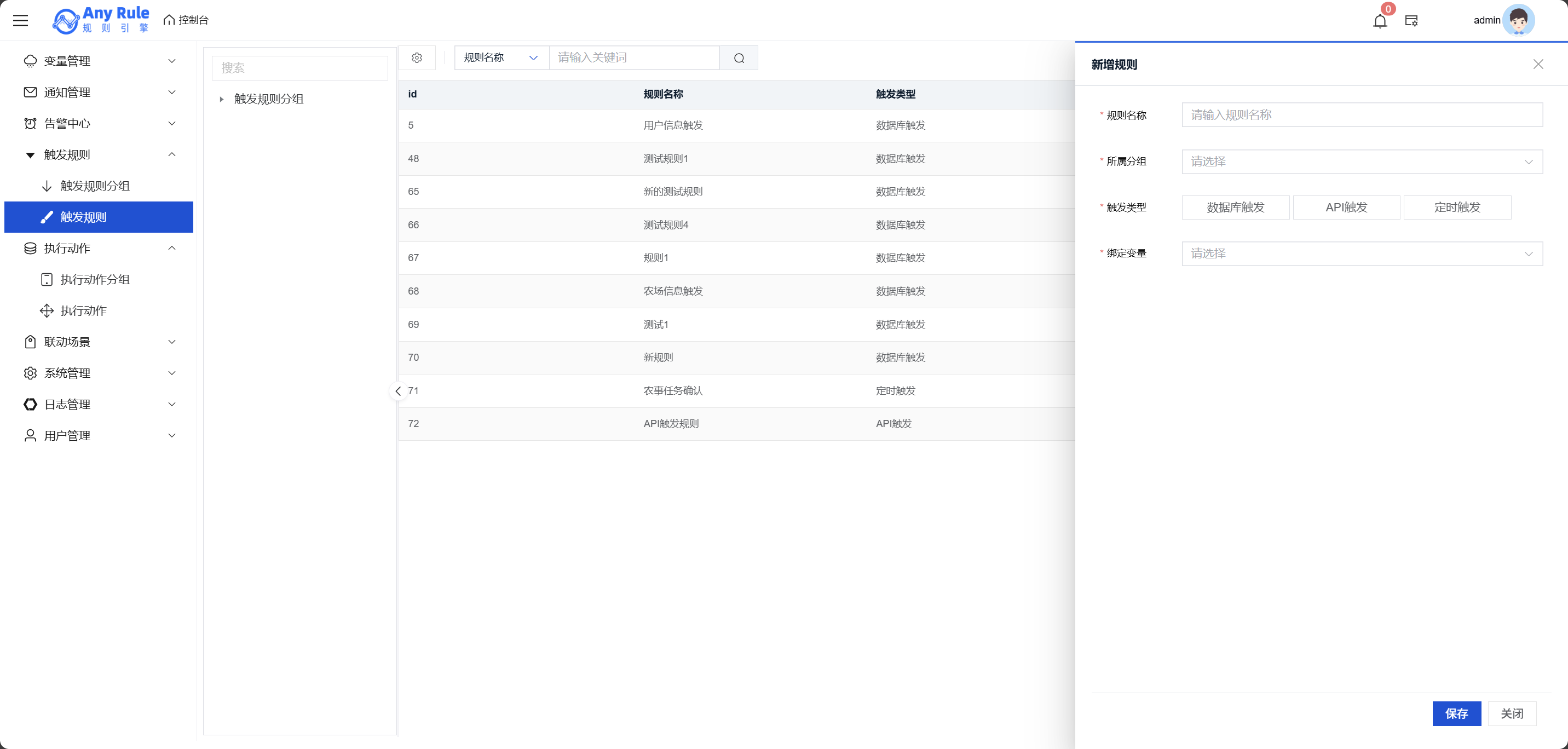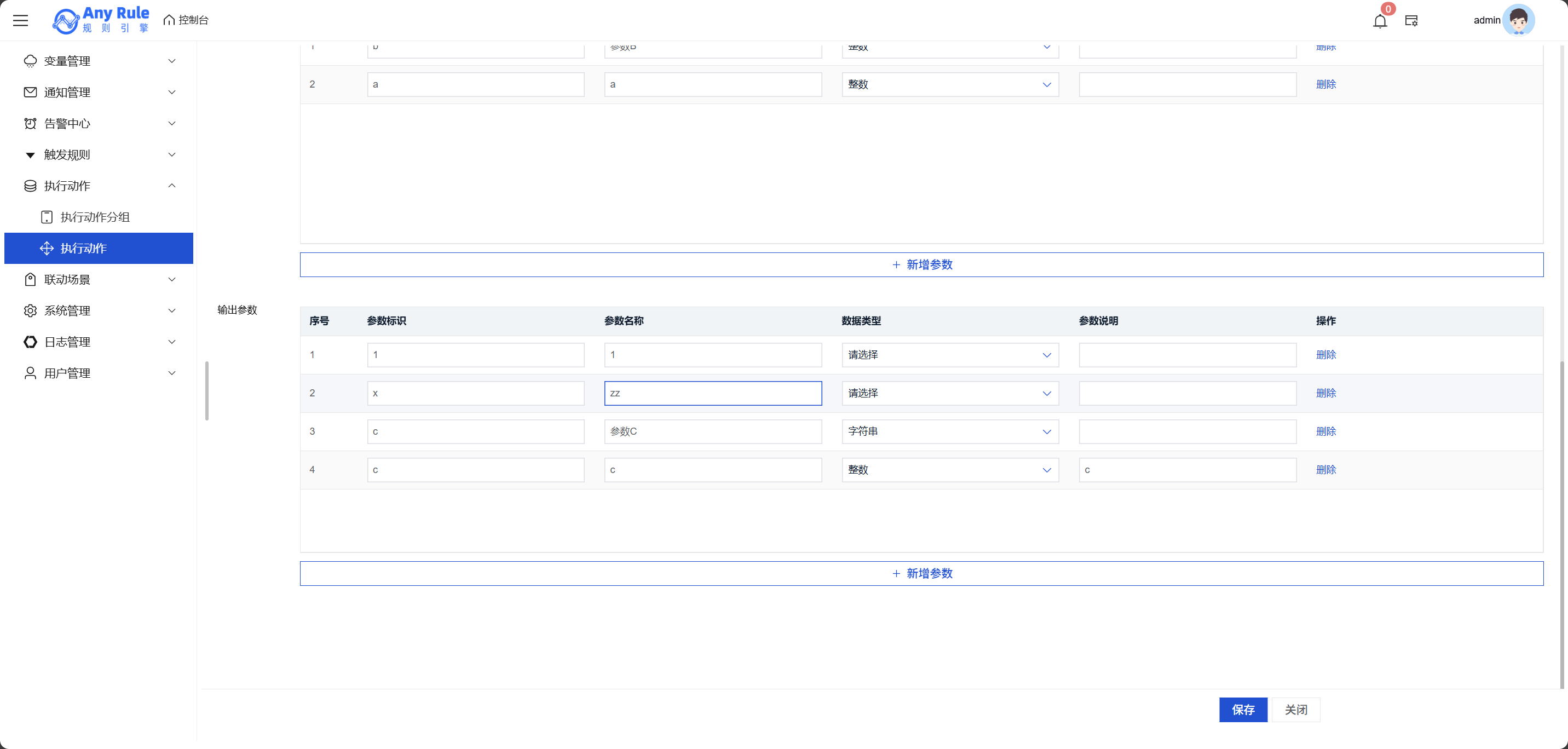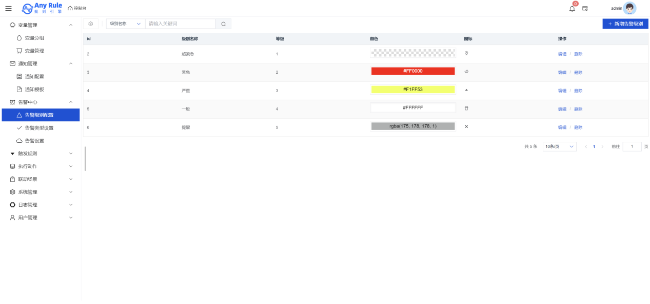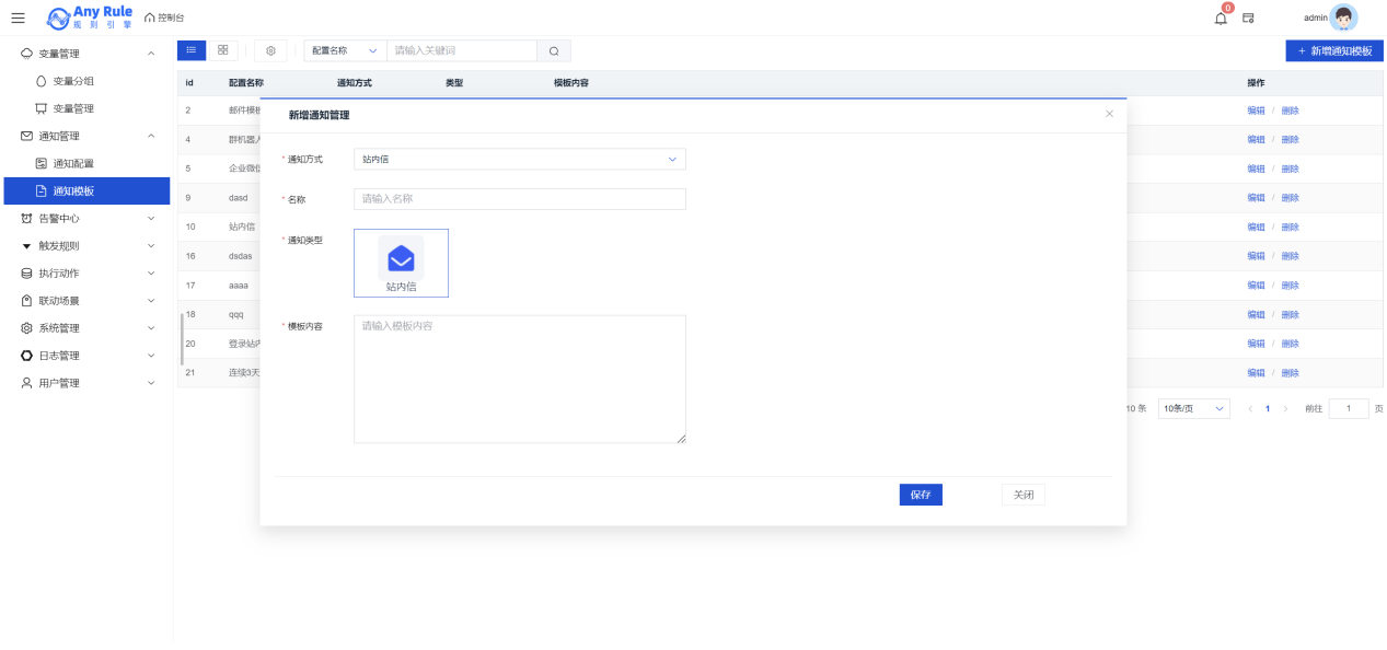 1.流程图  2.操作流程 2.1变量管理 2.1.1变量分组 将相关的变量分组在一起,可以更容易地管理和查找,在页面右上角有新增分组按钮。  点击新增分组打开新增分组弹窗,在新增分组弹窗中填写相对应的信息,点击保存完成分组的添加。在右侧还有编辑和删除的按钮可以对该行数据进行修改和删除的操作。   2.1.2变量管理 变量管理在规则引擎中负责存储、引用和传递数据,支持动态配置和数据模型设计,优化规则执行效率,并有助于错误处理和用户界面呈现,是实现业务规则自动化和灵活性的关键功能。  在右上角有新增变量按钮,点击按钮弹出新增变量弹窗,填写好相应的信息后点击保存完成变量新增。  这里的所属分组数据来自于变量分组中。  在变量管理右侧有设计按钮,点击设计进入变量设计页面,用户可以在此选择数据表和字段,配置变量名称、类型和值类型,并将选定的字段添加到变量中,最后通过点击“保存”按钮来保存变量配置。   2.2通知管理 2.2.1通知配置 通知配置可以结合通知配置为告警消息通知提供支撑。也可以用于系统中其他自定义模块的调用。  点击右上角的新增通知管理按钮,弹出新增通知管理弹窗,每个通知方式都有各自的配置信息,不同的通知类型也是。 通知方式:邮件 通知类型:邮件  通知方式:钉钉 通知类型:钉钉消息  通知方式:钉钉 通知类型:群机器人消息  通知方式:企业微信 通知类型:企业消息  通知方式:站内信 通知类型:站内信  可以根据不同的需求配置通知管理。 2.2.2通知模板 在规则引擎中,通知模板的作用是提供一种标准化和可配置的方式来生成和发送通知。  每个通知方式和通知类型都有各自的配置信息。 通知方式:钉钉 通知类型:钉钉消息  通知方式:钉钉 通知类型:群机器人消息  在群机器人中不同的消息类型也有不同的配置信息。  通知方式:企业微信 通知类型:企业消息  通知方式:邮件 通知类型:邮件  通知方式:站内信 通知类型:站内信  2.3告警中心 2.3.1告警级别配置 用户可以在此界面中查看、添加、编辑和删除告警级别,为每个级别设置名称、等级、颜色和图标,并通过搜索框快速查找特定告警级别,以便于管理和区分不同严重程度的告警事件。  2.3.2告警类型设置 告警类型在告警管理中的作用是将告警事件分类。  2.3.3告警设置 告警设置在告警管理中的作用是定义触发告警的具体条件、配置告警的严重级别、指定通知方式和内容。  点击右上角的新增告警设置按钮,跳转到告警设置新增页面,在这里可以配置告警类型、告警级别、告警名称、告警订阅的信息。告警类型信息来自于告警类型设置中,告警级别来自于告警级别设置好中。  2.4触发规则 2.4.1触发规则分组 触发规则分组可以将不同类型的触发规则归类到一起,使规则引擎的结构更加清晰、易于理解和维护。  2.4.2触发规则 触发规则负责根据预设的条件判断何时启动规则的执行。当满足特定的触发条件时,规则引擎会自动激活相应的规则逻辑,从而实现对数据的处理、决策的制定或业务流程的推进。  点击右上角的新增规则按钮弹出新增规则弹窗,输入好相应的信息点击保存完成触发规则的新增。  所属分组中的分组数据来自于触发规则分组当中。  点击右侧的设计进入规则设计页面。在规则设计页面中有两个板块,分别为绑定变量和功能。  在绑定变量中,选择所属的应用,接着选择数据表,选择完对应的数据表后在表字段中会显示该数据表中的所有字段,勾选需要的字段点击下方保存完成绑定变量。  (功能页面) 在这边可以给触发规则添加他的功能,点击右上角的新增功能按钮弹出新增功能弹窗。  新增功能弹窗分为两种,一种是数据集,一种是api。 功能类型:数据集 首先输入功能名称,选择功能类型为数据集,接着选择所属应用,选择完所属应用后在数据集ID中会显示该应用对应的数据集ID,选择好数据集ID接着在下方添加入参和出参,点击保存完成功能的添加。  功能类型:api  功能类型为api的则是在输入完功能名称后选择功能类型为api,选择需要的API_ID后添加入参和出参,点击保存即可完成功能添加。  2.5执行动作 2.5.1执行动作分组 执行动作分组可以将不同类型的执行动作归类到一起,使规则引擎的结构更加清晰、易于理解和维护。  2.5.2执行动作 执行动作是规则引擎中的核心功能组件,其作用在于当预定义的条件规则被满足时,自动触发预设的业务操作或逻辑处理(如数据更新、消息推送、流程跳转、外部接口调用等)。  点击右上角的新增动作按钮进入执行动作新增页面。 执行动作新增中每个动作类型有各自的动作类型配置。 执行动作:数据集   执行动作:API   执行动作:发送通知 在执行动作:发送通知中,有四种通知方式,分别为钉钉、企业微信、邮件、站内信,他们也有各自配置面板。 通知方式:钉钉 通知类型:钉钉消息  根据不同的需求填写对应的信息,点击下方保存完成执行动作的新增。 2.6联动场景 2.6.1场景联动分组 场景联动分组可以将不同类型的场景归类到一起,使规则引擎的结构更加清晰、易于理解和维护。  2.6.2场景联动 场景联动在规则引擎中通过定义条件触发的跨系统或跨流程协同机制,使规则引擎能够基于实时数据动态协调多个场景的交互与操作,从而实现复杂业务逻辑的自动化响应。它增强了规则引擎的灵活性与适