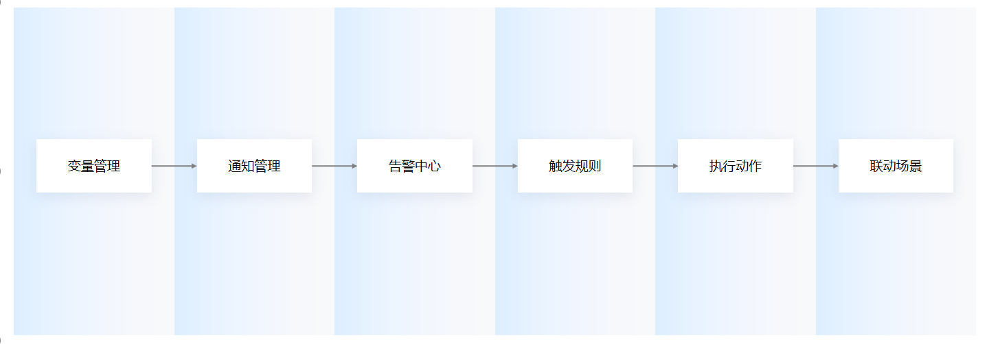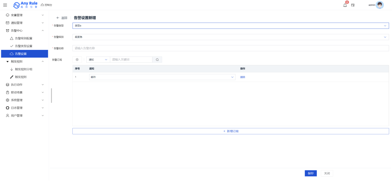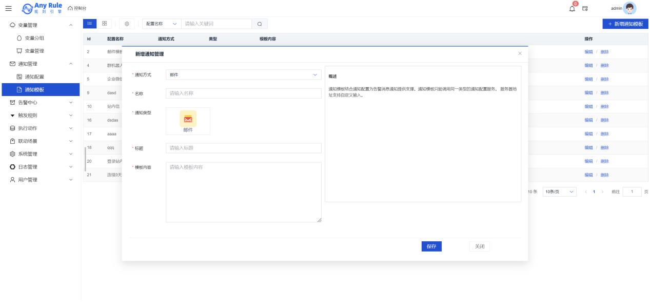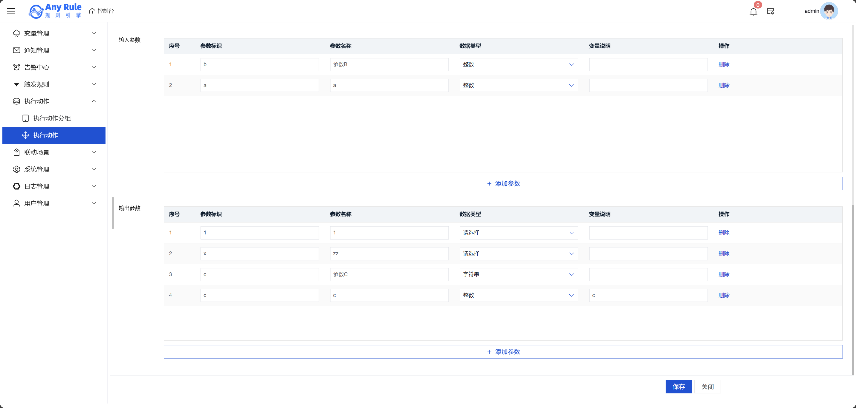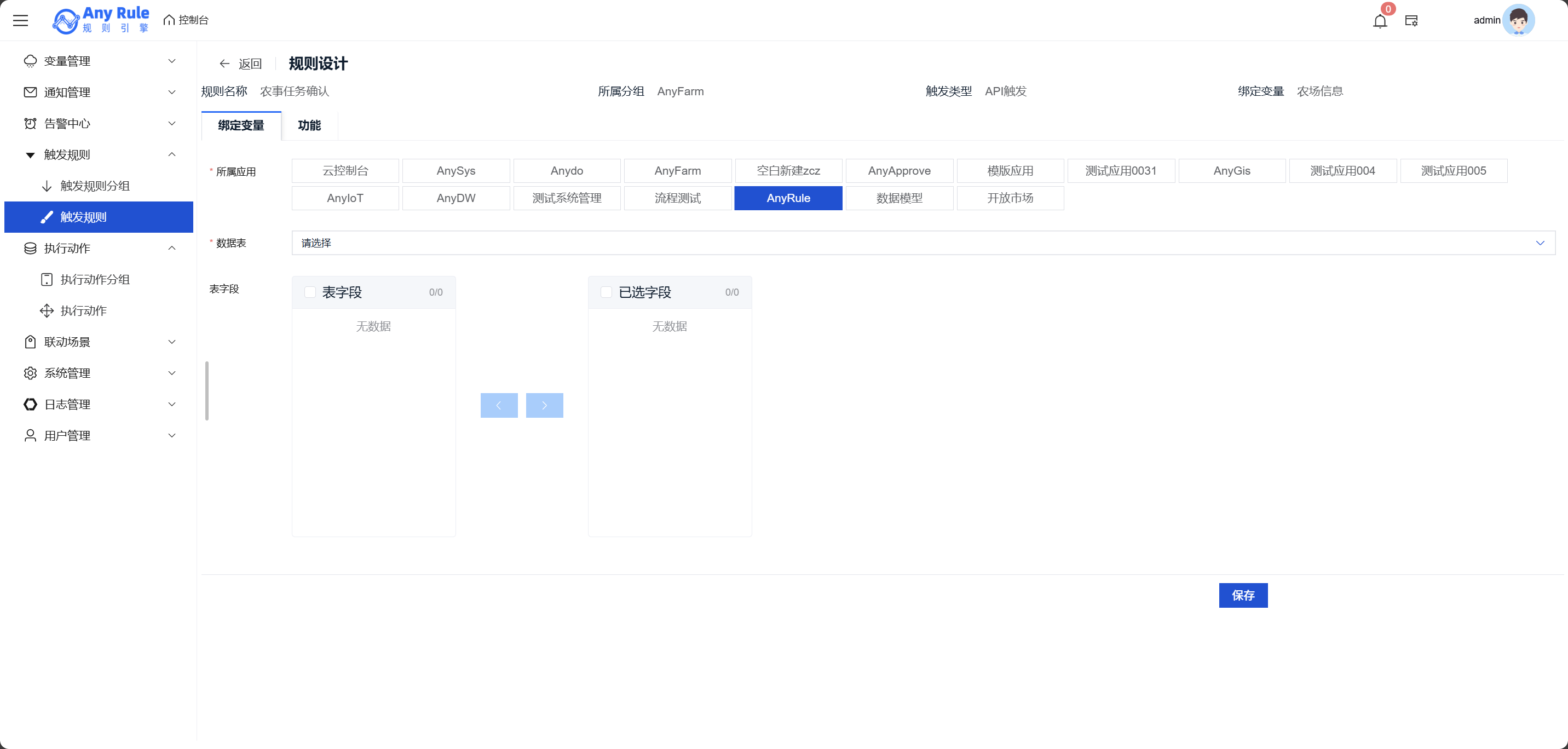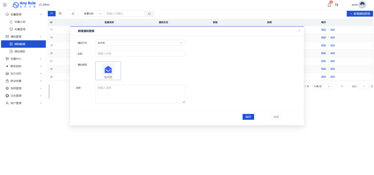 1.流程图  2.操作流程 2.1变量管理 2.1.1变量分组 将相关的变量分组在一起,可以更容易地管理和查找,在页面右上角有新增分组按钮。  点击新增分组打开新增分组弹窗,在新增分组弹窗中填写相对应的信息,点击保存完成分组的添加。在右侧还有编辑和删除的按钮可以对该行数据进行修改和删除的操作。   2.1.2变量管理 变量管理在规则引擎中负责存储、引用和传递数据,支持动态配置和数据模型设计,优化规则执行效率,并有助于错误处理和用户界面呈现,是实现业务规则自动化和灵活性的关键功能。  在右上角有新增变量按钮,点击按钮弹出新增变量弹窗,填写好相应的信息后点击保存完成变量新增。  这里的所属分组数据来自于变量分组中。  在变量管理右侧有设计按钮,点击设计进入变量设计页面,用户可以在此选择数据表和字段,配置变量名称、类型和值类型,并将选定的字段添加到变量中,最后通过点击“保存”按钮来保存变量配置。   2.2通知管理 2.2.1通知配置 通知配置可以结合通知配置为告警消息通知提供支撑。也可以用于系统中其他自定义模块的调用。  点击右上角的新增通知管理按钮,弹出新增通知管理弹窗,每个通知方式都有各自的配置信息,不同的通知类型也是。 通知方式:邮件 通知类型:邮件  通知方式:钉钉 通知类型:钉钉消息  通知方式:钉钉 通知类型:群机器人消息  通知方式:企业微信 通知类型:企业消息  通知方式:站内信 通知类型:站内信  可以根据不同的需求配置通知管理。 2.2.2通知模板 在规则引擎中,通知模板的作用是提供一种标准化和可配置的方式来生成和发送通知。  每个通知方式和通知类型都有各自的配置信息。 通知方式:钉钉 通知类型:钉钉消息  通知方式:钉钉 通知类型:群机器人消息  在群机器人中不同的消息类型也有不同的配置信息。  通知方式:企业微信 通知类型:企业消息  通知方式:邮件 通知类型:邮件  通知方式:站内信 通知类型:站内信  2.3告警中心 2.3.1告警级别配置 用户可以在此界面中查看、添加、编辑和删除告警级别,为每个级别设置名称、等级、颜色和图标,并通过搜索框快速查找特定告警级别,以便于管理和区分不同严重程度的告警事件。  2.3.2告警类型设置 告警类型在告警管理中的作用是将告警事件分类。  2.3.3告警设置 告警设置在告警管理中的作用是定义触发告警的具体条件、配置告警的严重级别、指定通知方式和内容。  点击右上角的新增告警设置按钮,跳转到告警设置新增页面,在这里可以配置告警类型、告警级别、告警名称、告警订阅的信息。告警类型信息来自于告警类型设置中,告警级别来自于告警级别设置好中。  2.4触发规则 2.4.1触发规则分组 触发规则分组可以将不同类型的触发规则归类到一起,使规则引擎的结构更加清晰、易于理解和维护。  2.4.2触发规则 触发规则负责根据预设的条件判断何时启动规则的执行。当满足特定的触发条件时,规则引擎会自动激活相应的规则逻辑,从而实现对数据的处理、决策的制定或业务流程的推进。  点击右上角的新增规则按钮弹出新增规则弹窗,输入好相应的信息点击保存完成触发规则的新增。  所属分组中的分组数据来自于触发规则分组当中。  点击右侧的设计进入规则设计页面。在规则设计页面中有两个板块,分别为绑定变量和功能。  在绑定变量中,选择所属的应用,接着选择数据表,选择完对应的数据表后在表字段中会显示该数据表中的所有字段,勾选需要的字段点击下方保存完成绑定变量。  (功能页面) 在这边可以给触发规则添加他的功能,点击右上角的新增功能按钮弹出新增功能弹窗。  新增功能弹窗分为两种,一种是数据集,一种是api。 功能类型:数据集 首先输入功能名称,选择功能类型为数据集,接着选择所属应用,选择完所属应用后在数据集ID中会显示该应用对应的数据集ID,选择好数据集ID接着在下方添加入参和出参,点击保存完成功能的添加。  功能类型:api  功能类型为api的则是在输入完功能名称后选择功能类型为api,选择需要的API_ID后添加入参和出参,点击保存即可完成功能添加。  2.5执行动作 2.5.1执行动作分组 执行动作分组可以将不同类型的执行动作归类到一起,使规则引擎的结构更加清晰、易于理解和维护。  2.5.2执行动作 执行动作是规则引擎中的核心功能组件,其作用在于当预定义的条件规则被满足时,自动触发预设的业务操作或逻辑处理(如数据更新、消息推送、流程跳转、外部接口调用等)。  点击右上角的新增动作按钮进入执行动作新增页面。 执行动作新增中每个动作类型有各自的动作类型配置。 执行动作:数据集   执行动作:API   执行动作:发送通知 在执行动作:发送通知中,有四种通知方式,分别为钉钉、企业微信、邮件、站内信,他们也有各自配置面板。 通知方式:钉钉 通知类型:钉钉消息  根据不同的需求填写对应的信息,点击下方保存完成执行动作的新增。 2.6联动场景 2.6.1场景联动分组 场景联动分组可以将不同类型的场景归类到一起,使规则引擎的结构更加清晰、易于理解和维护。  2.6.2场景联动 场景联动在规则引擎中通过定义条件触发的跨系统或跨流程协同机制,使规则引擎能够基于实时数据动态协调多个场景的交互与操作,从而实现复杂业务逻辑的自动化响应。它增强了规则引擎的灵活性与适