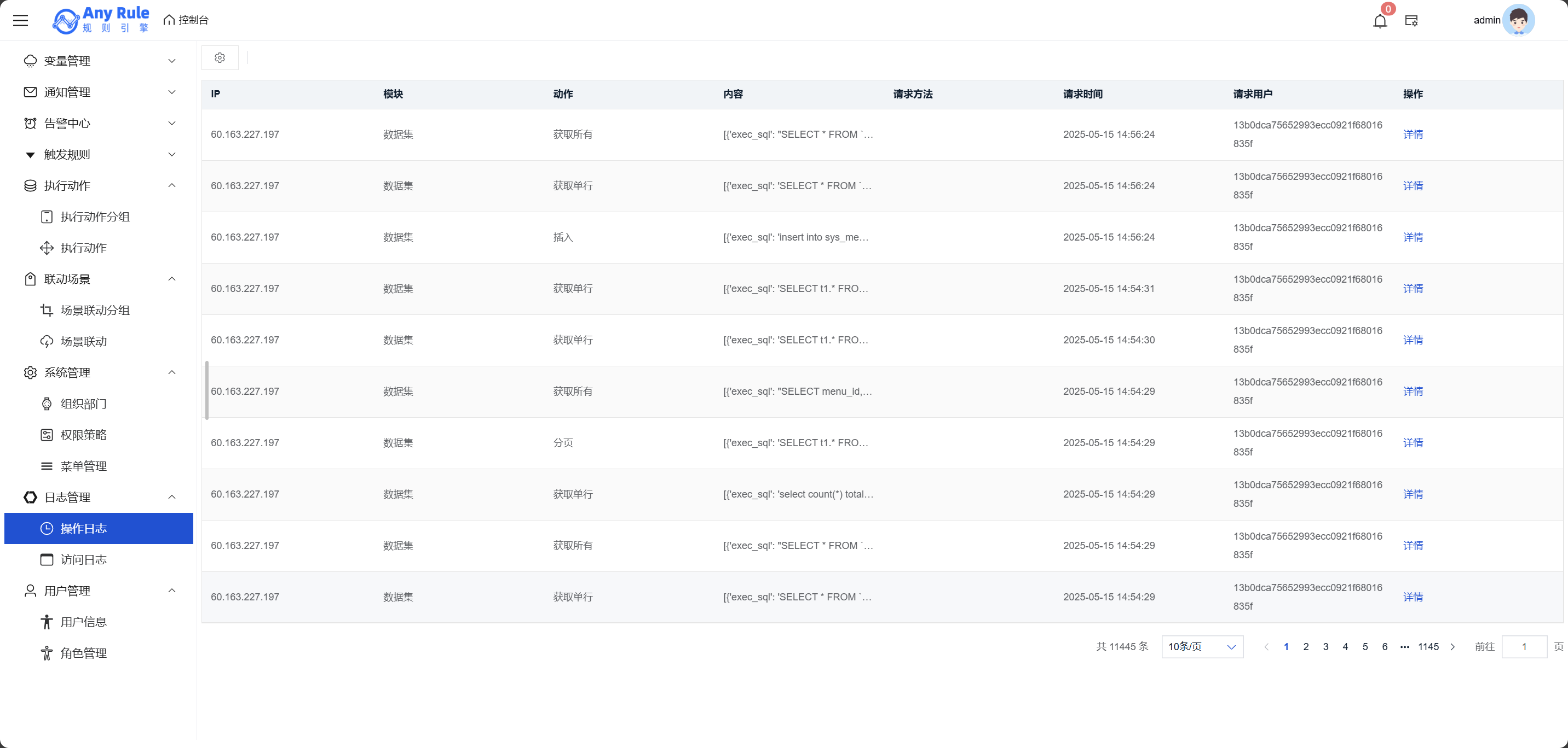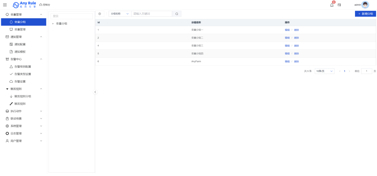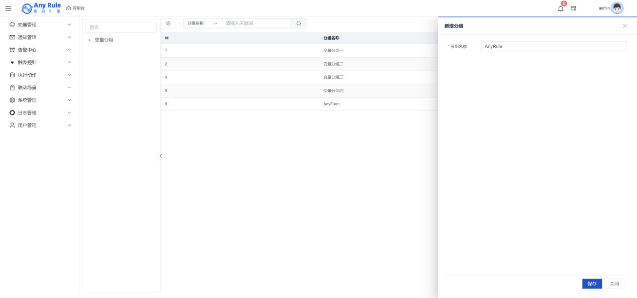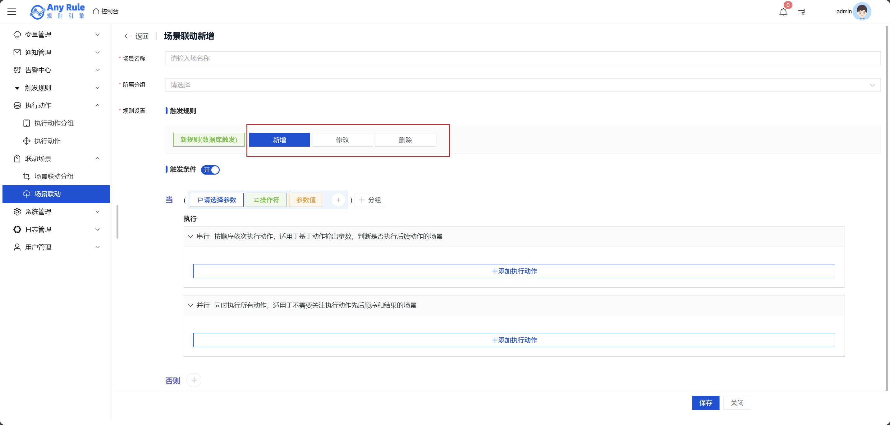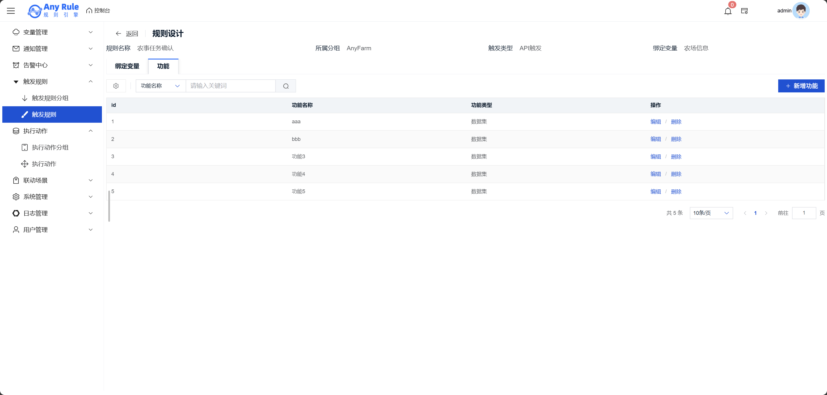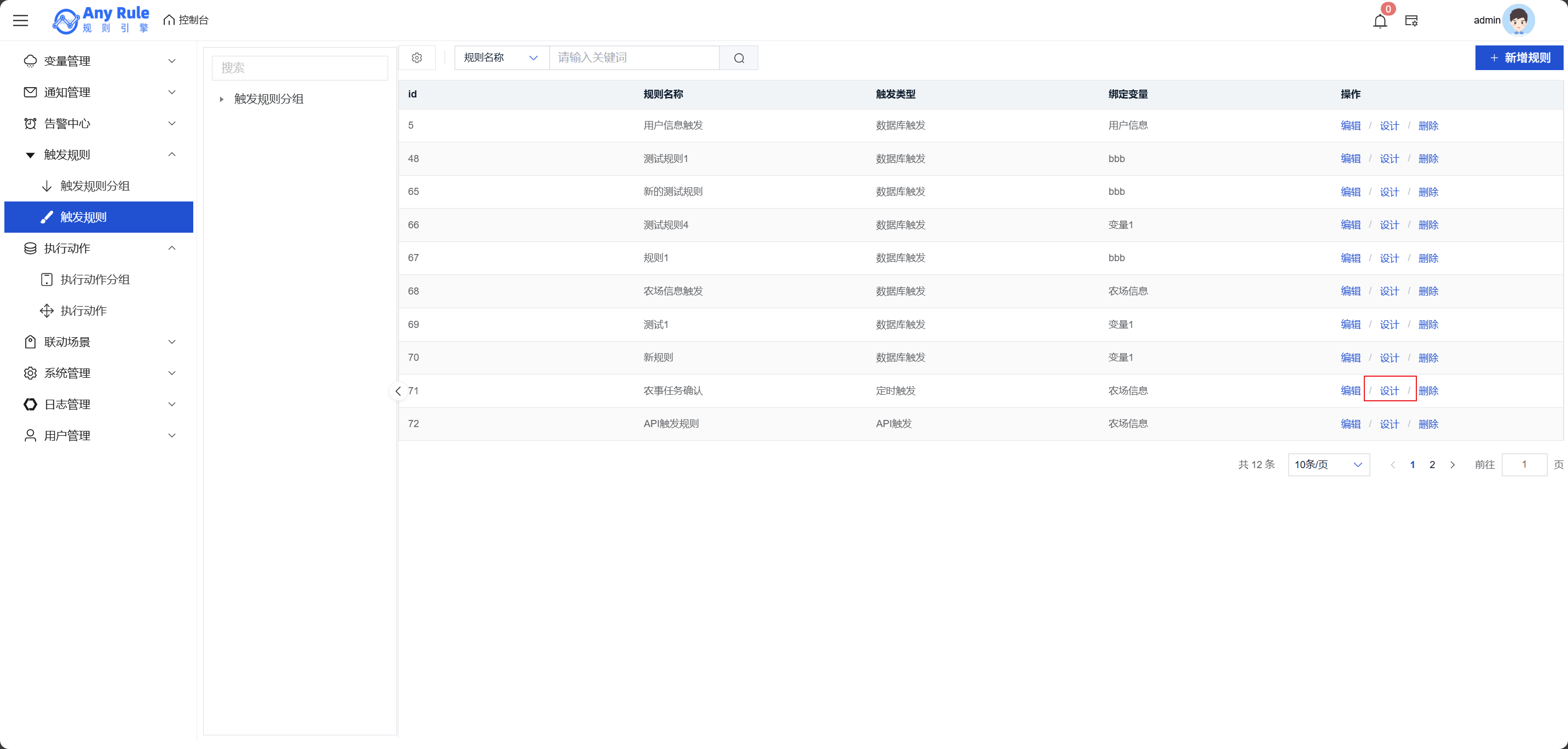 1.流程图  2.操作流程 2.1变量管理 2.1.1变量分组 将相关的变量分组在一起,可以更容易地管理和查找,在页面右上角有新增分组按钮。  点击新增分组打开新增分组弹窗,在新增分组弹窗中填写相对应的信息,点击保存完成分组的添加。在右侧还有编辑和删除的按钮可以对该行数据进行修改和删除的操作。   2.1.2变量管理 变量管理在规则引擎中负责存储、引用和传递数据,支持动态配置和数据模型设计,优化规则执行效率,并有助于错误处理和用户界面呈现,是实现业务规则自动化和灵活性的关键功能。  在右上角有新增变量按钮,点击按钮弹出新增变量弹窗,填写好相应的信息后点击保存完成变量新增。  这里的所属分组数据来自于变量分组中。  在变量管理右侧有设计按钮,点击设计进入变量设计页面,用户可以在此选择数据表和字段,配置变量名称、类型和值类型,并将选定的字段添加到变量中,最后通过点击“保存”按钮来保存变量配置。   2.2通知管理 2.2.1通知配置 通知配置可以结合通知配置为告警消息通知提供支撑。也可以用于系统中其他自定义模块的调用。  点击右上角的新增通知管理按钮,弹出新增通知管理弹窗,每个通知方式都有各自的配置信息,不同的通知类型也是。 通知方式:邮件 通知类型:邮件  通知方式:钉钉 通知类型:钉钉消息  通知方式:钉钉 通知类型:群机器人消息  通知方式:企业微信 通知类型:企业消息  通知方式:站内信 通知类型:站内信  可以根据不同的需求配置通知管理。 2.2.2通知模板 在规则引擎中,通知模板的作用是提供一种标准化和可配置的方式来生成和发送通知。  每个通知方式和通知类型都有各自的配置信息。 通知方式:钉钉 通知类型:钉钉消息  通知方式:钉钉 通知类型:群机器人消息  在群机器人中不同的消息类型也有不同的配置信息。  通知方式:企业微信 通知类型:企业消息  通知方式:邮件 通知类型:邮件  通知方式:站内信 通知类型:站内信  2.3告警中心 2.3.1告警级别配置 用户可以在此界面中查看、添加、编辑和删除告警级别,为每个级别设置名称、等级、颜色和图标,并通过搜索框快速查找特定告警级别,以便于管理和区分不同严重程度的告警事件。  2.3.2告警类型设置 告警类型在告警管理中的作用是将告警事件分类。  2.3.3告警设置 告警设置在告警管理中的作用是定义触发告警的具体条件、配置告警的严重级别、指定通知方式和内容。  点击右上角的新增告警设置按钮,跳转到告警设置新增页面,在这里可以配置告警类型、告警级别、告警名称、告警订阅的信息。告警类型信息来自于告警类型设置中,告警级别来自于告警级别设置好中。  2.4触发规则 2.4.1触发规则分组 触发规则分组可以将不同类型的触发规则归类到一起,使规则引擎的结构更加清晰、易于理解和维护。  2.4.2触发规则 触发规则负责根据预设的条件判断何时启动规则的执行。当满足特定的触发条件时,规则引擎会自动激活相应的规则逻辑,从而实现对数据的处理、决策的制定或业务流程的推进。  点击右上角的新增规则按钮弹出新增规则弹窗,输入好相应的信息点击保存完成触发规则的新增。  所属分组中的分组数据来自于触发规则分组当中。  点击右侧的设计进入规则设计页面。在规则设计页面中有两个板块,分别为绑定变量和功能。  在绑定变量中,选择所属的应用,接着选择数据表,选择完对应的数据表后在表字段中会显示该数据表中的所有字段,勾选需要的字段点击下方保存完成绑定变量。  (功能页面) 在这边可以给触发规则添加他的功能,点击右上角的新增功能按钮弹出新增功能弹窗。  新增功能弹窗分为两种,一种是数据集,一种是api。 功能类型:数据集 首先输入功能名称,选择功能类型为数据集,接着选择所属应用,选择完所属应用后在数据集ID中会显示该应用对应的数据集ID,选择好数据集ID接着在下方添加入参和出参,点击保存完成功能的添加。  功能类型:api  功能类型为api的则是在输入完功能名称后选择功能类型为api,选择需要的API_ID后添加入参和出参,点击保存即可完成功能添加。  2.5执行动作 2.5.1执行动作分组 执行动作分组可以将不同类型的执行动作归类到一起,使规则引擎的结构更加清晰、易于理解和维护。  2.5.2执行动作 执行动作是规则引擎中的核心功能组件,其作用在于当预定义的条件规则被满足时,自动触发预设的业务操作或逻辑处理(如数据更新、消息推送、流程跳转、外部接口调用等)。  点击右上角的新增动作按钮进入执行动作新增页面。 执行动作新增中每个动作类型有各自的动作类型配置。 执行动作:数据集   执行动作:API   执行动作:发送通知 在执行动作:发送通知中,有四种通知方式,分别为钉钉、企业微信、邮件、站内信,他们也有各自配置面板。 通知方式:钉钉 通知类型:钉钉消息  根据不同的需求填写对应的信息,点击下方保存完成执行动作的新增。 2.6联动场景 2.6.1场景联动分组 场景联动分组可以将不同类型的场景归类到一起,使规则引擎的结构更加清晰、易于理解和维护。  2.6.2场景联动 场景联动在规则引擎中通过定义条件触发的跨系统或跨流程协同机制,使规则引擎能够基于实时数据动态协调多个场景的交互与操作,从而实现复杂业务逻辑的自动化响应。它增强了规则引擎的灵活性与适