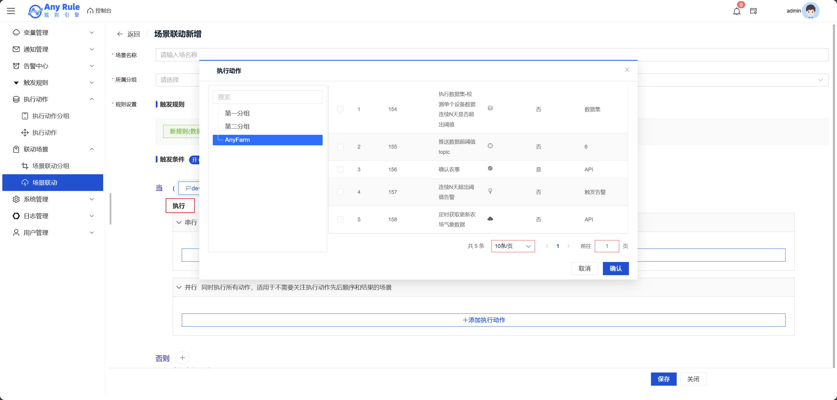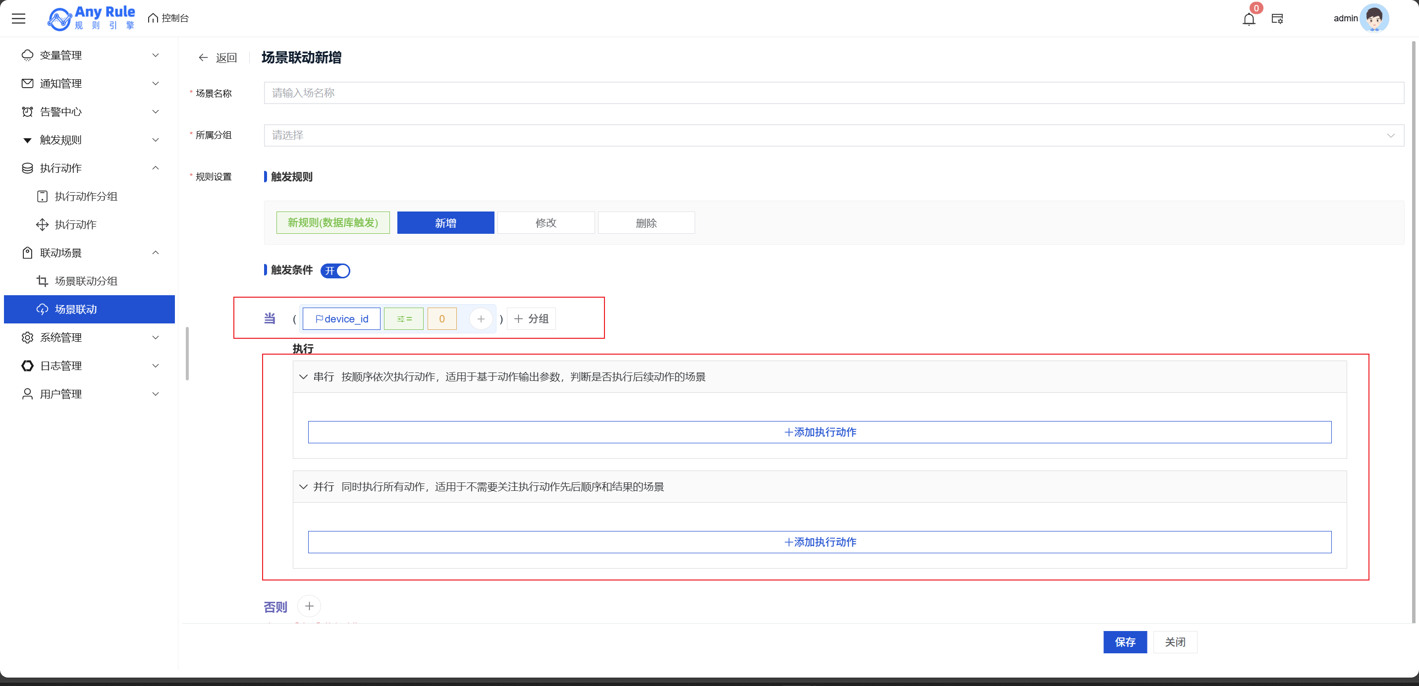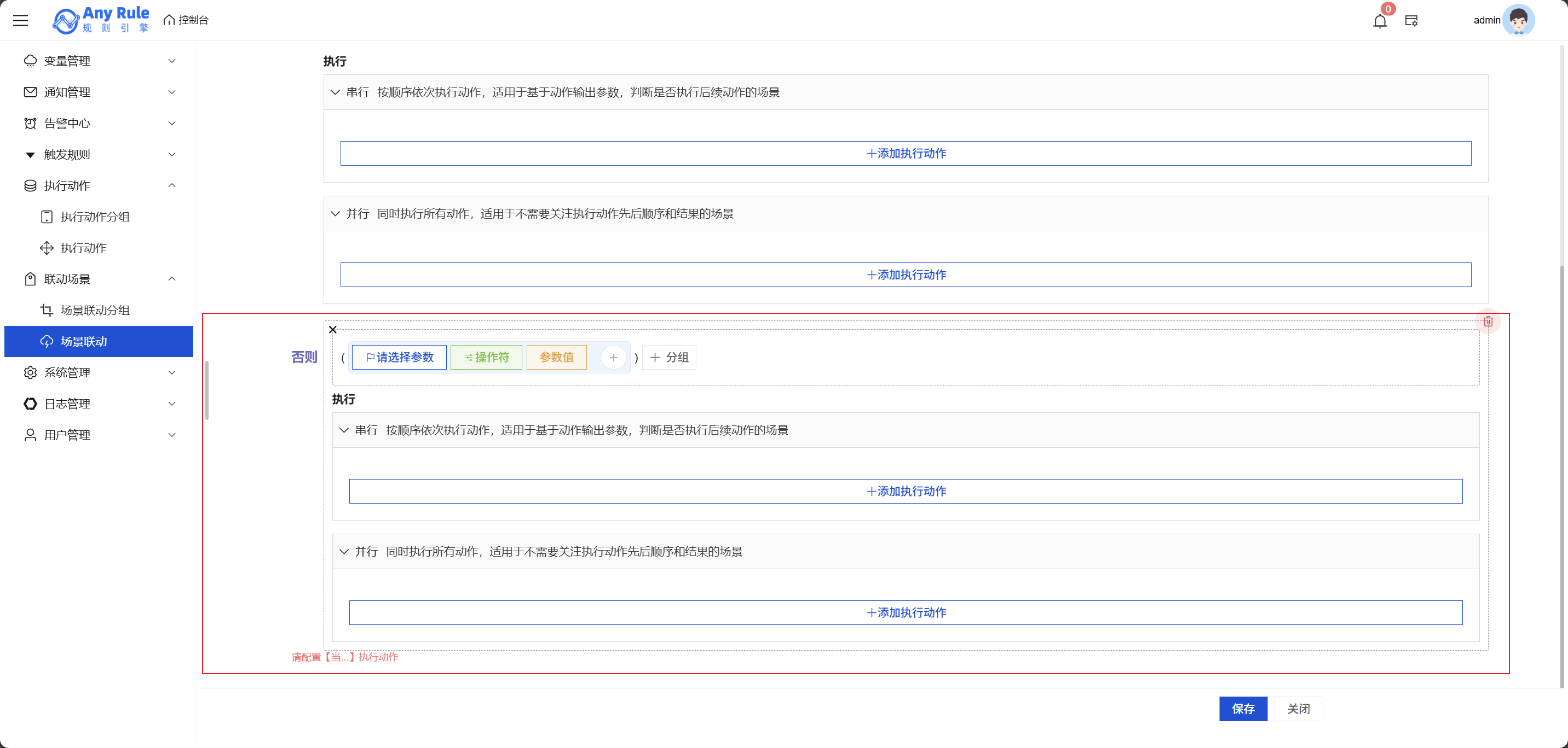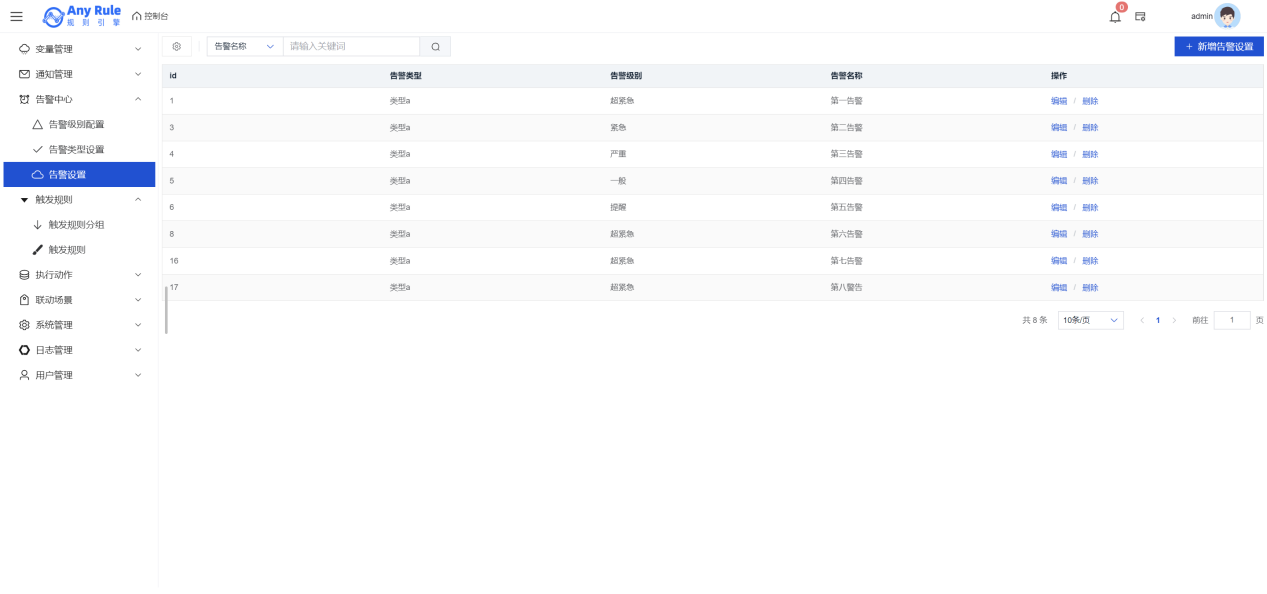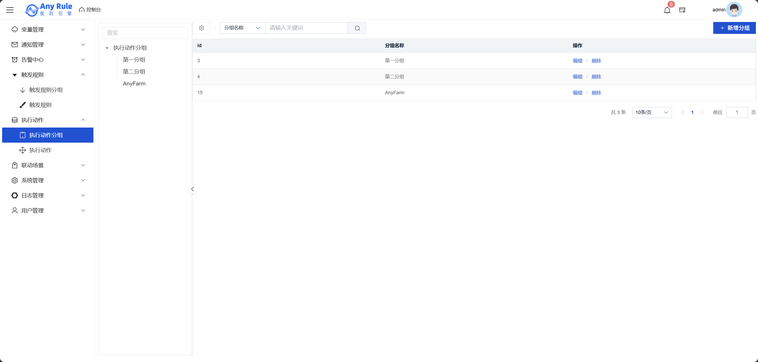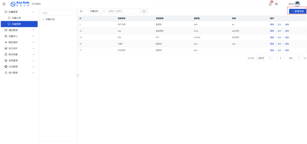 1.流程图  2.操作流程 2.1变量管理 2.1.1变量分组 将相关的变量分组在一起,可以更容易地管理和查找,在页面右上角有新增分组按钮。  点击新增分组打开新增分组弹窗,在新增分组弹窗中填写相对应的信息,点击保存完成分组的添加。在右侧还有编辑和删除的按钮可以对该行数据进行修改和删除的操作。   2.1.2变量管理 变量管理在规则引擎中负责存储、引用和传递数据,支持动态配置和数据模型设计,优化规则执行效率,并有助于错误处理和用户界面呈现,是实现业务规则自动化和灵活性的关键功能。  在右上角有新增变量按钮,点击按钮弹出新增变量弹窗,填写好相应的信息后点击保存完成变量新增。  这里的所属分组数据来自于变量分组中。  在变量管理右侧有设计按钮,点击设计进入变量设计页面,用户可以在此选择数据表和字段,配置变量名称、类型和值类型,并将选定的字段添加到变量中,最后通过点击“保存”按钮来保存变量配置。   2.2通知管理 2.2.1通知配置 通知配置可以结合通知配置为告警消息通知提供支撑。也可以用于系统中其他自定义模块的调用。  点击右上角的新增通知管理按钮,弹出新增通知管理弹窗,每个通知方式都有各自的配置信息,不同的通知类型也是。 通知方式:邮件 通知类型:邮件  通知方式:钉钉 通知类型:钉钉消息  通知方式:钉钉 通知类型:群机器人消息  通知方式:企业微信 通知类型:企业消息  通知方式:站内信 通知类型:站内信  可以根据不同的需求配置通知管理。 2.2.2通知模板 在规则引擎中,通知模板的作用是提供一种标准化和可配置的方式来生成和发送通知。  每个通知方式和通知类型都有各自的配置信息。 通知方式:钉钉 通知类型:钉钉消息  通知方式:钉钉 通知类型:群机器人消息  在群机器人中不同的消息类型也有不同的配置信息。  通知方式:企业微信 通知类型:企业消息  通知方式:邮件 通知类型:邮件  通知方式:站内信 通知类型:站内信  2.3告警中心 2.3.1告警级别配置 用户可以在此界面中查看、添加、编辑和删除告警级别,为每个级别设置名称、等级、颜色和图标,并通过搜索框快速查找特定告警级别,以便于管理和区分不同严重程度的告警事件。  2.3.2告警类型设置 告警类型在告警管理中的作用是将告警事件分类。  2.3.3告警设置 告警设置在告警管理中的作用是定义触发告警的具体条件、配置告警的严重级别、指定通知方式和内容。  点击右上角的新增告警设置按钮,跳转到告警设置新增页面,在这里可以配置告警类型、告警级别、告警名称、告警订阅的信息。告警类型信息来自于告警类型设置中,告警级别来自于告警级别设置好中。  2.4触发规则 2.4.1触发规则分组 触发规则分组可以将不同类型的触发规则归类到一起,使规则引擎的结构更加清晰、易于理解和维护。  2.4.2触发规则 触发规则负责根据预设的条件判断何时启动规则的执行。当满足特定的触发条件时,规则引擎会自动激活相应的规则逻辑,从而实现对数据的处理、决策的制定或业务流程的推进。  点击右上角的新增规则按钮弹出新增规则弹窗,输入好相应的信息点击保存完成触发规则的新增。  所属分组中的分组数据来自于触发规则分组当中。  点击右侧的设计进入规则设计页面。在规则设计页面中有两个板块,分别为绑定变量和功能。  在绑定变量中,选择所属的应用,接着选择数据表,选择完对应的数据表后在表字段中会显示该数据表中的所有字段,勾选需要的字段点击下方保存完成绑定变量。  (功能页面) 在这边可以给触发规则添加他的功能,点击右上角的新增功能按钮弹出新增功能弹窗。  新增功能弹窗分为两种,一种是数据集,一种是api。 功能类型:数据集 首先输入功能名称,选择功能类型为数据集,接着选择所属应用,选择完所属应用后在数据集ID中会显示该应用对应的数据集ID,选择好数据集ID接着在下方添加入参和出参,点击保存完成功能的添加。  功能类型:api  功能类型为api的则是在输入完功能名称后选择功能类型为api,选择需要的API_ID后添加入参和出参,点击保存即可完成功能添加。  2.5执行动作 2.5.1执行动作分组 执行动作分组可以将不同类型的执行动作归类到一起,使规则引擎的结构更加清晰、易于理解和维护。  2.5.2执行动作 执行动作是规则引擎中的核心功能组件,其作用在于当预定义的条件规则被满足时,自动触发预设的业务操作或逻辑处理(如数据更新、消息推送、流程跳转、外部接口调用等)。  点击右上角的新增动作按钮进入执行动作新增页面。 执行动作新增中每个动作类型有各自的动作类型配置。 执行动作:数据集   执行动作:API   执行动作:发送通知 在执行动作:发送通知中,有四种通知方式,分别为钉钉、企业微信、邮件、站内信,他们也有各自配置面板。 通知方式:钉钉 通知类型:钉钉消息  根据不同的需求填写对应的信息,点击下方保存完成执行动作的新增。 2.6联动场景 2.6.1场景联动分组 场景联动分组可以将不同类型的场景归类到一起,使规则引擎的结构更加清晰、易于理解和维护。  2.6.2场景联动 场景联动在规则引擎中通过定义条件触发的跨系统或跨流程协同机制,使规则引擎能够基于实时数据动态协调多个场景的交互与操作,从而实现复杂业务逻辑的自动化响应。它增强了规则引擎的灵活性与适