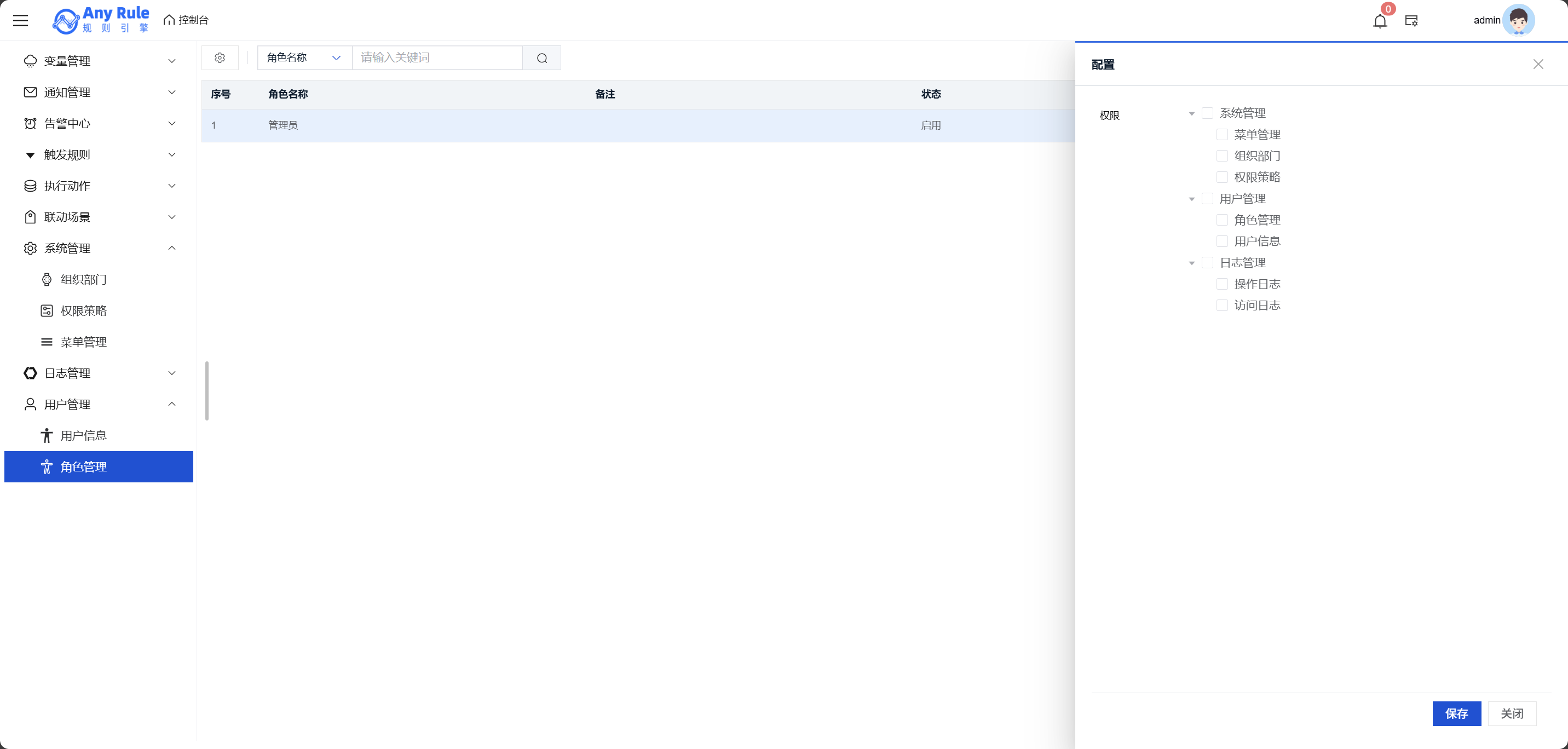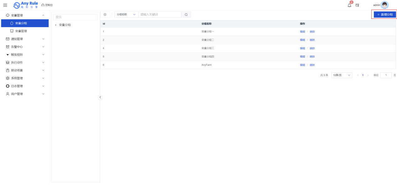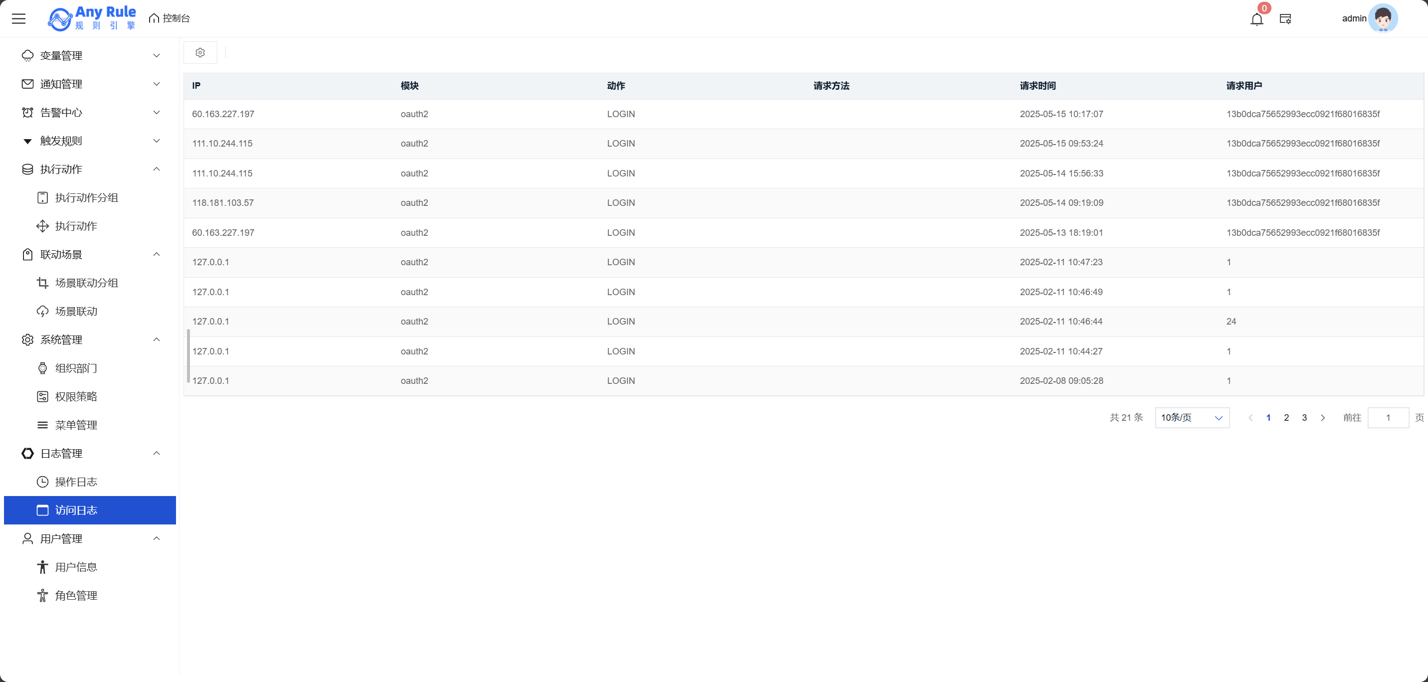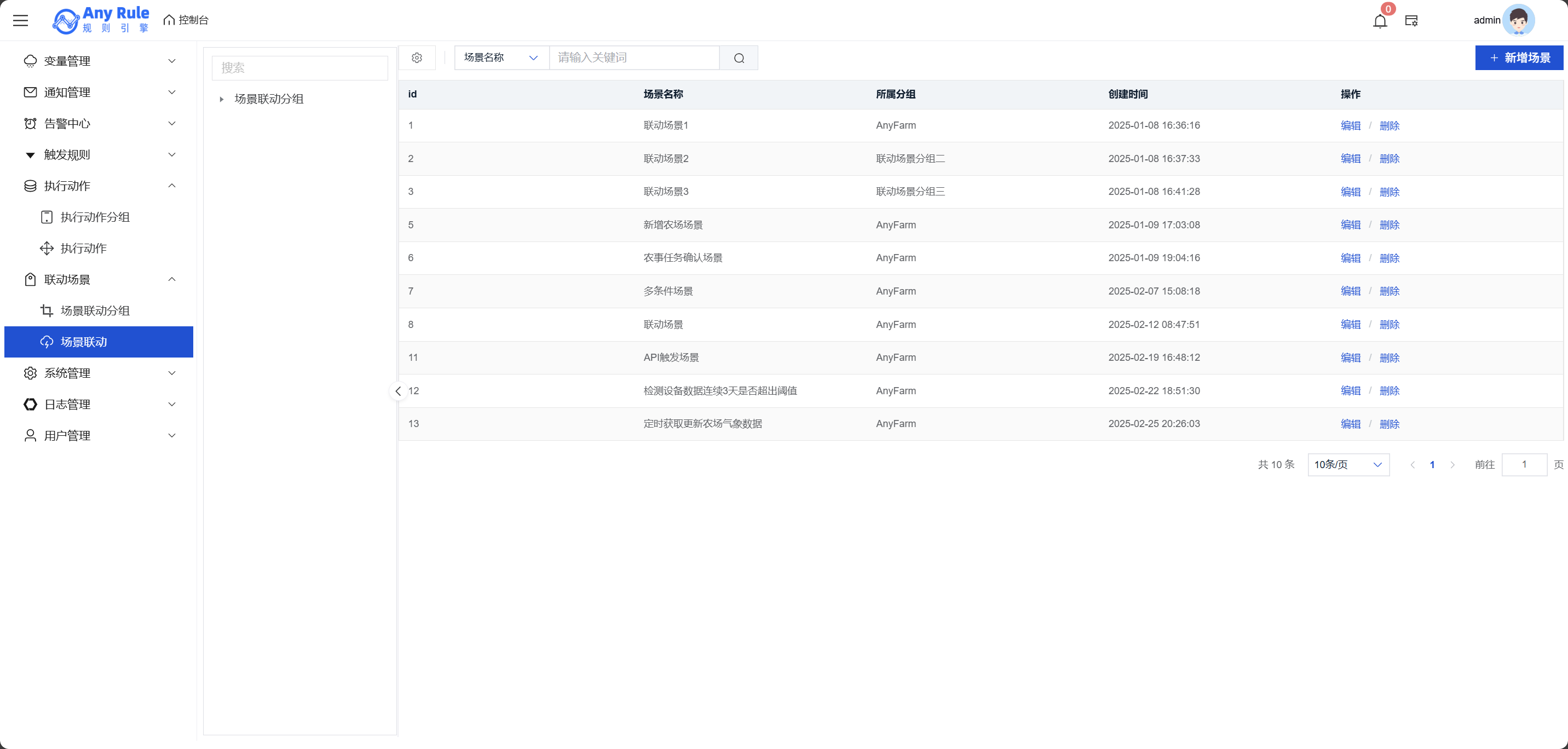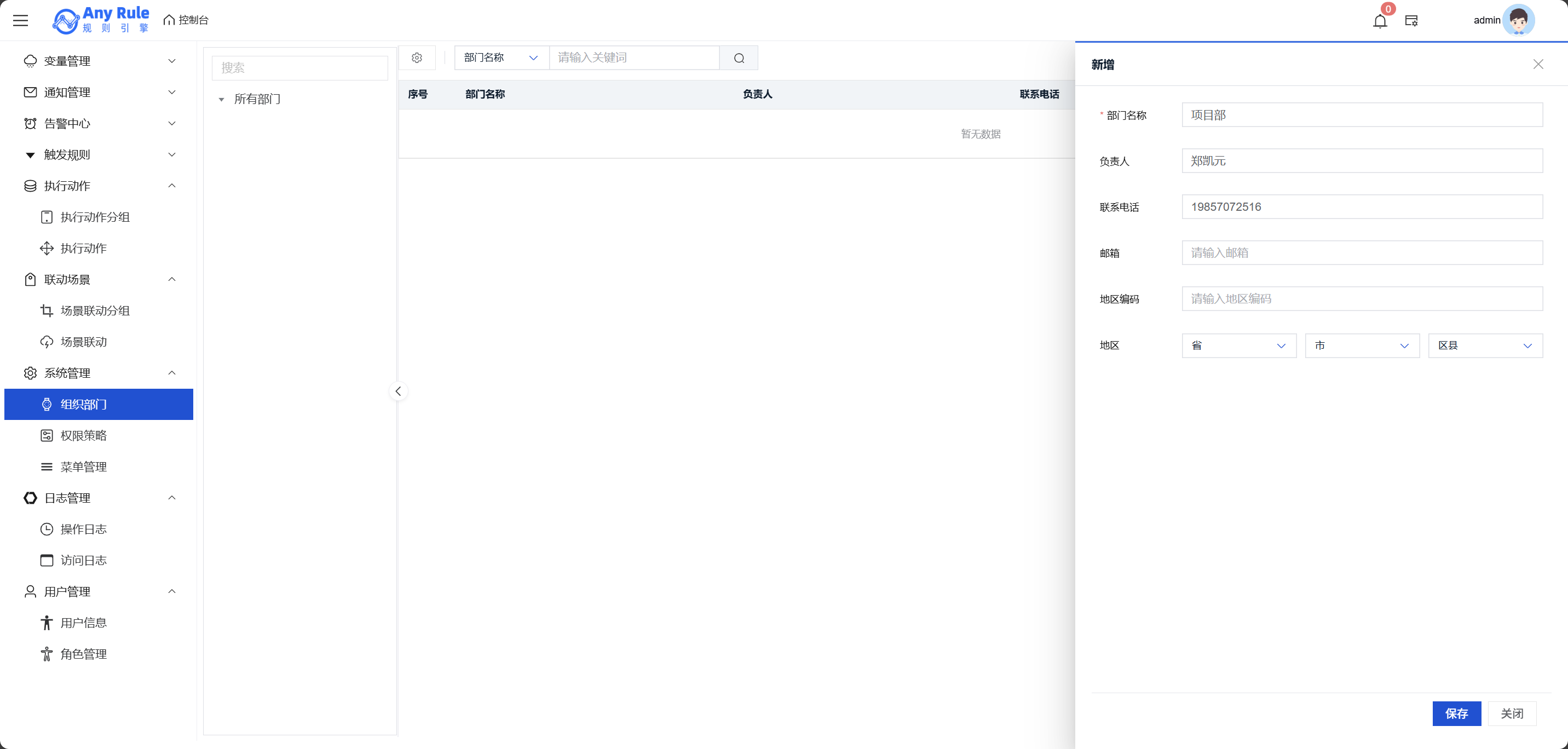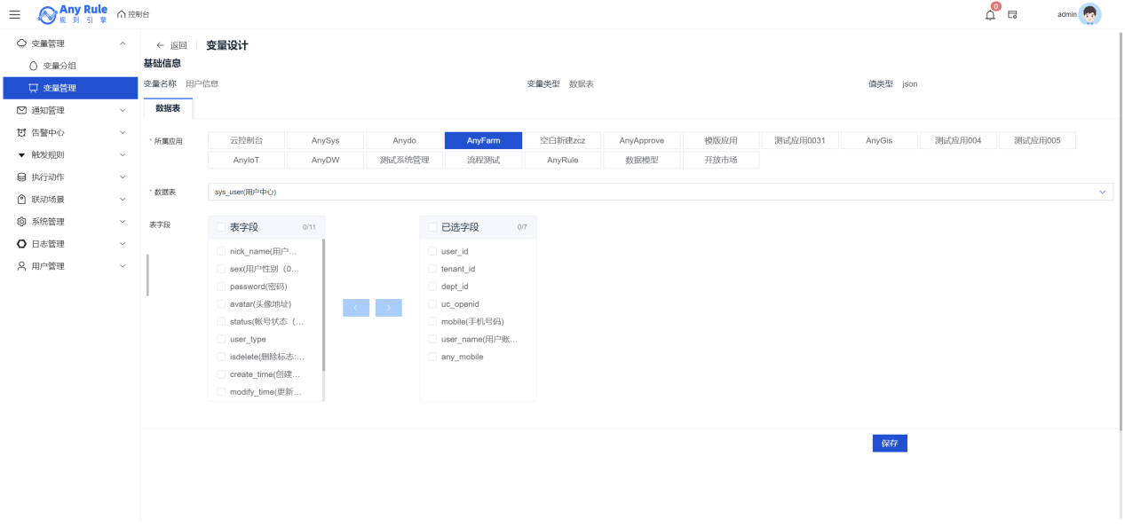 1.流程图  2.操作流程 2.1变量管理 2.1.1变量分组 将相关的变量分组在一起,可以更容易地管理和查找,在页面右上角有新增分组按钮。  点击新增分组打开新增分组弹窗,在新增分组弹窗中填写相对应的信息,点击保存完成分组的添加。在右侧还有编辑和删除的按钮可以对该行数据进行修改和删除的操作。   2.1.2变量管理 变量管理在规则引擎中负责存储、引用和传递数据,支持动态配置和数据模型设计,优化规则执行效率,并有助于错误处理和用户界面呈现,是实现业务规则自动化和灵活性的关键功能。  在右上角有新增变量按钮,点击按钮弹出新增变量弹窗,填写好相应的信息后点击保存完成变量新增。  这里的所属分组数据来自于变量分组中。  在变量管理右侧有设计按钮,点击设计进入变量设计页面,用户可以在此选择数据表和字段,配置变量名称、类型和值类型,并将选定的字段添加到变量中,最后通过点击“保存”按钮来保存变量配置。   2.2通知管理 2.2.1通知配置 通知配置可以结合通知配置为告警消息通知提供支撑。也可以用于系统中其他自定义模块的调用。  点击右上角的新增通知管理按钮,弹出新增通知管理弹窗,每个通知方式都有各自的配置信息,不同的通知类型也是。 通知方式:邮件 通知类型:邮件  通知方式:钉钉 通知类型:钉钉消息  通知方式:钉钉 通知类型:群机器人消息  通知方式:企业微信 通知类型:企业消息  通知方式:站内信 通知类型:站内信  可以根据不同的需求配置通知管理。 2.2.2通知模板 在规则引擎中,通知模板的作用是提供一种标准化和可配置的方式来生成和发送通知。  每个通知方式和通知类型都有各自的配置信息。 通知方式:钉钉 通知类型:钉钉消息  通知方式:钉钉 通知类型:群机器人消息  在群机器人中不同的消息类型也有不同的配置信息。  通知方式:企业微信 通知类型:企业消息  通知方式:邮件 通知类型:邮件  通知方式:站内信 通知类型:站内信  2.3告警中心 2.3.1告警级别配置 用户可以在此界面中查看、添加、编辑和删除告警级别,为每个级别设置名称、等级、颜色和图标,并通过搜索框快速查找特定告警级别,以便于管理和区分不同严重程度的告警事件。  2.3.2告警类型设置 告警类型在告警管理中的作用是将告警事件分类。  2.3.3告警设置 告警设置在告警管理中的作用是定义触发告警的具体条件、配置告警的严重级别、指定通知方式和内容。  点击右上角的新增告警设置按钮,跳转到告警设置新增页面,在这里可以配置告警类型、告警级别、告警名称、告警订阅的信息。告警类型信息来自于告警类型设置中,告警级别来自于告警级别设置好中。  2.4触发规则 2.4.1触发规则分组 触发规则分组可以将不同类型的触发规则归类到一起,使规则引擎的结构更加清晰、易于理解和维护。  2.4.2触发规则 触发规则负责根据预设的条件判断何时启动规则的执行。当满足特定的触发条件时,规则引擎会自动激活相应的规则逻辑,从而实现对数据的处理、决策的制定或业务流程的推进。  点击右上角的新增规则按钮弹出新增规则弹窗,输入好相应的信息点击保存完成触发规则的新增。  所属分组中的分组数据来自于触发规则分组当中。  点击右侧的设计进入规则设计页面。在规则设计页面中有两个板块,分别为绑定变量和功能。  在绑定变量中,选择所属的应用,接着选择数据表,选择完对应的数据表后在表字段中会显示该数据表中的所有字段,勾选需要的字段点击下方保存完成绑定变量。  (功能页面) 在这边可以给触发规则添加他的功能,点击右上角的新增功能按钮弹出新增功能弹窗。  新增功能弹窗分为两种,一种是数据集,一种是api。 功能类型:数据集 首先输入功能名称,选择功能类型为数据集,接着选择所属应用,选择完所属应用后在数据集ID中会显示该应用对应的数据集ID,选择好数据集ID接着在下方添加入参和出参,点击保存完成功能的添加。  功能类型:api  功能类型为api的则是在输入完功能名称后选择功能类型为api,选择需要的API_ID后添加入参和出参,点击保存即可完成功能添加。  2.5执行动作 2.5.1执行动作分组 执行动作分组可以将不同类型的执行动作归类到一起,使规则引擎的结构更加清晰、易于理解和维护。  2.5.2执行动作 执行动作是规则引擎中的核心功能组件,其作用在于当预定义的条件规则被满足时,自动触发预设的业务操作或逻辑处理(如数据更新、消息推送、流程跳转、外部接口调用等)。  点击右上角的新增动作按钮进入执行动作新增页面。 执行动作新增中每个动作类型有各自的动作类型配置。 执行动作:数据集   执行动作:API   执行动作:发送通知 在执行动作:发送通知中,有四种通知方式,分别为钉钉、企业微信、邮件、站内信,他们也有各自配置面板。 通知方式:钉钉 通知类型:钉钉消息  根据不同的需求填写对应的信息,点击下方保存完成执行动作的新增。 2.6联动场景 2.6.1场景联动分组 场景联动分组可以将不同类型的场景归类到一起,使规则引擎的结构更加清晰、易于理解和维护。  2.6.2场景联动 场景联动在规则引擎中通过定义条件触发的跨系统或跨流程协同机制,使规则引擎能够基于实时数据动态协调多个场景的交互与操作,从而实现复杂业务逻辑的自动化响应。它增强了规则引擎的灵活性与适