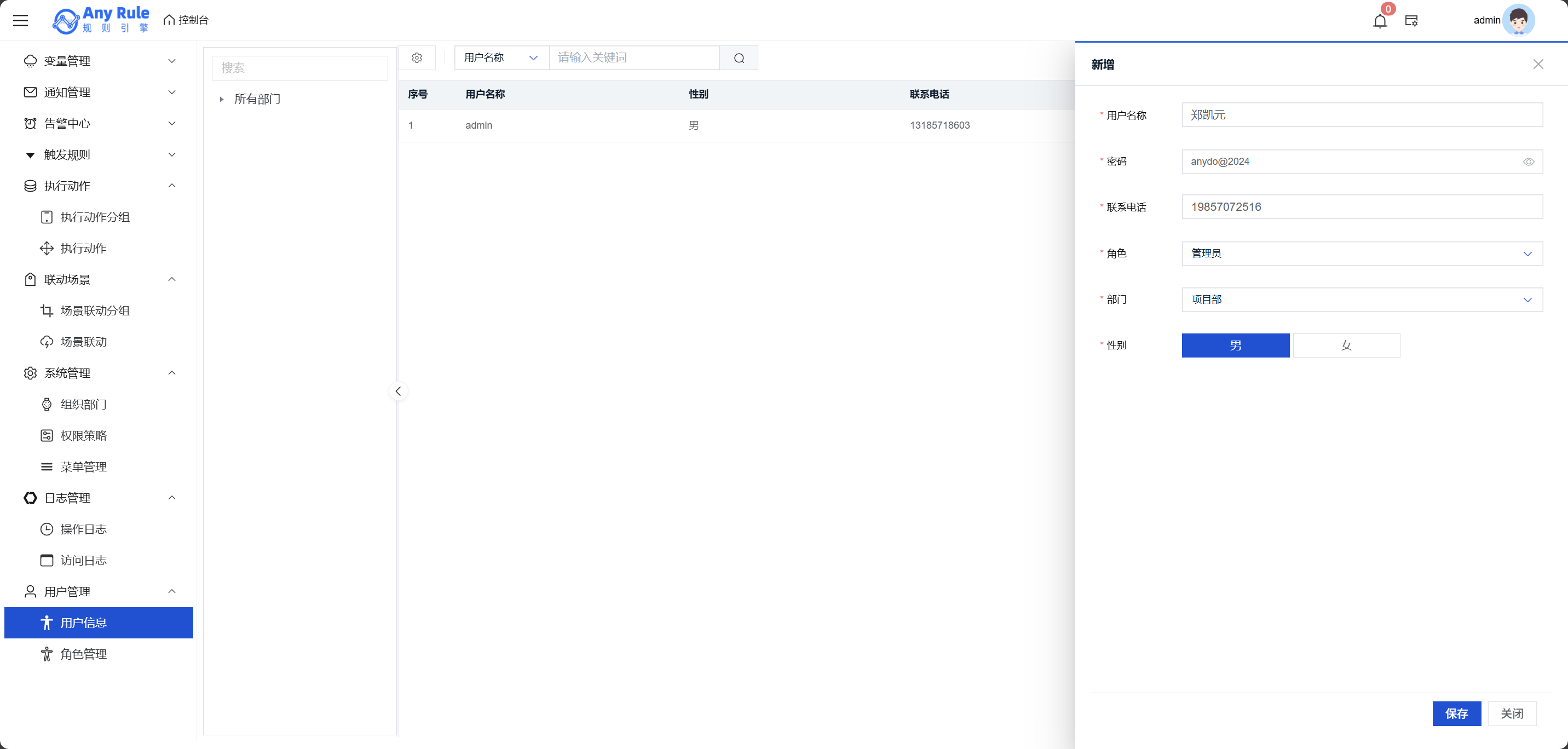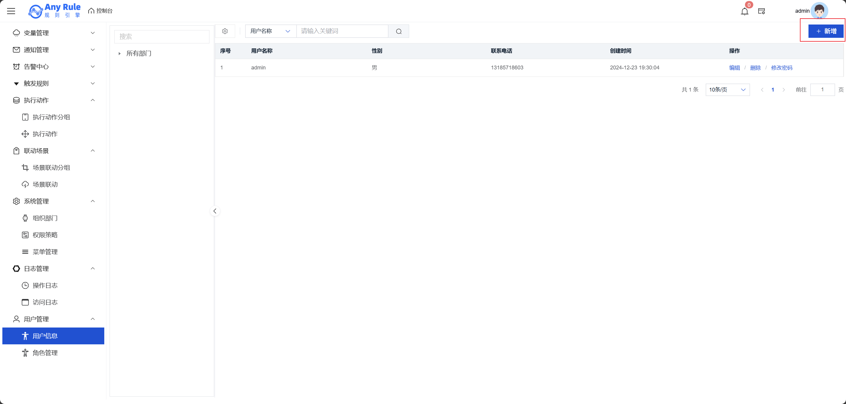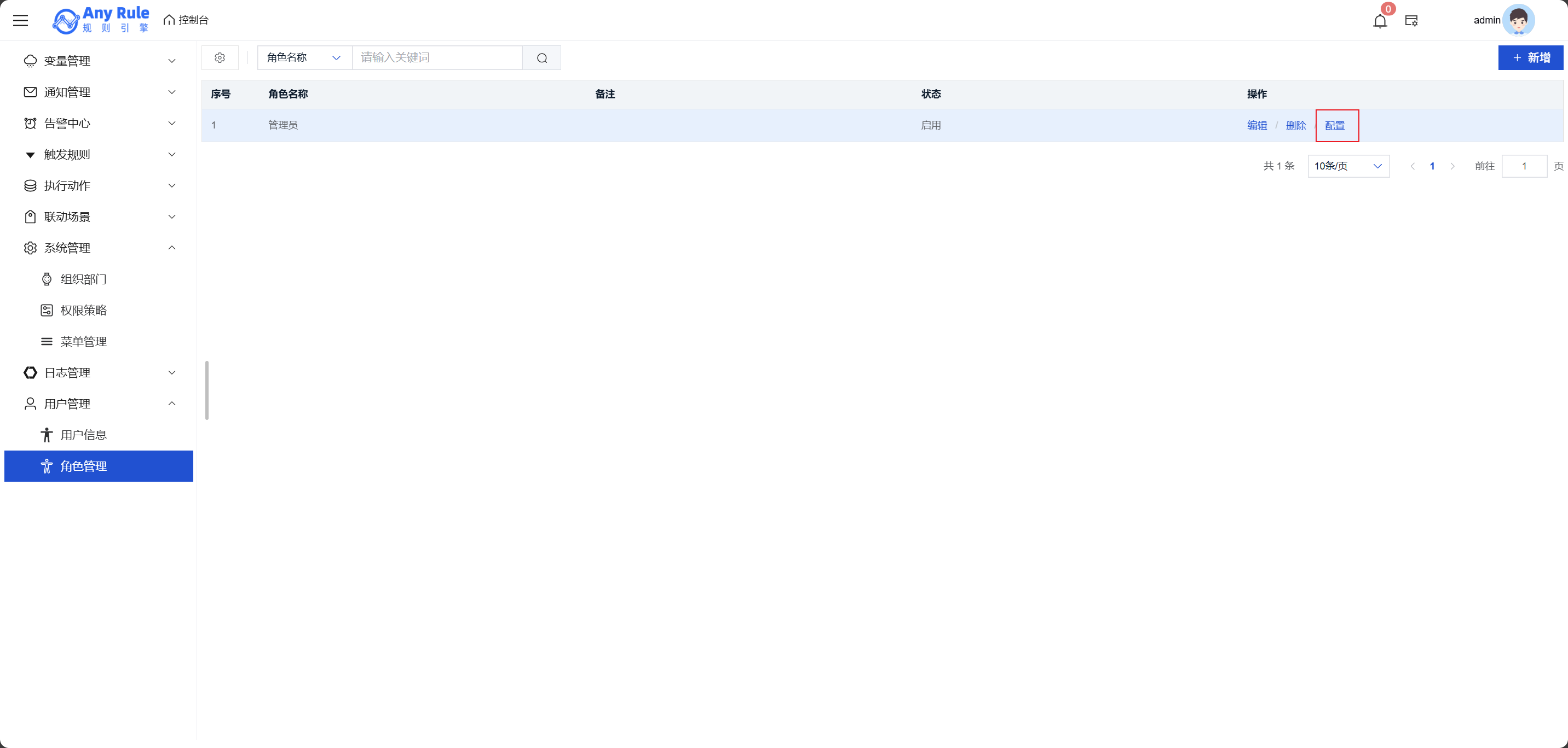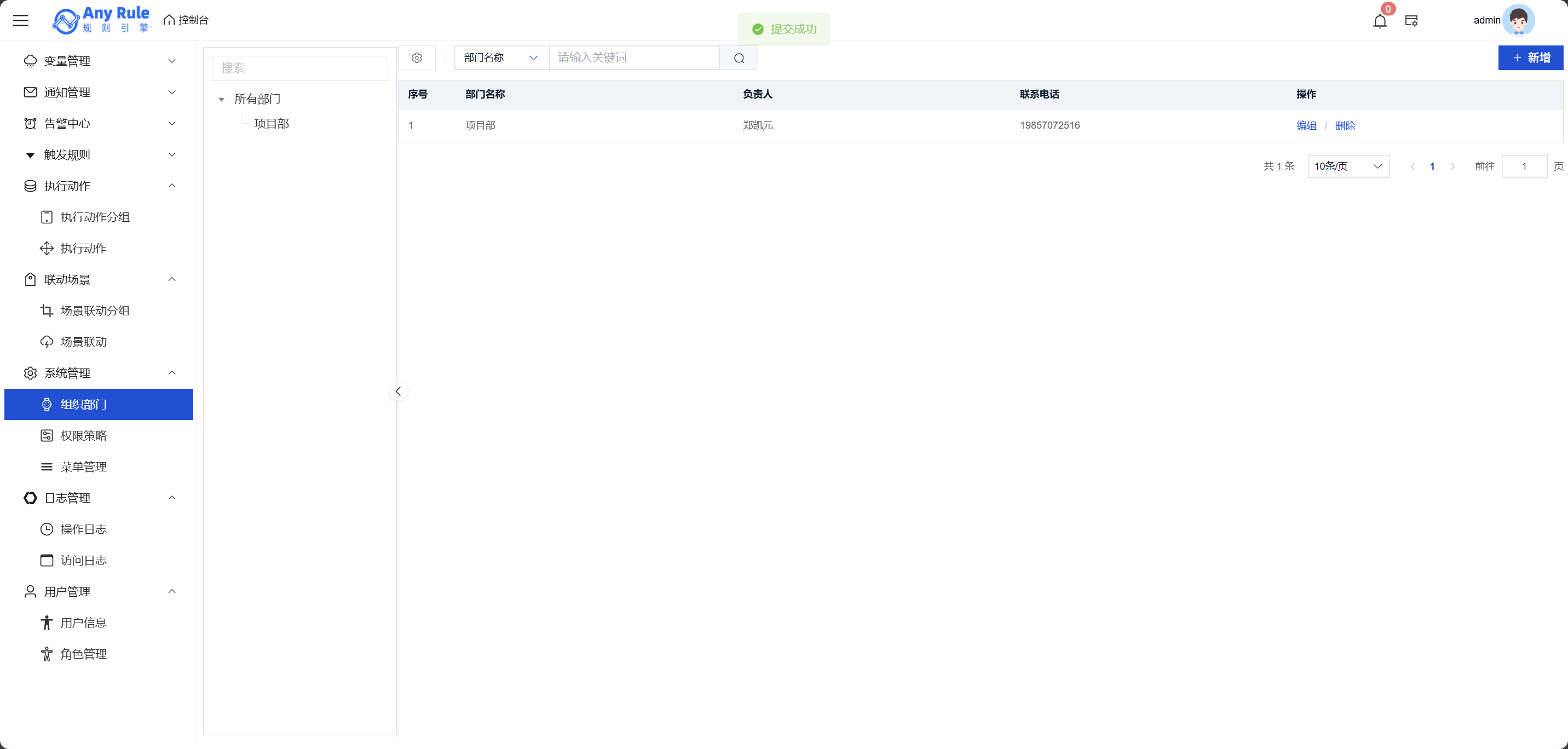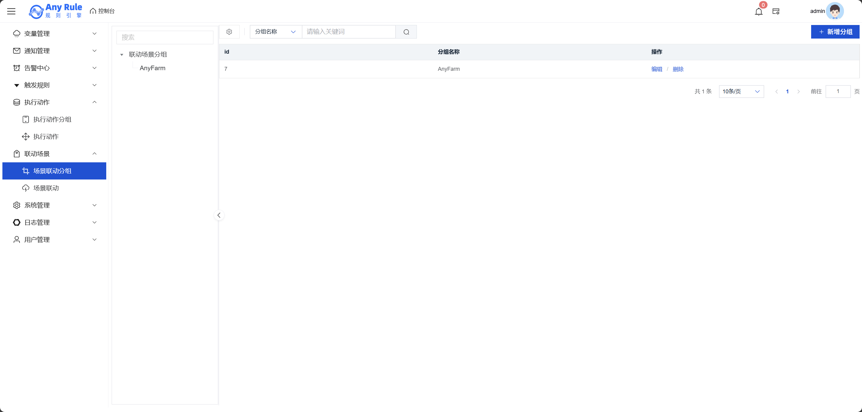 1.流程图  2.操作流程 2.1变量管理 2.1.1变量分组 将相关的变量分组在一起,可以更容易地管理和查找,在页面右上角有新增分组按钮。  点击新增分组打开新增分组弹窗,在新增分组弹窗中填写相对应的信息,点击保存完成分组的添加。在右侧还有编辑和删除的按钮可以对该行数据进行修改和删除的操作。   2.1.2变量管理 变量管理在规则引擎中负责存储、引用和传递数据,支持动态配置和数据模型设计,优化规则执行效率,并有助于错误处理和用户界面呈现,是实现业务规则自动化和灵活性的关键功能。  在右上角有新增变量按钮,点击按钮弹出新增变量弹窗,填写好相应的信息后点击保存完成变量新增。  这里的所属分组数据来自于变量分组中。  在变量管理右侧有设计按钮,点击设计进入变量设计页面,用户可以在此选择数据表和字段,配置变量名称、类型和值类型,并将选定的字段添加到变量中,最后通过点击“保存”按钮来保存变量配置。   2.2通知管理 2.2.1通知配置 通知配置可以结合通知配置为告警消息通知提供支撑。也可以用于系统中其他自定义模块的调用。  点击右上角的新增通知管理按钮,弹出新增通知管理弹窗,每个通知方式都有各自的配置信息,不同的通知类型也是。 通知方式:邮件 通知类型:邮件  通知方式:钉钉 通知类型:钉钉消息  通知方式:钉钉 通知类型:群机器人消息  通知方式:企业微信 通知类型:企业消息  通知方式:站内信 通知类型:站内信  可以根据不同的需求配置通知管理。 2.2.2通知模板 在规则引擎中,通知模板的作用是提供一种标准化和可配置的方式来生成和发送通知。  每个通知方式和通知类型都有各自的配置信息。 通知方式:钉钉 通知类型:钉钉消息  通知方式:钉钉 通知类型:群机器人消息  在群机器人中不同的消息类型也有不同的配置信息。  通知方式:企业微信 通知类型:企业消息  通知方式:邮件 通知类型:邮件  通知方式:站内信 通知类型:站内信  2.3告警中心 2.3.1告警级别配置 用户可以在此界面中查看、添加、编辑和删除告警级别,为每个级别设置名称、等级、颜色和图标,并通过搜索框快速查找特定告警级别,以便于管理和区分不同严重程度的告警事件。  2.3.2告警类型设置 告警类型在告警管理中的作用是将告警事件分类。  2.3.3告警设置 告警设置在告警管理中的作用是定义触发告警的具体条件、配置告警的严重级别、指定通知方式和内容。  点击右上角的新增告警设置按钮,跳转到告警设置新增页面,在这里可以配置告警类型、告警级别、告警名称、告警订阅的信息。告警类型信息来自于告警类型设置中,告警级别来自于告警级别设置好中。  2.4触发规则 2.4.1触发规则分组 触发规则分组可以将不同类型的触发规则归类到一起,使规则引擎的结构更加清晰、易于理解和维护。  2.4.2触发规则 触发规则负责根据预设的条件判断何时启动规则的执行。当满足特定的触发条件时,规则引擎会自动激活相应的规则逻辑,从而实现对数据的处理、决策的制定或业务流程的推进。  点击右上角的新增规则按钮弹出新增规则弹窗,输入好相应的信息点击保存完成触发规则的新增。  所属分组中的分组数据来自于触发规则分组当中。  点击右侧的设计进入规则设计页面。在规则设计页面中有两个板块,分别为绑定变量和功能。  在绑定变量中,选择所属的应用,接着选择数据表,选择完对应的数据表后在表字段中会显示该数据表中的所有字段,勾选需要的字段点击下方保存完成绑定变量。  (功能页面) 在这边可以给触发规则添加他的功能,点击右上角的新增功能按钮弹出新增功能弹窗。  新增功能弹窗分为两种,一种是数据集,一种是api。 功能类型:数据集 首先输入功能名称,选择功能类型为数据集,接着选择所属应用,选择完所属应用后在数据集ID中会显示该应用对应的数据集ID,选择好数据集ID接着在下方添加入参和出参,点击保存完成功能的添加。  功能类型:api  功能类型为api的则是在输入完功能名称后选择功能类型为api,选择需要的API_ID后添加入参和出参,点击保存即可完成功能添加。  2.5执行动作 2.5.1执行动作分组 执行动作分组可以将不同类型的执行动作归类到一起,使规则引擎的结构更加清晰、易于理解和维护。  2.5.2执行动作 执行动作是规则引擎中的核心功能组件,其作用在于当预定义的条件规则被满足时,自动触发预设的业务操作或逻辑处理(如数据更新、消息推送、流程跳转、外部接口调用等)。  点击右上角的新增动作按钮进入执行动作新增页面。 执行动作新增中每个动作类型有各自的动作类型配置。 执行动作:数据集   执行动作:API   执行动作:发送通知 在执行动作:发送通知中,有四种通知方式,分别为钉钉、企业微信、邮件、站内信,他们也有各自配置面板。 通知方式:钉钉 通知类型:钉钉消息  根据不同的需求填写对应的信息,点击下方保存完成执行动作的新增。 2.6联动场景 2.6.1场景联动分组 场景联动分组可以将不同类型的场景归类到一起,使规则引擎的结构更加清晰、易于理解和维护。  2.6.2场景联动 场景联动在规则引擎中通过定义条件触发的跨系统或跨流程协同机制,使规则引擎能够基于实时数据动态协调多个场景的交互与操作,从而实现复杂业务逻辑的自动化响应。它增强了规则引擎的灵活性与适