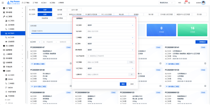 加工批次模块是加工管理板块的核心功能,聚焦加工业务批次的全流程数字化管理。通过整合批次基础信息(批次号、名称、品种、数量)、进度状态与关联模型,实现加工任务的标准化调度、进度监控与质量追溯,保障生产流程的有序性与产品质量的稳定性。  新增批次:点击新增批次,弹出新增批次弹窗,填写新增批次弹窗里的相关信息,点击保存完成新增批次操作。   搜索:先选择加工时间,再输入加工批次关键字进行搜索,完成搜索操作。  详情:点击详情(标红处),出现加工详情弹窗,用户可以在此查看该批次的详细信息。