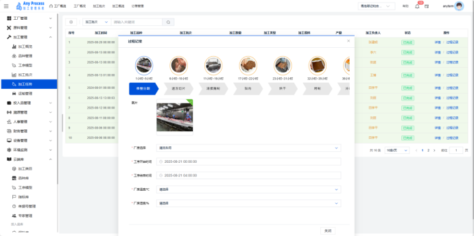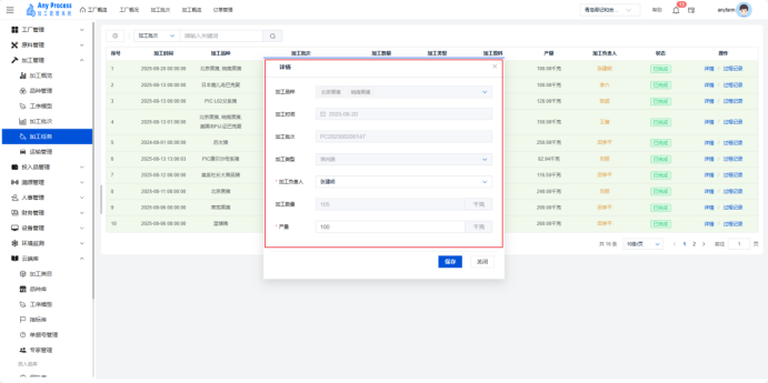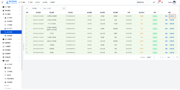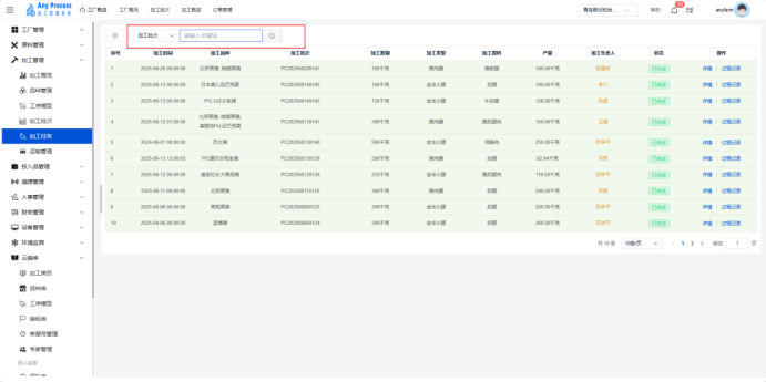 加工任务是加工管理系统的核心功能模块之一,用于集中管理工厂制品加工全流程任务信息,涵盖从任务创建到完成的全生命周期数据,助力企业精准把控加工进度、追溯生产过程、优化资源调配,提升加工环节运营效率与管理精细化水平。  详情:点击详情(标红处),出现详情弹窗,用户可以在此查看该加工的详细信息。   过程记录:点击过程记录(标红处),出现过程记录弹窗,用户可以在该弹窗查看加工任务的过程记录。   搜索:用户需要快速定位某一任务的信息时,输入加工批次关键字进行搜索,完成搜索操作。