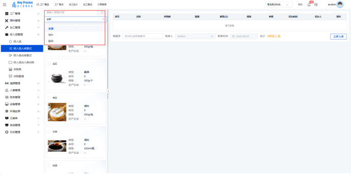 投入品入库登记是系统中投入品管理模块的子功能,用于规范记录投入品入库流程,实现入库信息的精准录入、关联与存储,为库存管理、生产用料追溯提供基础数据支撑,保障投入品从采购到生产环节的数据闭环。  搜索:首先在左侧列表上方选择投入品类型,再输入投入品名称关键字,完成搜索操作。  入库登记:先选择左侧列表投入品,再填写右侧投入品信息,点击立即入库,完成入库登记操作。