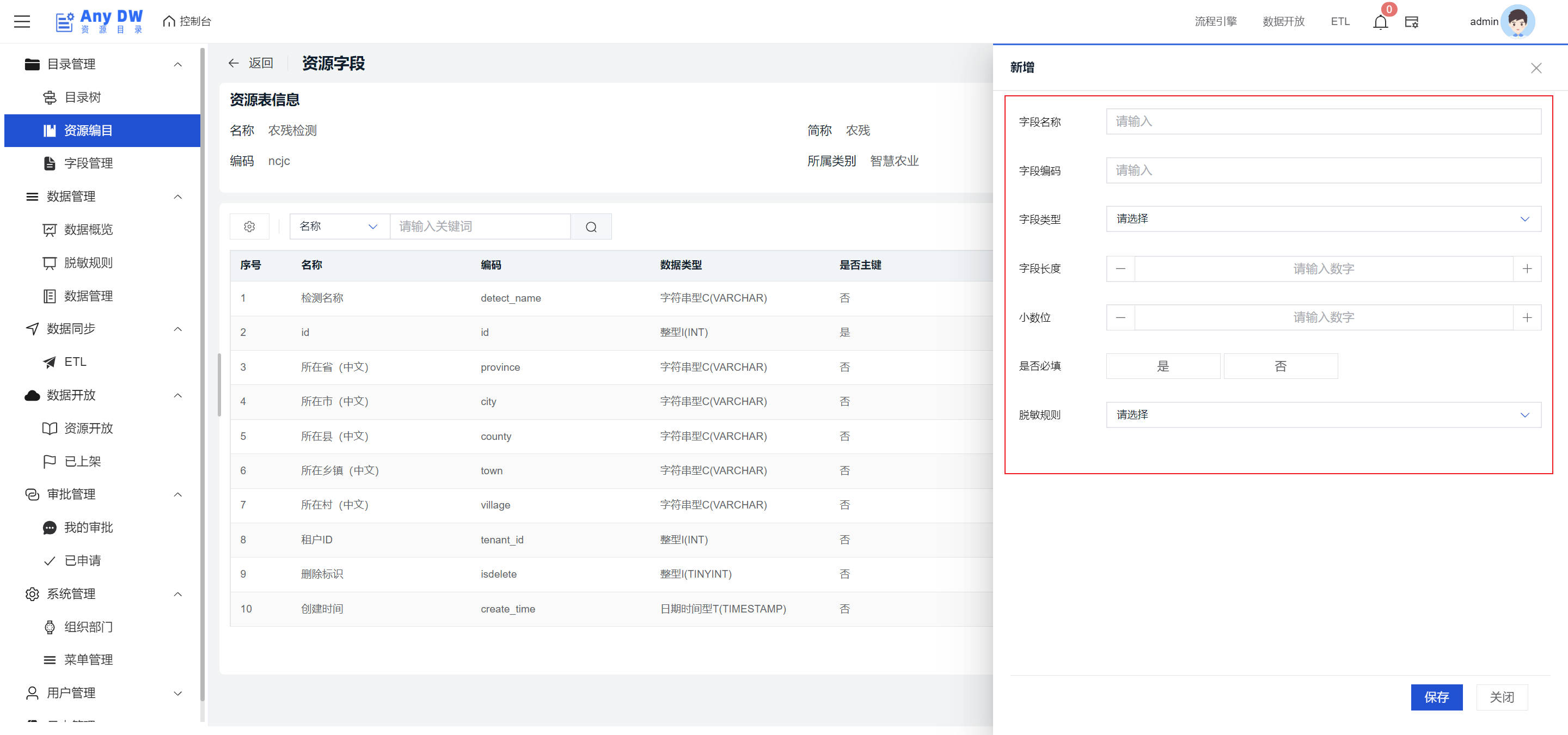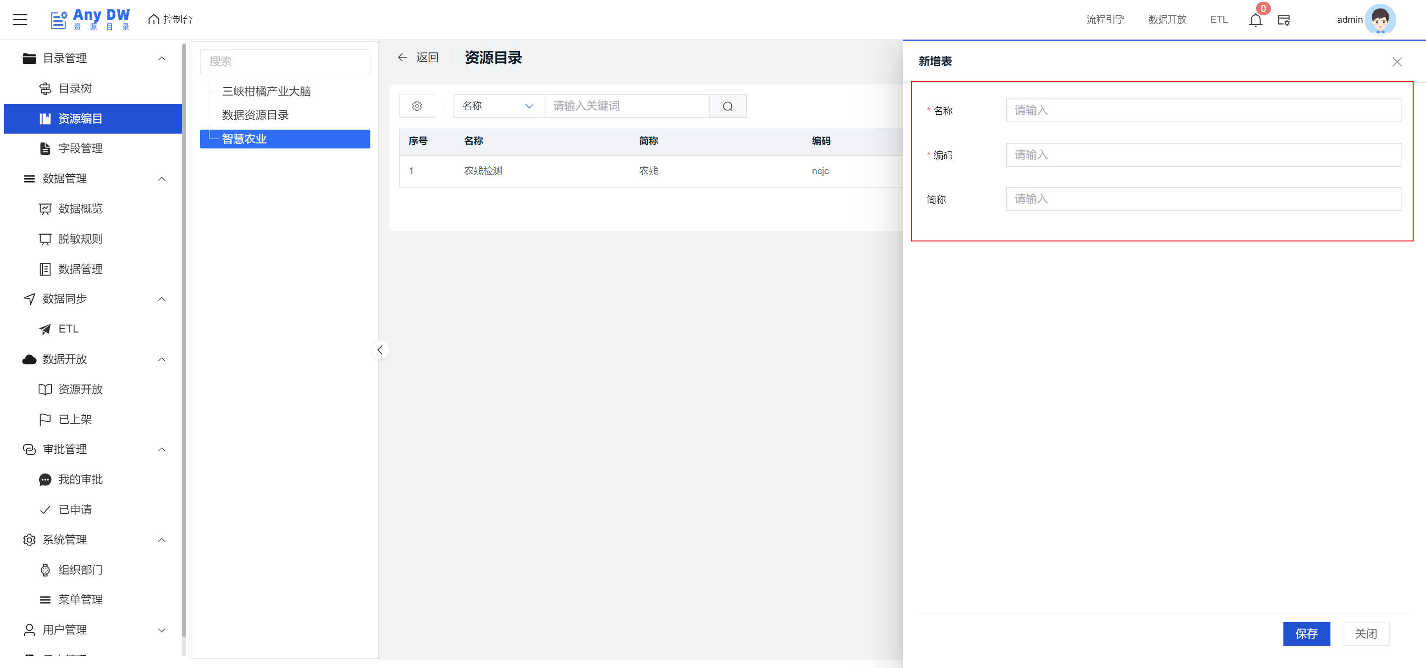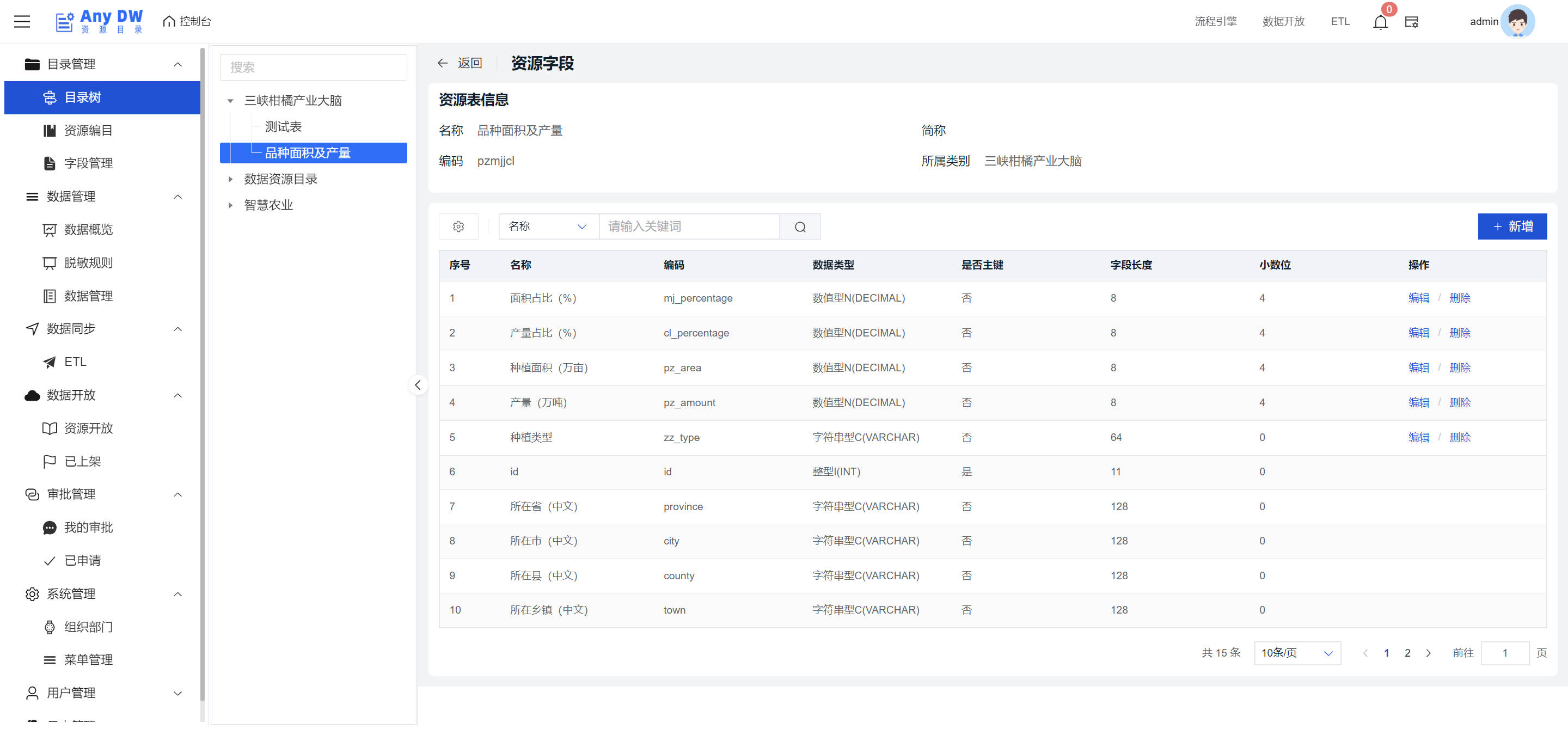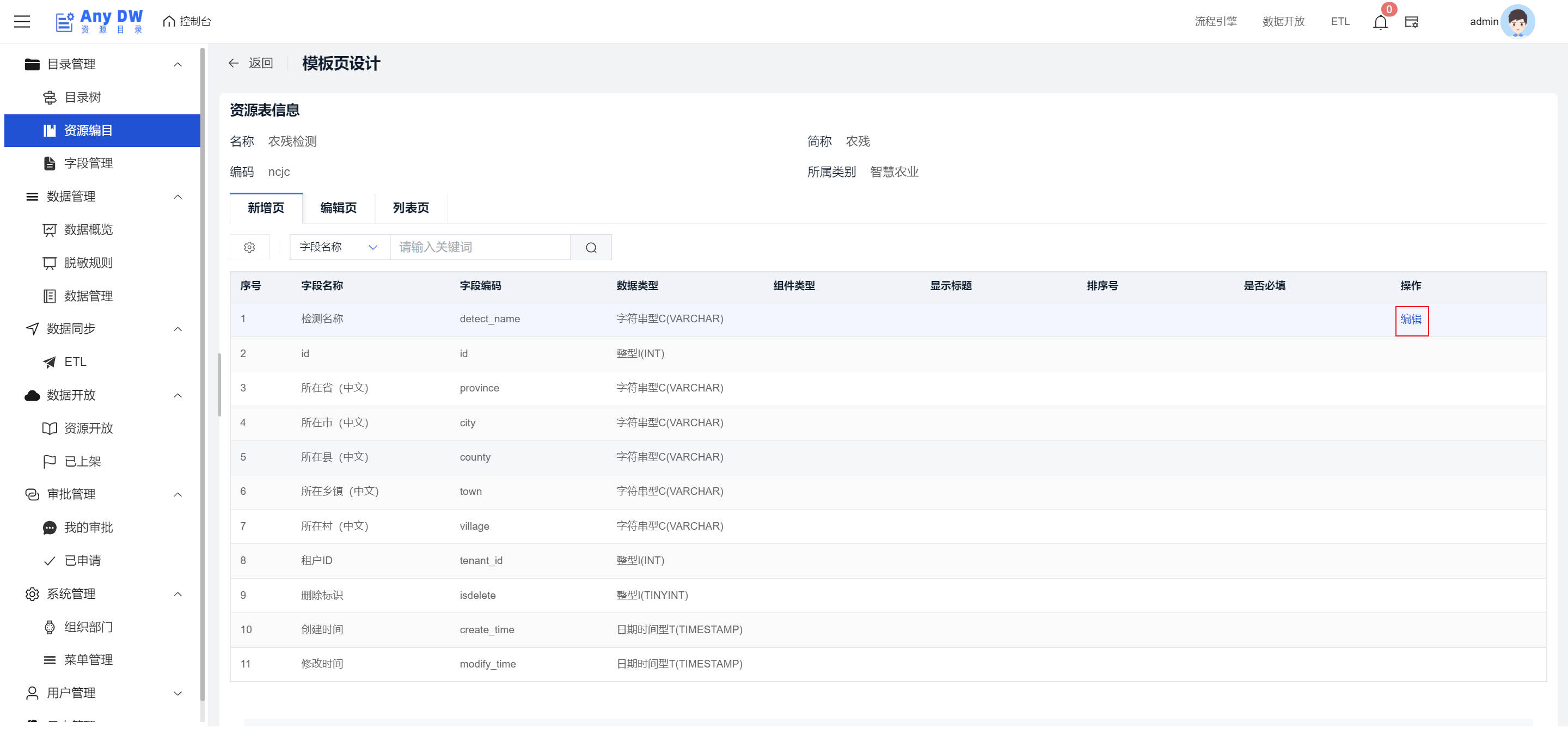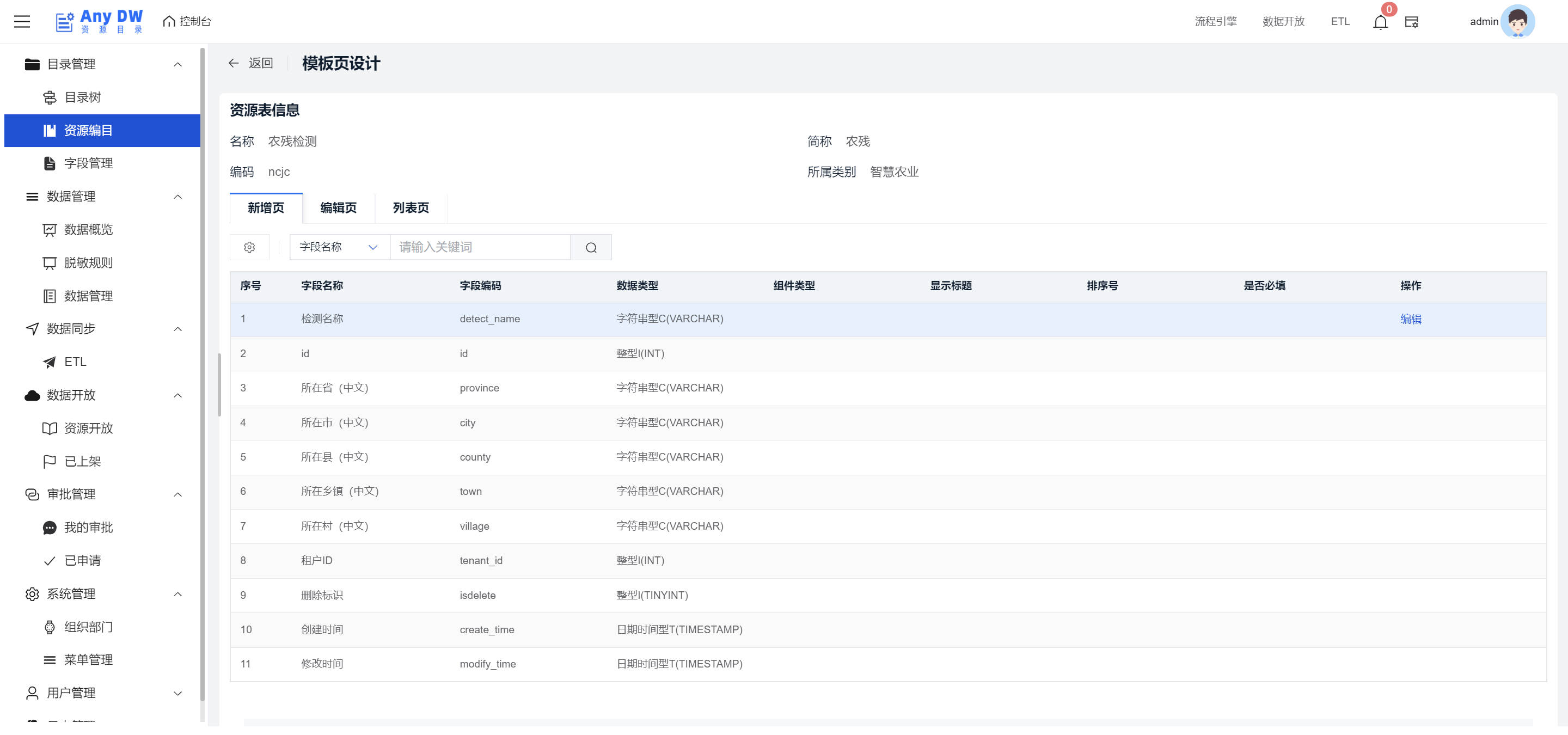 1.流程图  2.操作流程 2.1目录管理 2.1.1目录树 在目录树中添加所需要的类别,也能更好对后续资源进行分类管理,能够更方便快捷的找到所需要的资源。  2.1.2资源编目 在资源编目中可以在该资源中添加所需要的表。点击右侧的新建表,弹出弹窗,在弹窗内填写对应的信息,点击保存即可完成新建表。   在新增的表中可以对表进行编辑表、添加字段、删除、建表、模板设计的操作。  编辑表:可以对该表的名称、编码、简称进行修改。   字段:在字段中可以添加该表需要的字段,以及对该表的字段进行删除和编辑的操作  进入字段页面后,每张表都会有默认的字段(id、所在省、所在市、所在县等),这些是每个表所需要的,无法进行编辑修改的操作。  在右侧点击新增可以给该表新增字段。  在新增弹窗中填写相应的信息,点击保存完成字段的添加。  脱敏规则:该脱敏内容来自于数据管理中的脱敏规则,主要用于保护敏感数据的安全性和隐私性,同时确保数据在合法合规的范围内使用。  删除:对该表进行删除的操作。  建表:点击建表会生成建表语句,里面包含了在字段中添加的字段。点击弹窗中的建表按钮,即可完成建表。  在数据管理中找到该目录,就能看到刚建好的表。  模板设计(新增页、编辑页):模板设计即为对该表的样式进行修改,包括排列序号、标签位置等。  在表格的右侧,有该字段的编辑按钮,点击编辑按钮弹出弹窗,即可对该字段的显示名称、组件类型、排序号、是否必填进行修改,根据该表的需求可以自行进行修改。   在页面下方还有页面的参数设置,可以对该页面的标签位置和布局类型进行修改。  模板设计(列表页):列表页右侧有该字段的编辑按钮,点击编辑弹出编辑弹窗。  在该字段的编辑弹窗中可以对该字段的显示标题、排序号、是否隐藏、是否查询、查询类型信息进行修改。  在页面下方还有页面参数的设置,该页面参数中含有弹窗宽度和弹窗位置的信息,可以对该表格点击弹出的弹出的弹窗样式进行修改。 2.2数据管理 2.2.1脱敏规则 脱敏功能主要用于保护敏感数据的安全性和隐私性,同时确保数据在合法合规的范围内使用。  在脱敏规则中创建的脱敏算法数据,在字段管理中能使用。  2.2.2数据管理 数据管理中展示的是每个目录下已经创建好的表,在数据管理中可以对每个表进行新增、编辑等操作。  点击右上角新增打开新增弹窗,在新增弹窗中填写相应的信息,点击保存完成新增。  新增完在该表格中就能看到刚添加的信息。 在每行信息的右侧有编辑和删除按钮,可以对该行内容进行编辑和删除的操作。 在表格的右上角还有导入和导出的按钮,导入可以将其他slsx类型文件的内容导入该表格中,导出可以将该表格的数据导出为xlsx文件。  2.3数据同步 用于实现多种异构数据源之间的数据同步。  2.3.1运行报表  成功:显示成功执行的数据同步任务数量。 失败:显示失败的数据同步任务数量。 执行中:显示当前正在执行的数据同步任务数量。 这些统计信息可以帮助用户快速了解任务的整体执行情况。在下方的图表中用户可以通过图表直观地看到任务执行的趋势,例如哪些日期任务成功率较高,哪些日期任务失败较多。 2.3.2项目管理 项目管理功能是数据同步任务管理平台中的核心组成部分。在该页面中可以添加同步的项目。  2.3.3任务管理 2.3.3.1任务管理 任务管理页面是一个用于管理和监控数据同步任务的界面。  点击右上角的添加弹出弹窗,输入相应的信息点击确定完成添加。  2.3.3.2任务构建 数据资源目录的任务构建功能是一个用于创建和配置数据同步任务的界面,它允许用户定义如何从源数据源读取数据以及如何将数据写入目标数据存储。      2.3.3.3任务批量构建 任务批量构建功能是数据资源目录管理系统中的一个高级功能,它允许用户一次性创建多个数据同步任务,从而提高工作效率,减少重复性工作。     2.3.3.4 DataX任务模板 DataX任务模板功能是数据资源目录管理系统中的一个实用工具,它允许用户创建可复用的数据同步任务模板。这些模板定义了数据同步的标准流程和配置,使得用户能够快速启动新的数据同步任务而无需从头开始配置。  2.3.4数据源管理 数据源管理功能是数据资源目录管理系统中的一个核心模块,它允许用户添加、配置、维护和监控数据源。数据源是数据同步、数据集成和数据分析的基础,因此,有效的数据源管理对于确保数据质量和数据操作的效率至关重要。  2.3.5日志管理 日志管理功能是数据资源目录管理系统中的一个重要模块,它用于记录、存储、分析和查询系统中的各种操作日志和系统日志。右侧还有清除按钮可以对日志数据进行清除。  2.3.6执行器管理 执行器管理功能是数据资源目录管理系统中的一个关键模块,它负责管理和维护系统中用于执行数据同步任务的执行器。  2.3.7用户管理 用户管理功能是数据资源目录管理系统中的一个基础且重要的模块,它允许系统管理员对用户账户进行创建、维护和监控。这个功能对于控制用户访问权限、确保数据安全和提高系统管理效率至关重要。这里可以对用户进行添加、编辑和删除的操作。  2.3.8资源监控 负责实时监控和展示系统中各种资源的使用情况和性能指标。这个功能对于确保系统稳定运行、优化资源分配和预防潜在问题至关重要。  2