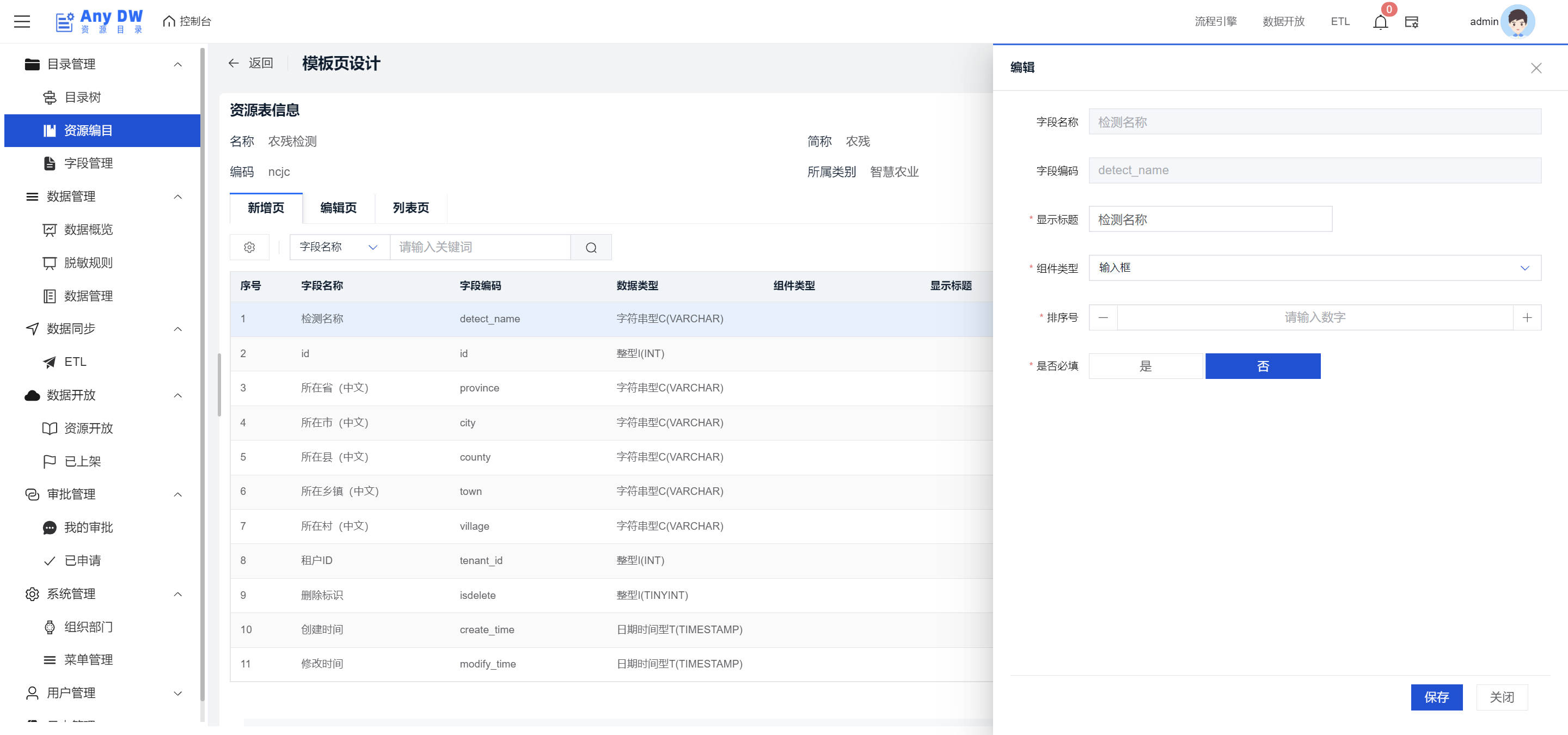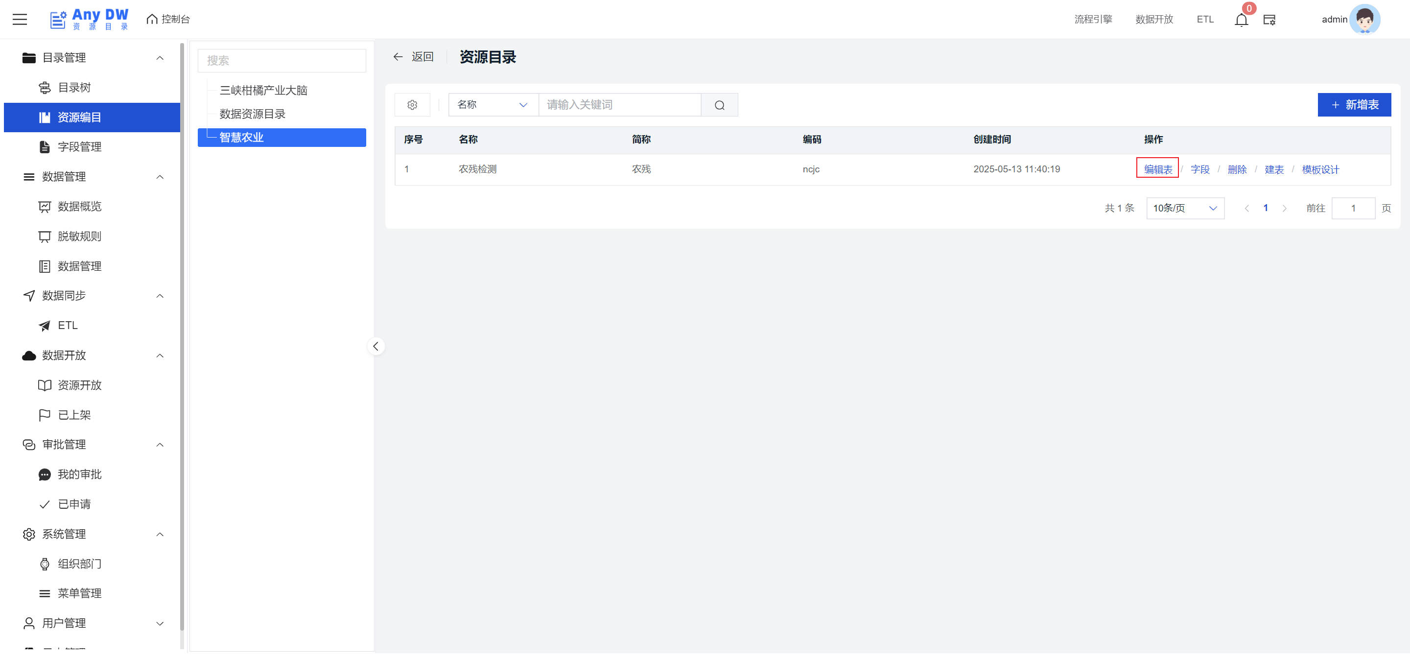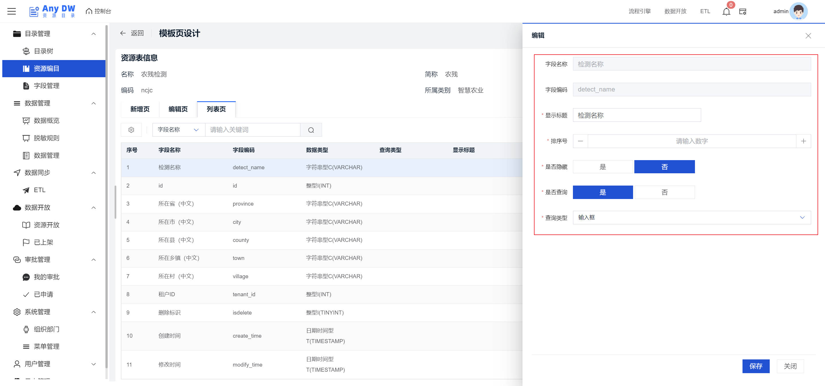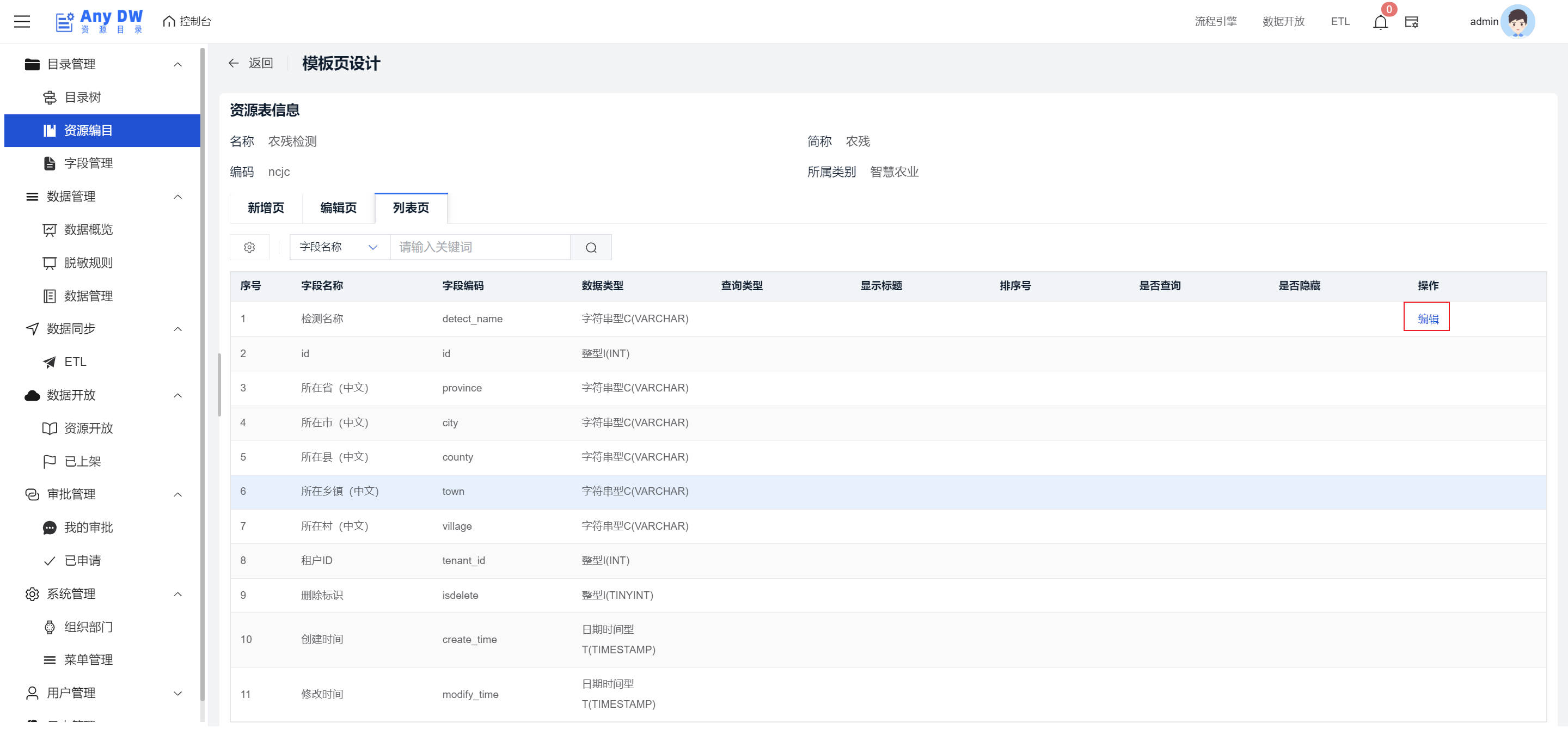1.流程图  2.操作流程 2.1目录管理 2.1.1目录树 在目录树中添加所需要的类别,也能更好对后续资源进行分类管理,能够更方便快捷的找到所需要的资源。  2.1.2资源编目 在资源编目中可以在该资源中添加所需要的表。点击右侧的新建表,弹出弹窗,在弹窗内填写对应的信息,点击保存即可完成新建表。   在新增的表中可以对表进行编辑表、添加字段、删除、建表、模板设计的操作。  编辑表:可以对该表的名称、编码、简称进行修改。   字段:在字段中可以添加该表需要的字段,以及对该表的字段进行删除和编辑的操作  进入字段页面后,每张表都会有默认的字段(id、所在省、所在市、所在县等),这些是每个表所需要的,无法进行编辑修改的操作。  在右侧点击新增可以给该表新增字段。  在新增弹窗中填写相应的信息,点击保存完成字段的添加。  脱敏规则:该脱敏内容来自于数据管理中的脱敏规则,主要用于保护敏感数据的安全性和隐私性,同时确保数据在合法合规的范围内使用。  删除:对该表进行删除的操作。  建表:点击建表会生成建表语句,里面包含了在字段中添加的字段。点击弹窗中的建表按钮,即可完成建表。  在数据管理中找到该目录,就能看到刚建好的表。  模板设计(新增页、编辑页):模板设计即为对该表的样式进行修改,包括排列序号、标签位置等。  在表格的右侧,有该字段的编辑按钮,点击编辑按钮弹出弹窗,即可对该字段的显示名称、组件类型、排序号、是否必填进行修改,根据该表的需求可以自行进行修改。   在页面下方还有页面的参数设置,可以对该页面的标签位置和布局类型进行修改。  模板设计(列表页):列表页右侧有该字段的编辑按钮,点击编辑弹出编辑弹窗。  在该字段的编辑弹窗中可以对该字段的显示标题、排序号、是否隐藏、是否查询、查询类型信息进行修改。  在页面下方还有页面参数的设置,该页面参数中含有弹窗宽度和弹窗位置的信息,可以对该表格点击弹出的弹出的弹窗样式进行修改。 2.2数据管理 2.2.1脱敏规则 脱敏功能主要用于保护敏感数据的安全性和隐私性,同时确保数据在合法合规的范围内使用。  在脱敏规则中创建的脱敏算法数据,在字段管理中能使用。  2.2.2数据管理 数据管理中展示的是每个目录下已经创建好的表,在数据管理中可以对每个表进行新增、编辑等操作。  点击右上角新增打开新增弹窗,在新增弹窗中填写相应的信息,点击保存完成新增。  新增完在该表格中就能看到刚添加的信息。 在每行信息的右侧有编辑和删除按钮,可以对该行内容进行编辑和删除的操作。 在表格的右上角还有导入和导出的按钮,导入可以将其他slsx类型文件的内容导入该表格中,导出可以将该表格的数据导出为xlsx文件。  2.3数据同步 用于实现多种异构数据源之间的数据同步。  2.3.1运行报表  成功:显示成功执行的数据同步任务数量。 失败:显示失败的数据同步任务数量。 执行中:显示当前正在执行的数据同步任务数量。 这些统计信息可以帮助用户快速了解任务的整体执行情况。在下方的图表中用户可以通过图表直观地看到任务执行的趋势,例如哪些日期任务成功率较高,哪些日期任务失败较多。 2.3.2项目管理 项目管理功能是数据同步任务管理平台中的核心组成部分。在该页面中可以添加同步的项目。  2.3.3任务管理 2.3.3.1任务管理 任务管理页面是一个用于管理和监控数据同步任务的界面。  点击右上角的添加弹出弹窗,输入相应的信息点击确定完成添加。  2.3.3.2任务构建 数据资源目录的任务构建功能是一个用于创建和配置数据同步任务的界面,它允许用户定义如何从源数据源读取数据以及如何将数据写入目标数据存储。      2.3.3.3任务批量构建 任务批量构建功能是数据资源目录管理系统中的一个高级功能,它允许用户一次性创建多个数据同步任务,从而提高工作效率,减少重复性工作。     2.3.3.4 DataX任务模板 DataX任务模板功能是数据资源目录管理系统中的一个实用工具,它允许用户创建可复用的数据同步任务模板。这些模板定义了数据同步的标准流程和配置,使得用户能够快速启动新的数据同步任务而无需从头开始配置。  2.3.4数据源管理 数据源管理功能是数据资源目录管理系统中的一个核心模块,它允许用户添加、配置、维护和监控数据源。数据源是数据同步、数据集成和数据分析的基础,因此,有效的数据源管理对于确保数据质量和数据操作的效率至关重要。  2.3.5日志管理 日志管理功能是数据资源目录管理系统中的一个重要模块,它用于记录、存储、分析和查询系统中的各种操作日志和系统日志。右侧还有清除按钮可以对日志数据进行清除。  2.3.6执行器管理 执行器管理功能是数据资源目录管理系统中的一个关键模块,它负责管理和维护系统中用于执行数据同步任务的执行器。  2.3.7用户管理 用户管理功能是数据资源目录管理系统中的一个基础且重要的模块,它允许系统管理员对用户账户进行创建、维护和监控。这个功能对于控制用户访问权限、确保数据安全和提高系统管理效率至关重要。这里可以对用户进行添加、编辑和删除的操作。  2.3.8资源监控 负责实时监控和展示系统中各种资源的使用情况和性能指标。这个功能对于确保系统稳定运行、优化资源分配和预防潜在问题至关重要。  2