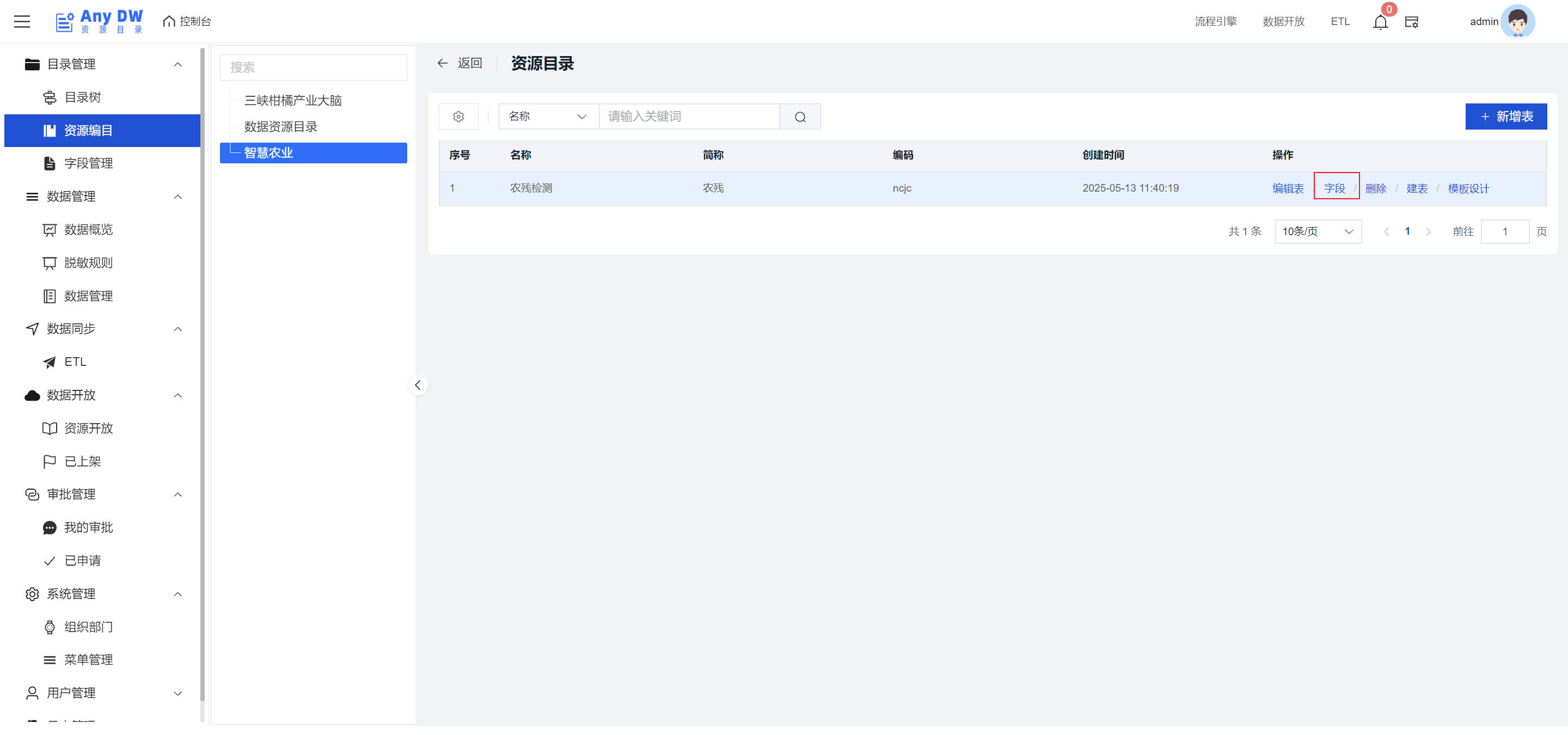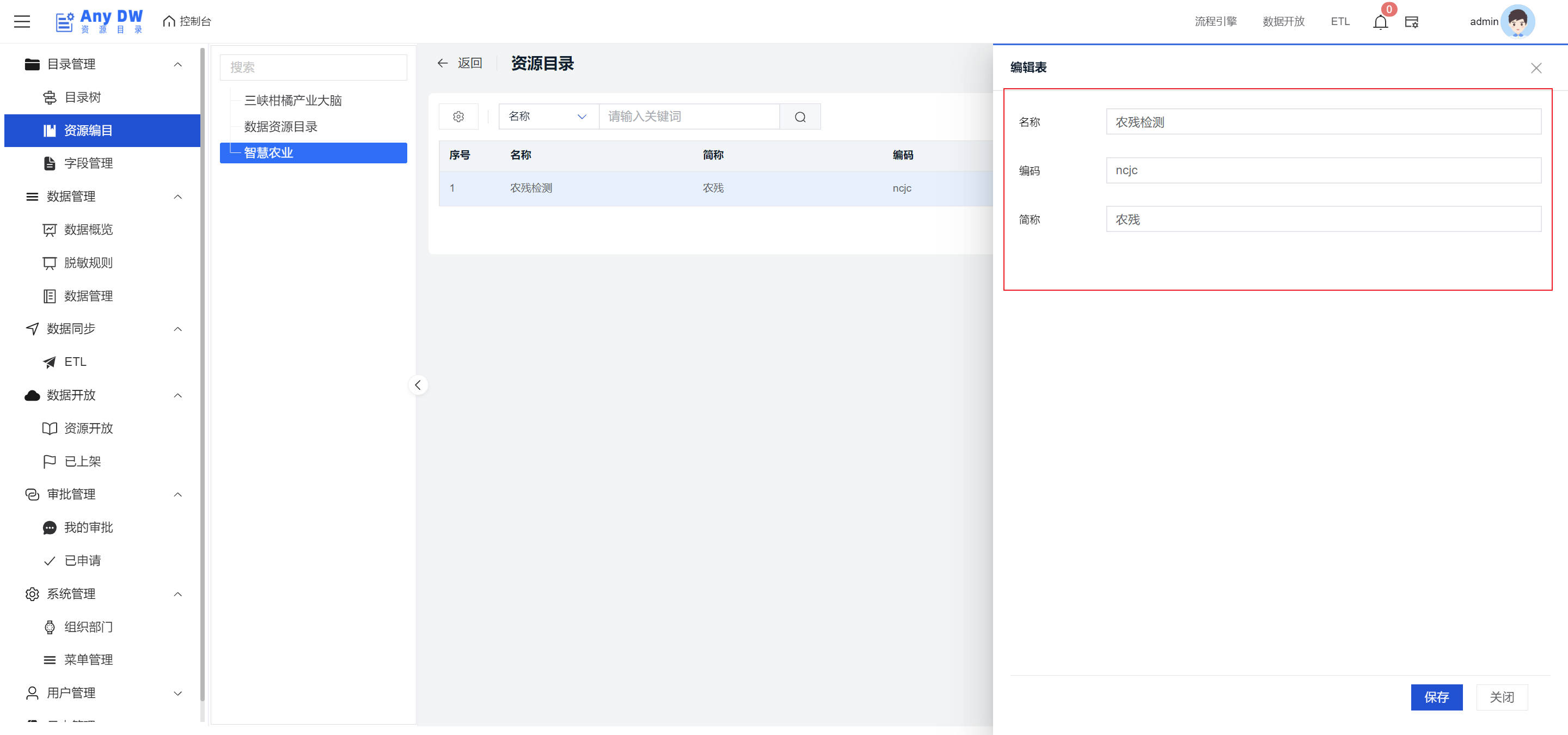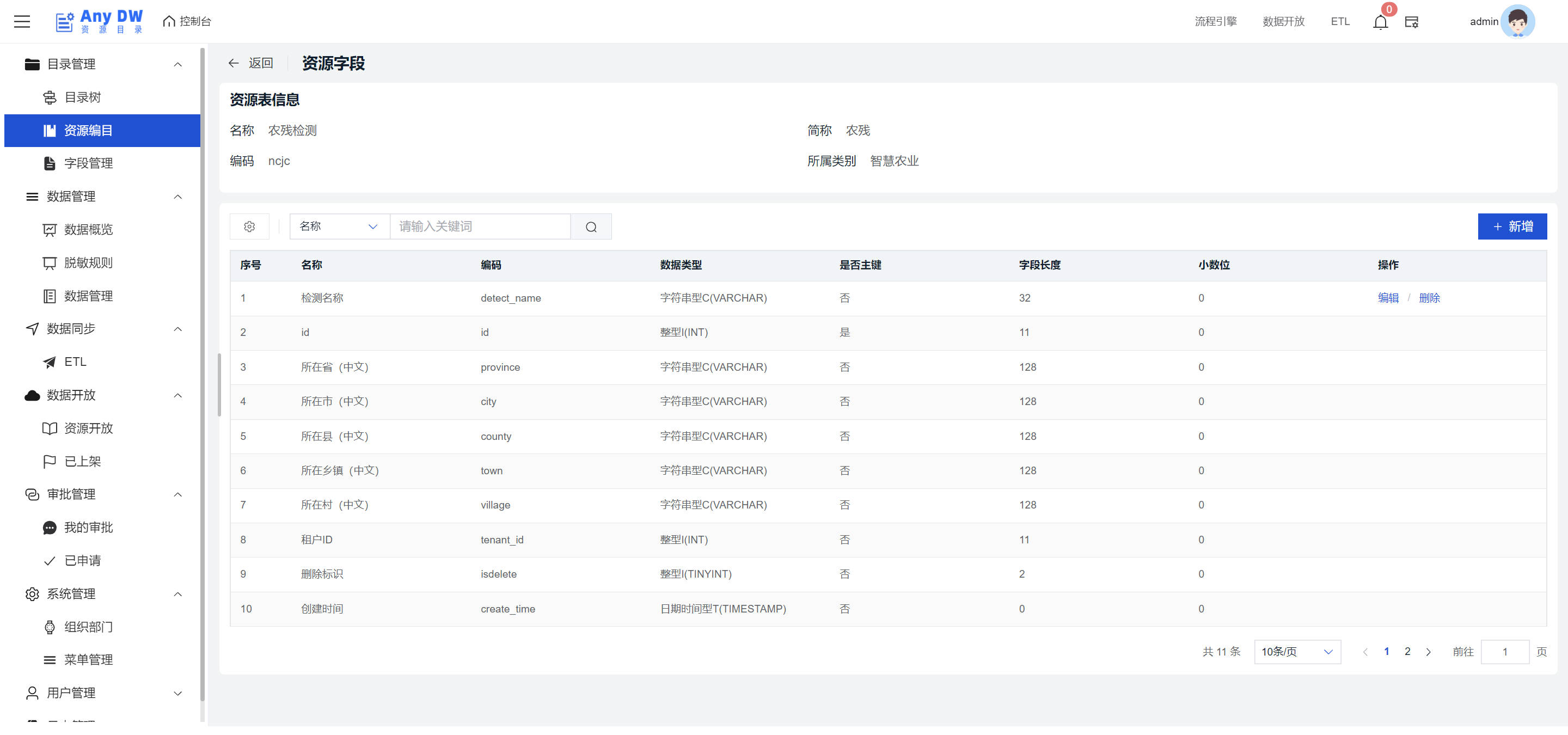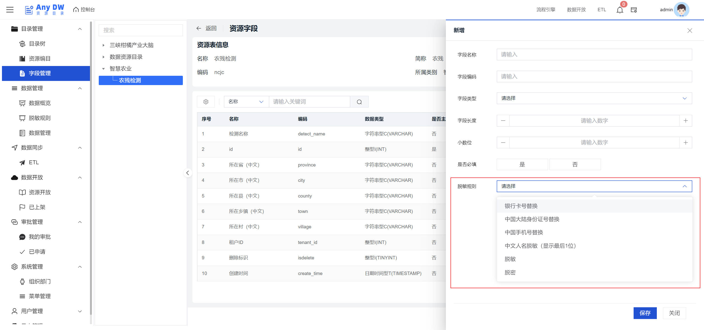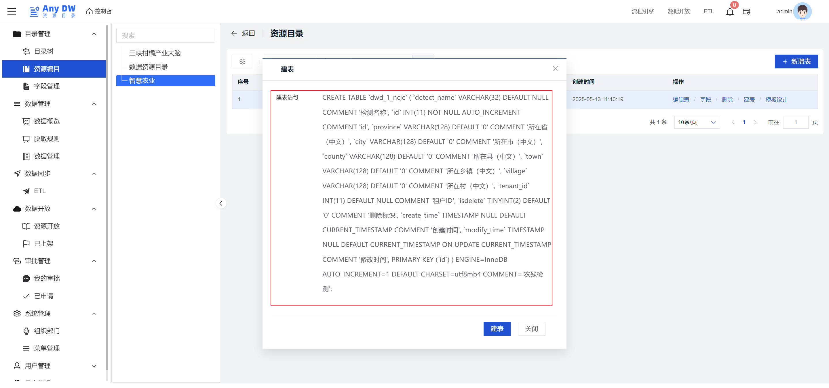 1.流程图  2.操作流程 2.1目录管理 2.1.1目录树 在目录树中添加所需要的类别,也能更好对后续资源进行分类管理,能够更方便快捷的找到所需要的资源。  2.1.2资源编目 在资源编目中可以在该资源中添加所需要的表。点击右侧的新建表,弹出弹窗,在弹窗内填写对应的信息,点击保存即可完成新建表。   在新增的表中可以对表进行编辑表、添加字段、删除、建表、模板设计的操作。  编辑表:可以对该表的名称、编码、简称进行修改。   字段:在字段中可以添加该表需要的字段,以及对该表的字段进行删除和编辑的操作  进入字段页面后,每张表都会有默认的字段(id、所在省、所在市、所在县等),这些是每个表所需要的,无法进行编辑修改的操作。  在右侧点击新增可以给该表新增字段。  在新增弹窗中填写相应的信息,点击保存完成字段的添加。  脱敏规则:该脱敏内容来自于数据管理中的脱敏规则,主要用于保护敏感数据的安全性和隐私性,同时确保数据在合法合规的范围内使用。  删除:对该表进行删除的操作。  建表:点击建表会生成建表语句,里面包含了在字段中添加的字段。点击弹窗中的建表按钮,即可完成建表。  在数据管理中找到该目录,就能看到刚建好的表。  模板设计(新增页、编辑页):模板设计即为对该表的样式进行修改,包括排列序号、标签位置等。  在表格的右侧,有该字段的编辑按钮,点击编辑按钮弹出弹窗,即可对该字段的显示名称、组件类型、排序号、是否必填进行修改,根据该表的需求可以自行进行修改。   在页面下方还有页面的参数设置,可以对该页面的标签位置和布局类型进行修改。  模板设计(列表页):列表页右侧有该字段的编辑按钮,点击编辑弹出编辑弹窗。  在该字段的编辑弹窗中可以对该字段的显示标题、排序号、是否隐藏、是否查询、查询类型信息进行修改。  在页面下方还有页面参数的设置,该页面参数中含有弹窗宽度和弹窗位置的信息,可以对该表格点击弹出的弹出的弹窗样式进行修改。 2.2数据管理 2.2.1脱敏规则 脱敏功能主要用于保护敏感数据的安全性和隐私性,同时确保数据在合法合规的范围内使用。  在脱敏规则中创建的脱敏算法数据,在字段管理中能使用。  2.2.2数据管理 数据管理中展示的是每个目录下已经创建好的表,在数据管理中可以对每个表进行新增、编辑等操作。  点击右上角新增打开新增弹窗,在新增弹窗中填写相应的信息,点击保存完成新增。  新增完在该表格中就能看到刚添加的信息。 在每行信息的右侧有编辑和删除按钮,可以对该行内容进行编辑和删除的操作。 在表格的右上角还有导入和导出的按钮,导入可以将其他slsx类型文件的内容导入该表格中,导出可以将该表格的数据导出为xlsx文件。  2.3数据同步 用于实现多种异构数据源之间的数据同步。  2.3.1运行报表  成功:显示成功执行的数据同步任务数量。 失败:显示失败的数据同步任务数量。 执行中:显示当前正在执行的数据同步任务数量。 这些统计信息可以帮助用户快速了解任务的整体执行情况。在下方的图表中用户可以通过图表直观地看到任务执行的趋势,例如哪些日期任务成功率较高,哪些日期任务失败较多。 2.3.2项目管理 项目管理功能是数据同步任务管理平台中的核心组成部分。在该页面中可以添加同步的项目。  2.3.3任务管理 2.3.3.1任务管理 任务管理页面是一个用于管理和监控数据同步任务的界面。  点击右上角的添加弹出弹窗,输入相应的信息点击确定完成添加。  2.3.3.2任务构建 数据资源目录的任务构建功能是一个用于创建和配置数据同步任务的界面,它允许用户定义如何从源数据源读取数据以及如何将数据写入目标数据存储。      2.3.3.3任务批量构建 任务批量构建功能是数据资源目录管理系统中的一个高级功能,它允许用户一次性创建多个数据同步任务,从而提高工作效率,减少重复性工作。     2.3.3.4 DataX任务模板 DataX任务模板功能是数据资源目录管理系统中的一个实用工具,它允许用户创建可复用的数据同步任务模板。这些模板定义了数据同步的标准流程和配置,使得用户能够快速启动新的数据同步任务而无需从头开始配置。  2.3.4数据源管理 数据源管理功能是数据资源目录管理系统中的一个核心模块,它允许用户添加、配置、维护和监控数据源。数据源是数据同步、数据集成和数据分析的基础,因此,有效的数据源管理对于确保数据质量和数据操作的效率至关重要。  2.3.5日志管理 日志管理功能是数据资源目录管理系统中的一个重要模块,它用于记录、存储、分析和查询系统中的各种操作日志和系统日志。右侧还有清除按钮可以对日志数据进行清除。  2.3.6执行器管理 执行器管理功能是数据资源目录管理系统中的一个关键模块,它负责管理和维护系统中用于执行数据同步任务的执行器。  2.3.7用户管理 用户管理功能是数据资源目录管理系统中的一个基础且重要的模块,它允许系统管理员对用户账户进行创建、维护和监控。这个功能对于控制用户访问权限、确保数据安全和提高系统管理效率至关重要。这里可以对用户进行添加、编辑和删除的操作。  2.3.8资源监控 负责实时监控和展示系统中各种资源的使用情况和性能指标。这个功能对于确保系统稳定运行、优化资源分配和预防潜在问题至关重要。  2