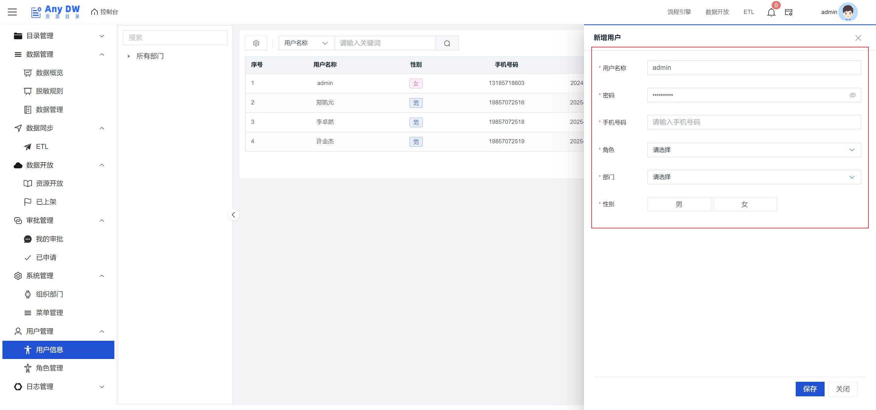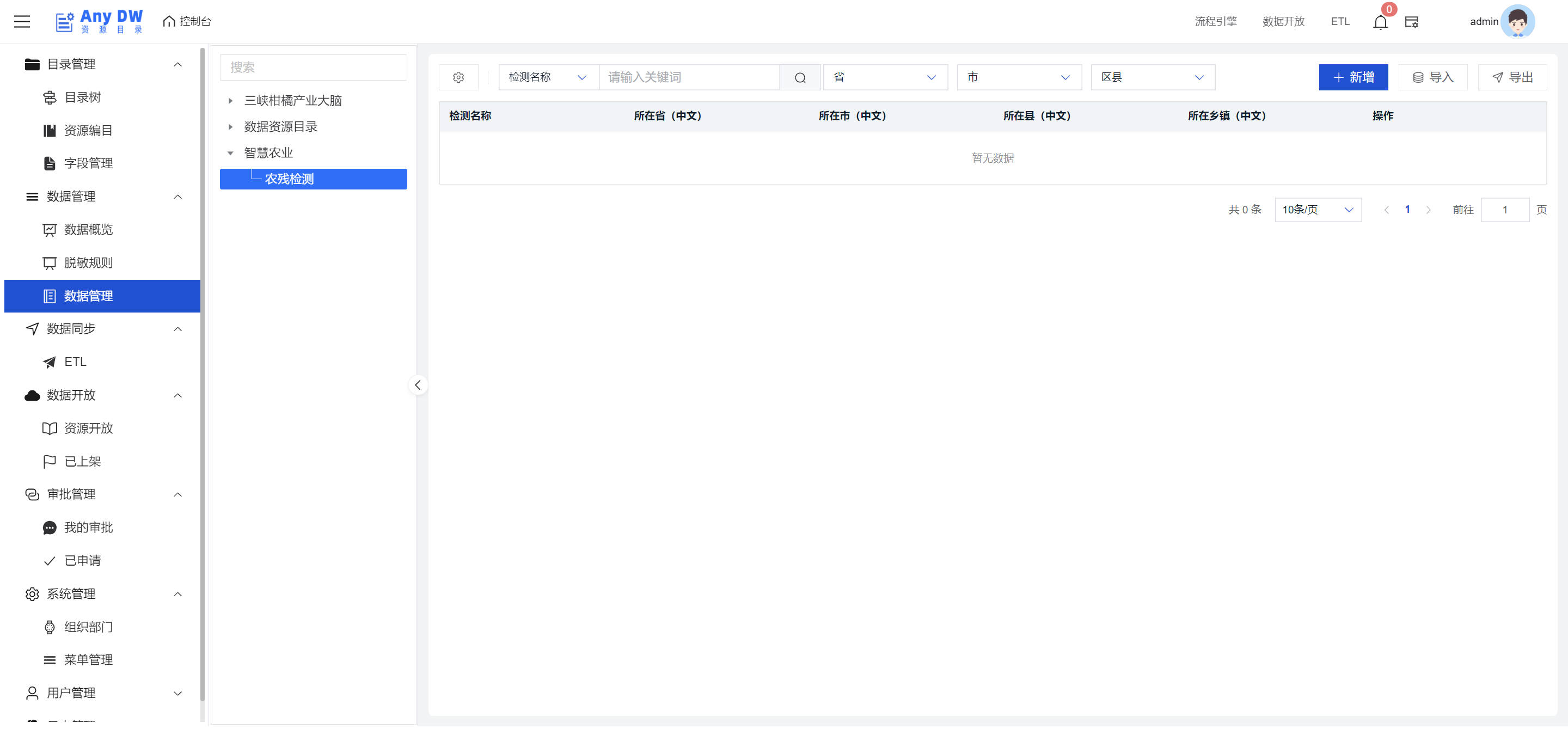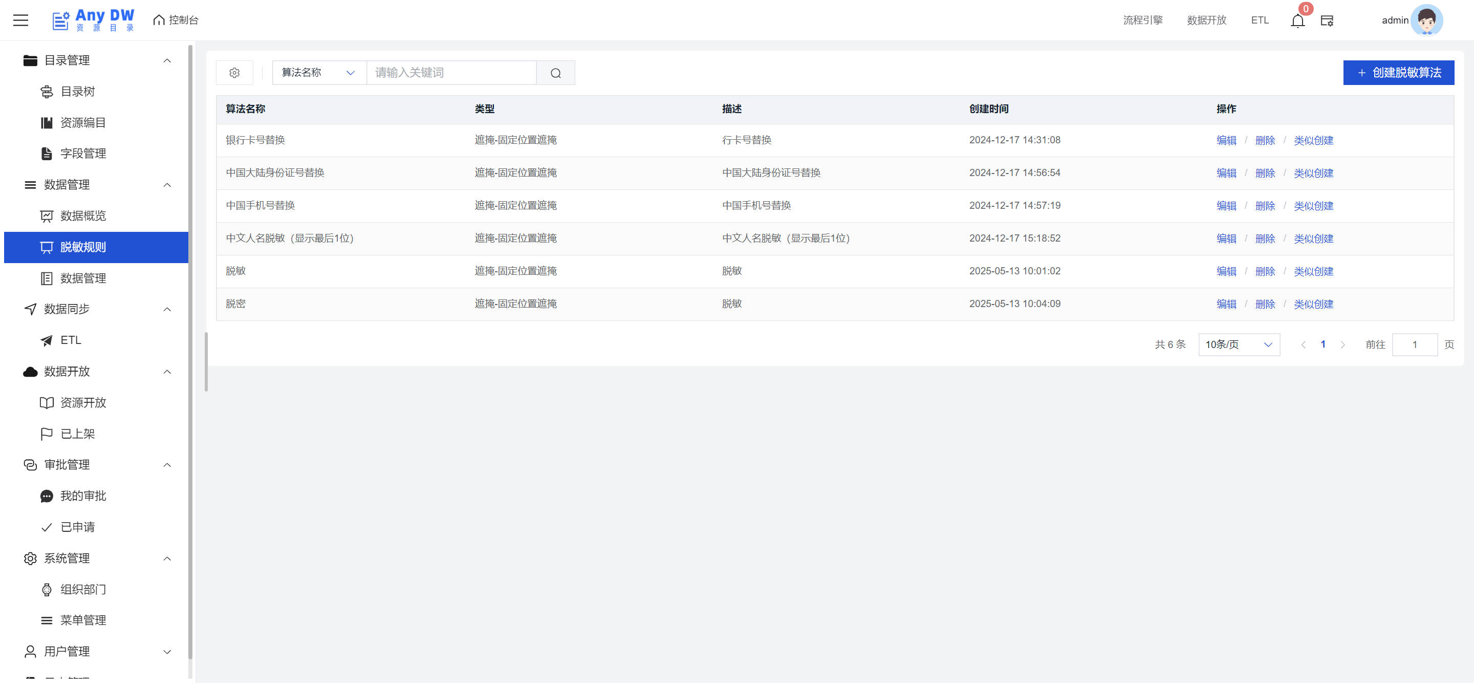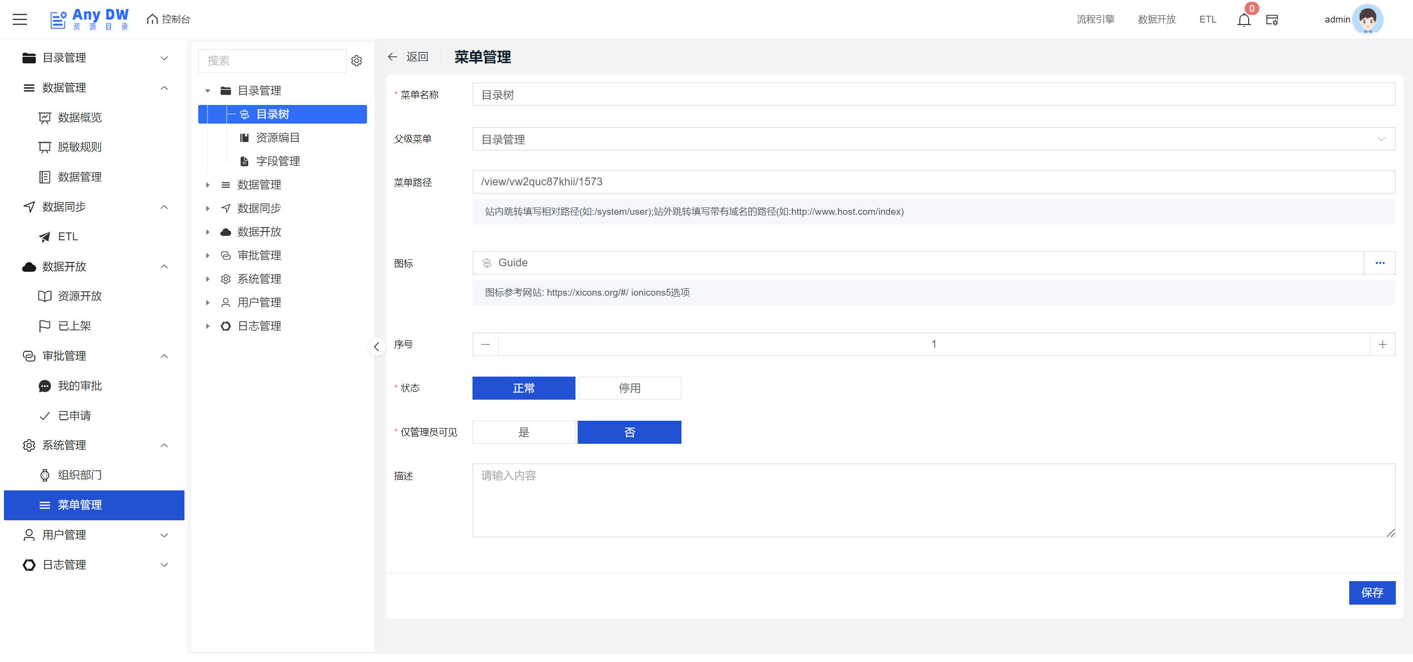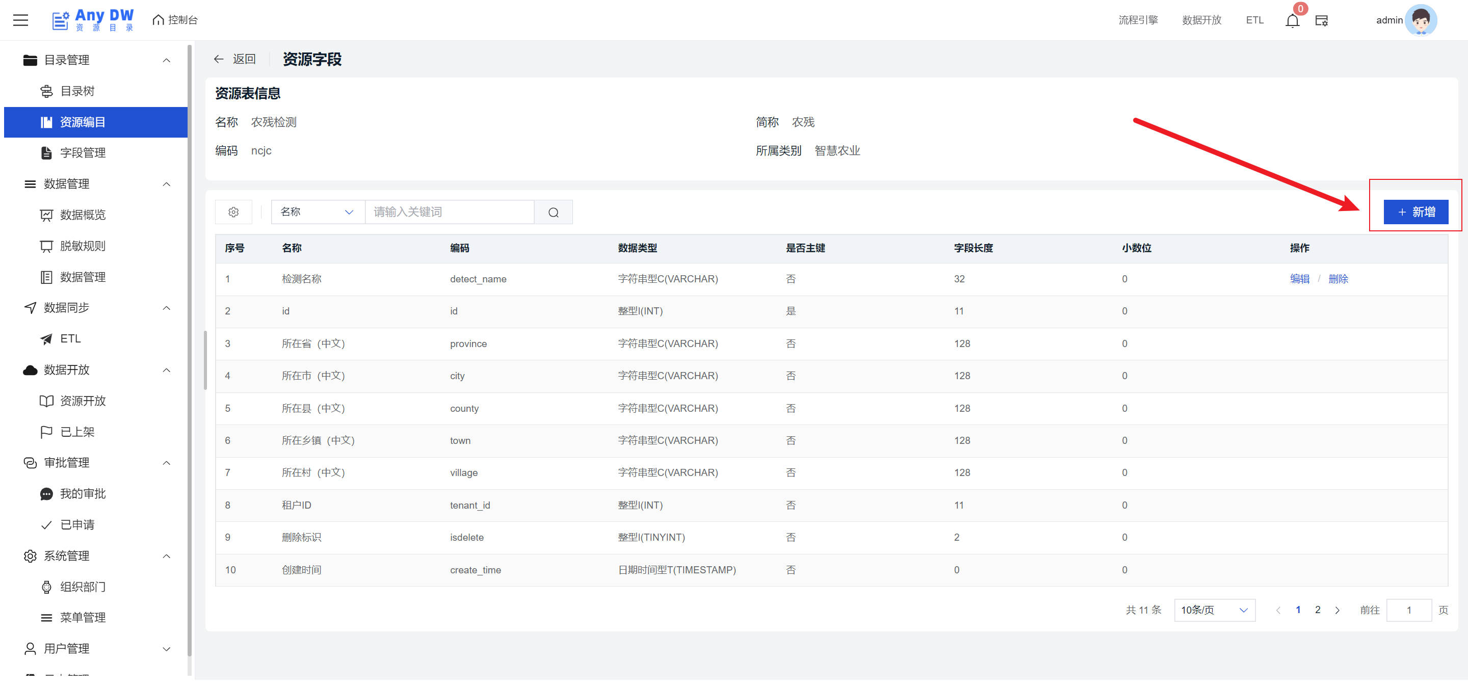 1.流程图  2.操作流程 2.1目录管理 2.1.1目录树 在目录树中添加所需要的类别,也能更好对后续资源进行分类管理,能够更方便快捷的找到所需要的资源。  2.1.2资源编目 在资源编目中可以在该资源中添加所需要的表。点击右侧的新建表,弹出弹窗,在弹窗内填写对应的信息,点击保存即可完成新建表。   在新增的表中可以对表进行编辑表、添加字段、删除、建表、模板设计的操作。  编辑表:可以对该表的名称、编码、简称进行修改。   字段:在字段中可以添加该表需要的字段,以及对该表的字段进行删除和编辑的操作  进入字段页面后,每张表都会有默认的字段(id、所在省、所在市、所在县等),这些是每个表所需要的,无法进行编辑修改的操作。  在右侧点击新增可以给该表新增字段。  在新增弹窗中填写相应的信息,点击保存完成字段的添加。  脱敏规则:该脱敏内容来自于数据管理中的脱敏规则,主要用于保护敏感数据的安全性和隐私性,同时确保数据在合法合规的范围内使用。  删除:对该表进行删除的操作。  建表:点击建表会生成建表语句,里面包含了在字段中添加的字段。点击弹窗中的建表按钮,即可完成建表。  在数据管理中找到该目录,就能看到刚建好的表。  模板设计(新增页、编辑页):模板设计即为对该表的样式进行修改,包括排列序号、标签位置等。  在表格的右侧,有该字段的编辑按钮,点击编辑按钮弹出弹窗,即可对该字段的显示名称、组件类型、排序号、是否必填进行修改,根据该表的需求可以自行进行修改。   在页面下方还有页面的参数设置,可以对该页面的标签位置和布局类型进行修改。  模板设计(列表页):列表页右侧有该字段的编辑按钮,点击编辑弹出编辑弹窗。  在该字段的编辑弹窗中可以对该字段的显示标题、排序号、是否隐藏、是否查询、查询类型信息进行修改。  在页面下方还有页面参数的设置,该页面参数中含有弹窗宽度和弹窗位置的信息,可以对该表格点击弹出的弹出的弹窗样式进行修改。 2.2数据管理 2.2.1脱敏规则 脱敏功能主要用于保护敏感数据的安全性和隐私性,同时确保数据在合法合规的范围内使用。  在脱敏规则中创建的脱敏算法数据,在字段管理中能使用。  2.2.2数据管理 数据管理中展示的是每个目录下已经创建好的表,在数据管理中可以对每个表进行新增、编辑等操作。  点击右上角新增打开新增弹窗,在新增弹窗中填写相应的信息,点击保存完成新增。  新增完在该表格中就能看到刚添加的信息。 在每行信息的右侧有编辑和删除按钮,可以对该行内容进行编辑和删除的操作。 在表格的右上角还有导入和导出的按钮,导入可以将其他slsx类型文件的内容导入该表格中,导出可以将该表格的数据导出为xlsx文件。  2.3数据同步 用于实现多种异构数据源之间的数据同步。  2.3.1运行报表  成功:显示成功执行的数据同步任务数量。 失败:显示失败的数据同步任务数量。 执行中:显示当前正在执行的数据同步任务数量。 这些统计信息可以帮助用户快速了解任务的整体执行情况。在下方的图表中用户可以通过图表直观地看到任务执行的趋势,例如哪些日期任务成功率较高,哪些日期任务失败较多。 2.3.2项目管理 项目管理功能是数据同步任务管理平台中的核心组成部分。在该页面中可以添加同步的项目。  2.3.3任务管理 2.3.3.1任务管理 任务管理页面是一个用于管理和监控数据同步任务的界面。  点击右上角的添加弹出弹窗,输入相应的信息点击确定完成添加。  2.3.3.2任务构建 数据资源目录的任务构建功能是一个用于创建和配置数据同步任务的界面,它允许用户定义如何从源数据源读取数据以及如何将数据写入目标数据存储。      2.3.3.3任务批量构建 任务批量构建功能是数据资源目录管理系统中的一个高级功能,它允许用户一次性创建多个数据同步任务,从而提高工作效率,减少重复性工作。     2.3.3.4 DataX任务模板 DataX任务模板功能是数据资源目录管理系统中的一个实用工具,它允许用户创建可复用的数据同步任务模板。这些模板定义了数据同步的标准流程和配置,使得用户能够快速启动新的数据同步任务而无需从头开始配置。  2.3.4数据源管理 数据源管理功能是数据资源目录管理系统中的一个核心模块,它允许用户添加、配置、维护和监控数据源。数据源是数据同步、数据集成和数据分析的基础,因此,有效的数据源管理对于确保数据质量和数据操作的效率至关重要。  2.3.5日志管理 日志管理功能是数据资源目录管理系统中的一个重要模块,它用于记录、存储、分析和查询系统中的各种操作日志和系统日志。右侧还有清除按钮可以对日志数据进行清除。  2.3.6执行器管理 执行器管理功能是数据资源目录管理系统中的一个关键模块,它负责管理和维护系统中用于执行数据同步任务的执行器。  2.3.7用户管理 用户管理功能是数据资源目录管理系统中的一个基础且重要的模块,它允许系统管理员对用户账户进行创建、维护和监控。这个功能对于控制用户访问权限、确保数据安全和提高系统管理效率至关重要。这里可以对用户进行添加、编辑和删除的操作。  2.3.8资源监控 负责实时监控和展示系统中各种资源的使用情况和性能指标。这个功能对于确保系统稳定运行、优化资源分配和预防潜在问题至关重要。  2