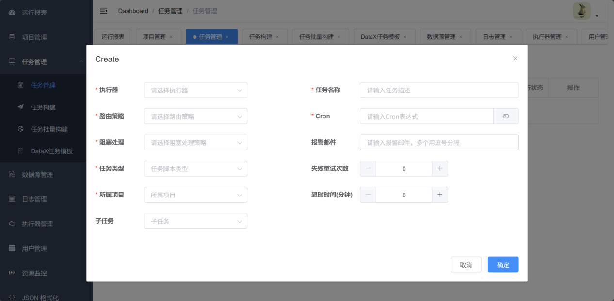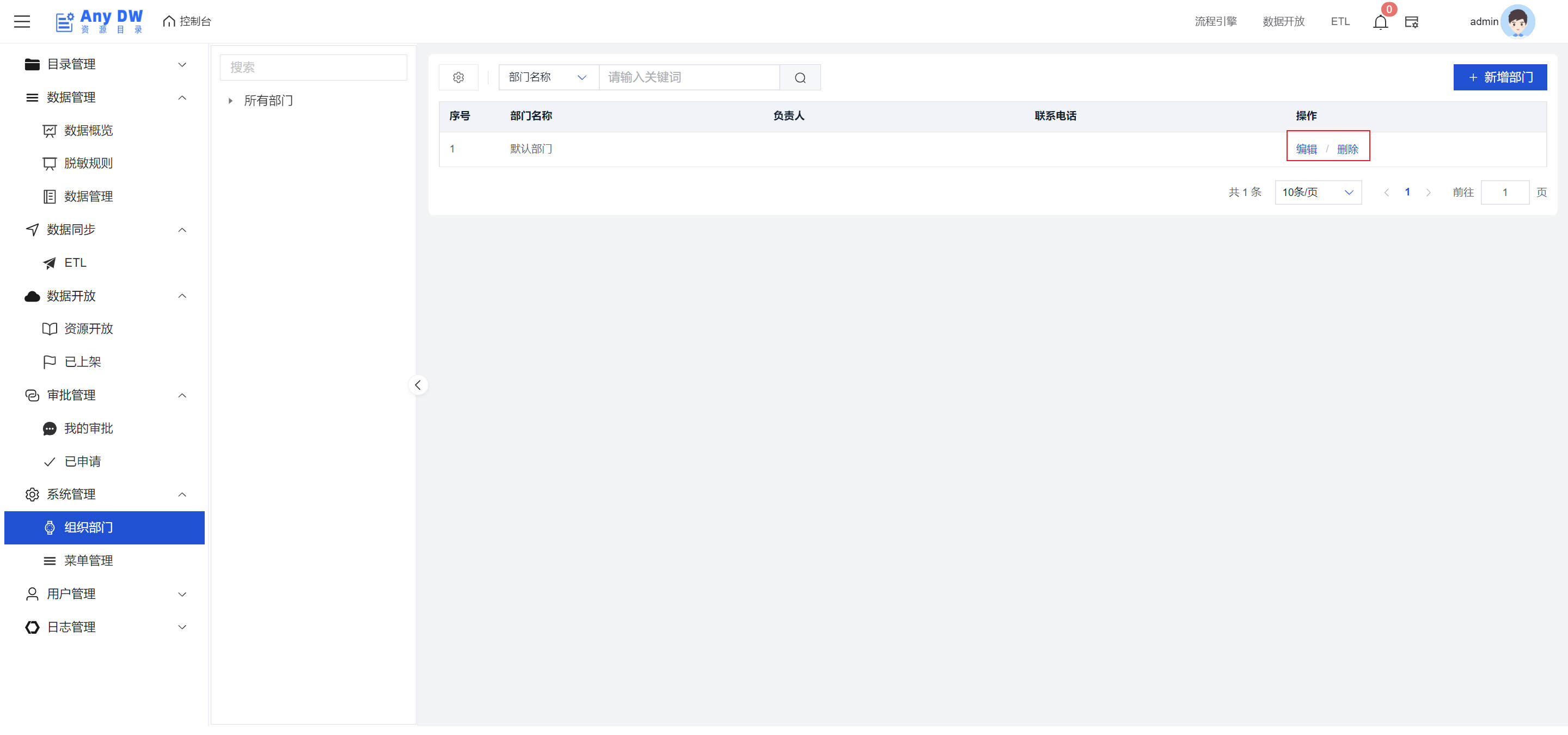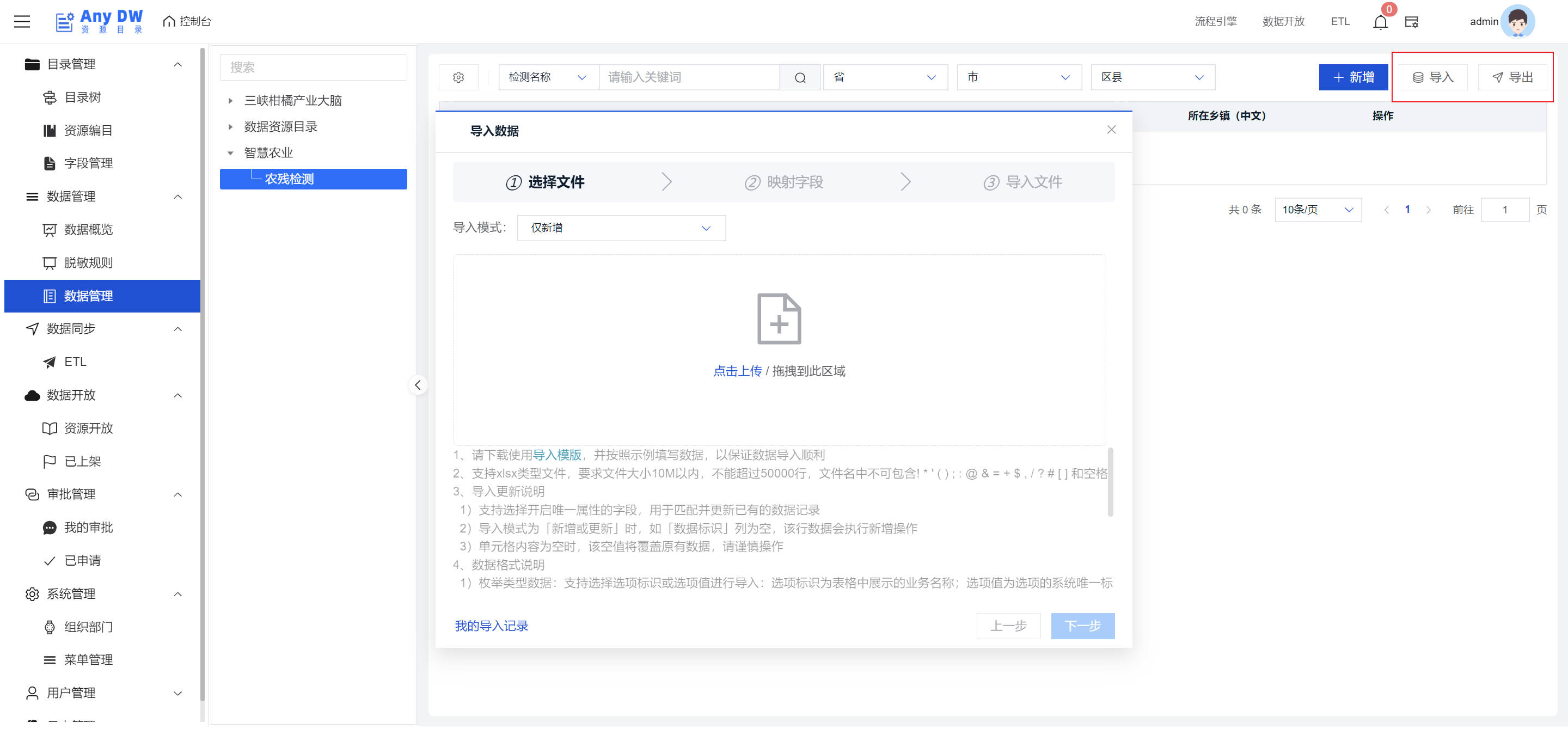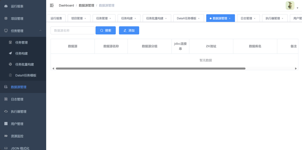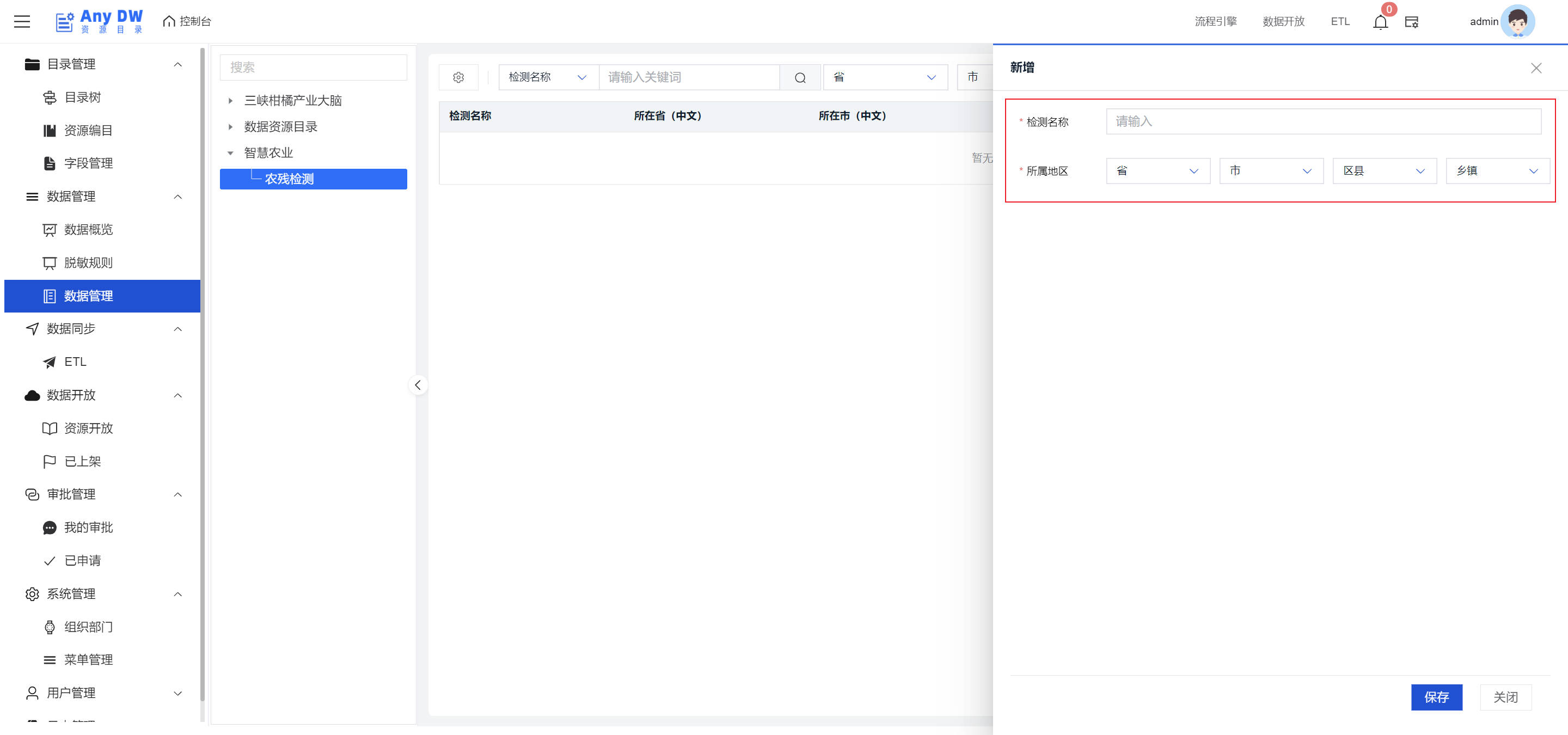 1.流程图  2.操作流程 2.1目录管理 2.1.1目录树 在目录树中添加所需要的类别,也能更好对后续资源进行分类管理,能够更方便快捷的找到所需要的资源。  2.1.2资源编目 在资源编目中可以在该资源中添加所需要的表。点击右侧的新建表,弹出弹窗,在弹窗内填写对应的信息,点击保存即可完成新建表。   在新增的表中可以对表进行编辑表、添加字段、删除、建表、模板设计的操作。  编辑表:可以对该表的名称、编码、简称进行修改。   字段:在字段中可以添加该表需要的字段,以及对该表的字段进行删除和编辑的操作  进入字段页面后,每张表都会有默认的字段(id、所在省、所在市、所在县等),这些是每个表所需要的,无法进行编辑修改的操作。  在右侧点击新增可以给该表新增字段。  在新增弹窗中填写相应的信息,点击保存完成字段的添加。  脱敏规则:该脱敏内容来自于数据管理中的脱敏规则,主要用于保护敏感数据的安全性和隐私性,同时确保数据在合法合规的范围内使用。  删除:对该表进行删除的操作。  建表:点击建表会生成建表语句,里面包含了在字段中添加的字段。点击弹窗中的建表按钮,即可完成建表。  在数据管理中找到该目录,就能看到刚建好的表。  模板设计(新增页、编辑页):模板设计即为对该表的样式进行修改,包括排列序号、标签位置等。  在表格的右侧,有该字段的编辑按钮,点击编辑按钮弹出弹窗,即可对该字段的显示名称、组件类型、排序号、是否必填进行修改,根据该表的需求可以自行进行修改。   在页面下方还有页面的参数设置,可以对该页面的标签位置和布局类型进行修改。  模板设计(列表页):列表页右侧有该字段的编辑按钮,点击编辑弹出编辑弹窗。  在该字段的编辑弹窗中可以对该字段的显示标题、排序号、是否隐藏、是否查询、查询类型信息进行修改。  在页面下方还有页面参数的设置,该页面参数中含有弹窗宽度和弹窗位置的信息,可以对该表格点击弹出的弹出的弹窗样式进行修改。 2.2数据管理 2.2.1脱敏规则 脱敏功能主要用于保护敏感数据的安全性和隐私性,同时确保数据在合法合规的范围内使用。  在脱敏规则中创建的脱敏算法数据,在字段管理中能使用。  2.2.2数据管理 数据管理中展示的是每个目录下已经创建好的表,在数据管理中可以对每个表进行新增、编辑等操作。  点击右上角新增打开新增弹窗,在新增弹窗中填写相应的信息,点击保存完成新增。  新增完在该表格中就能看到刚添加的信息。 在每行信息的右侧有编辑和删除按钮,可以对该行内容进行编辑和删除的操作。 在表格的右上角还有导入和导出的按钮,导入可以将其他slsx类型文件的内容导入该表格中,导出可以将该表格的数据导出为xlsx文件。  2.3数据同步 用于实现多种异构数据源之间的数据同步。  2.3.1运行报表  成功:显示成功执行的数据同步任务数量。 失败:显示失败的数据同步任务数量。 执行中:显示当前正在执行的数据同步任务数量。 这些统计信息可以帮助用户快速了解任务的整体执行情况。在下方的图表中用户可以通过图表直观地看到任务执行的趋势,例如哪些日期任务成功率较高,哪些日期任务失败较多。 2.3.2项目管理 项目管理功能是数据同步任务管理平台中的核心组成部分。在该页面中可以添加同步的项目。  2.3.3任务管理 2.3.3.1任务管理 任务管理页面是一个用于管理和监控数据同步任务的界面。  点击右上角的添加弹出弹窗,输入相应的信息点击确定完成添加。  2.3.3.2任务构建 数据资源目录的任务构建功能是一个用于创建和配置数据同步任务的界面,它允许用户定义如何从源数据源读取数据以及如何将数据写入目标数据存储。      2.3.3.3任务批量构建 任务批量构建功能是数据资源目录管理系统中的一个高级功能,它允许用户一次性创建多个数据同步任务,从而提高工作效率,减少重复性工作。     2.3.3.4 DataX任务模板 DataX任务模板功能是数据资源目录管理系统中的一个实用工具,它允许用户创建可复用的数据同步任务模板。这些模板定义了数据同步的标准流程和配置,使得用户能够快速启动新的数据同步任务而无需从头开始配置。  2.3.4数据源管理 数据源管理功能是数据资源目录管理系统中的一个核心模块,它允许用户添加、配置、维护和监控数据源。数据源是数据同步、数据集成和数据分析的基础,因此,有效的数据源管理对于确保数据质量和数据操作的效率至关重要。  2.3.5日志管理 日志管理功能是数据资源目录管理系统中的一个重要模块,它用于记录、存储、分析和查询系统中的各种操作日志和系统日志。右侧还有清除按钮可以对日志数据进行清除。  2.3.6执行器管理 执行器管理功能是数据资源目录管理系统中的一个关键模块,它负责管理和维护系统中用于执行数据同步任务的执行器。  2.3.7用户管理 用户管理功能是数据资源目录管理系统中的一个基础且重要的模块,它允许系统管理员对用户账户进行创建、维护和监控。这个功能对于控制用户访问权限、确保数据安全和提高系统管理效率至关重要。这里可以对用户进行添加、编辑和删除的操作。  2.3.8资源监控 负责实时监控和展示系统中各种资源的使用情况和性能指标。这个功能对于确保系统稳定运行、优化资源分配和预防潜在问题至关重要。  2