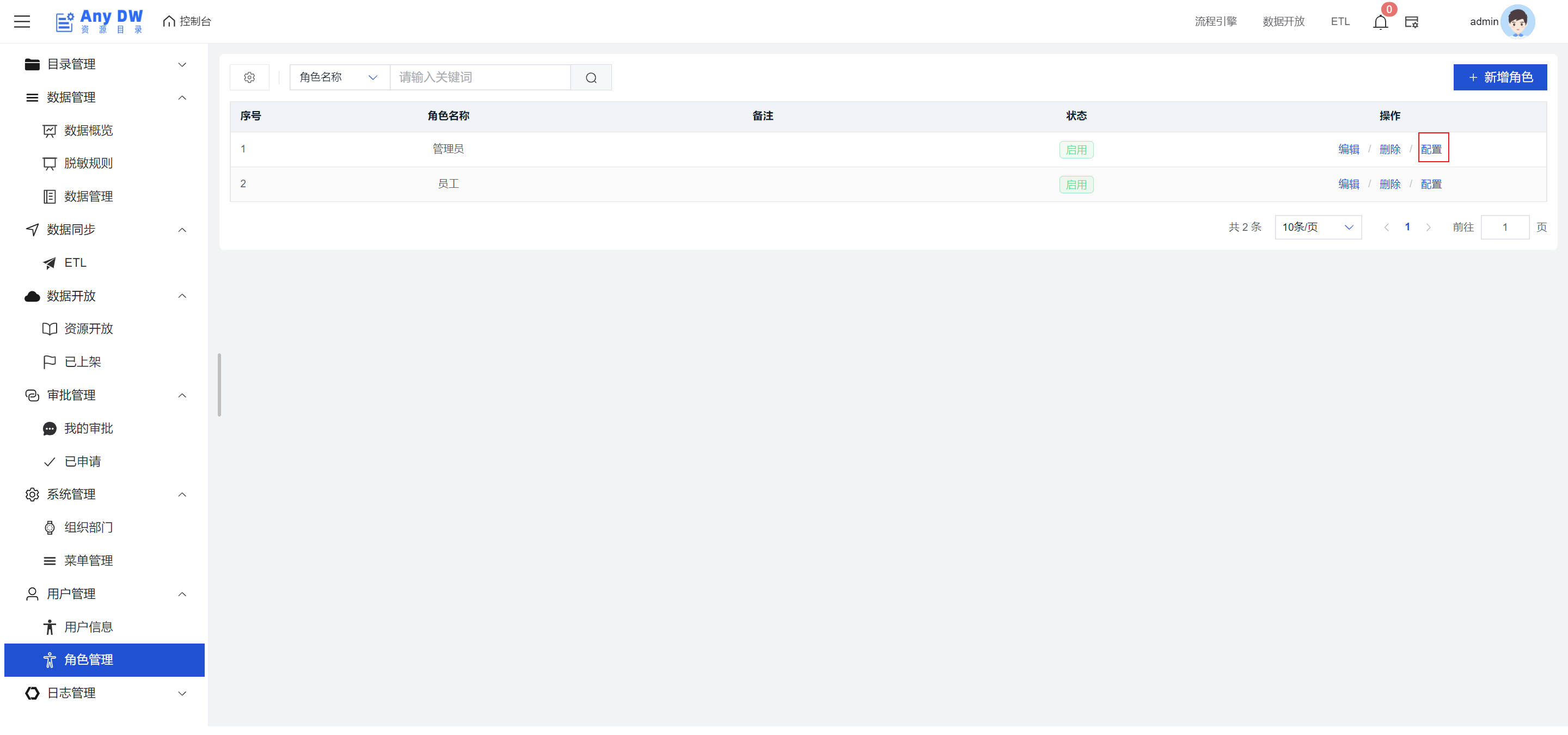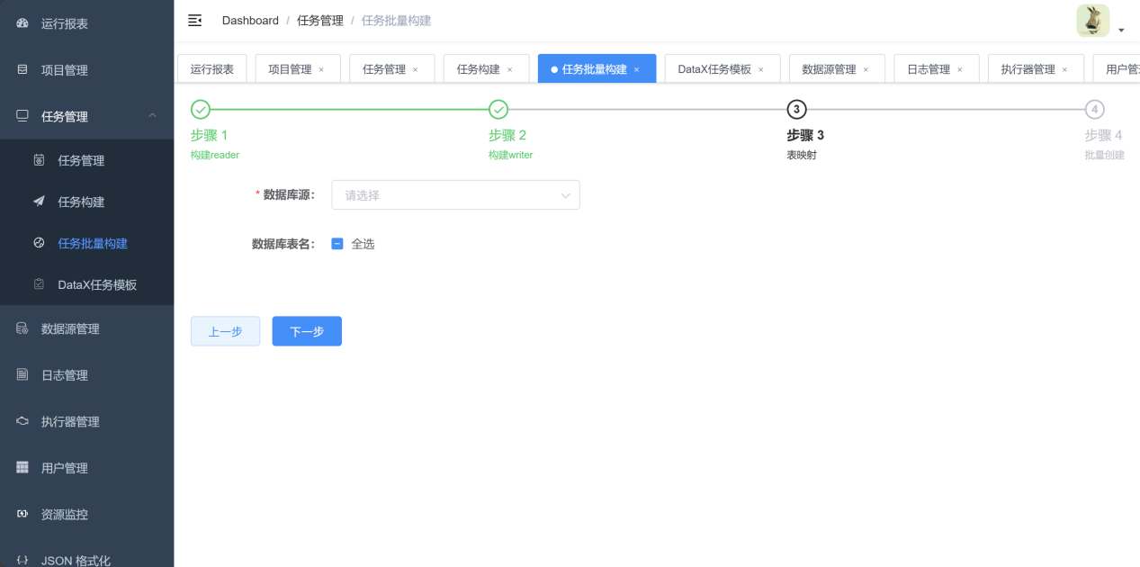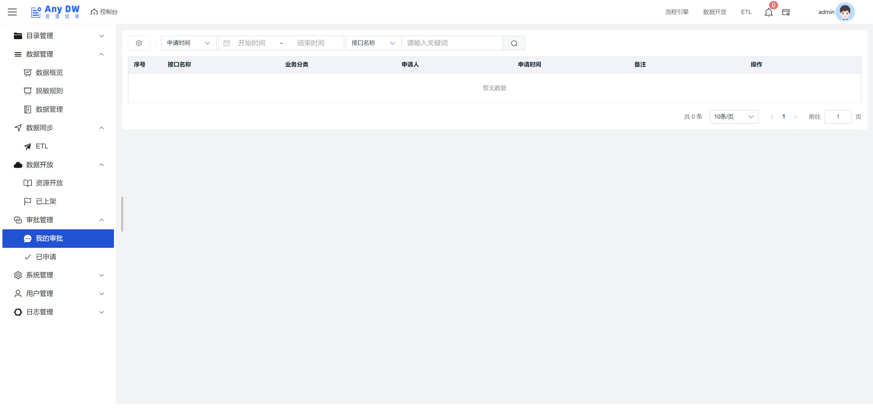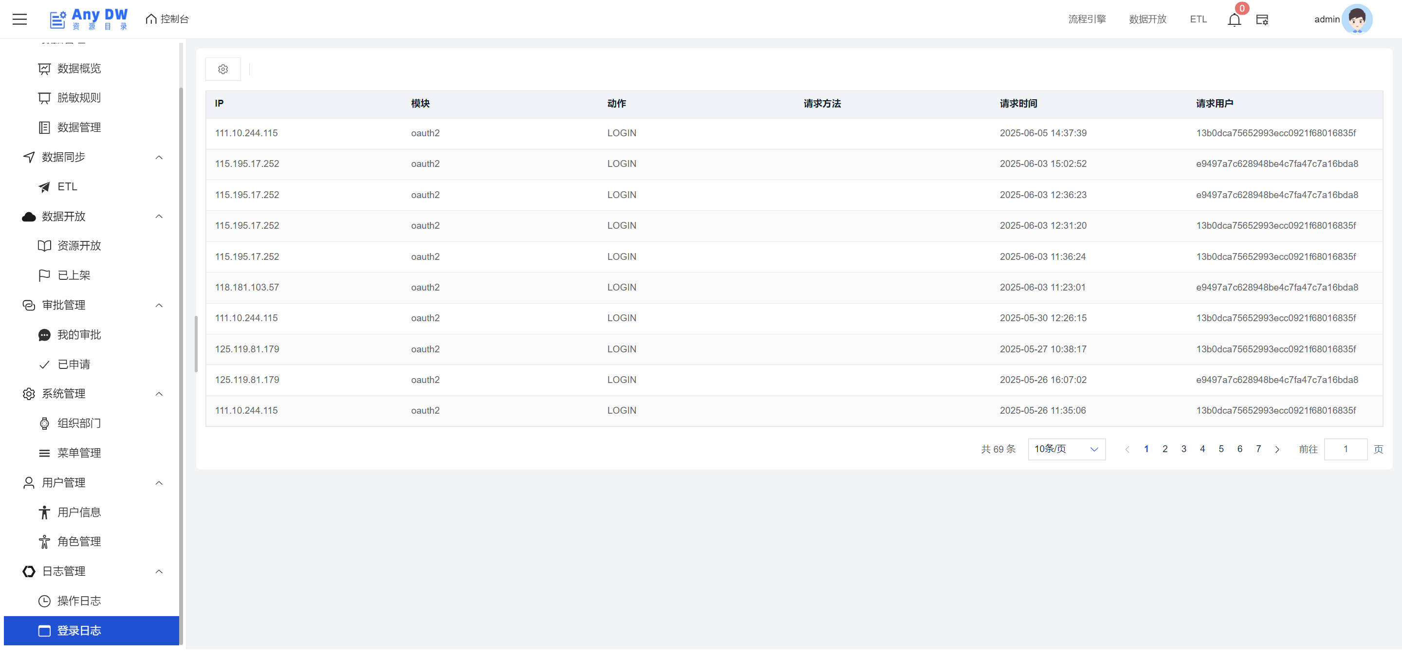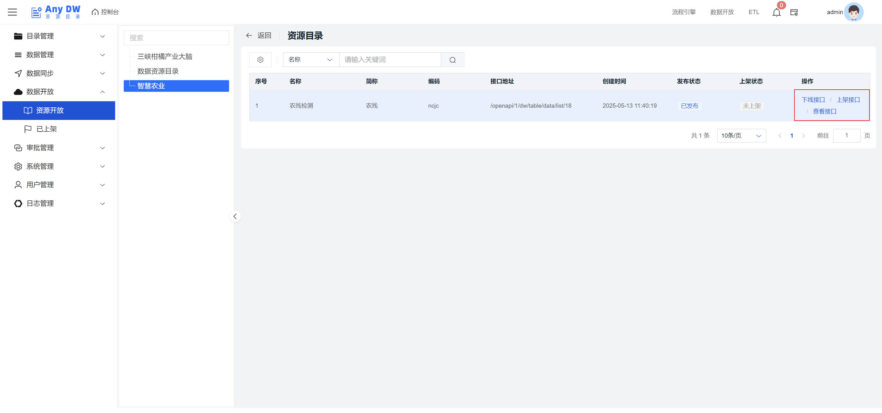 1.流程图  2.操作流程 2.1目录管理 2.1.1目录树 在目录树中添加所需要的类别,也能更好对后续资源进行分类管理,能够更方便快捷的找到所需要的资源。  2.1.2资源编目 在资源编目中可以在该资源中添加所需要的表。点击右侧的新建表,弹出弹窗,在弹窗内填写对应的信息,点击保存即可完成新建表。   在新增的表中可以对表进行编辑表、添加字段、删除、建表、模板设计的操作。  编辑表:可以对该表的名称、编码、简称进行修改。   字段:在字段中可以添加该表需要的字段,以及对该表的字段进行删除和编辑的操作  进入字段页面后,每张表都会有默认的字段(id、所在省、所在市、所在县等),这些是每个表所需要的,无法进行编辑修改的操作。  在右侧点击新增可以给该表新增字段。  在新增弹窗中填写相应的信息,点击保存完成字段的添加。  脱敏规则:该脱敏内容来自于数据管理中的脱敏规则,主要用于保护敏感数据的安全性和隐私性,同时确保数据在合法合规的范围内使用。  删除:对该表进行删除的操作。  建表:点击建表会生成建表语句,里面包含了在字段中添加的字段。点击弹窗中的建表按钮,即可完成建表。  在数据管理中找到该目录,就能看到刚建好的表。  模板设计(新增页、编辑页):模板设计即为对该表的样式进行修改,包括排列序号、标签位置等。  在表格的右侧,有该字段的编辑按钮,点击编辑按钮弹出弹窗,即可对该字段的显示名称、组件类型、排序号、是否必填进行修改,根据该表的需求可以自行进行修改。   在页面下方还有页面的参数设置,可以对该页面的标签位置和布局类型进行修改。  模板设计(列表页):列表页右侧有该字段的编辑按钮,点击编辑弹出编辑弹窗。  在该字段的编辑弹窗中可以对该字段的显示标题、排序号、是否隐藏、是否查询、查询类型信息进行修改。  在页面下方还有页面参数的设置,该页面参数中含有弹窗宽度和弹窗位置的信息,可以对该表格点击弹出的弹出的弹窗样式进行修改。 2.2数据管理 2.2.1脱敏规则 脱敏功能主要用于保护敏感数据的安全性和隐私性,同时确保数据在合法合规的范围内使用。  在脱敏规则中创建的脱敏算法数据,在字段管理中能使用。  2.2.2数据管理 数据管理中展示的是每个目录下已经创建好的表,在数据管理中可以对每个表进行新增、编辑等操作。  点击右上角新增打开新增弹窗,在新增弹窗中填写相应的信息,点击保存完成新增。  新增完在该表格中就能看到刚添加的信息。 在每行信息的右侧有编辑和删除按钮,可以对该行内容进行编辑和删除的操作。 在表格的右上角还有导入和导出的按钮,导入可以将其他slsx类型文件的内容导入该表格中,导出可以将该表格的数据导出为xlsx文件。  2.3数据同步 用于实现多种异构数据源之间的数据同步。  2.3.1运行报表  成功:显示成功执行的数据同步任务数量。 失败:显示失败的数据同步任务数量。 执行中:显示当前正在执行的数据同步任务数量。 这些统计信息可以帮助用户快速了解任务的整体执行情况。在下方的图表中用户可以通过图表直观地看到任务执行的趋势,例如哪些日期任务成功率较高,哪些日期任务失败较多。 2.3.2项目管理 项目管理功能是数据同步任务管理平台中的核心组成部分。在该页面中可以添加同步的项目。  2.3.3任务管理 2.3.3.1任务管理 任务管理页面是一个用于管理和监控数据同步任务的界面。  点击右上角的添加弹出弹窗,输入相应的信息点击确定完成添加。  2.3.3.2任务构建 数据资源目录的任务构建功能是一个用于创建和配置数据同步任务的界面,它允许用户定义如何从源数据源读取数据以及如何将数据写入目标数据存储。      2.3.3.3任务批量构建 任务批量构建功能是数据资源目录管理系统中的一个高级功能,它允许用户一次性创建多个数据同步任务,从而提高工作效率,减少重复性工作。     2.3.3.4 DataX任务模板 DataX任务模板功能是数据资源目录管理系统中的一个实用工具,它允许用户创建可复用的数据同步任务模板。这些模板定义了数据同步的标准流程和配置,使得用户能够快速启动新的数据同步任务而无需从头开始配置。  2.3.4数据源管理 数据源管理功能是数据资源目录管理系统中的一个核心模块,它允许用户添加、配置、维护和监控数据源。数据源是数据同步、数据集成和数据分析的基础,因此,有效的数据源管理对于确保数据质量和数据操作的效率至关重要。  2.3.5日志管理 日志管理功能是数据资源目录管理系统中的一个重要模块,它用于记录、存储、分析和查询系统中的各种操作日志和系统日志。右侧还有清除按钮可以对日志数据进行清除。  2.3.6执行器管理 执行器管理功能是数据资源目录管理系统中的一个关键模块,它负责管理和维护系统中用于执行数据同步任务的执行器。  2.3.7用户管理 用户管理功能是数据资源目录管理系统中的一个基础且重要的模块,它允许系统管理员对用户账户进行创建、维护和监控。这个功能对于控制用户访问权限、确保数据安全和提高系统管理效率至关重要。这里可以对用户进行添加、编辑和删除的操作。  2.3.8资源监控 负责实时监控和展示系统中各种资源的使用情况和性能指标。这个功能对于确保系统稳定运行、优化资源分配和预防潜在问题至关重要。  2