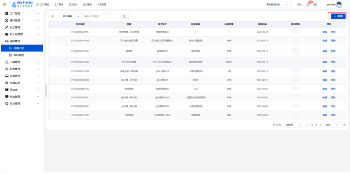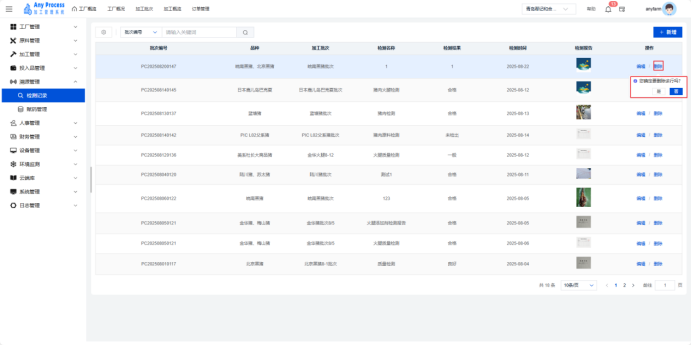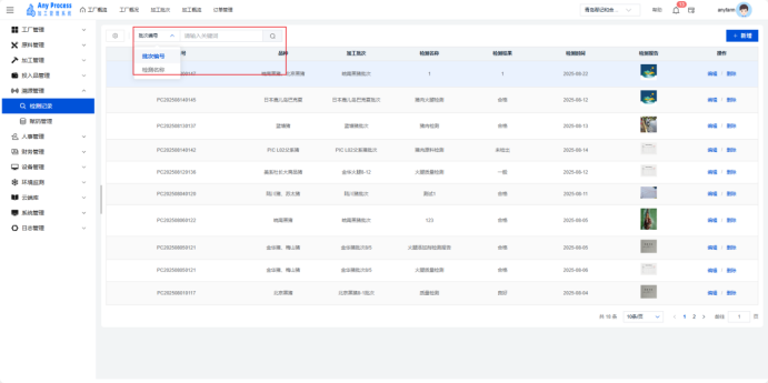 测记录模块是溯源管理系统的重要组成,用于集中管理生产加工环节中品种检测数据。通过记录批次编号、品种、检测结果等信息,实现质量检测流程的数字化管控,助力企业追溯产品质量、把控生产风险、满足合规要求,为质量决策与持续改进提供数据支撑。  新增:击右上角新增,出现新增弹窗,填写新增弹窗中对应信息点击确认完成新增操作。   编辑:对于检测记录有误或缺失的信息,可以点击编辑,出现编辑弹窗,编辑相应信息,点击确认完成编辑操作。   删除:对于不需要的检测记录信息,可以点击删除,出现删除弹窗,选择“是”则删除该信息,选择“否”则取消删除该信息。  搜索:用户需要快速定位某一检测记录信息时,可以通过关键字搜索来查询,选择关键字类型,输入对应关键字完成搜索操作。