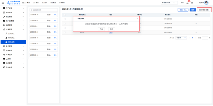 到岗台账模块是人事管理板块的重要组成,用于精准记录工厂临时工每日到岗情况。通过日期维度梳理到岗人员信息,涵盖临时工姓名、联系电话等内容,助力工厂把控人力到岗动态,为工时核算、人力调配及成本管控提供数据支撑,保障生产运营中人力配置的清晰可查与高效管理 。  自动继承设置:点击右上角自动继承设置,出现自动继承设置弹窗,点击“开启”,则开启自动继承,点击“关闭”则取消开启。