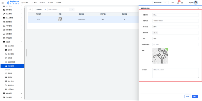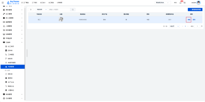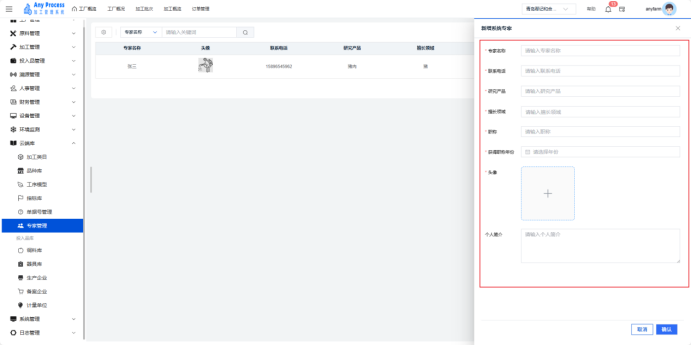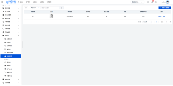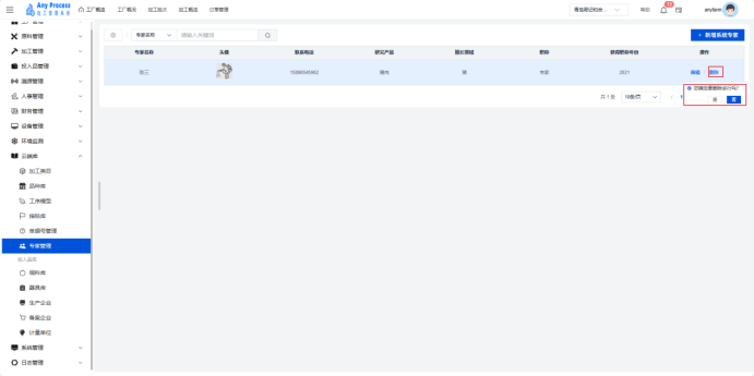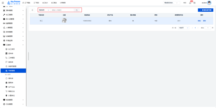 专家管理模块是云端库板块的特色功能,聚焦加工领域专家资源的集中化管理。通过记录专家基础信息、研究方向、专业领域等内容,为企业生产工艺优化、技术难题攻克、员工培训等提供智力支持,助力整合行业专家资源,赋能加工业务升级 。  新增系统专家:需要添加新的专家信息时,点击右上角新增系统专家,填充相关专家信息,点击确认完成新增系统专家,即可将新专家信息添加到该界面中。   编辑:若专家的信息出现错误或缺失,可以点击编辑,出现编辑系统专家弹窗,编辑弹窗内信息,点击确认完成编辑操作。   删除:对于不需要的专家信息,可以点击删除,出现删除弹窗,选择“是”则删除该信息,选择“否”则取消删除该信息。点击是后则完成删除操作。  搜索:需要快速定位某一专家的信息时,可以通过关键字搜索来查询,输入专家名称相关关键字进行搜索。