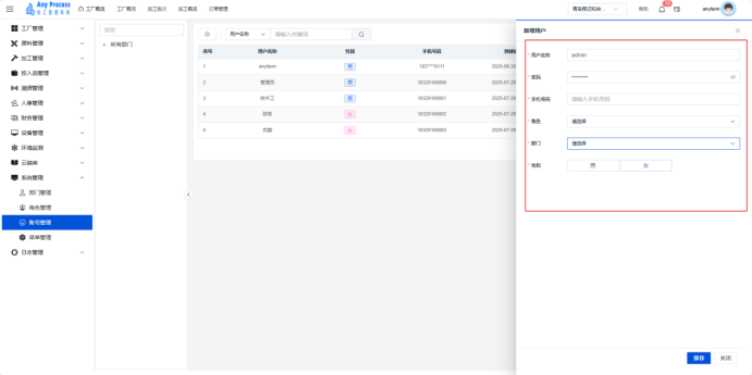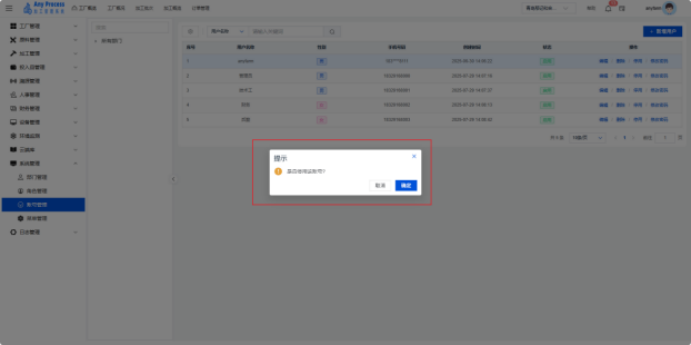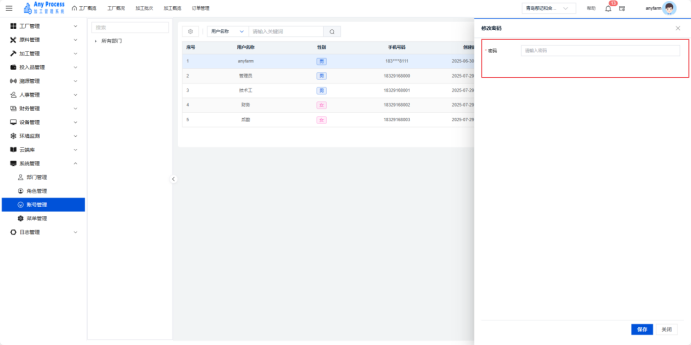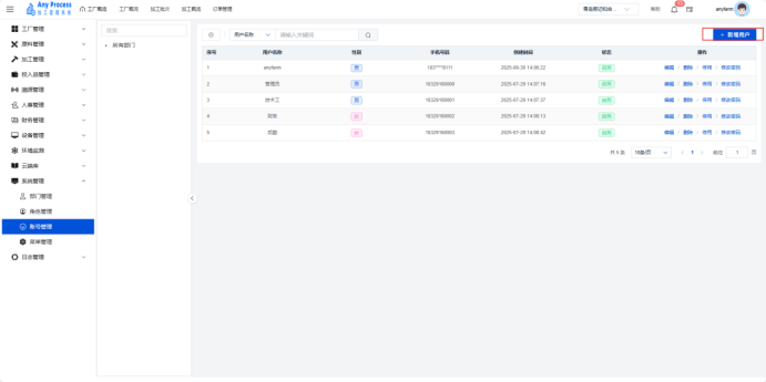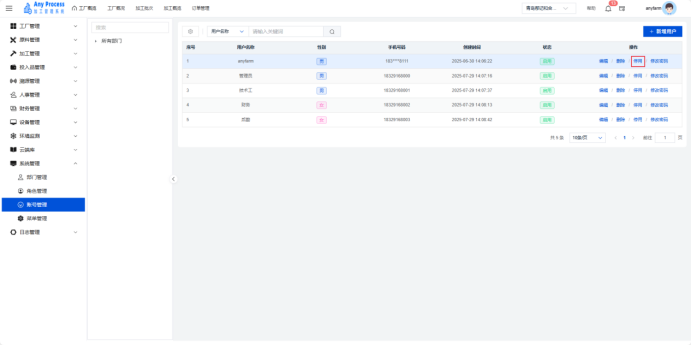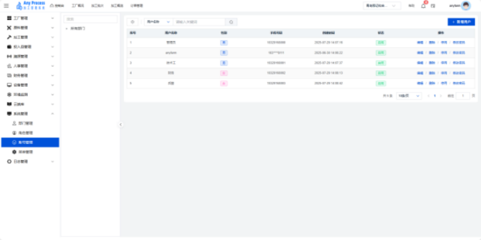 账号管理模块是系统管理板块的基础功能,聚焦企业用户账号的全生命周期管理。通过建档用户基础信息(名称、性别、手机号)、管控账号状态(启用 / 停用)、维护密码权限,保障系统访问安全,实现用户操作可追溯、权限可管控,支撑企业数字化办公的人员管理需求 。  新增用户:需要添加新的用户信息时,点击右上角新增用户,出现新增用户弹窗,填充相关用户信息,点击保存完成新增用户操作,即可将新用户信息添加到该界面中。   编辑:若用户的信息出现错误或缺失,可以点击编辑,出现编辑角色弹窗,编辑弹窗相关信息,点击保存完成编辑。   删除:对于不需要的用户信息,可以点击删除,出现删除弹窗,选择“是”则删除该信息,选择“否”则取消删除该信息。点击是后则完成删除操作。  停用:需要关停某一账号的状态时,可以点击停用,出现停用提示弹窗,点击“确定”则停用该账号,点击“取消”则取消停用该账号。   修改密码:若需要修改账号的密码,可以点击修改密码,出现修改密码弹窗,修改相关密码,点击保存完成修改密码。   搜索:需要快速定位某一账号的信息时,可以通过关键字搜索来查询,输入用户名称相关关键字进行搜索。