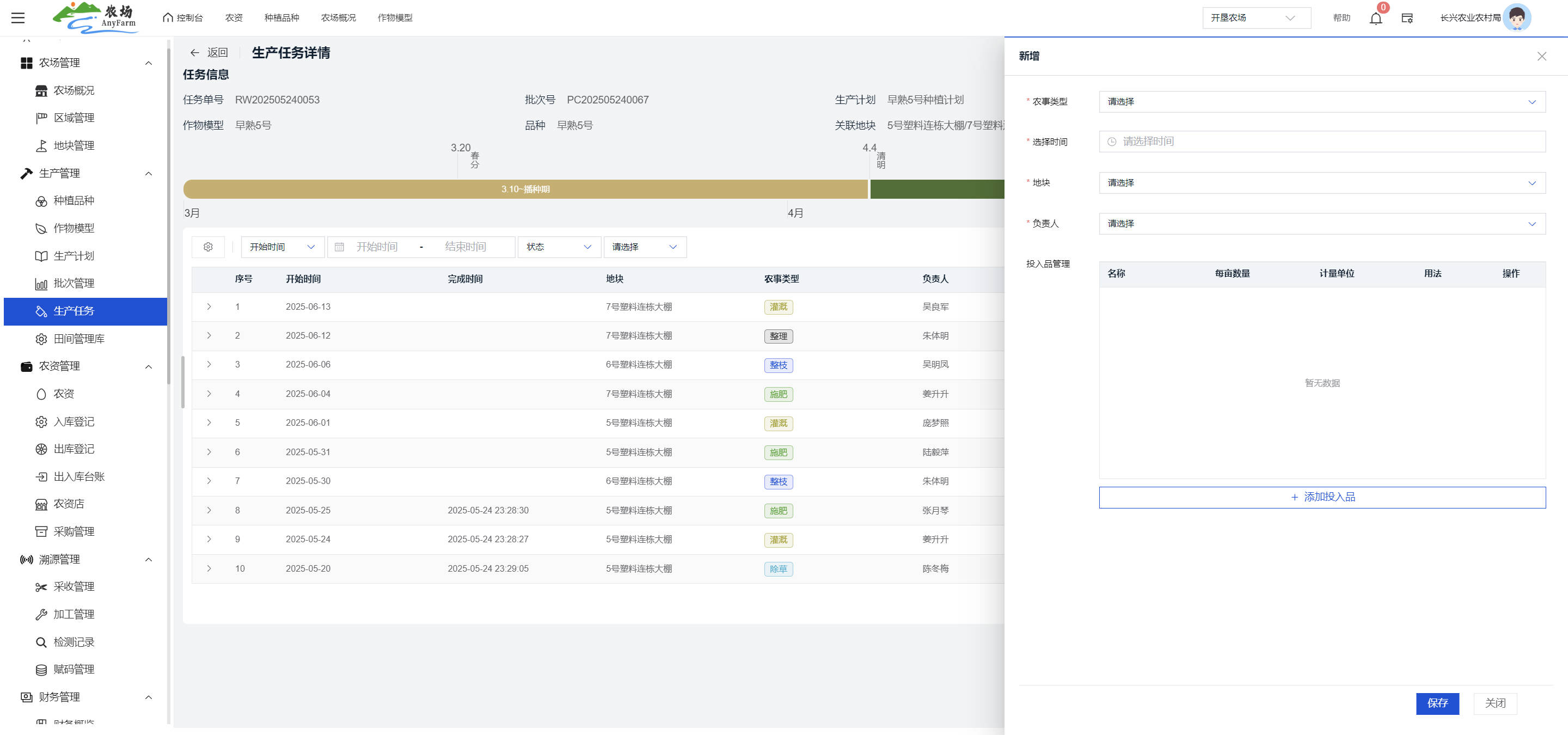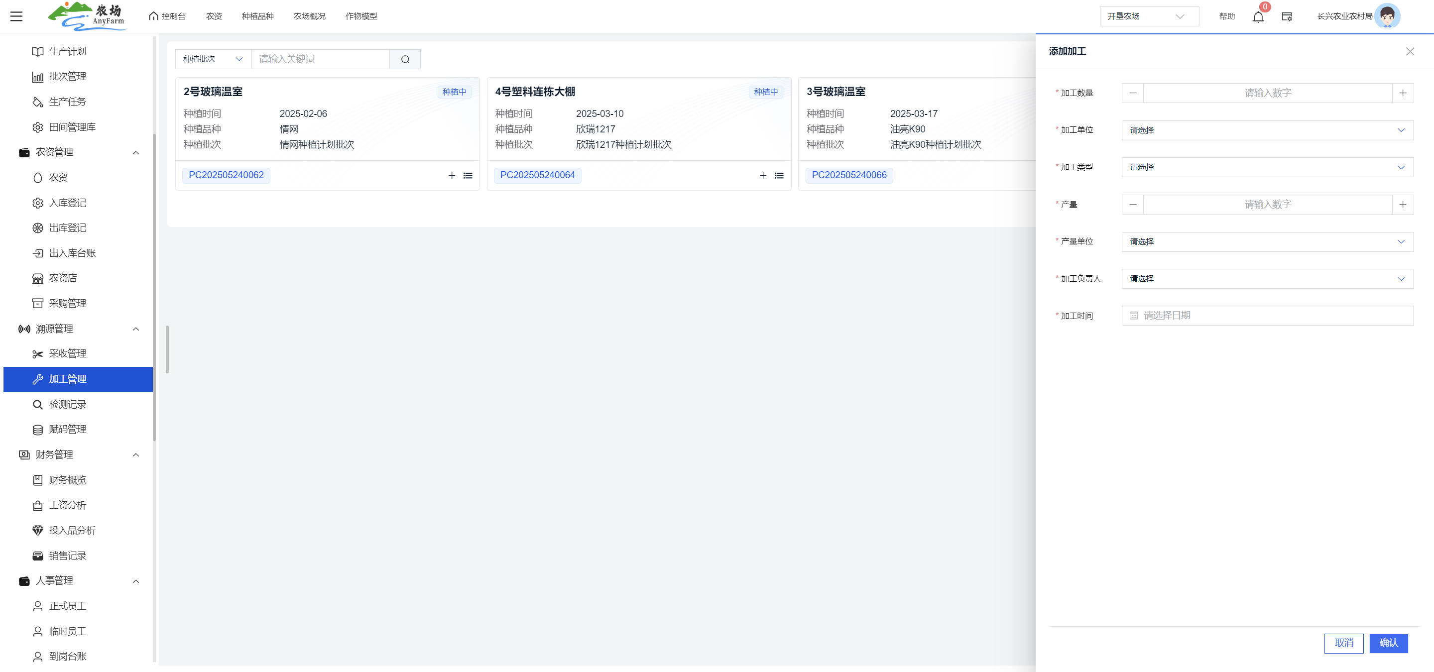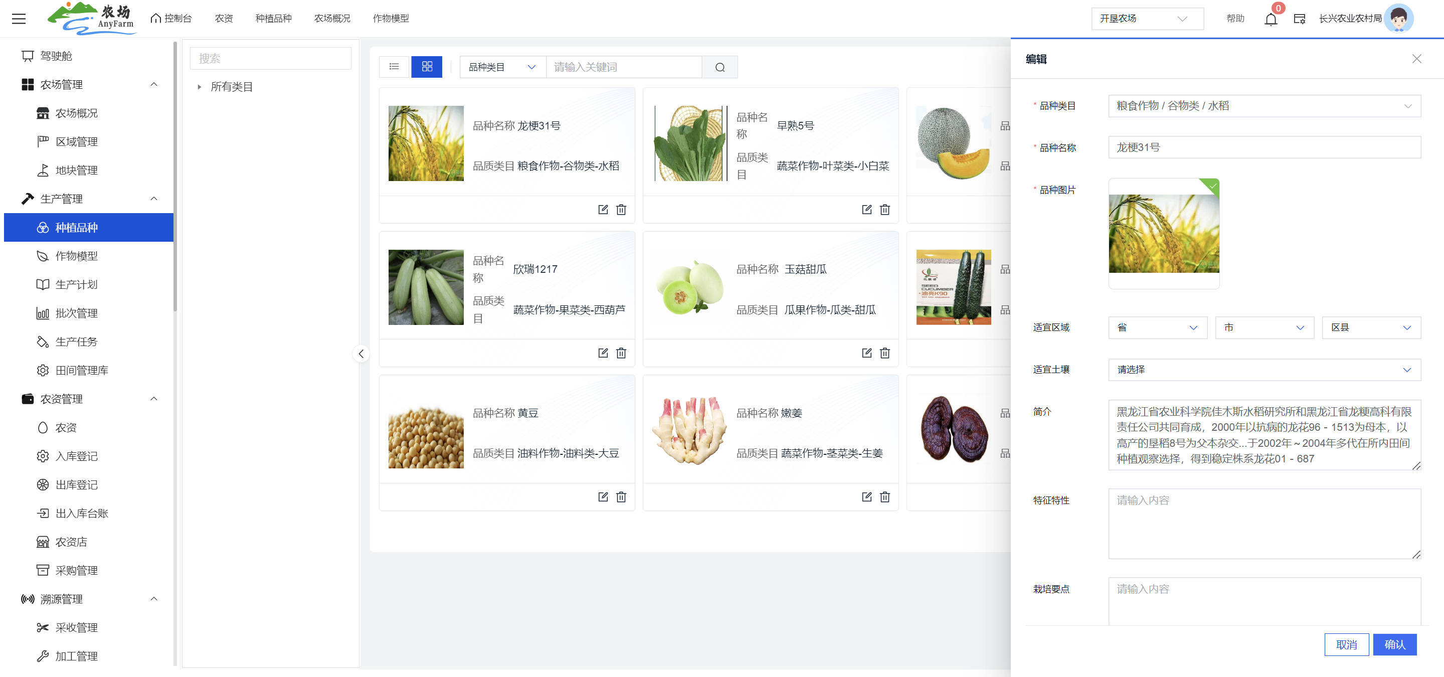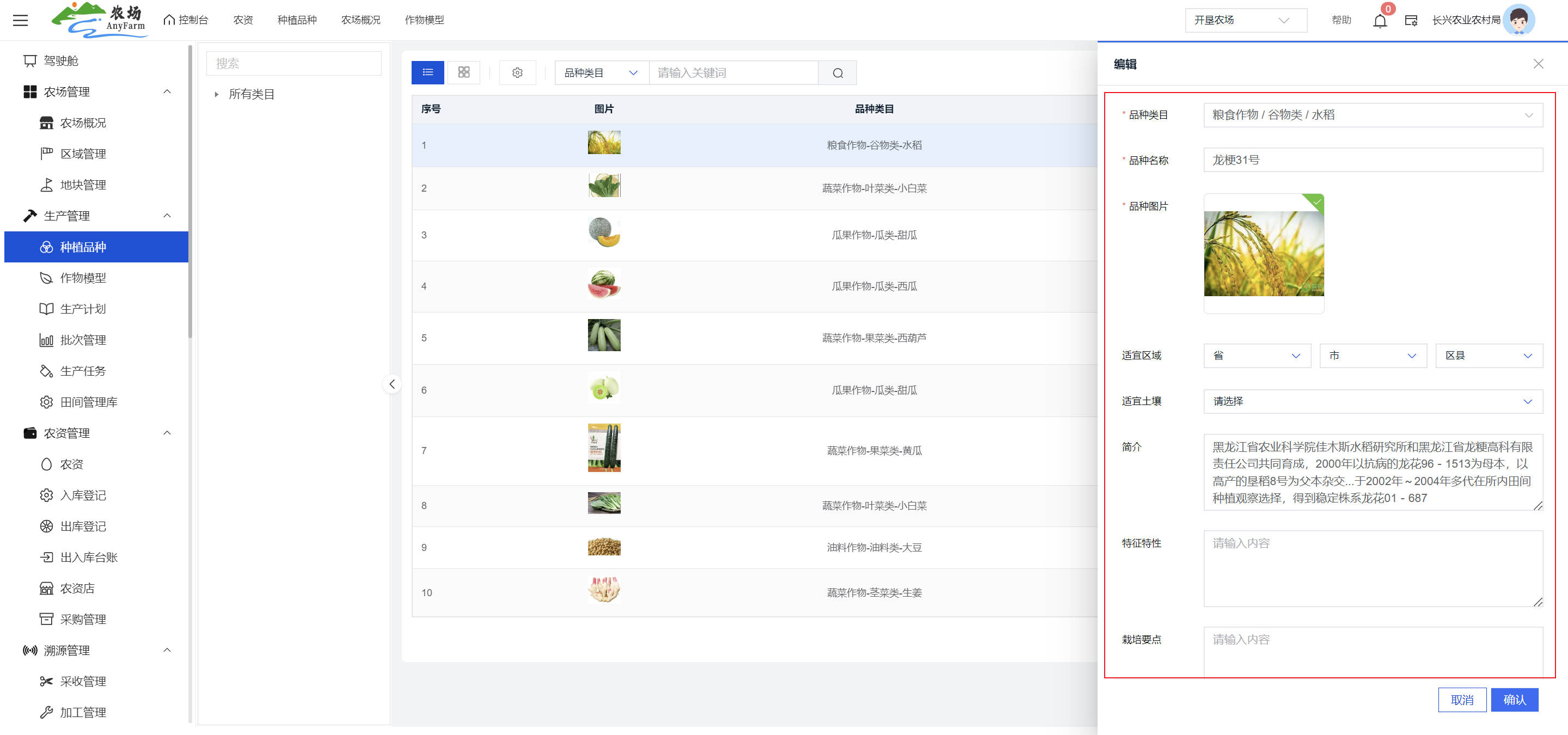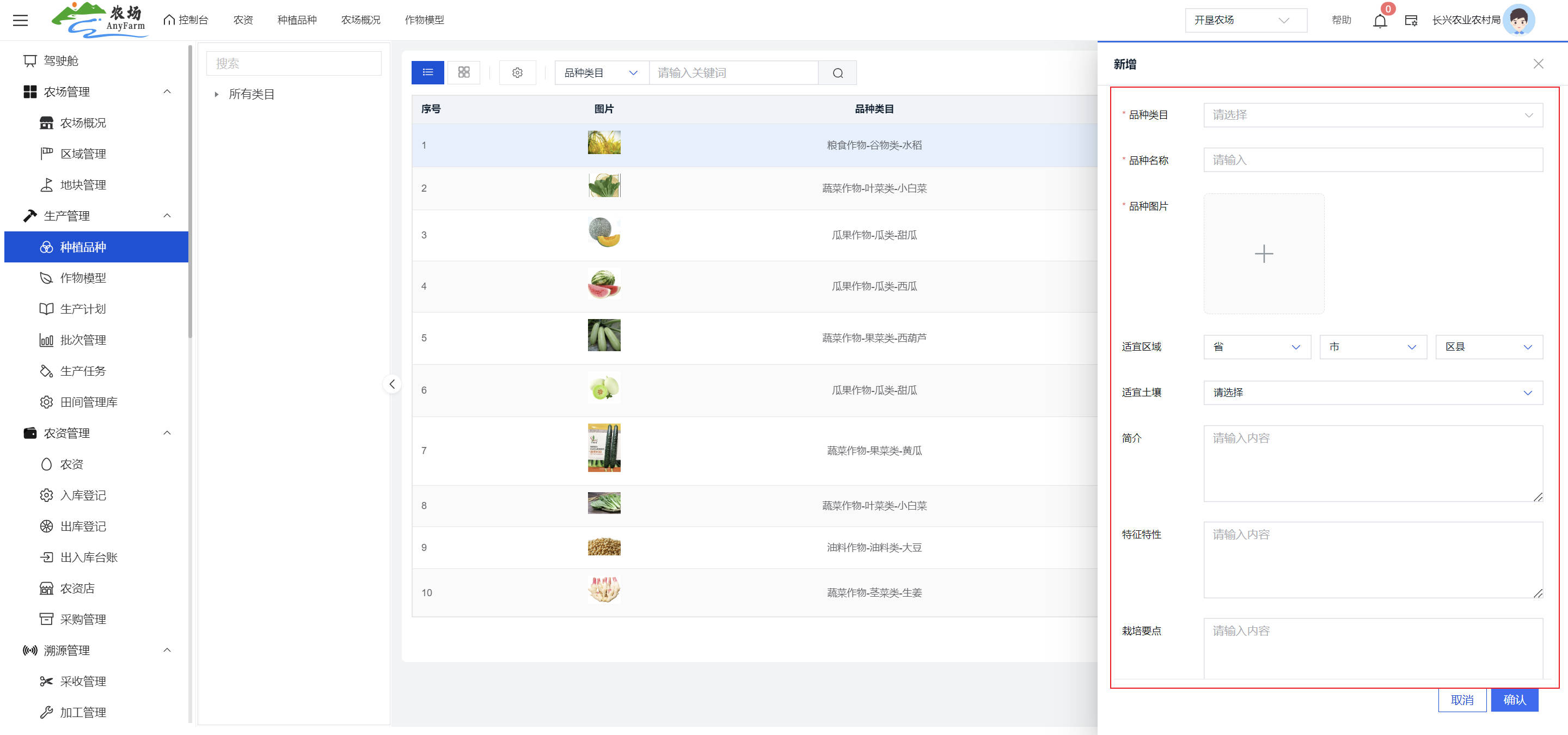一、平台简介 AnyFarm农场管理平台是利用物联网、大数据、人工智能等现代信息技术,对农业生产进行全方位、全过程的智能化管理和控制。它通过传感器等设备,实时监测农田环境、作物生长、土壤墒情等信息,并通过数据分析和智能决策,实现精准灌溉、施肥、病虫害防治等操作,从而提高农业生产效率,降低资源消耗,保障农产品质量。 二、产品优势 1.全流程数据化管理,提升生产效率: * 优势: * 系统覆盖农场管理的各个环节,实现数据统一采集、存储和分析。 * 通过数据分析,优化生产计划,减少资源浪费,提高生产效率。 * 实时监测农场环境和生产状态,及时发现并解决问题。 * 体现: * 从农场基础信息录入,到生产计划制定,再到农产品溯源,全程数据化管理。 * 通过数据分析,实现精准施肥、精准灌溉等操作,提高资源利用率。 2. 智能化决策支持,降低生产风险: * 优势: * 利用机器学习模型,实现农产品质量预测、产量预测、病虫害预警等功能。 * 为农场管理者提供科学的决策依据,降低生产风险。 * 通过数据分析,预测市场行情,帮助农场及时调整生产策略。 * 体现: * 通过模型训练,预测农产品产量和质量,提前做好准备。 * 通过病虫害预警模型,及时发现并处理病虫害,减少损失。 3. 全程可追溯,保障农产品质量安全: * 优势: * 实现农产品从生产到销售的全程可追溯,保障产品质量安全。 * 消费者可以通过溯源码查询农产品生产信息,增强信任感。 * 提高农产品品牌价值,增强市场竞争力。 * 体现: * 记录农产品生产、加工、检测等信息,并与溯源码关联。 * 消费者可以通过手机扫描溯源码,了解农产品详细信息。 三、业务流程 流程说明: 1. 基础信息管理 * 农场管理: 对已添加的农场进行管理,包括信息修改、删除等操作。 * 员工管理: 录入和管理农场员工信息,包括姓名、工号、职位、联系方式等。 * 区域管理: 划分农场区域,如种植区、养殖区、办公区等,方便后续管理。 * 地块管理: 将农场区域进一步细分为地块,记录地块编号、面积、种植作物等信息。 * 设备管理: 录入和管理农场使用的各种设备,如灌溉设备、施肥设备、监测设备等。 * 计量单位: 设置系统中使用的计量单位,如面积单位、重量单位等。 * 指标库: 建立农产品质量、环境监测等相关指标库,为后续数据分析提供基础。 2. 生产管理 * 添加品种: 录入农场种植或养殖的品种信息,包括品种名称、特性、生长周期等。 * 品种管理: 对已添加的品种进行管理,包括信息修改、删除等操作。 * 添加农资: 录入农场使用的农资信息,如种子、肥料、农药等。 * 农资管理: 对已添加的农资进行管理,包括信息修改、删除等操作。 * 农资店: 如果农场有自己的农资店,则可以录入和管理农资店的信息。 * 农资出入库: 记录农资的出入库情况,实现农资库存管理。 * 生产计划: 制定农场的生产计划,包括种植或养殖时间、产量目标、农资使用计划等。 * 批次管理: 对农产品进行批次管理,记录批次信息、生产过程、质量检测等。 * 生产任务: 根据生产计划,生成具体的生产任务,分配给员工执行。 3. 溯源管理 * 采收管理: 记录农产品的采收情况,包括采收时间、产量、质量等。 * 加工管理: 如果农产品需要进行加工,则记录加工过程和相关信息。 * 检测记录: 记录农产品质量检测、环境监测等数据。 * 赋码管理: 对农产品进行赋码,实现产品溯源。 四、操作指南 4.1农场概况 界面功能概述: 该界面作为农场的首页及控制台界面,为用户呈现了农场的整体概况信息。在这里,用户能够清晰地查看到农场的数量、各个地块的数量、当前在职的员工人数、实时的天气状况等重要信息。同时,该界面还为用户提供了便捷的操作入口,例如可以进行农场的管理操作以及新增员工等常用功能,方便用户对农场的基本信息进行快速的了解和管理。  4.1.1.1 农场概况 界面功能概述: 用户可以点击标红的地方跳转到农场管理跳转到农场管理界面。  用户点击界面中标红的区域即可跳转到农场管理界面。在该界面中,用户可以全面了解农场的各项详细信息,如农场的占地面积、具体的种植区域划分、在职员工的数量及基本信息、各类设备的运行情况、今日和明日的农事安排等。这些信息的展示有助于用户对农场的整体运营状况有一个清晰的认识,同时也为后续的管理决策提供了有力的数据支持。此外,用户还可以在该界面进行一些基础的管理操作,如编辑农场的基本信息、调整设备的设置等,以确保农场的各项工作能够顺利进行。  4.1.1.2 农场农事 界面功能概述: 用户可以通过这里看到该农场的农事情况,例如施药、灌溉、施肥等常见的农事活动。  4.1.1.3 新增用户 界面元素功能概述: 该界面主要用于用户进行新增用户以及添加用户权限的操作。在农场的日常运营中,可能需要不断添加新的员工或管理人员,并为他们分配相应的权限,以便他们能够顺利地完成各自的工作任务。通过该界面,用户可以方便地完成这些操作,确保农场的人力资源管理更加高效和有序。  左侧搜索栏 :此搜索栏为用户提供了一个便捷的方式,允许用户在输入框内输入关键字,例如部门名称的关键词,从而快速搜索到特定的部门。这对于拥有多个部门的大型农场来说,能够大大提高用户查找部门的效率,节省时间。 顶部搜索栏:在这里,用户可以在输入框内