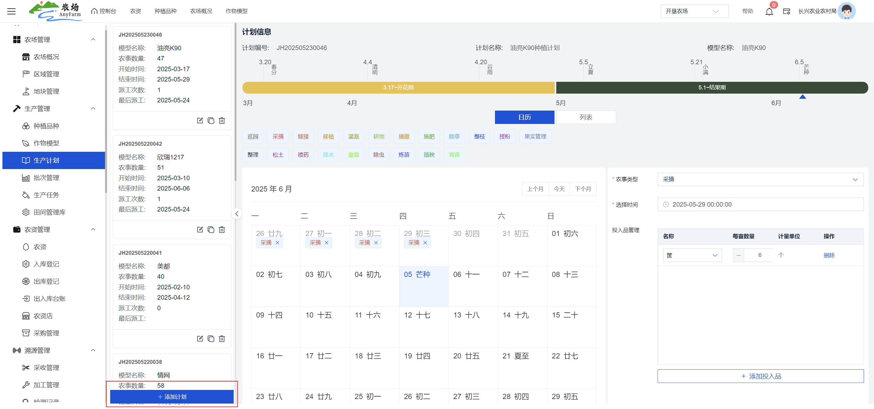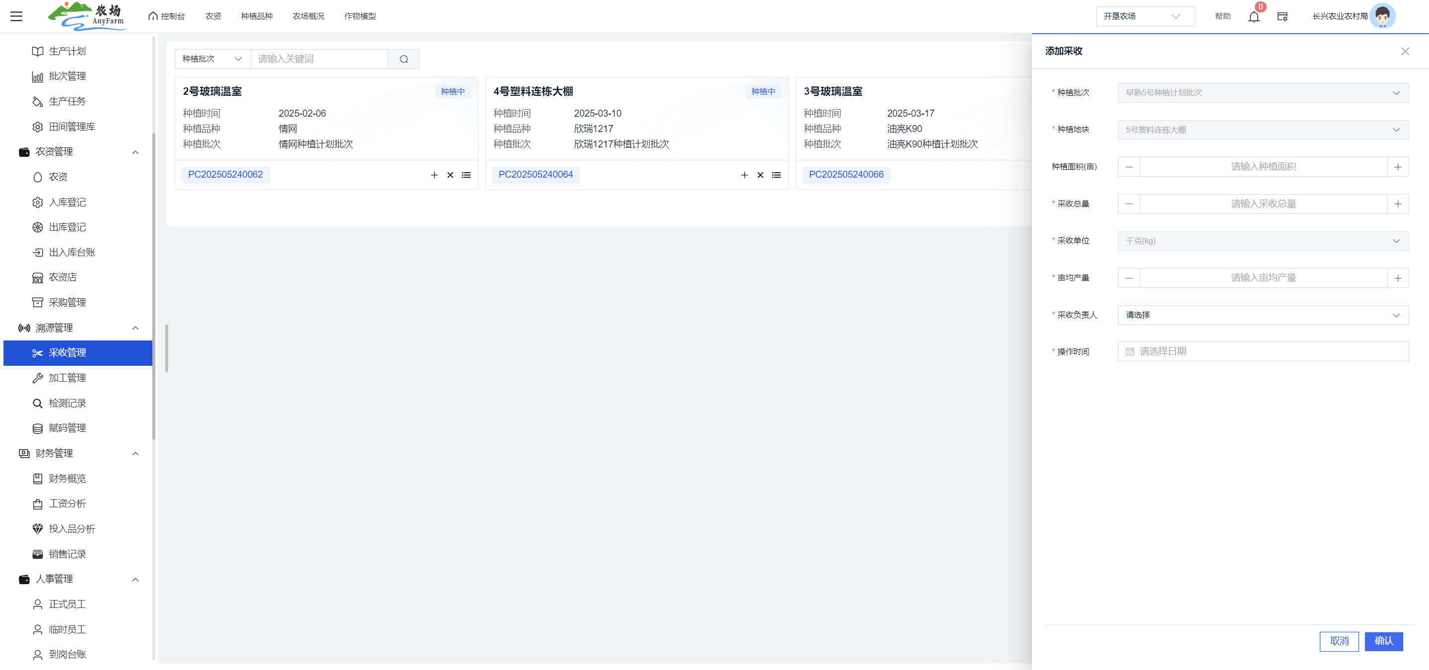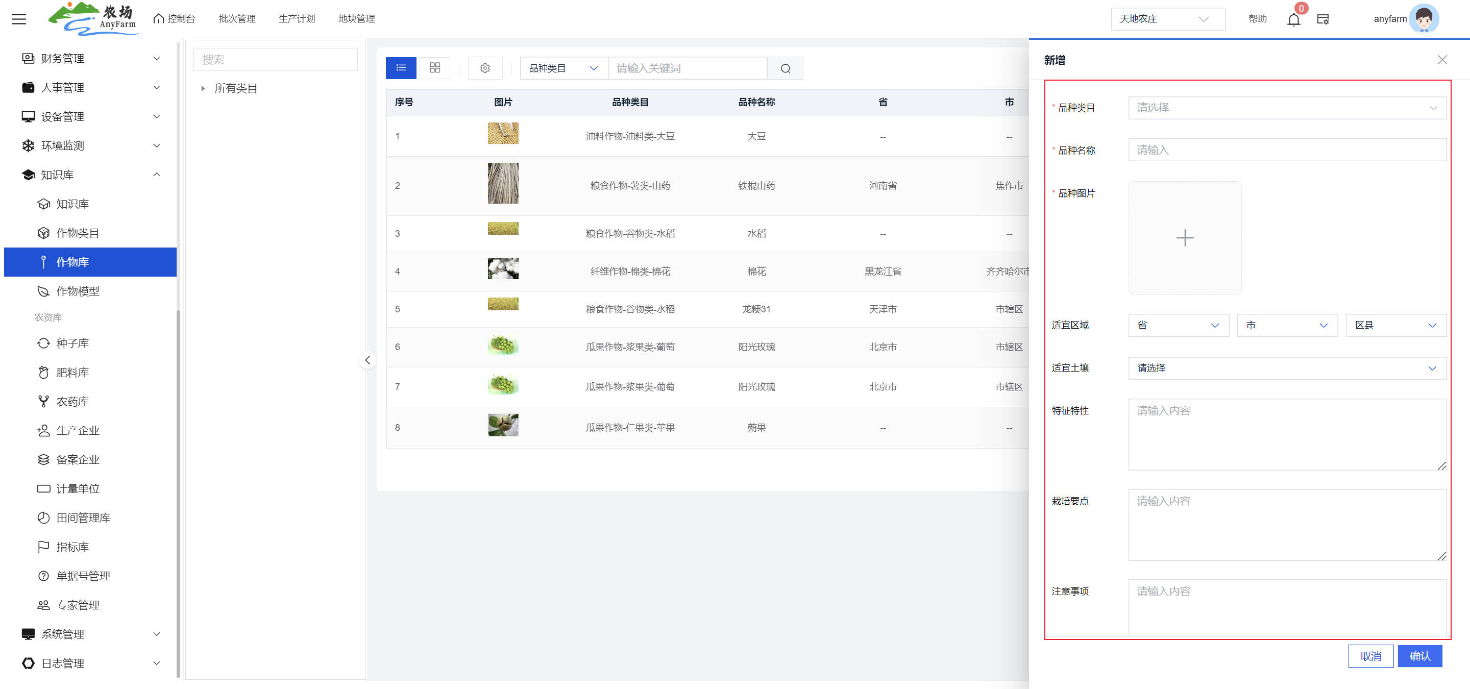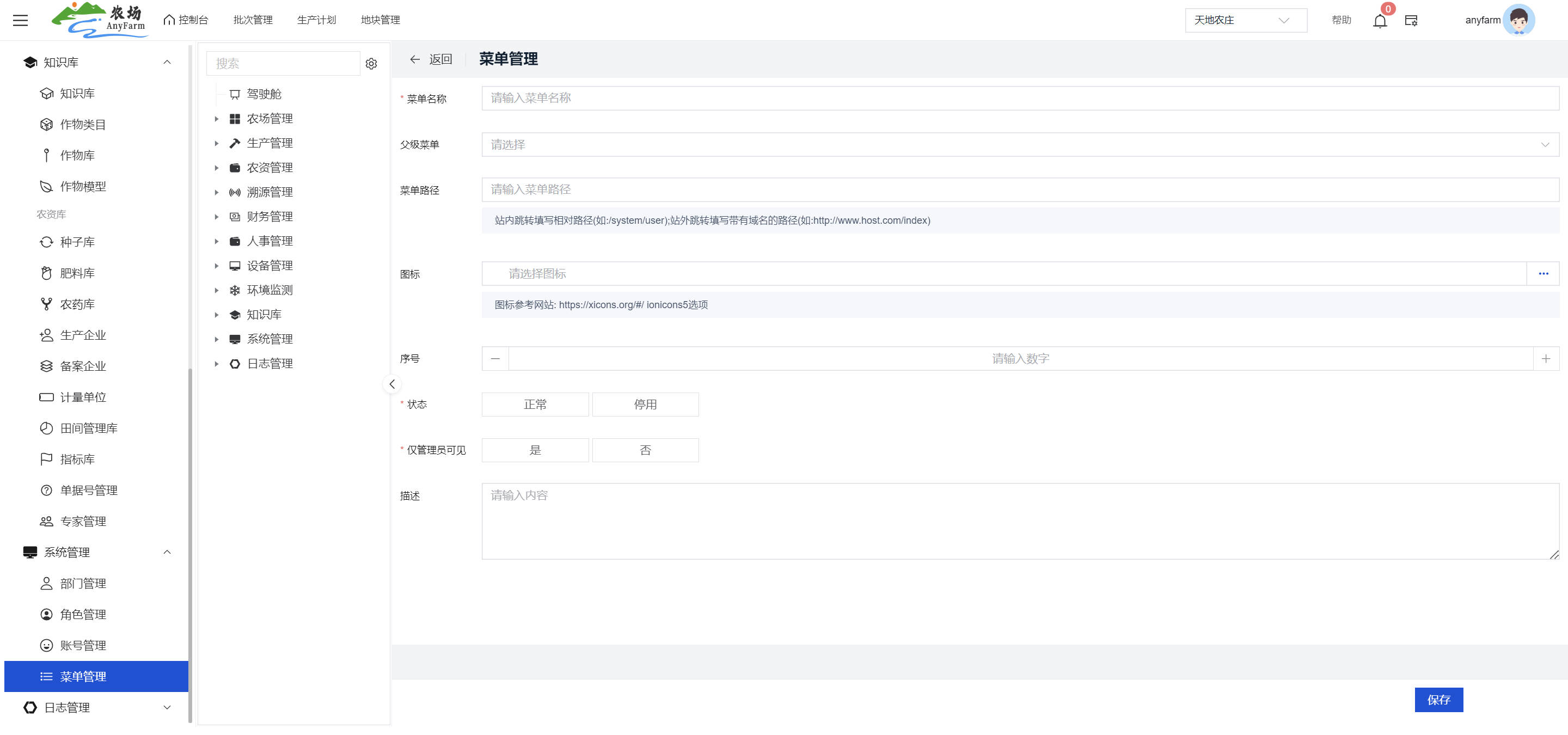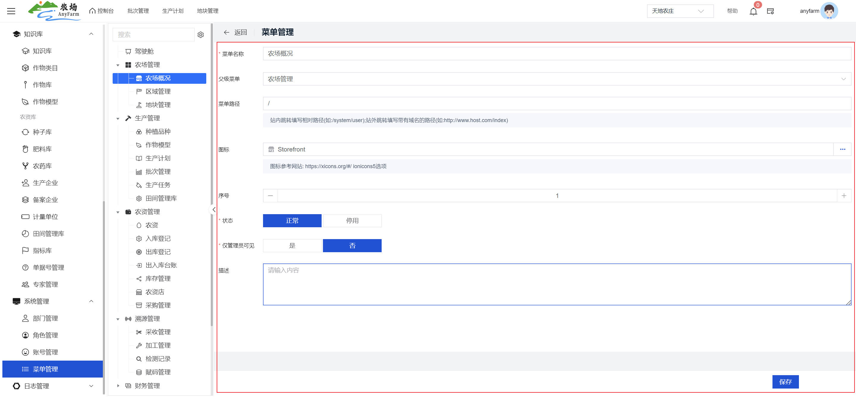 一、平台简介 AnyFarm农场管理平台是利用物联网、大数据、人工智能等现代信息技术,对农业生产进行全方位、全过程的智能化管理和控制。它通过传感器等设备,实时监测农田环境、作物生长、土壤墒情等信息,并通过数据分析和智能决策,实现精准灌溉、施肥、病虫害防治等操作,从而提高农业生产效率,降低资源消耗,保障农产品质量。 二、产品优势 1.全流程数据化管理,提升生产效率: * 优势: * 系统覆盖农场管理的各个环节,实现数据统一采集、存储和分析。 * 通过数据分析,优化生产计划,减少资源浪费,提高生产效率。 * 实时监测农场环境和生产状态,及时发现并解决问题。 * 体现: * 从农场基础信息录入,到生产计划制定,再到农产品溯源,全程数据化管理。 * 通过数据分析,实现精准施肥、精准灌溉等操作,提高资源利用率。 2. 智能化决策支持,降低生产风险: * 优势: * 利用机器学习模型,实现农产品质量预测、产量预测、病虫害预警等功能。 * 为农场管理者提供科学的决策依据,降低生产风险。 * 通过数据分析,预测市场行情,帮助农场及时调整生产策略。 * 体现: * 通过模型训练,预测农产品产量和质量,提前做好准备。 * 通过病虫害预警模型,及时发现并处理病虫害,减少损失。 3. 全程可追溯,保障农产品质量安全: * 优势: * 实现农产品从生产到销售的全程可追溯,保障产品质量安全。 * 消费者可以通过溯源码查询农产品生产信息,增强信任感。 * 提高农产品品牌价值,增强市场竞争力。 * 体现: * 记录农产品生产、加工、检测等信息,并与溯源码关联。 * 消费者可以通过手机扫描溯源码,了解农产品详细信息。 三、业务流程 流程说明: 1. 基础信息管理 * 农场管理: 对已添加的农场进行管理,包括信息修改、删除等操作。 * 员工管理: 录入和管理农场员工信息,包括姓名、工号、职位、联系方式等。 * 区域管理: 划分农场区域,如种植区、养殖区、办公区等,方便后续管理。 * 地块管理: 将农场区域进一步细分为地块,记录地块编号、面积、种植作物等信息。 * 设备管理: 录入和管理农场使用的各种设备,如灌溉设备、施肥设备、监测设备等。 * 计量单位: 设置系统中使用的计量单位,如面积单位、重量单位等。 * 指标库: 建立农产品质量、环境监测等相关指标库,为后续数据分析提供基础。 2. 生产管理 * 添加品种: 录入农场种植或养殖的品种信息,包括品种名称、特性、生长周期等。 * 品种管理: 对已添加的品种进行管理,包括信息修改、删除等操作。 * 添加农资: 录入农场使用的农资信息,如种子、肥料、农药等。 * 农资管理: 对已添加的农资进行管理,包括信息修改、删除等操作。 * 农资店: 如果农场有自己的农资店,则可以录入和管理农资店的信息。 * 农资出入库: 记录农资的出入库情况,实现农资库存管理。 * 生产计划: 制定农场的生产计划,包括种植或养殖时间、产量目标、农资使用计划等。 * 批次管理: 对农产品进行批次管理,记录批次信息、生产过程、质量检测等。 * 生产任务: 根据生产计划,生成具体的生产任务,分配给员工执行。 3. 溯源管理 * 采收管理: 记录农产品的采收情况,包括采收时间、产量、质量等。 * 加工管理: 如果农产品需要进行加工,则记录加工过程和相关信息。 * 检测记录: 记录农产品质量检测、环境监测等数据。 * 赋码管理: 对农产品进行赋码,实现产品溯源。 四、操作指南 4.1农场概况 界面功能概述: 该界面作为农场的首页及控制台界面,为用户呈现了农场的整体概况信息。在这里,用户能够清晰地查看到农场的数量、各个地块的数量、当前在职的员工人数、实时的天气状况等重要信息。同时,该界面还为用户提供了便捷的操作入口,例如可以进行农场的管理操作以及新增员工等常用功能,方便用户对农场的基本信息进行快速的了解和管理。  4.1.1.1 农场概况 界面功能概述: 用户可以点击标红的地方跳转到农场管理跳转到农场管理界面。  用户点击界面中标红的区域即可跳转到农场管理界面。在该界面中,用户可以全面了解农场的各项详细信息,如农场的占地面积、具体的种植区域划分、在职员工的数量及基本信息、各类设备的运行情况、今日和明日的农事安排等。这些信息的展示有助于用户对农场的整体运营状况有一个清晰的认识,同时也为后续的管理决策提供了有力的数据支持。此外,用户还可以在该界面进行一些基础的管理操作,如编辑农场的基本信息、调整设备的设置等,以确保农场的各项工作能够顺利进行。  4.1.1.2 农场农事 界面功能概述: 用户可以通过这里看到该农场的农事情况,例如施药、灌溉、施肥等常见的农事活动。  4.1.1.3 新增用户 界面元素功能概述: 该界面主要用于用户进行新增用户以及添加用户权限的操作。在农场的日常运营中,可能需要不断添加新的员工或管理人员,并为他们分配相应的权限,以便他们能够顺利地完成各自的工作任务。通过该界面,用户可以方便地完成这些操作,确保农场的人力资源管理更加高效和有序。  左侧搜索栏 :此搜索栏为用户提供了一个便捷的方式,允许用户在输入框内输入关键字,例如部门名称的关键词,从而快速搜索到特定的部门。这对于拥有多个部门的大型农场来说,能够大大提高用户查找部门的效率,节省时间。 顶部搜索栏:在这里,用户可以在输入框内