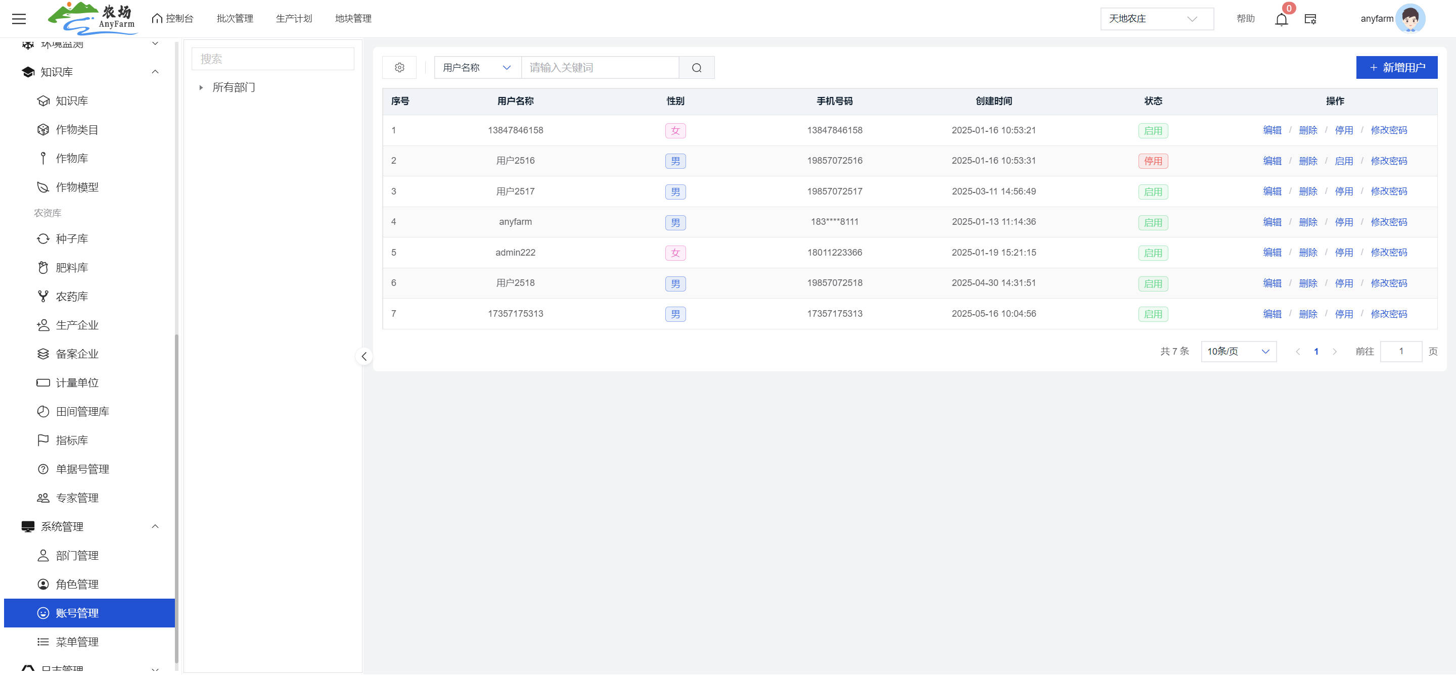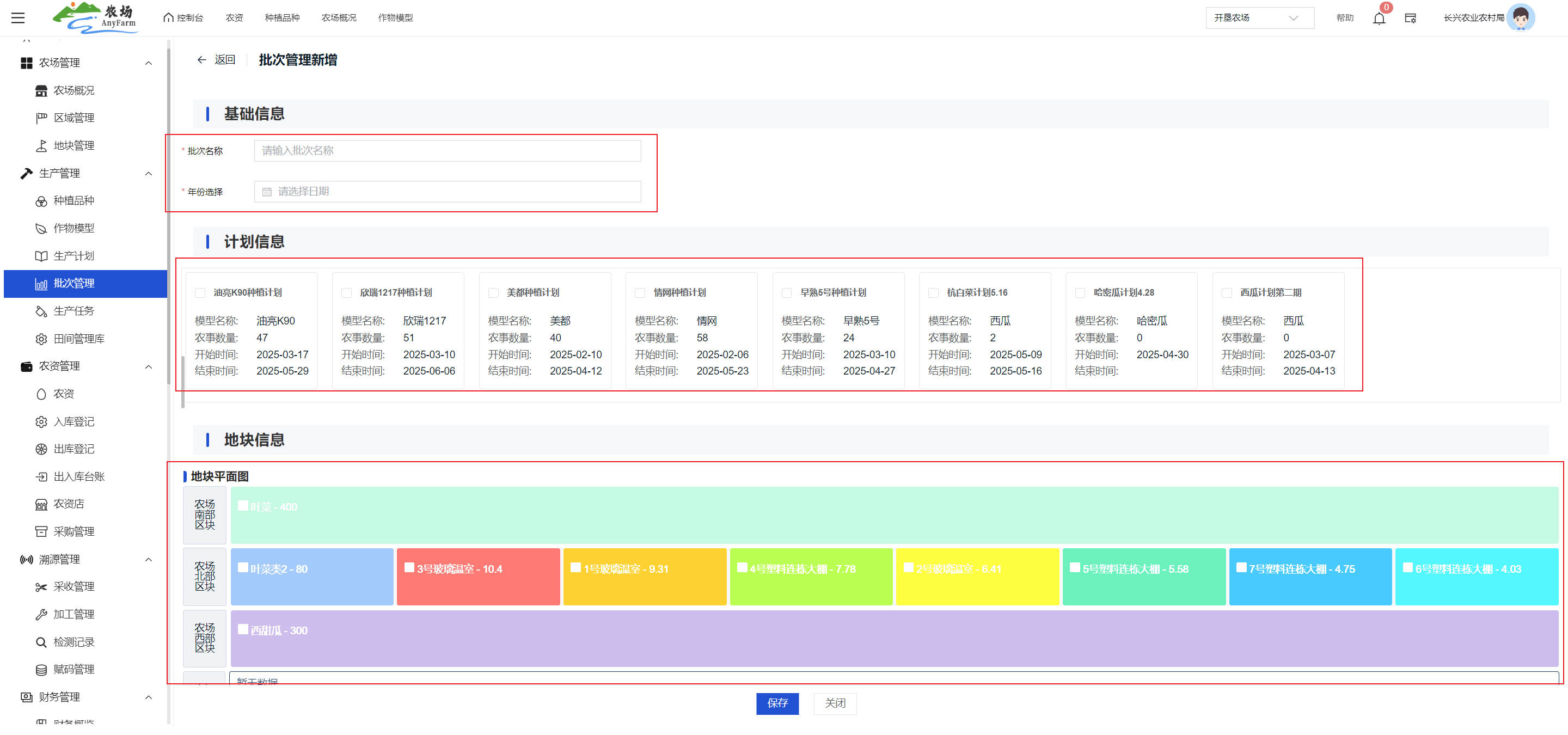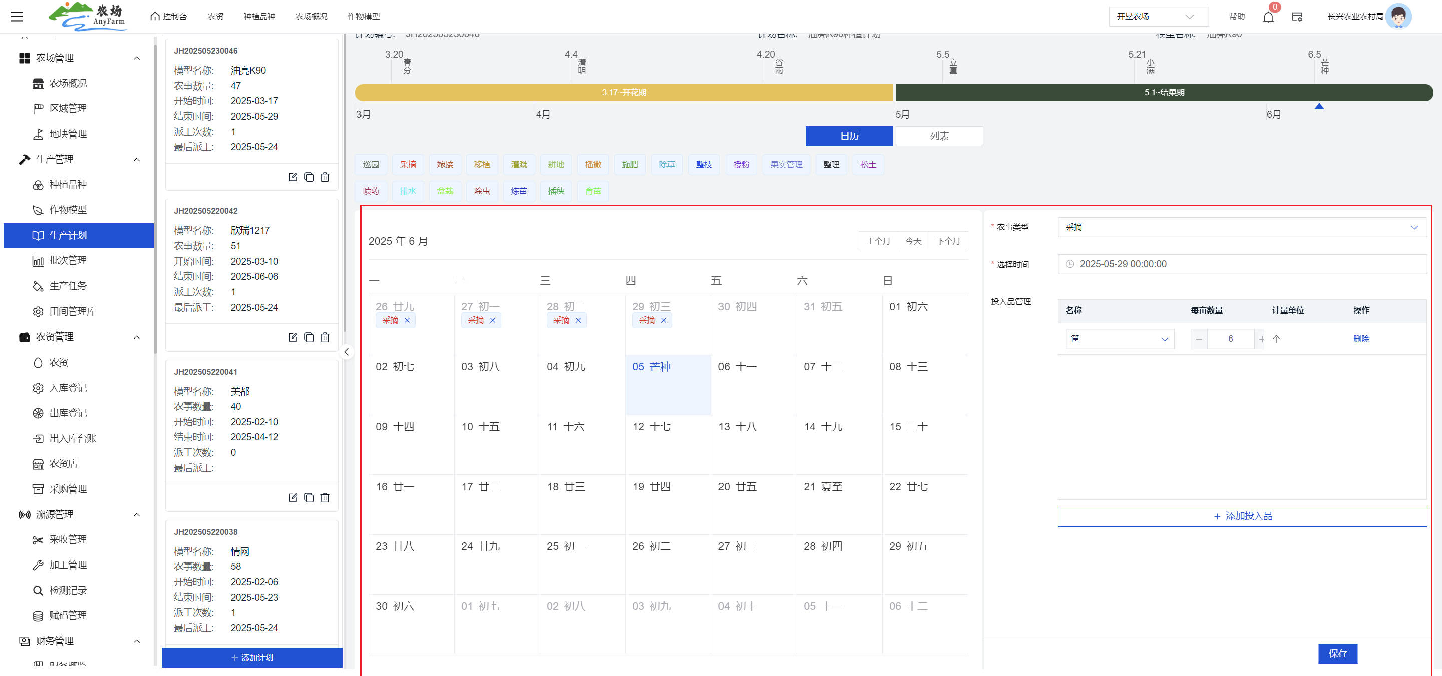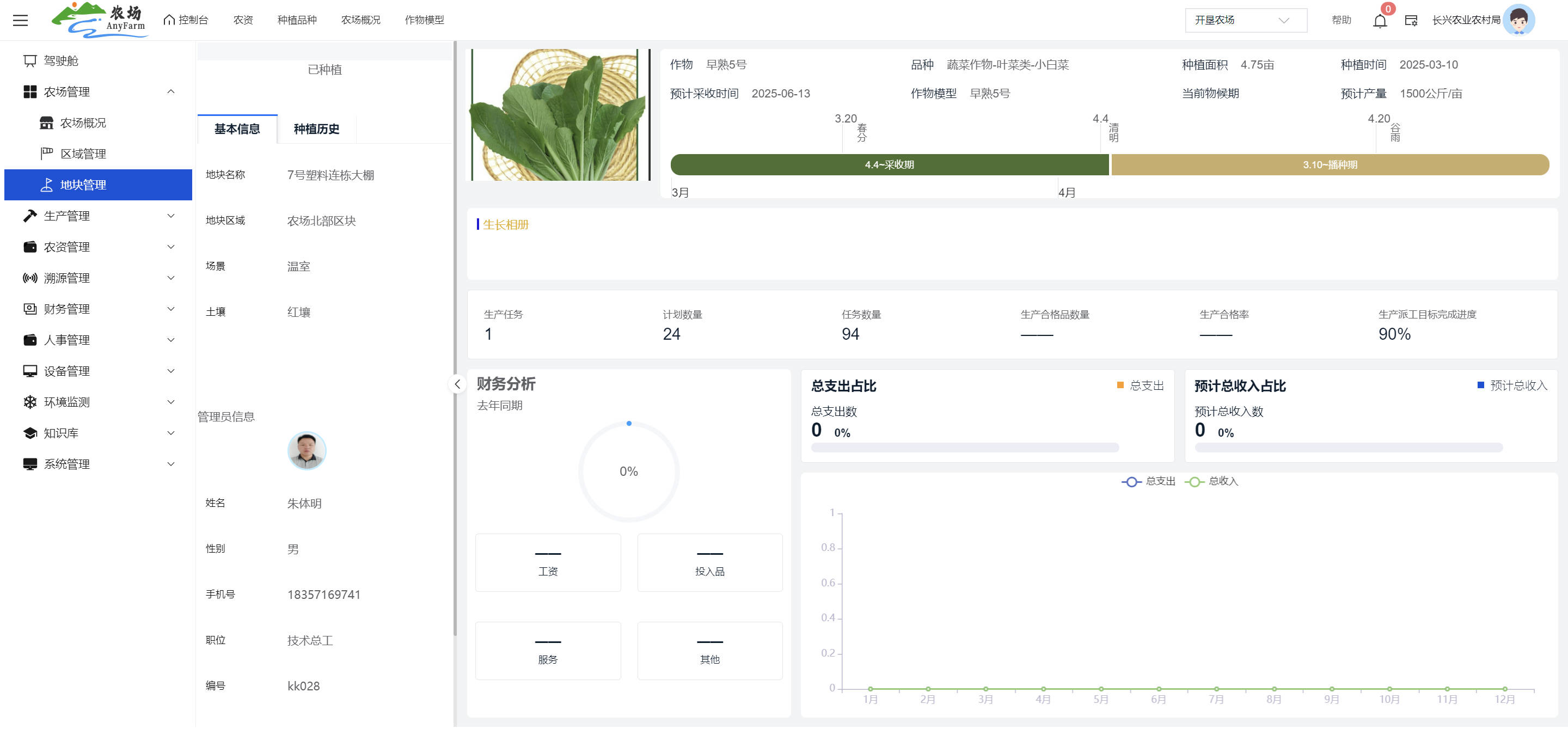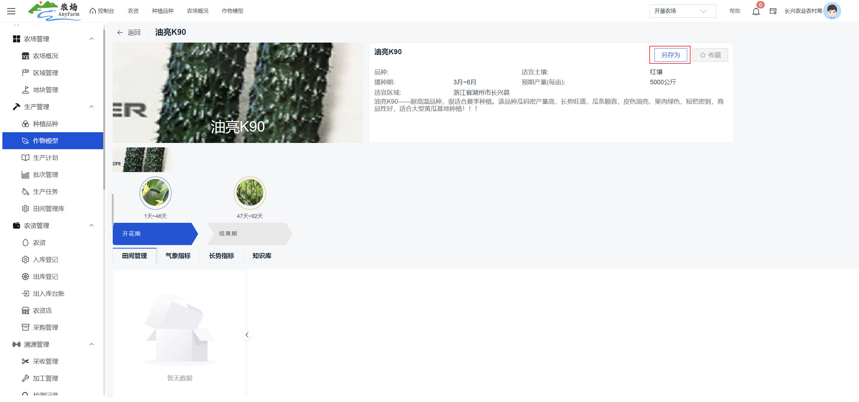 一、平台简介 AnyFarm农场管理平台是利用物联网、大数据、人工智能等现代信息技术,对农业生产进行全方位、全过程的智能化管理和控制。它通过传感器等设备,实时监测农田环境、作物生长、土壤墒情等信息,并通过数据分析和智能决策,实现精准灌溉、施肥、病虫害防治等操作,从而提高农业生产效率,降低资源消耗,保障农产品质量。 二、产品优势 1.全流程数据化管理,提升生产效率: * 优势: * 系统覆盖农场管理的各个环节,实现数据统一采集、存储和分析。 * 通过数据分析,优化生产计划,减少资源浪费,提高生产效率。 * 实时监测农场环境和生产状态,及时发现并解决问题。 * 体现: * 从农场基础信息录入,到生产计划制定,再到农产品溯源,全程数据化管理。 * 通过数据分析,实现精准施肥、精准灌溉等操作,提高资源利用率。 2. 智能化决策支持,降低生产风险: * 优势: * 利用机器学习模型,实现农产品质量预测、产量预测、病虫害预警等功能。 * 为农场管理者提供科学的决策依据,降低生产风险。 * 通过数据分析,预测市场行情,帮助农场及时调整生产策略。 * 体现: * 通过模型训练,预测农产品产量和质量,提前做好准备。 * 通过病虫害预警模型,及时发现并处理病虫害,减少损失。 3. 全程可追溯,保障农产品质量安全: * 优势: * 实现农产品从生产到销售的全程可追溯,保障产品质量安全。 * 消费者可以通过溯源码查询农产品生产信息,增强信任感。 * 提高农产品品牌价值,增强市场竞争力。 * 体现: * 记录农产品生产、加工、检测等信息,并与溯源码关联。 * 消费者可以通过手机扫描溯源码,了解农产品详细信息。 三、业务流程 流程说明: 1. 基础信息管理 * 农场管理: 对已添加的农场进行管理,包括信息修改、删除等操作。 * 员工管理: 录入和管理农场员工信息,包括姓名、工号、职位、联系方式等。 * 区域管理: 划分农场区域,如种植区、养殖区、办公区等,方便后续管理。 * 地块管理: 将农场区域进一步细分为地块,记录地块编号、面积、种植作物等信息。 * 设备管理: 录入和管理农场使用的各种设备,如灌溉设备、施肥设备、监测设备等。 * 计量单位: 设置系统中使用的计量单位,如面积单位、重量单位等。 * 指标库: 建立农产品质量、环境监测等相关指标库,为后续数据分析提供基础。 2. 生产管理 * 添加品种: 录入农场种植或养殖的品种信息,包括品种名称、特性、生长周期等。 * 品种管理: 对已添加的品种进行管理,包括信息修改、删除等操作。 * 添加农资: 录入农场使用的农资信息,如种子、肥料、农药等。 * 农资管理: 对已添加的农资进行管理,包括信息修改、删除等操作。 * 农资店: 如果农场有自己的农资店,则可以录入和管理农资店的信息。 * 农资出入库: 记录农资的出入库情况,实现农资库存管理。 * 生产计划: 制定农场的生产计划,包括种植或养殖时间、产量目标、农资使用计划等。 * 批次管理: 对农产品进行批次管理,记录批次信息、生产过程、质量检测等。 * 生产任务: 根据生产计划,生成具体的生产任务,分配给员工执行。 3. 溯源管理 * 采收管理: 记录农产品的采收情况,包括采收时间、产量、质量等。 * 加工管理: 如果农产品需要进行加工,则记录加工过程和相关信息。 * 检测记录: 记录农产品质量检测、环境监测等数据。 * 赋码管理: 对农产品进行赋码,实现产品溯源。 四、操作指南 4.1农场概况 界面功能概述: 该界面作为农场的首页及控制台界面,为用户呈现了农场的整体概况信息。在这里,用户能够清晰地查看到农场的数量、各个地块的数量、当前在职的员工人数、实时的天气状况等重要信息。同时,该界面还为用户提供了便捷的操作入口,例如可以进行农场的管理操作以及新增员工等常用功能,方便用户对农场的基本信息进行快速的了解和管理。  4.1.1.1 农场概况 界面功能概述: 用户可以点击标红的地方跳转到农场管理跳转到农场管理界面。  用户点击界面中标红的区域即可跳转到农场管理界面。在该界面中,用户可以全面了解农场的各项详细信息,如农场的占地面积、具体的种植区域划分、在职员工的数量及基本信息、各类设备的运行情况、今日和明日的农事安排等。这些信息的展示有助于用户对农场的整体运营状况有一个清晰的认识,同时也为后续的管理决策提供了有力的数据支持。此外,用户还可以在该界面进行一些基础的管理操作,如编辑农场的基本信息、调整设备的设置等,以确保农场的各项工作能够顺利进行。  4.1.1.2 农场农事 界面功能概述: 用户可以通过这里看到该农场的农事情况,例如施药、灌溉、施肥等常见的农事活动。  4.1.1.3 新增用户 界面元素功能概述: 该界面主要用于用户进行新增用户以及添加用户权限的操作。在农场的日常运营中,可能需要不断添加新的员工或管理人员,并为他们分配相应的权限,以便他们能够顺利地完成各自的工作任务。通过该界面,用户可以方便地完成这些操作,确保农场的人力资源管理更加高效和有序。  左侧搜索栏 :此搜索栏为用户提供了一个便捷的方式,允许用户在输入框内输入关键字,例如部门名称的关键词,从而快速搜索到特定的部门。这对于拥有多个部门的大型农场来说,能够大大提高用户查找部门的效率,节省时间。 顶部搜索栏:在这里,用户可以在输入框内