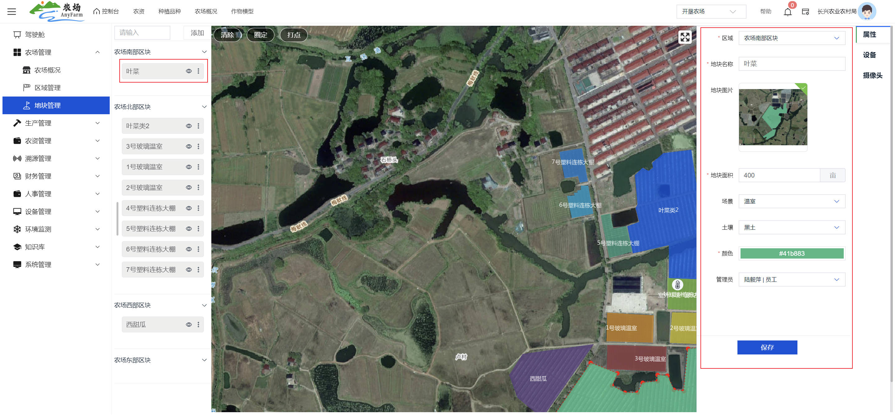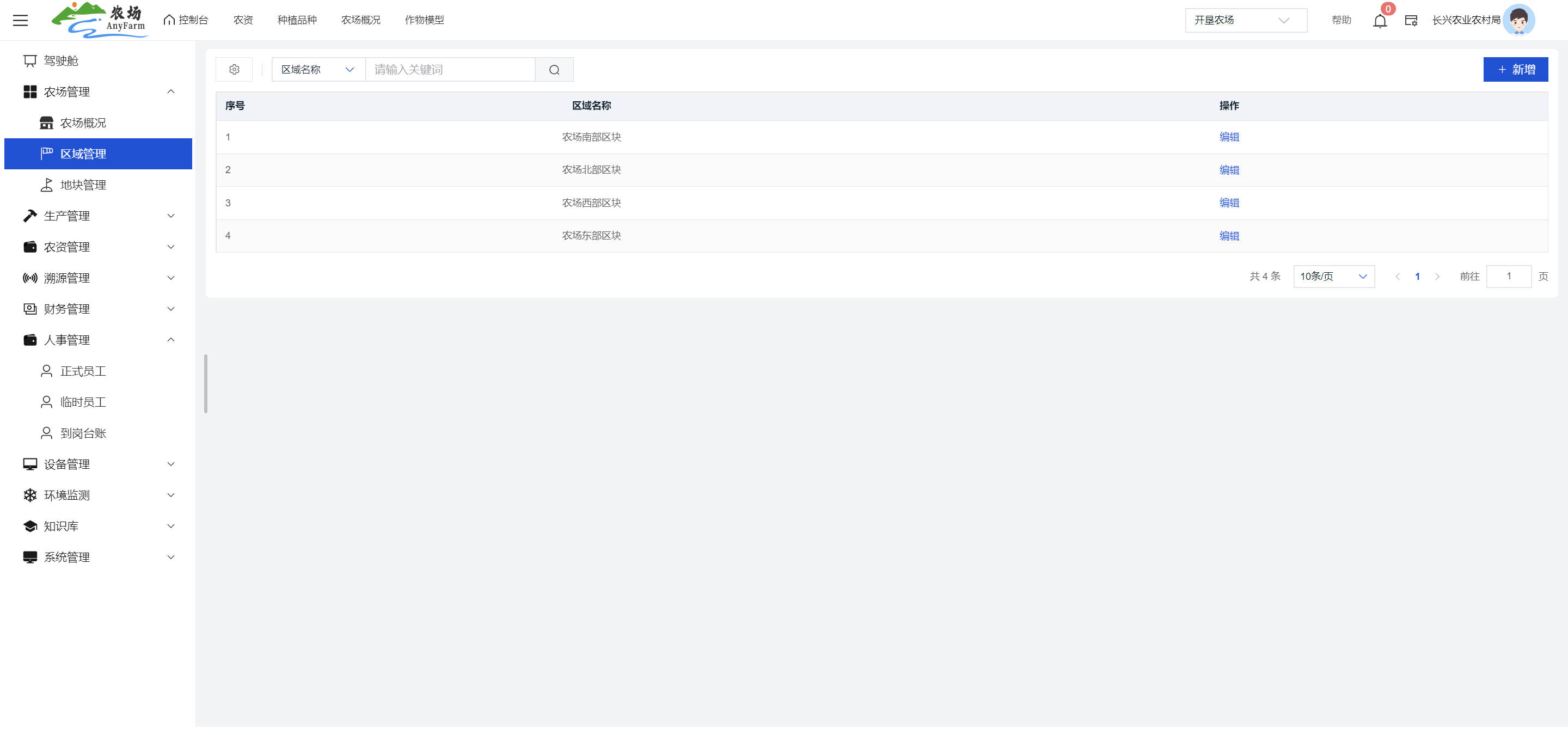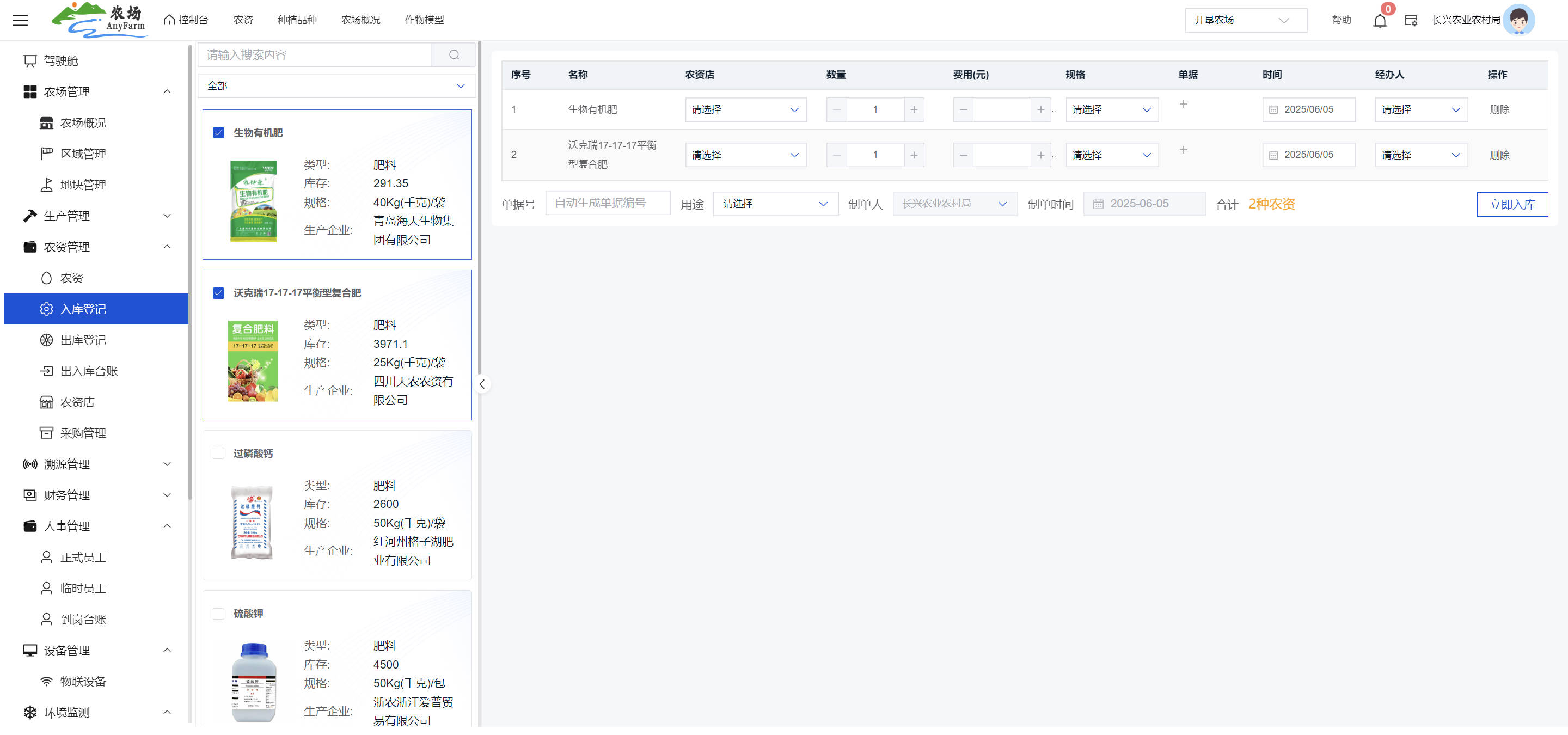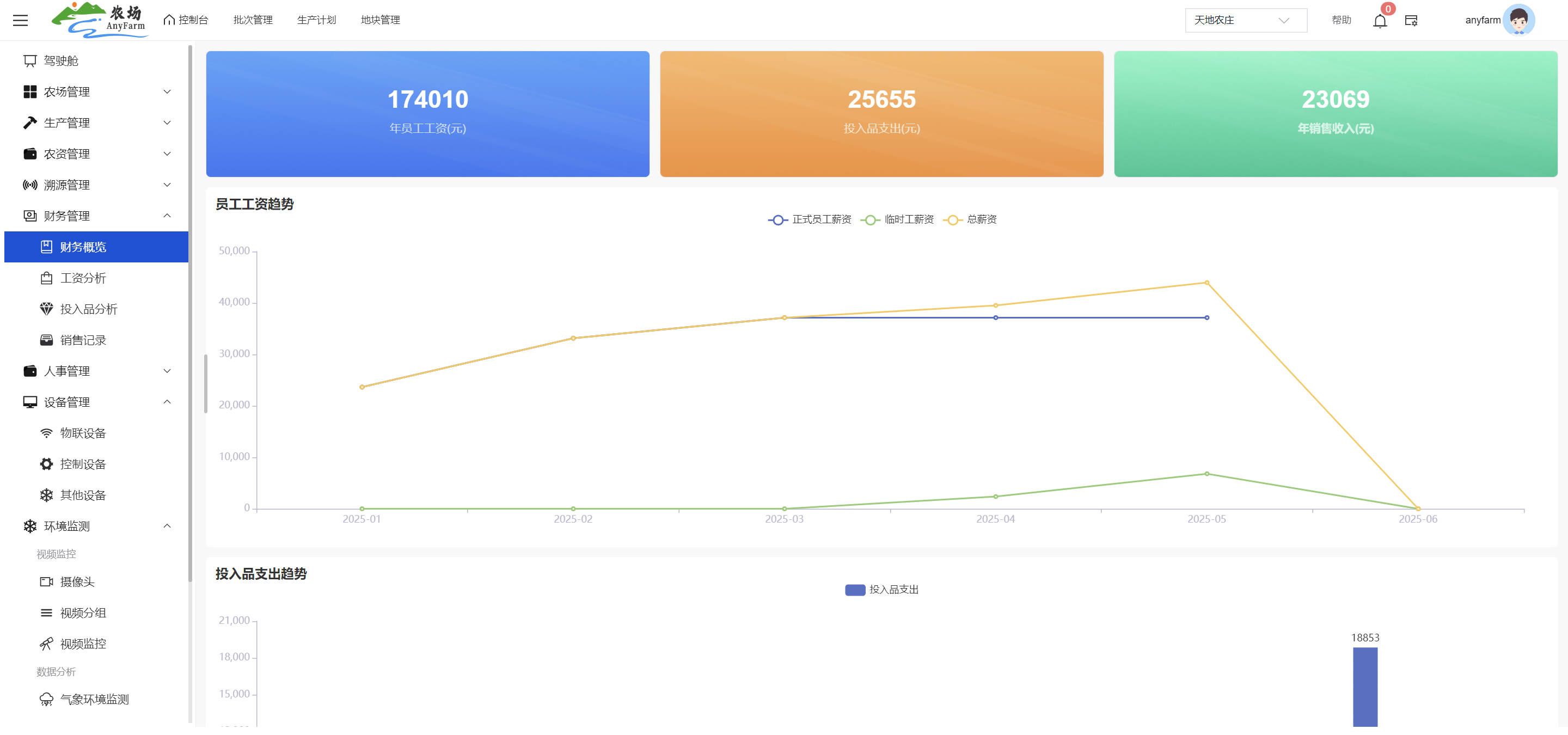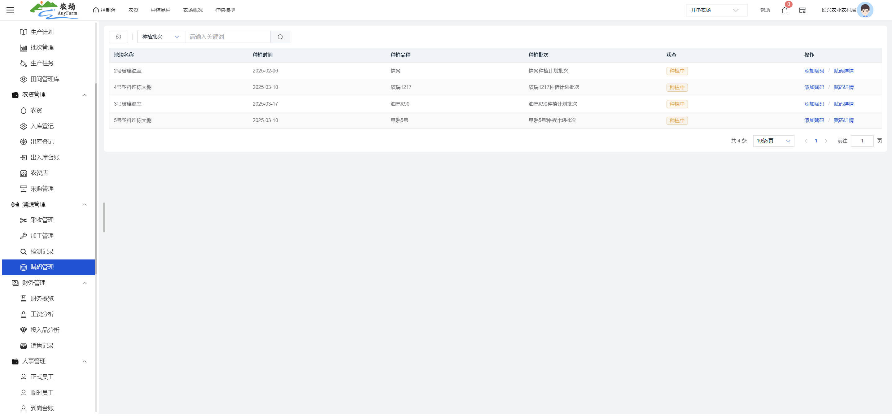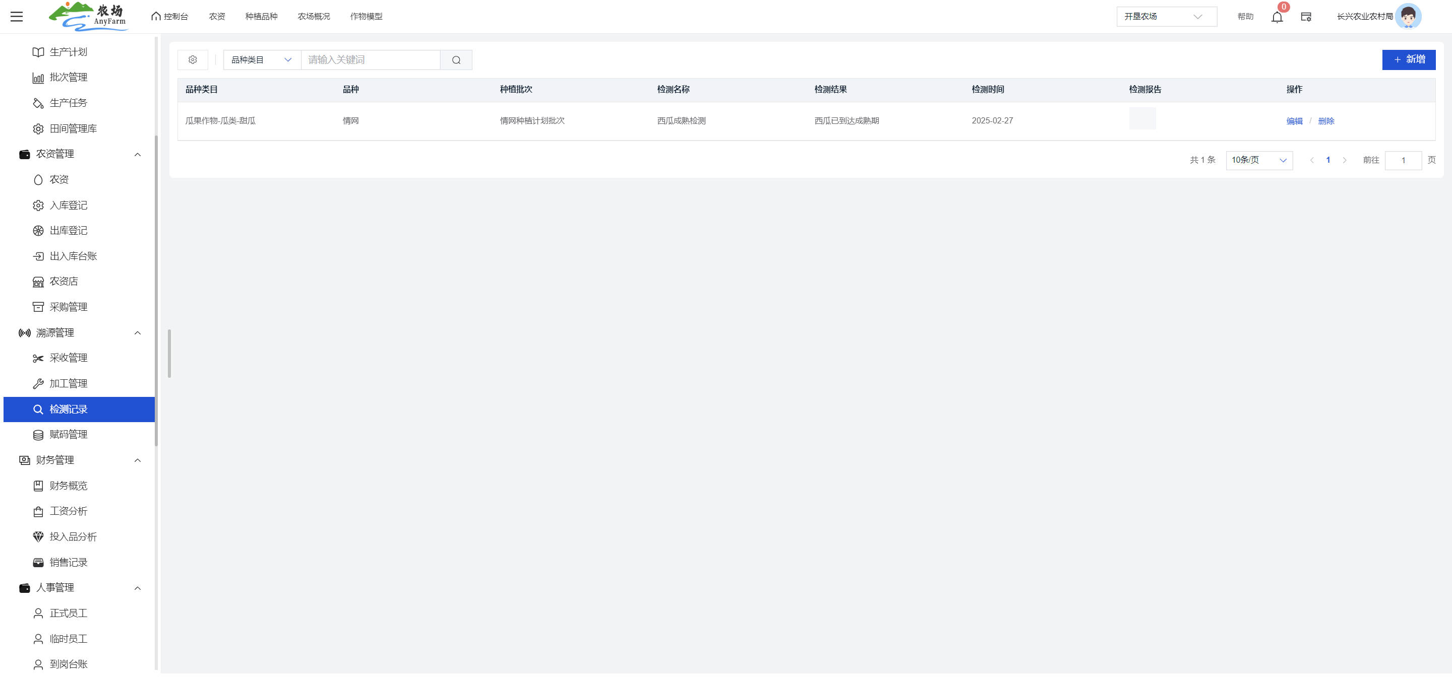 一、平台简介 AnyFarm农场管理平台是利用物联网、大数据、人工智能等现代信息技术,对农业生产进行全方位、全过程的智能化管理和控制。它通过传感器等设备,实时监测农田环境、作物生长、土壤墒情等信息,并通过数据分析和智能决策,实现精准灌溉、施肥、病虫害防治等操作,从而提高农业生产效率,降低资源消耗,保障农产品质量。 二、产品优势 1.全流程数据化管理,提升生产效率: * 优势: * 系统覆盖农场管理的各个环节,实现数据统一采集、存储和分析。 * 通过数据分析,优化生产计划,减少资源浪费,提高生产效率。 * 实时监测农场环境和生产状态,及时发现并解决问题。 * 体现: * 从农场基础信息录入,到生产计划制定,再到农产品溯源,全程数据化管理。 * 通过数据分析,实现精准施肥、精准灌溉等操作,提高资源利用率。 2. 智能化决策支持,降低生产风险: * 优势: * 利用机器学习模型,实现农产品质量预测、产量预测、病虫害预警等功能。 * 为农场管理者提供科学的决策依据,降低生产风险。 * 通过数据分析,预测市场行情,帮助农场及时调整生产策略。 * 体现: * 通过模型训练,预测农产品产量和质量,提前做好准备。 * 通过病虫害预警模型,及时发现并处理病虫害,减少损失。 3. 全程可追溯,保障农产品质量安全: * 优势: * 实现农产品从生产到销售的全程可追溯,保障产品质量安全。 * 消费者可以通过溯源码查询农产品生产信息,增强信任感。 * 提高农产品品牌价值,增强市场竞争力。 * 体现: * 记录农产品生产、加工、检测等信息,并与溯源码关联。 * 消费者可以通过手机扫描溯源码,了解农产品详细信息。 三、业务流程 流程说明: 1. 基础信息管理 * 农场管理: 对已添加的农场进行管理,包括信息修改、删除等操作。 * 员工管理: 录入和管理农场员工信息,包括姓名、工号、职位、联系方式等。 * 区域管理: 划分农场区域,如种植区、养殖区、办公区等,方便后续管理。 * 地块管理: 将农场区域进一步细分为地块,记录地块编号、面积、种植作物等信息。 * 设备管理: 录入和管理农场使用的各种设备,如灌溉设备、施肥设备、监测设备等。 * 计量单位: 设置系统中使用的计量单位,如面积单位、重量单位等。 * 指标库: 建立农产品质量、环境监测等相关指标库,为后续数据分析提供基础。 2. 生产管理 * 添加品种: 录入农场种植或养殖的品种信息,包括品种名称、特性、生长周期等。 * 品种管理: 对已添加的品种进行管理,包括信息修改、删除等操作。 * 添加农资: 录入农场使用的农资信息,如种子、肥料、农药等。 * 农资管理: 对已添加的农资进行管理,包括信息修改、删除等操作。 * 农资店: 如果农场有自己的农资店,则可以录入和管理农资店的信息。 * 农资出入库: 记录农资的出入库情况,实现农资库存管理。 * 生产计划: 制定农场的生产计划,包括种植或养殖时间、产量目标、农资使用计划等。 * 批次管理: 对农产品进行批次管理,记录批次信息、生产过程、质量检测等。 * 生产任务: 根据生产计划,生成具体的生产任务,分配给员工执行。 3. 溯源管理 * 采收管理: 记录农产品的采收情况,包括采收时间、产量、质量等。 * 加工管理: 如果农产品需要进行加工,则记录加工过程和相关信息。 * 检测记录: 记录农产品质量检测、环境监测等数据。 * 赋码管理: 对农产品进行赋码,实现产品溯源。 四、操作指南 4.1农场概况 界面功能概述: 该界面作为农场的首页及控制台界面,为用户呈现了农场的整体概况信息。在这里,用户能够清晰地查看到农场的数量、各个地块的数量、当前在职的员工人数、实时的天气状况等重要信息。同时,该界面还为用户提供了便捷的操作入口,例如可以进行农场的管理操作以及新增员工等常用功能,方便用户对农场的基本信息进行快速的了解和管理。  4.1.1.1 农场概况 界面功能概述: 用户可以点击标红的地方跳转到农场管理跳转到农场管理界面。  用户点击界面中标红的区域即可跳转到农场管理界面。在该界面中,用户可以全面了解农场的各项详细信息,如农场的占地面积、具体的种植区域划分、在职员工的数量及基本信息、各类设备的运行情况、今日和明日的农事安排等。这些信息的展示有助于用户对农场的整体运营状况有一个清晰的认识,同时也为后续的管理决策提供了有力的数据支持。此外,用户还可以在该界面进行一些基础的管理操作,如编辑农场的基本信息、调整设备的设置等,以确保农场的各项工作能够顺利进行。  4.1.1.2 农场农事 界面功能概述: 用户可以通过这里看到该农场的农事情况,例如施药、灌溉、施肥等常见的农事活动。  4.1.1.3 新增用户 界面元素功能概述: 该界面主要用于用户进行新增用户以及添加用户权限的操作。在农场的日常运营中,可能需要不断添加新的员工或管理人员,并为他们分配相应的权限,以便他们能够顺利地完成各自的工作任务。通过该界面,用户可以方便地完成这些操作,确保农场的人力资源管理更加高效和有序。  左侧搜索栏 :此搜索栏为用户提供了一个便捷的方式,允许用户在输入框内输入关键字,例如部门名称的关键词,从而快速搜索到特定的部门。这对于拥有多个部门的大型农场来说,能够大大提高用户查找部门的效率,节省时间。 顶部搜索栏:在这里,用户可以在输入框内