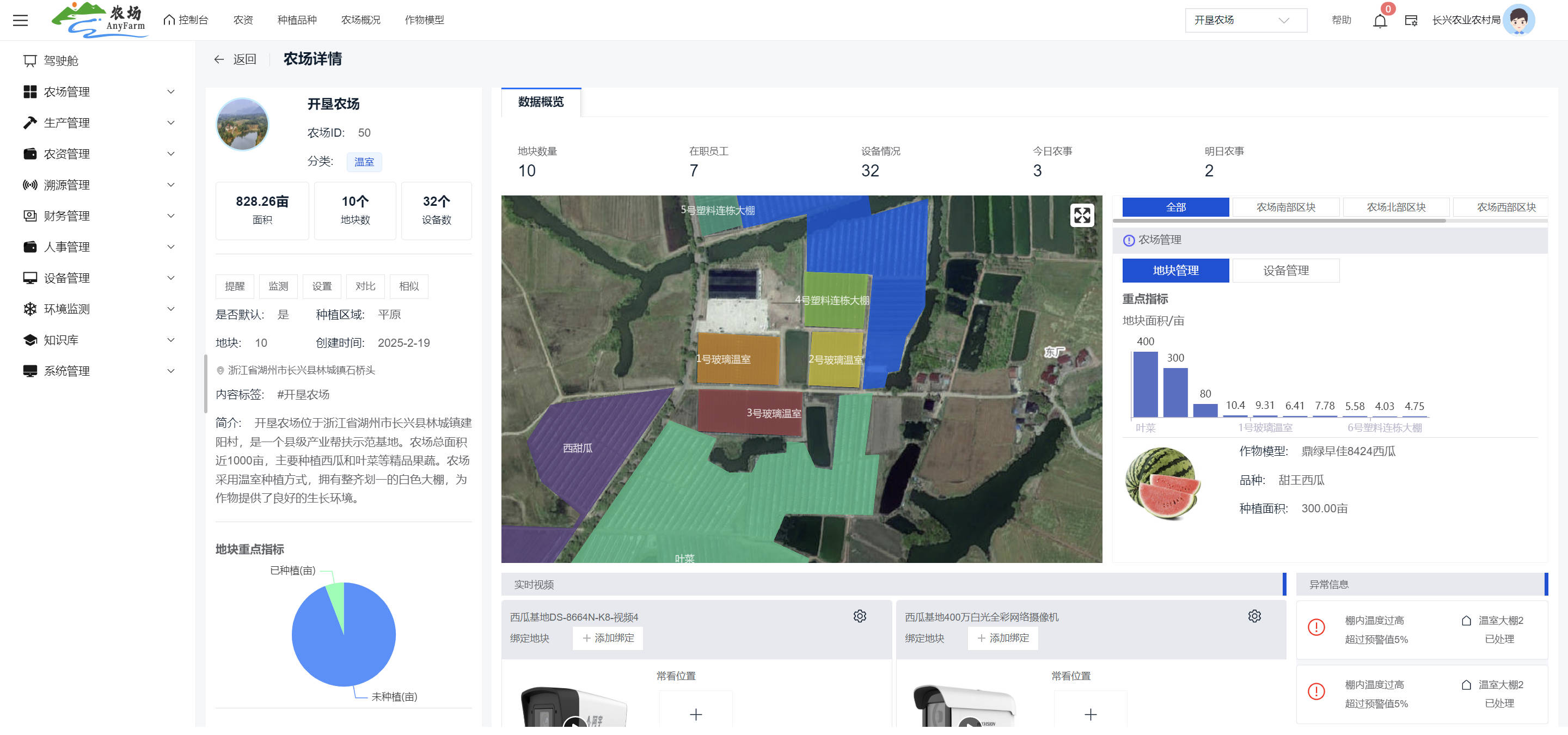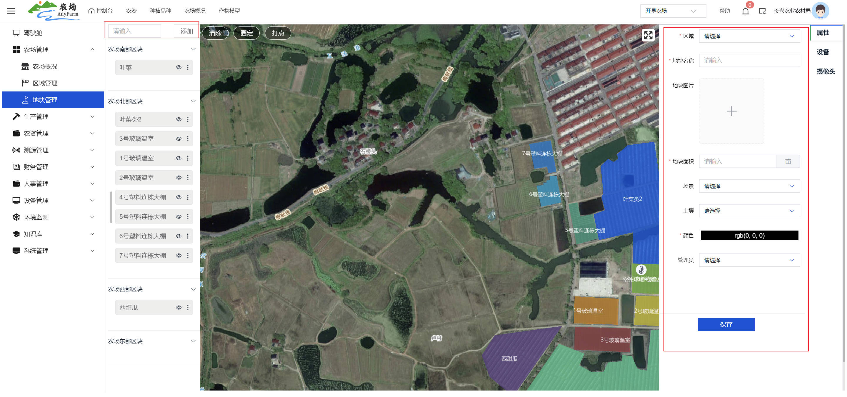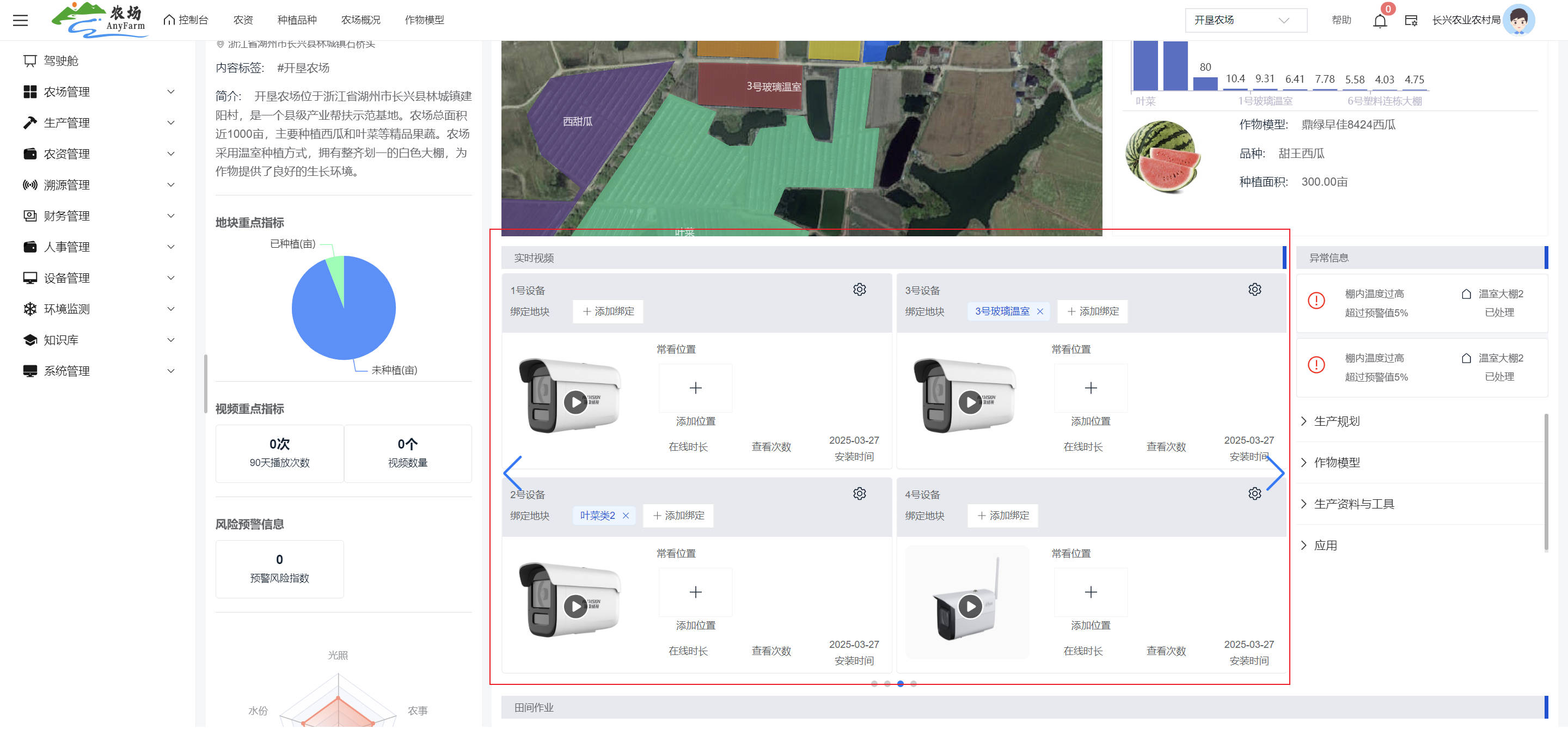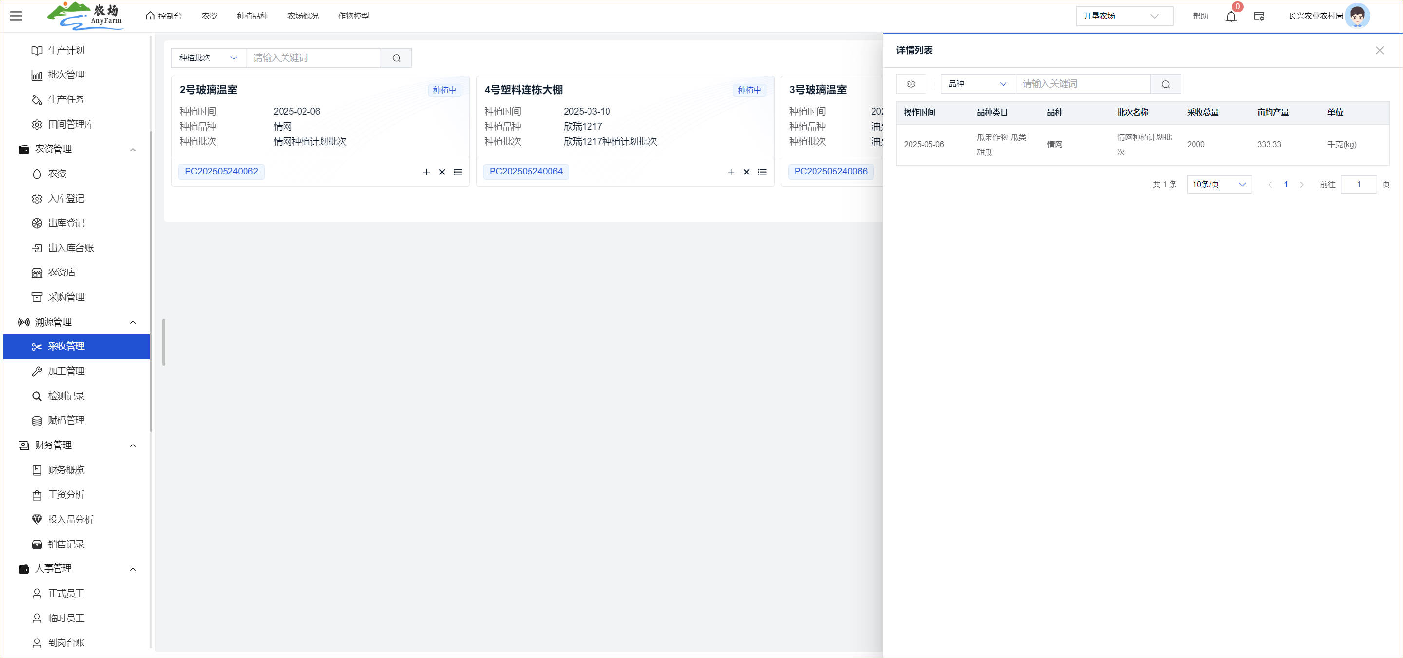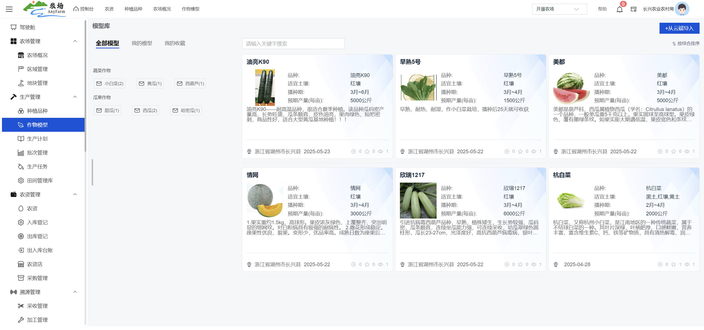 一、平台简介 AnyFarm农场管理平台是利用物联网、大数据、人工智能等现代信息技术,对农业生产进行全方位、全过程的智能化管理和控制。它通过传感器等设备,实时监测农田环境、作物生长、土壤墒情等信息,并通过数据分析和智能决策,实现精准灌溉、施肥、病虫害防治等操作,从而提高农业生产效率,降低资源消耗,保障农产品质量。 二、产品优势 1.全流程数据化管理,提升生产效率: * 优势: * 系统覆盖农场管理的各个环节,实现数据统一采集、存储和分析。 * 通过数据分析,优化生产计划,减少资源浪费,提高生产效率。 * 实时监测农场环境和生产状态,及时发现并解决问题。 * 体现: * 从农场基础信息录入,到生产计划制定,再到农产品溯源,全程数据化管理。 * 通过数据分析,实现精准施肥、精准灌溉等操作,提高资源利用率。 2. 智能化决策支持,降低生产风险: * 优势: * 利用机器学习模型,实现农产品质量预测、产量预测、病虫害预警等功能。 * 为农场管理者提供科学的决策依据,降低生产风险。 * 通过数据分析,预测市场行情,帮助农场及时调整生产策略。 * 体现: * 通过模型训练,预测农产品产量和质量,提前做好准备。 * 通过病虫害预警模型,及时发现并处理病虫害,减少损失。 3. 全程可追溯,保障农产品质量安全: * 优势: * 实现农产品从生产到销售的全程可追溯,保障产品质量安全。 * 消费者可以通过溯源码查询农产品生产信息,增强信任感。 * 提高农产品品牌价值,增强市场竞争力。 * 体现: * 记录农产品生产、加工、检测等信息,并与溯源码关联。 * 消费者可以通过手机扫描溯源码,了解农产品详细信息。 三、业务流程 流程说明: 1. 基础信息管理 * 农场管理: 对已添加的农场进行管理,包括信息修改、删除等操作。 * 员工管理: 录入和管理农场员工信息,包括姓名、工号、职位、联系方式等。 * 区域管理: 划分农场区域,如种植区、养殖区、办公区等,方便后续管理。 * 地块管理: 将农场区域进一步细分为地块,记录地块编号、面积、种植作物等信息。 * 设备管理: 录入和管理农场使用的各种设备,如灌溉设备、施肥设备、监测设备等。 * 计量单位: 设置系统中使用的计量单位,如面积单位、重量单位等。 * 指标库: 建立农产品质量、环境监测等相关指标库,为后续数据分析提供基础。 2. 生产管理 * 添加品种: 录入农场种植或养殖的品种信息,包括品种名称、特性、生长周期等。 * 品种管理: 对已添加的品种进行管理,包括信息修改、删除等操作。 * 添加农资: 录入农场使用的农资信息,如种子、肥料、农药等。 * 农资管理: 对已添加的农资进行管理,包括信息修改、删除等操作。 * 农资店: 如果农场有自己的农资店,则可以录入和管理农资店的信息。 * 农资出入库: 记录农资的出入库情况,实现农资库存管理。 * 生产计划: 制定农场的生产计划,包括种植或养殖时间、产量目标、农资使用计划等。 * 批次管理: 对农产品进行批次管理,记录批次信息、生产过程、质量检测等。 * 生产任务: 根据生产计划,生成具体的生产任务,分配给员工执行。 3. 溯源管理 * 采收管理: 记录农产品的采收情况,包括采收时间、产量、质量等。 * 加工管理: 如果农产品需要进行加工,则记录加工过程和相关信息。 * 检测记录: 记录农产品质量检测、环境监测等数据。 * 赋码管理: 对农产品进行赋码,实现产品溯源。 四、操作指南 4.1农场概况 界面功能概述: 该界面作为农场的首页及控制台界面,为用户呈现了农场的整体概况信息。在这里,用户能够清晰地查看到农场的数量、各个地块的数量、当前在职的员工人数、实时的天气状况等重要信息。同时,该界面还为用户提供了便捷的操作入口,例如可以进行农场的管理操作以及新增员工等常用功能,方便用户对农场的基本信息进行快速的了解和管理。  4.1.1.1 农场概况 界面功能概述: 用户可以点击标红的地方跳转到农场管理跳转到农场管理界面。  用户点击界面中标红的区域即可跳转到农场管理界面。在该界面中,用户可以全面了解农场的各项详细信息,如农场的占地面积、具体的种植区域划分、在职员工的数量及基本信息、各类设备的运行情况、今日和明日的农事安排等。这些信息的展示有助于用户对农场的整体运营状况有一个清晰的认识,同时也为后续的管理决策提供了有力的数据支持。此外,用户还可以在该界面进行一些基础的管理操作,如编辑农场的基本信息、调整设备的设置等,以确保农场的各项工作能够顺利进行。  4.1.1.2 农场农事 界面功能概述: 用户可以通过这里看到该农场的农事情况,例如施药、灌溉、施肥等常见的农事活动。  4.1.1.3 新增用户 界面元素功能概述: 该界面主要用于用户进行新增用户以及添加用户权限的操作。在农场的日常运营中,可能需要不断添加新的员工或管理人员,并为他们分配相应的权限,以便他们能够顺利地完成各自的工作任务。通过该界面,用户可以方便地完成这些操作,确保农场的人力资源管理更加高效和有序。  左侧搜索栏 :此搜索栏为用户提供了一个便捷的方式,允许用户在输入框内输入关键字,例如部门名称的关键词,从而快速搜索到特定的部门。这对于拥有多个部门的大型农场来说,能够大大提高用户查找部门的效率,节省时间。 顶部搜索栏:在这里,用户可以在输入框内
