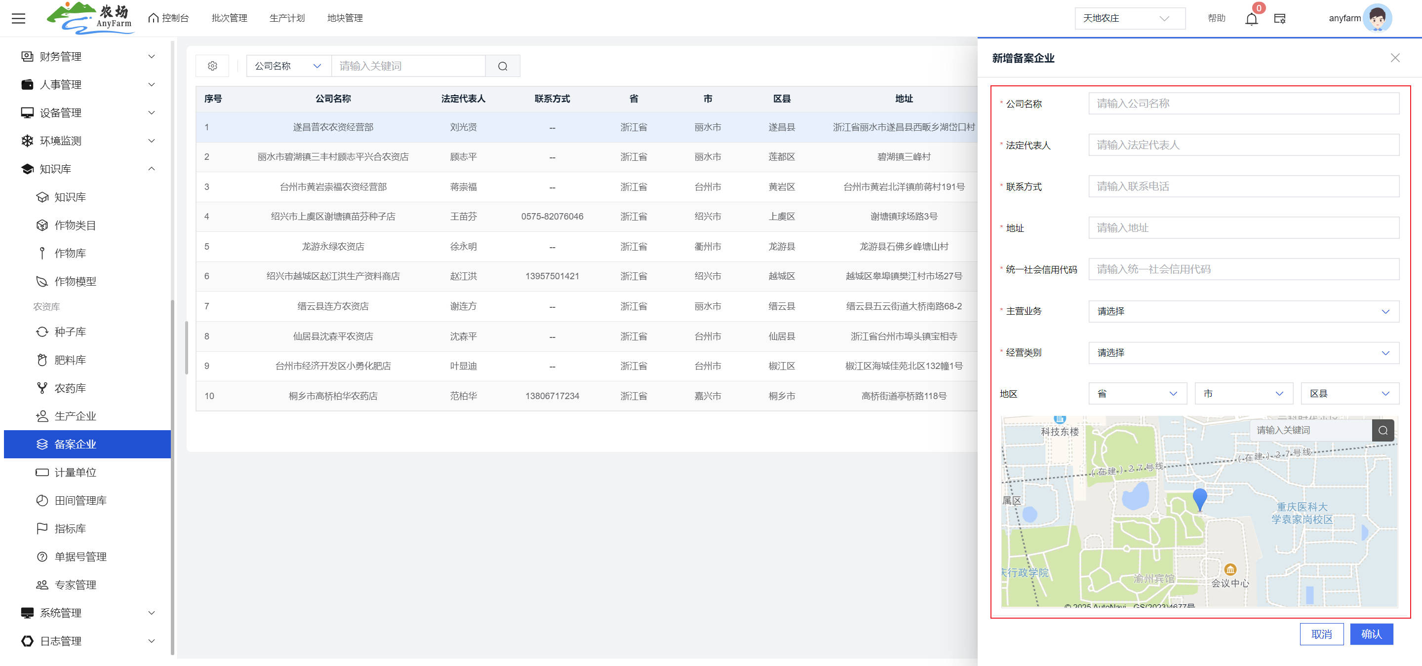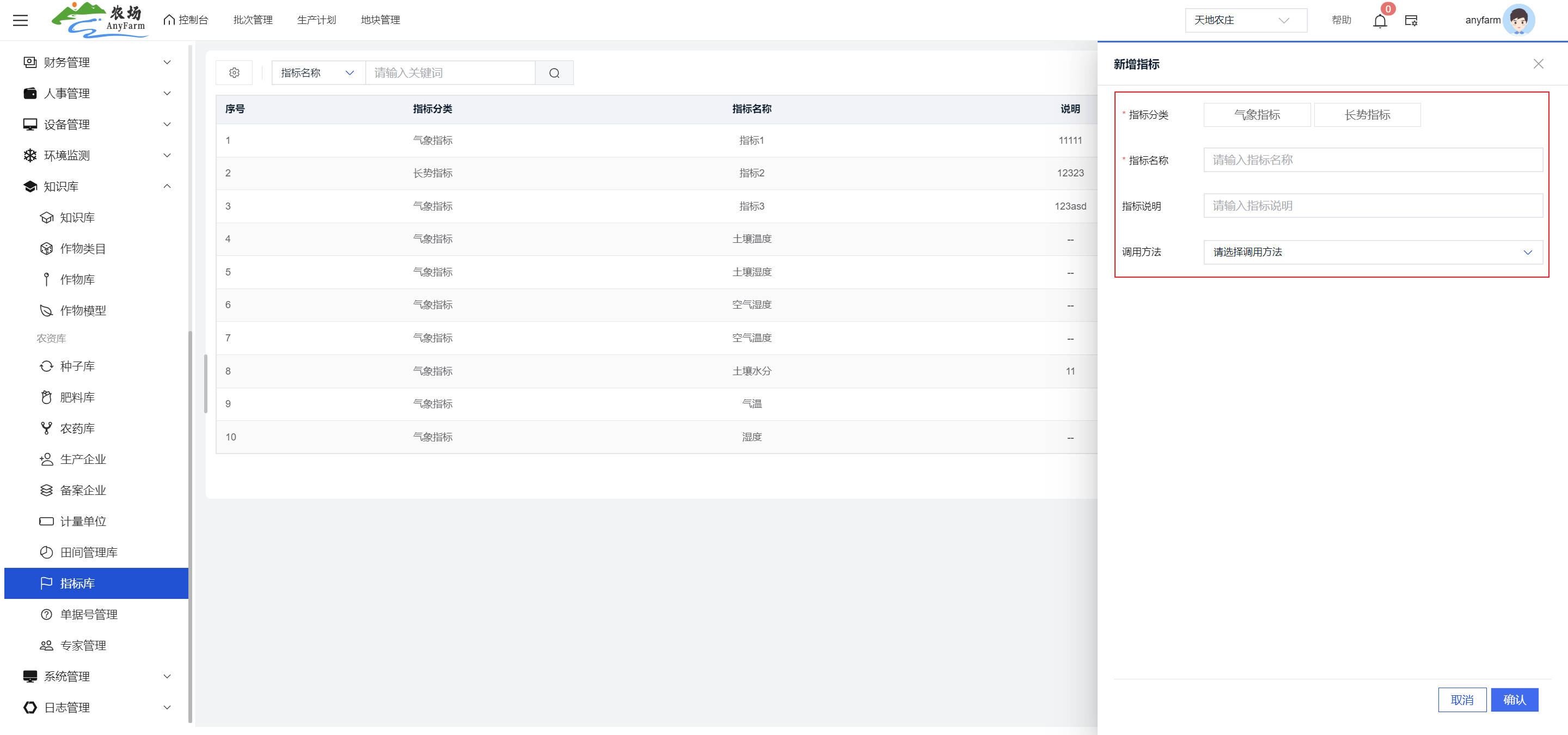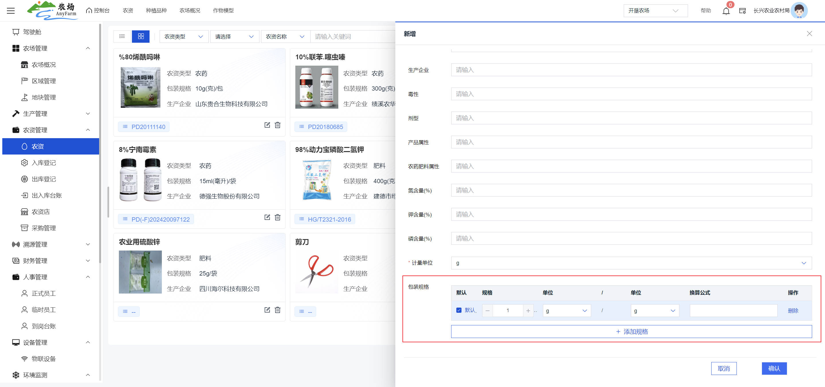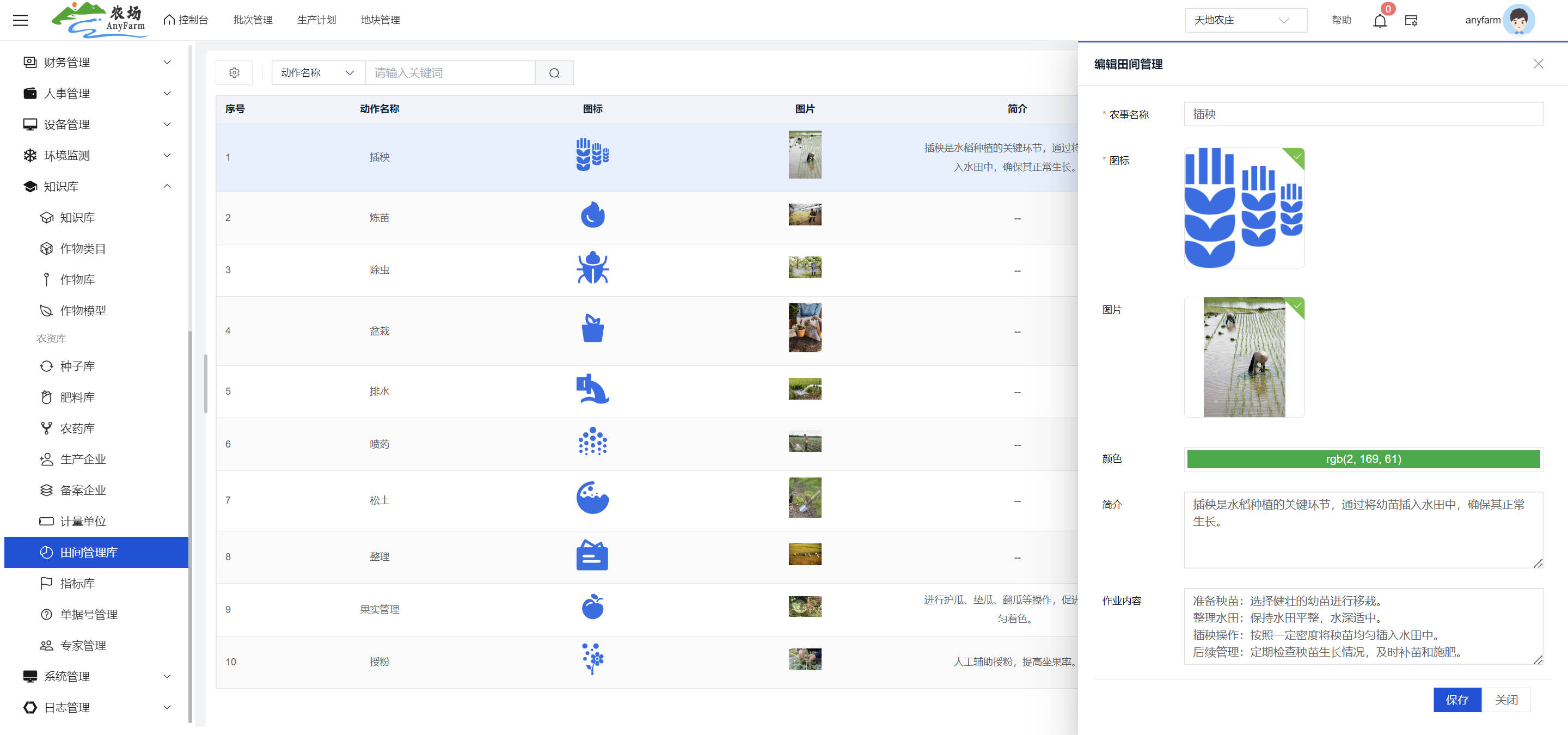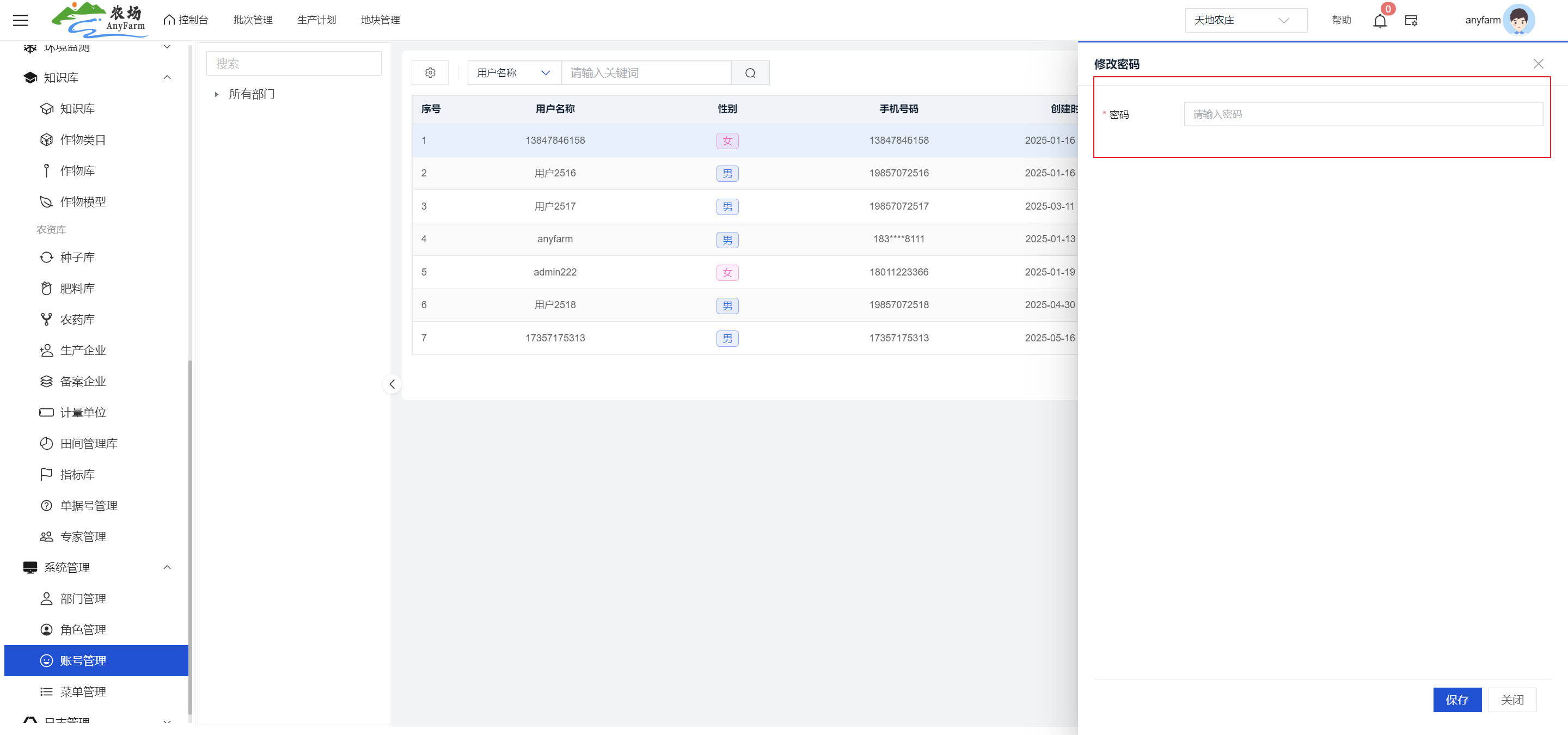 一、平台简介 AnyFarm农场管理平台是利用物联网、大数据、人工智能等现代信息技术,对农业生产进行全方位、全过程的智能化管理和控制。它通过传感器等设备,实时监测农田环境、作物生长、土壤墒情等信息,并通过数据分析和智能决策,实现精准灌溉、施肥、病虫害防治等操作,从而提高农业生产效率,降低资源消耗,保障农产品质量。 二、产品优势 1.全流程数据化管理,提升生产效率: * 优势: * 系统覆盖农场管理的各个环节,实现数据统一采集、存储和分析。 * 通过数据分析,优化生产计划,减少资源浪费,提高生产效率。 * 实时监测农场环境和生产状态,及时发现并解决问题。 * 体现: * 从农场基础信息录入,到生产计划制定,再到农产品溯源,全程数据化管理。 * 通过数据分析,实现精准施肥、精准灌溉等操作,提高资源利用率。 2. 智能化决策支持,降低生产风险: * 优势: * 利用机器学习模型,实现农产品质量预测、产量预测、病虫害预警等功能。 * 为农场管理者提供科学的决策依据,降低生产风险。 * 通过数据分析,预测市场行情,帮助农场及时调整生产策略。 * 体现: * 通过模型训练,预测农产品产量和质量,提前做好准备。 * 通过病虫害预警模型,及时发现并处理病虫害,减少损失。 3. 全程可追溯,保障农产品质量安全: * 优势: * 实现农产品从生产到销售的全程可追溯,保障产品质量安全。 * 消费者可以通过溯源码查询农产品生产信息,增强信任感。 * 提高农产品品牌价值,增强市场竞争力。 * 体现: * 记录农产品生产、加工、检测等信息,并与溯源码关联。 * 消费者可以通过手机扫描溯源码,了解农产品详细信息。 三、业务流程 流程说明: 1. 基础信息管理 * 农场管理: 对已添加的农场进行管理,包括信息修改、删除等操作。 * 员工管理: 录入和管理农场员工信息,包括姓名、工号、职位、联系方式等。 * 区域管理: 划分农场区域,如种植区、养殖区、办公区等,方便后续管理。 * 地块管理: 将农场区域进一步细分为地块,记录地块编号、面积、种植作物等信息。 * 设备管理: 录入和管理农场使用的各种设备,如灌溉设备、施肥设备、监测设备等。 * 计量单位: 设置系统中使用的计量单位,如面积单位、重量单位等。 * 指标库: 建立农产品质量、环境监测等相关指标库,为后续数据分析提供基础。 2. 生产管理 * 添加品种: 录入农场种植或养殖的品种信息,包括品种名称、特性、生长周期等。 * 品种管理: 对已添加的品种进行管理,包括信息修改、删除等操作。 * 添加农资: 录入农场使用的农资信息,如种子、肥料、农药等。 * 农资管理: 对已添加的农资进行管理,包括信息修改、删除等操作。 * 农资店: 如果农场有自己的农资店,则可以录入和管理农资店的信息。 * 农资出入库: 记录农资的出入库情况,实现农资库存管理。 * 生产计划: 制定农场的生产计划,包括种植或养殖时间、产量目标、农资使用计划等。 * 批次管理: 对农产品进行批次管理,记录批次信息、生产过程、质量检测等。 * 生产任务: 根据生产计划,生成具体的生产任务,分配给员工执行。 3. 溯源管理 * 采收管理: 记录农产品的采收情况,包括采收时间、产量、质量等。 * 加工管理: 如果农产品需要进行加工,则记录加工过程和相关信息。 * 检测记录: 记录农产品质量检测、环境监测等数据。 * 赋码管理: 对农产品进行赋码,实现产品溯源。 四、操作指南 4.1农场概况 界面功能概述: 该界面作为农场的首页及控制台界面,为用户呈现了农场的整体概况信息。在这里,用户能够清晰地查看到农场的数量、各个地块的数量、当前在职的员工人数、实时的天气状况等重要信息。同时,该界面还为用户提供了便捷的操作入口,例如可以进行农场的管理操作以及新增员工等常用功能,方便用户对农场的基本信息进行快速的了解和管理。  4.1.1.1 农场概况 界面功能概述: 用户可以点击标红的地方跳转到农场管理跳转到农场管理界面。  用户点击界面中标红的区域即可跳转到农场管理界面。在该界面中,用户可以全面了解农场的各项详细信息,如农场的占地面积、具体的种植区域划分、在职员工的数量及基本信息、各类设备的运行情况、今日和明日的农事安排等。这些信息的展示有助于用户对农场的整体运营状况有一个清晰的认识,同时也为后续的管理决策提供了有力的数据支持。此外,用户还可以在该界面进行一些基础的管理操作,如编辑农场的基本信息、调整设备的设置等,以确保农场的各项工作能够顺利进行。  4.1.1.2 农场农事 界面功能概述: 用户可以通过这里看到该农场的农事情况,例如施药、灌溉、施肥等常见的农事活动。  4.1.1.3 新增用户 界面元素功能概述: 该界面主要用于用户进行新增用户以及添加用户权限的操作。在农场的日常运营中,可能需要不断添加新的员工或管理人员,并为他们分配相应的权限,以便他们能够顺利地完成各自的工作任务。通过该界面,用户可以方便地完成这些操作,确保农场的人力资源管理更加高效和有序。  左侧搜索栏 :此搜索栏为用户提供了一个便捷的方式,允许用户在输入框内输入关键字,例如部门名称的关键词,从而快速搜索到特定的部门。这对于拥有多个部门的大型农场来说,能够大大提高用户查找部门的效率,节省时间。 顶部搜索栏:在这里,用户可以在输入框内