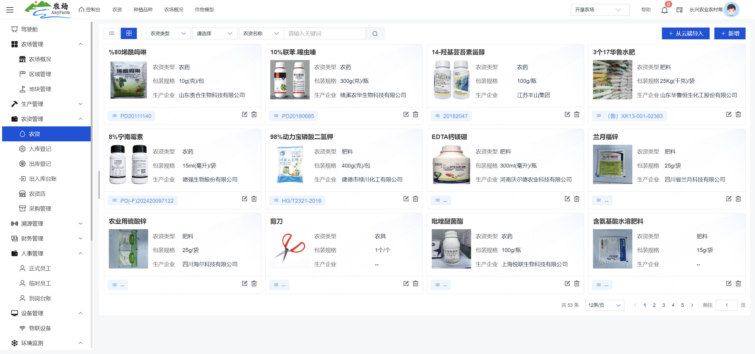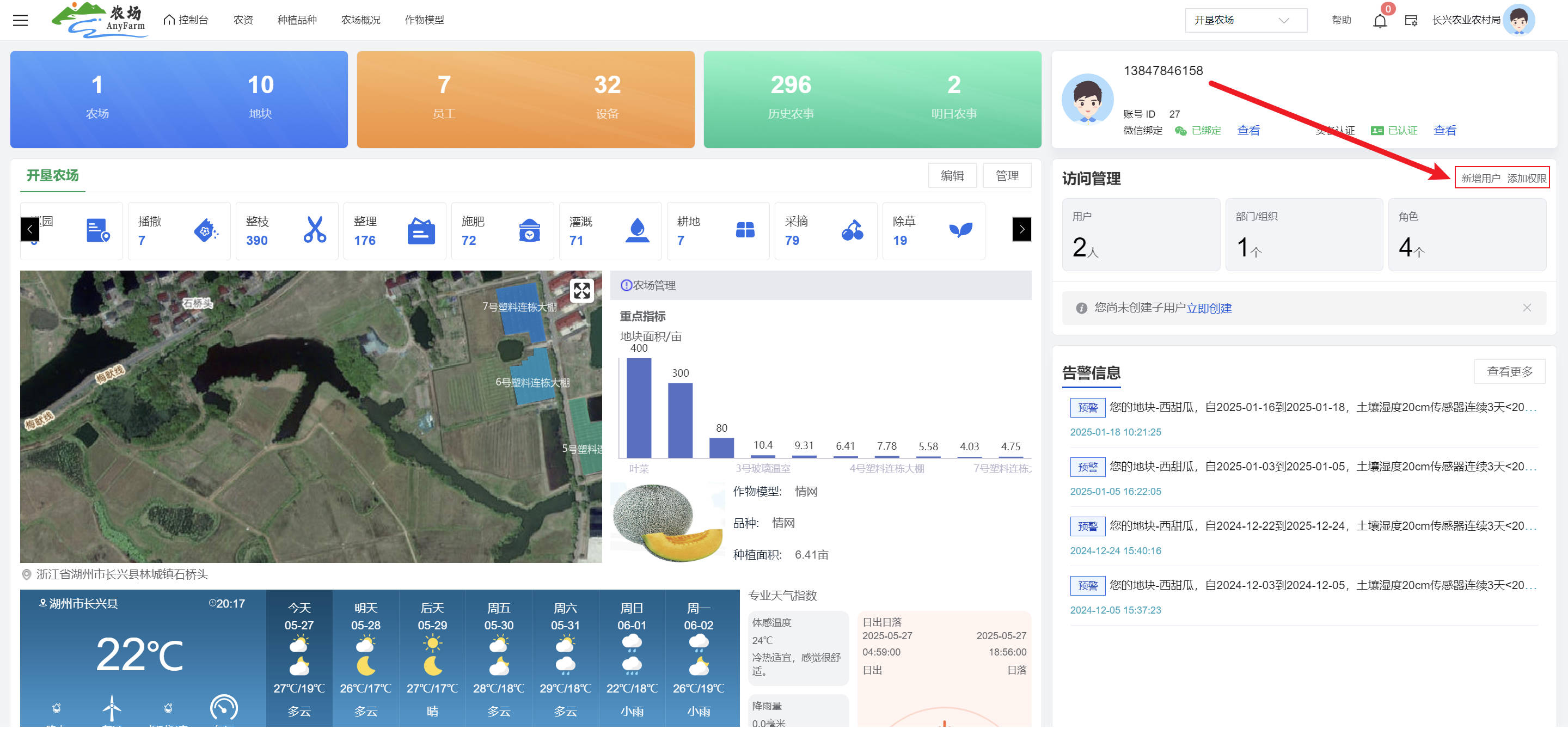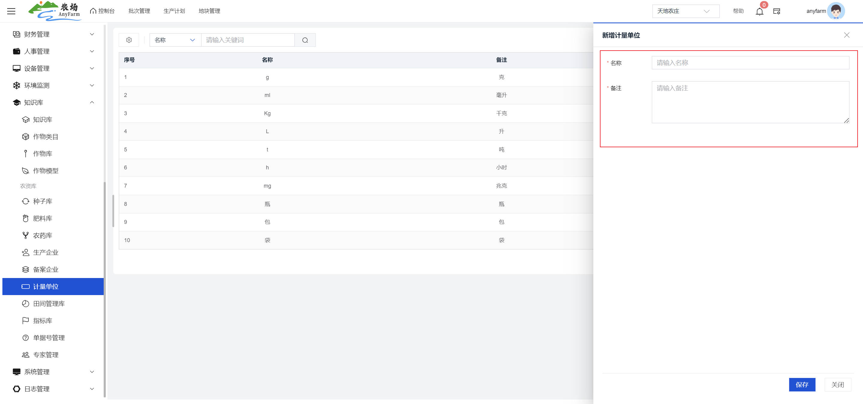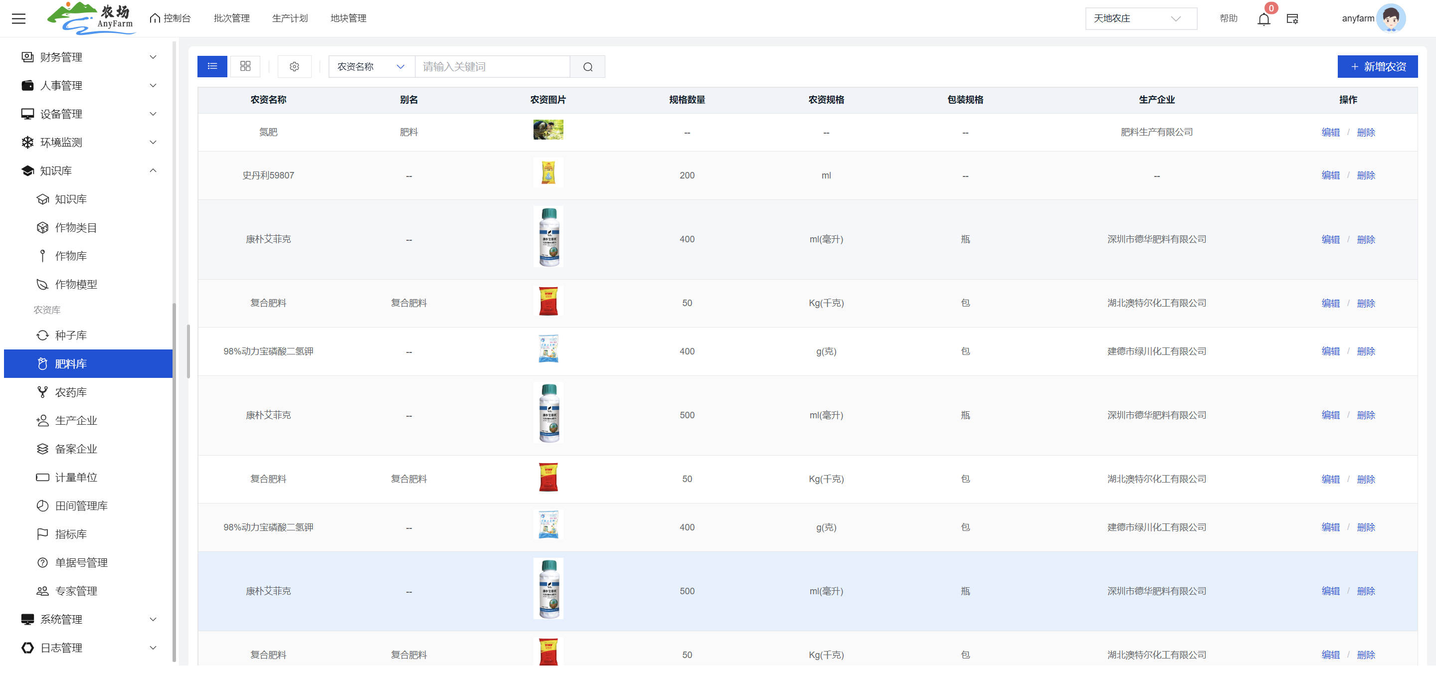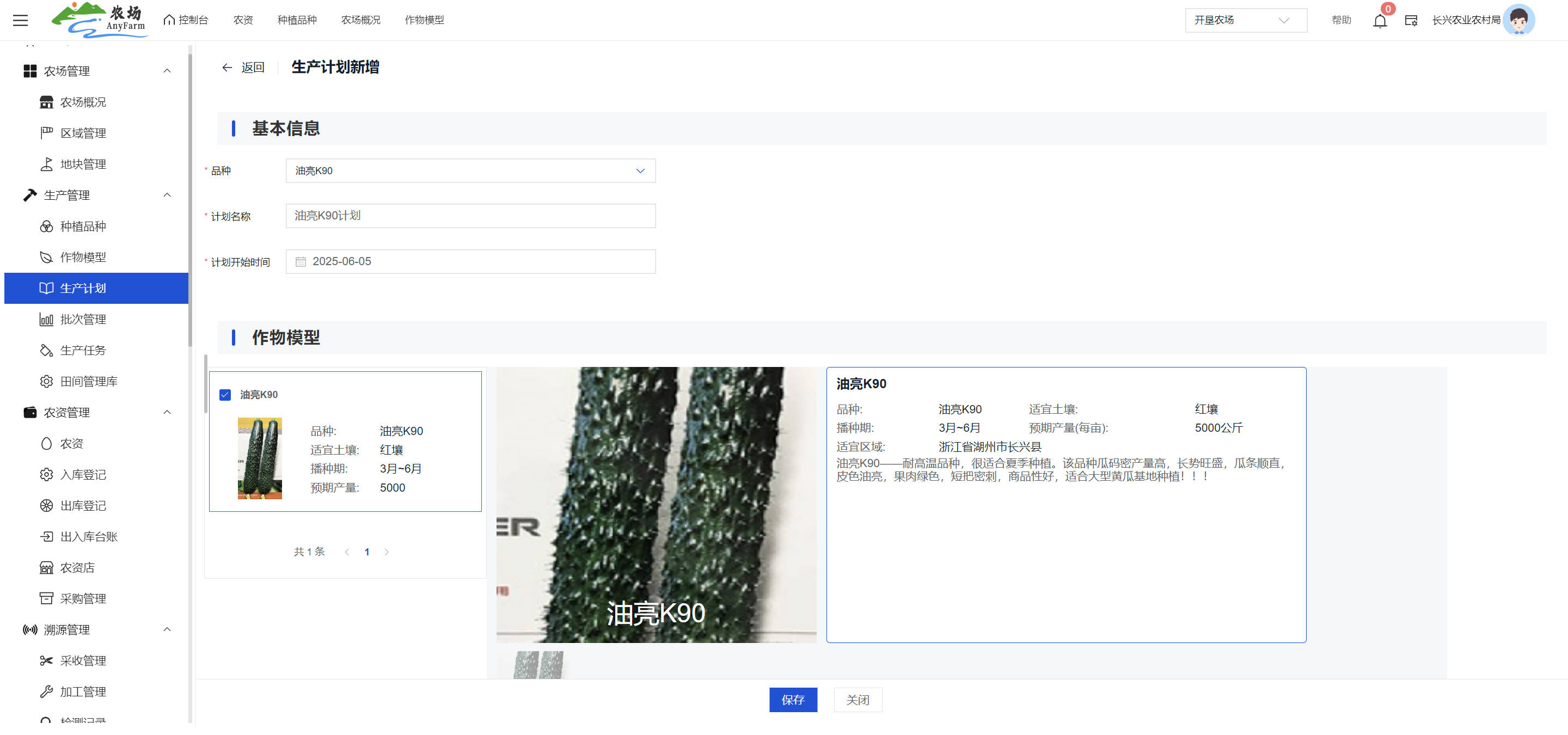 一、平台简介 AnyFarm农场管理平台是利用物联网、大数据、人工智能等现代信息技术,对农业生产进行全方位、全过程的智能化管理和控制。它通过传感器等设备,实时监测农田环境、作物生长、土壤墒情等信息,并通过数据分析和智能决策,实现精准灌溉、施肥、病虫害防治等操作,从而提高农业生产效率,降低资源消耗,保障农产品质量。 二、产品优势 1.全流程数据化管理,提升生产效率: * 优势: * 系统覆盖农场管理的各个环节,实现数据统一采集、存储和分析。 * 通过数据分析,优化生产计划,减少资源浪费,提高生产效率。 * 实时监测农场环境和生产状态,及时发现并解决问题。 * 体现: * 从农场基础信息录入,到生产计划制定,再到农产品溯源,全程数据化管理。 * 通过数据分析,实现精准施肥、精准灌溉等操作,提高资源利用率。 2. 智能化决策支持,降低生产风险: * 优势: * 利用机器学习模型,实现农产品质量预测、产量预测、病虫害预警等功能。 * 为农场管理者提供科学的决策依据,降低生产风险。 * 通过数据分析,预测市场行情,帮助农场及时调整生产策略。 * 体现: * 通过模型训练,预测农产品产量和质量,提前做好准备。 * 通过病虫害预警模型,及时发现并处理病虫害,减少损失。 3. 全程可追溯,保障农产品质量安全: * 优势: * 实现农产品从生产到销售的全程可追溯,保障产品质量安全。 * 消费者可以通过溯源码查询农产品生产信息,增强信任感。 * 提高农产品品牌价值,增强市场竞争力。 * 体现: * 记录农产品生产、加工、检测等信息,并与溯源码关联。 * 消费者可以通过手机扫描溯源码,了解农产品详细信息。 三、业务流程 流程说明: 1. 基础信息管理 * 农场管理: 对已添加的农场进行管理,包括信息修改、删除等操作。 * 员工管理: 录入和管理农场员工信息,包括姓名、工号、职位、联系方式等。 * 区域管理: 划分农场区域,如种植区、养殖区、办公区等,方便后续管理。 * 地块管理: 将农场区域进一步细分为地块,记录地块编号、面积、种植作物等信息。 * 设备管理: 录入和管理农场使用的各种设备,如灌溉设备、施肥设备、监测设备等。 * 计量单位: 设置系统中使用的计量单位,如面积单位、重量单位等。 * 指标库: 建立农产品质量、环境监测等相关指标库,为后续数据分析提供基础。 2. 生产管理 * 添加品种: 录入农场种植或养殖的品种信息,包括品种名称、特性、生长周期等。 * 品种管理: 对已添加的品种进行管理,包括信息修改、删除等操作。 * 添加农资: 录入农场使用的农资信息,如种子、肥料、农药等。 * 农资管理: 对已添加的农资进行管理,包括信息修改、删除等操作。 * 农资店: 如果农场有自己的农资店,则可以录入和管理农资店的信息。 * 农资出入库: 记录农资的出入库情况,实现农资库存管理。 * 生产计划: 制定农场的生产计划,包括种植或养殖时间、产量目标、农资使用计划等。 * 批次管理: 对农产品进行批次管理,记录批次信息、生产过程、质量检测等。 * 生产任务: 根据生产计划,生成具体的生产任务,分配给员工执行。 3. 溯源管理 * 采收管理: 记录农产品的采收情况,包括采收时间、产量、质量等。 * 加工管理: 如果农产品需要进行加工,则记录加工过程和相关信息。 * 检测记录: 记录农产品质量检测、环境监测等数据。 * 赋码管理: 对农产品进行赋码,实现产品溯源。 四、操作指南 4.1农场概况 界面功能概述: 该界面作为农场的首页及控制台界面,为用户呈现了农场的整体概况信息。在这里,用户能够清晰地查看到农场的数量、各个地块的数量、当前在职的员工人数、实时的天气状况等重要信息。同时,该界面还为用户提供了便捷的操作入口,例如可以进行农场的管理操作以及新增员工等常用功能,方便用户对农场的基本信息进行快速的了解和管理。  4.1.1.1 农场概况 界面功能概述: 用户可以点击标红的地方跳转到农场管理跳转到农场管理界面。  用户点击界面中标红的区域即可跳转到农场管理界面。在该界面中,用户可以全面了解农场的各项详细信息,如农场的占地面积、具体的种植区域划分、在职员工的数量及基本信息、各类设备的运行情况、今日和明日的农事安排等。这些信息的展示有助于用户对农场的整体运营状况有一个清晰的认识,同时也为后续的管理决策提供了有力的数据支持。此外,用户还可以在该界面进行一些基础的管理操作,如编辑农场的基本信息、调整设备的设置等,以确保农场的各项工作能够顺利进行。  4.1.1.2 农场农事 界面功能概述: 用户可以通过这里看到该农场的农事情况,例如施药、灌溉、施肥等常见的农事活动。  4.1.1.3 新增用户 界面元素功能概述: 该界面主要用于用户进行新增用户以及添加用户权限的操作。在农场的日常运营中,可能需要不断添加新的员工或管理人员,并为他们分配相应的权限,以便他们能够顺利地完成各自的工作任务。通过该界面,用户可以方便地完成这些操作,确保农场的人力资源管理更加高效和有序。  左侧搜索栏 :此搜索栏为用户提供了一个便捷的方式,允许用户在输入框内输入关键字,例如部门名称的关键词,从而快速搜索到特定的部门。这对于拥有多个部门的大型农场来说,能够大大提高用户查找部门的效率,节省时间。 顶部搜索栏:在这里,用户可以在输入框内