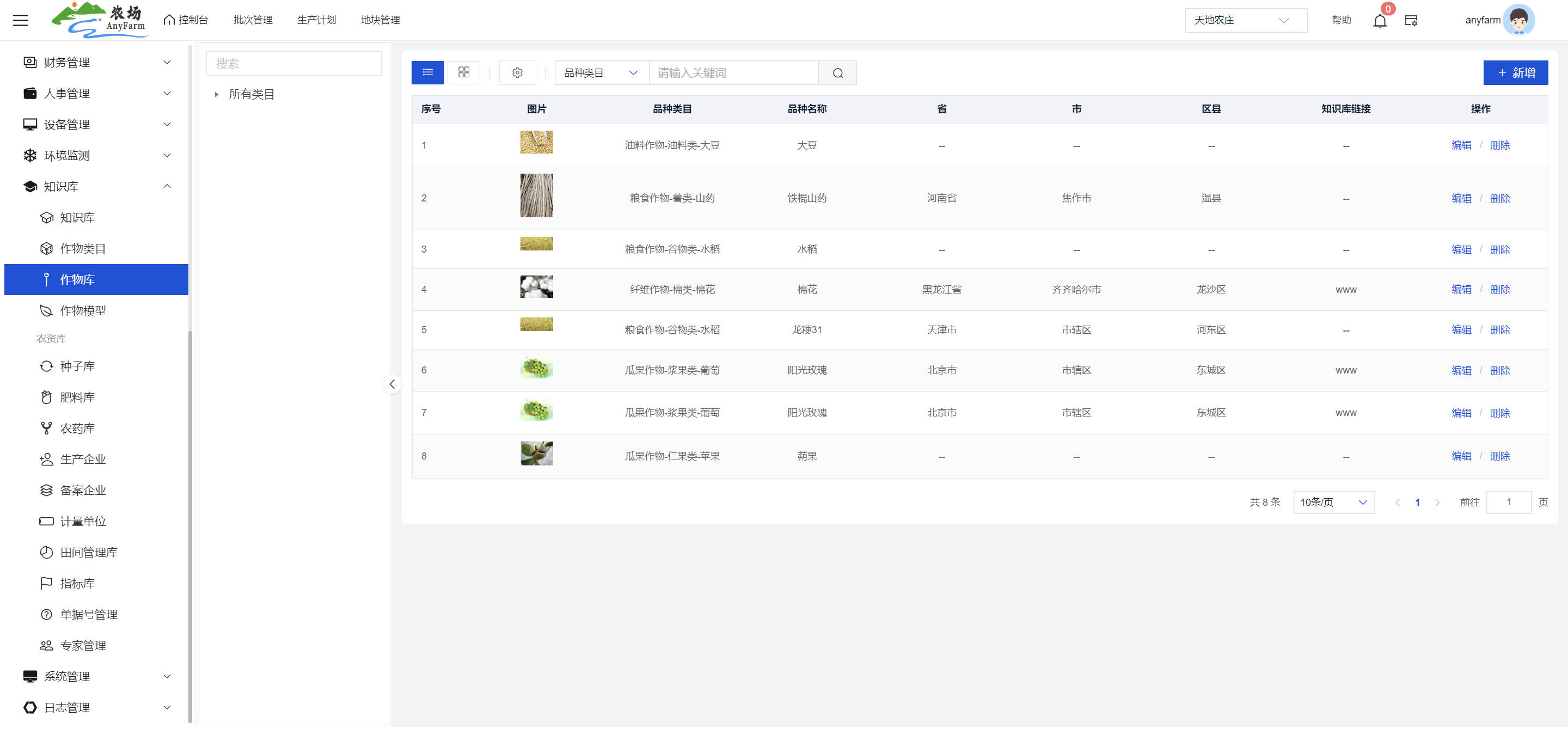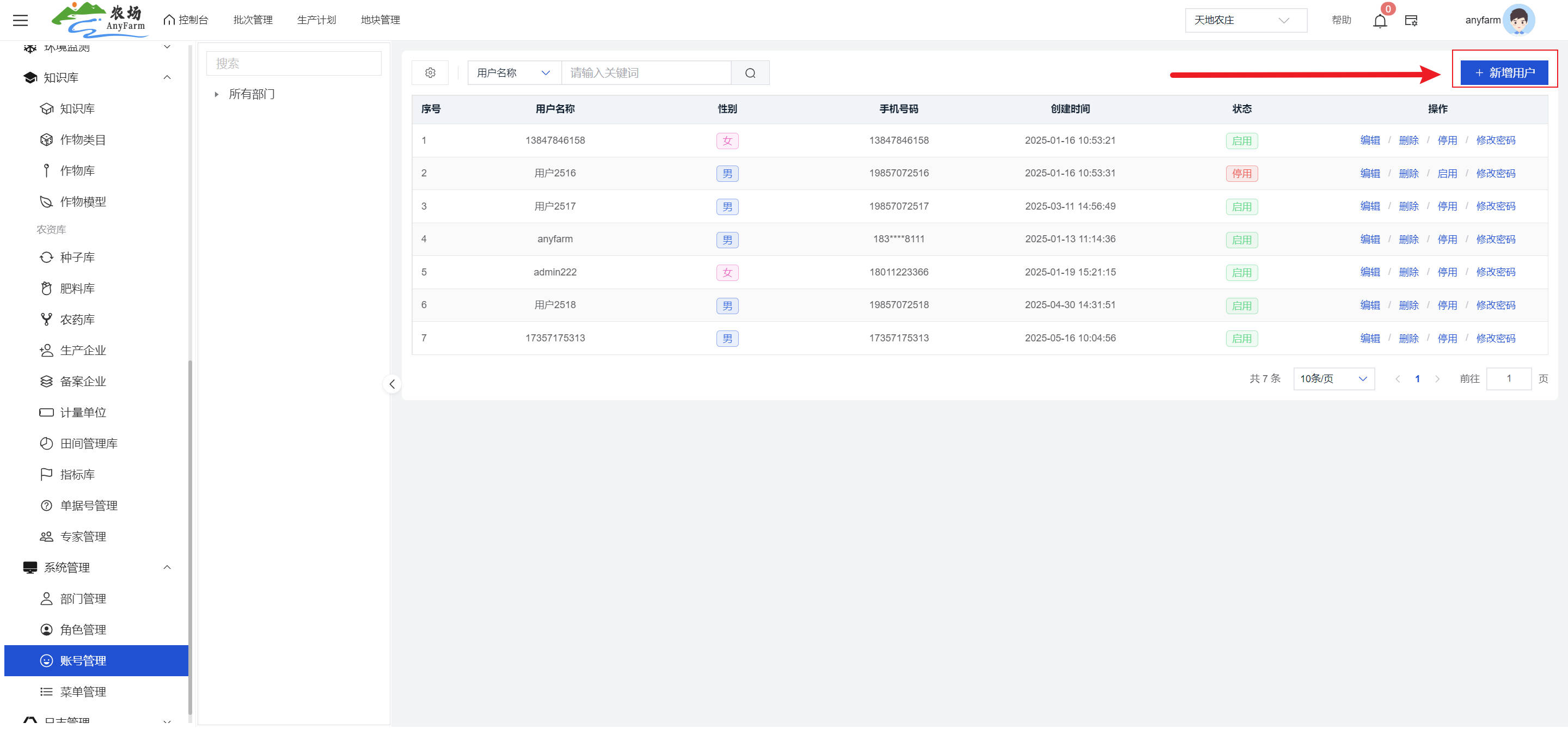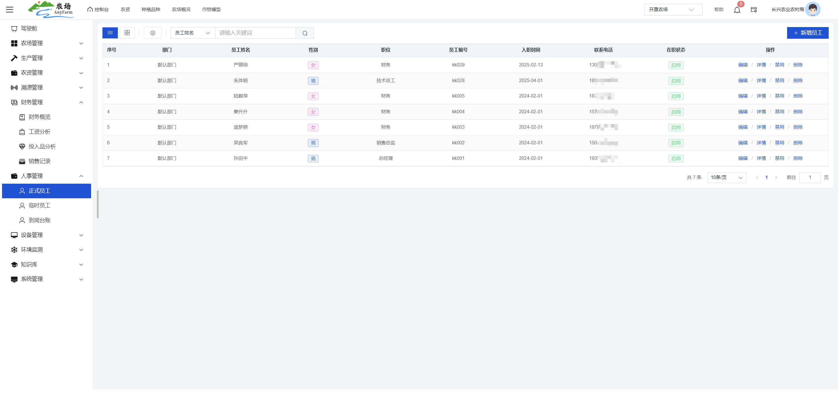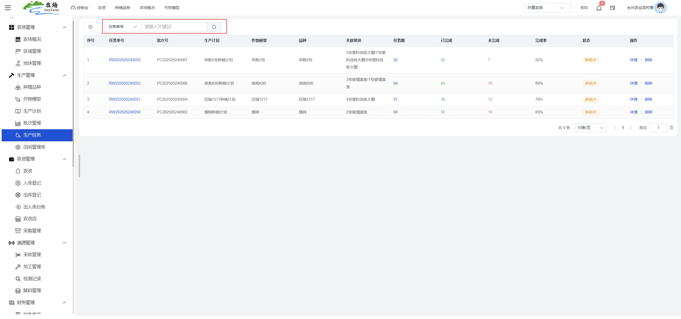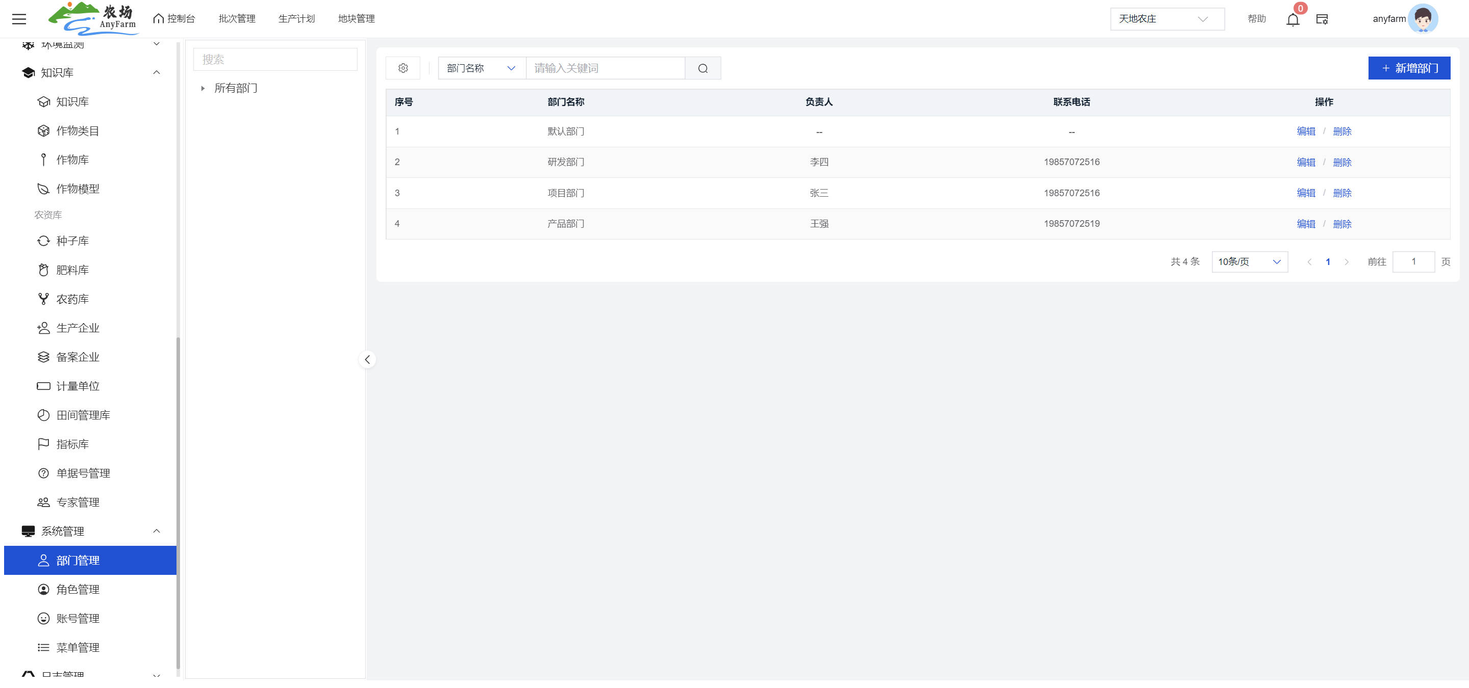 一、平台简介 AnyFarm农场管理平台是利用物联网、大数据、人工智能等现代信息技术,对农业生产进行全方位、全过程的智能化管理和控制。它通过传感器等设备,实时监测农田环境、作物生长、土壤墒情等信息,并通过数据分析和智能决策,实现精准灌溉、施肥、病虫害防治等操作,从而提高农业生产效率,降低资源消耗,保障农产品质量。 二、产品优势 1.全流程数据化管理,提升生产效率: * 优势: * 系统覆盖农场管理的各个环节,实现数据统一采集、存储和分析。 * 通过数据分析,优化生产计划,减少资源浪费,提高生产效率。 * 实时监测农场环境和生产状态,及时发现并解决问题。 * 体现: * 从农场基础信息录入,到生产计划制定,再到农产品溯源,全程数据化管理。 * 通过数据分析,实现精准施肥、精准灌溉等操作,提高资源利用率。 2. 智能化决策支持,降低生产风险: * 优势: * 利用机器学习模型,实现农产品质量预测、产量预测、病虫害预警等功能。 * 为农场管理者提供科学的决策依据,降低生产风险。 * 通过数据分析,预测市场行情,帮助农场及时调整生产策略。 * 体现: * 通过模型训练,预测农产品产量和质量,提前做好准备。 * 通过病虫害预警模型,及时发现并处理病虫害,减少损失。 3. 全程可追溯,保障农产品质量安全: * 优势: * 实现农产品从生产到销售的全程可追溯,保障产品质量安全。 * 消费者可以通过溯源码查询农产品生产信息,增强信任感。 * 提高农产品品牌价值,增强市场竞争力。 * 体现: * 记录农产品生产、加工、检测等信息,并与溯源码关联。 * 消费者可以通过手机扫描溯源码,了解农产品详细信息。 三、业务流程 流程说明: 1. 基础信息管理 * 农场管理: 对已添加的农场进行管理,包括信息修改、删除等操作。 * 员工管理: 录入和管理农场员工信息,包括姓名、工号、职位、联系方式等。 * 区域管理: 划分农场区域,如种植区、养殖区、办公区等,方便后续管理。 * 地块管理: 将农场区域进一步细分为地块,记录地块编号、面积、种植作物等信息。 * 设备管理: 录入和管理农场使用的各种设备,如灌溉设备、施肥设备、监测设备等。 * 计量单位: 设置系统中使用的计量单位,如面积单位、重量单位等。 * 指标库: 建立农产品质量、环境监测等相关指标库,为后续数据分析提供基础。 2. 生产管理 * 添加品种: 录入农场种植或养殖的品种信息,包括品种名称、特性、生长周期等。 * 品种管理: 对已添加的品种进行管理,包括信息修改、删除等操作。 * 添加农资: 录入农场使用的农资信息,如种子、肥料、农药等。 * 农资管理: 对已添加的农资进行管理,包括信息修改、删除等操作。 * 农资店: 如果农场有自己的农资店,则可以录入和管理农资店的信息。 * 农资出入库: 记录农资的出入库情况,实现农资库存管理。 * 生产计划: 制定农场的生产计划,包括种植或养殖时间、产量目标、农资使用计划等。 * 批次管理: 对农产品进行批次管理,记录批次信息、生产过程、质量检测等。 * 生产任务: 根据生产计划,生成具体的生产任务,分配给员工执行。 3. 溯源管理 * 采收管理: 记录农产品的采收情况,包括采收时间、产量、质量等。 * 加工管理: 如果农产品需要进行加工,则记录加工过程和相关信息。 * 检测记录: 记录农产品质量检测、环境监测等数据。 * 赋码管理: 对农产品进行赋码,实现产品溯源。 四、操作指南 4.1农场概况 界面功能概述: 该界面作为农场的首页及控制台界面,为用户呈现了农场的整体概况信息。在这里,用户能够清晰地查看到农场的数量、各个地块的数量、当前在职的员工人数、实时的天气状况等重要信息。同时,该界面还为用户提供了便捷的操作入口,例如可以进行农场的管理操作以及新增员工等常用功能,方便用户对农场的基本信息进行快速的了解和管理。  4.1.1.1 农场概况 界面功能概述: 用户可以点击标红的地方跳转到农场管理跳转到农场管理界面。  用户点击界面中标红的区域即可跳转到农场管理界面。在该界面中,用户可以全面了解农场的各项详细信息,如农场的占地面积、具体的种植区域划分、在职员工的数量及基本信息、各类设备的运行情况、今日和明日的农事安排等。这些信息的展示有助于用户对农场的整体运营状况有一个清晰的认识,同时也为后续的管理决策提供了有力的数据支持。此外,用户还可以在该界面进行一些基础的管理操作,如编辑农场的基本信息、调整设备的设置等,以确保农场的各项工作能够顺利进行。  4.1.1.2 农场农事 界面功能概述: 用户可以通过这里看到该农场的农事情况,例如施药、灌溉、施肥等常见的农事活动。  4.1.1.3 新增用户 界面元素功能概述: 该界面主要用于用户进行新增用户以及添加用户权限的操作。在农场的日常运营中,可能需要不断添加新的员工或管理人员,并为他们分配相应的权限,以便他们能够顺利地完成各自的工作任务。通过该界面,用户可以方便地完成这些操作,确保农场的人力资源管理更加高效和有序。  左侧搜索栏 :此搜索栏为用户提供了一个便捷的方式,允许用户在输入框内输入关键字,例如部门名称的关键词,从而快速搜索到特定的部门。这对于拥有多个部门的大型农场来说,能够大大提高用户查找部门的效率,节省时间。 顶部搜索栏:在这里,用户可以在输入框内