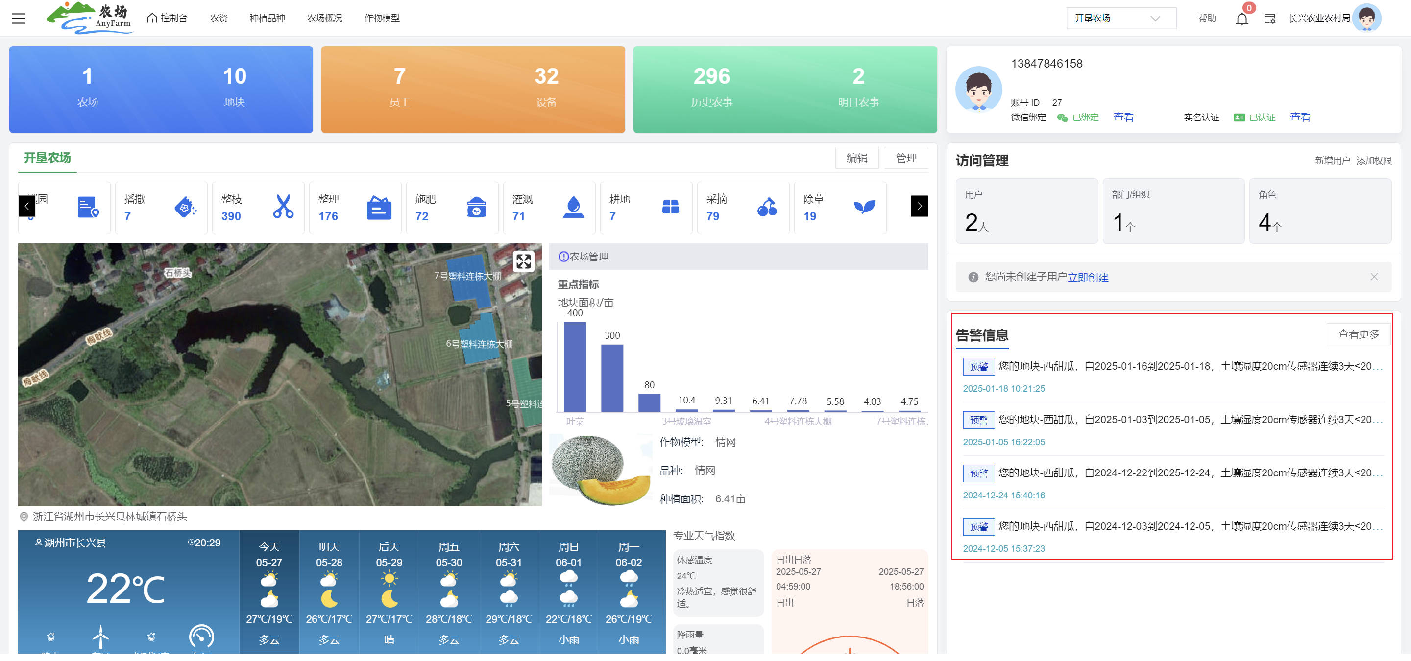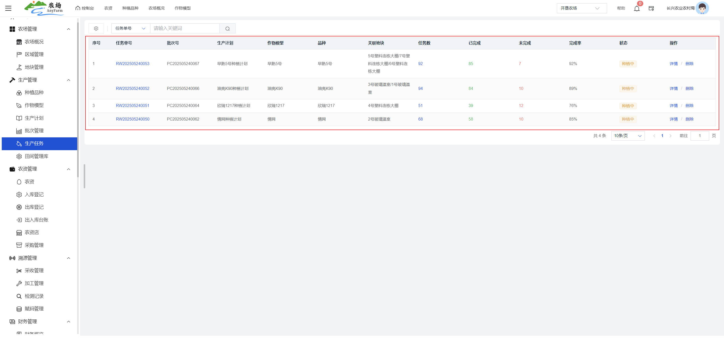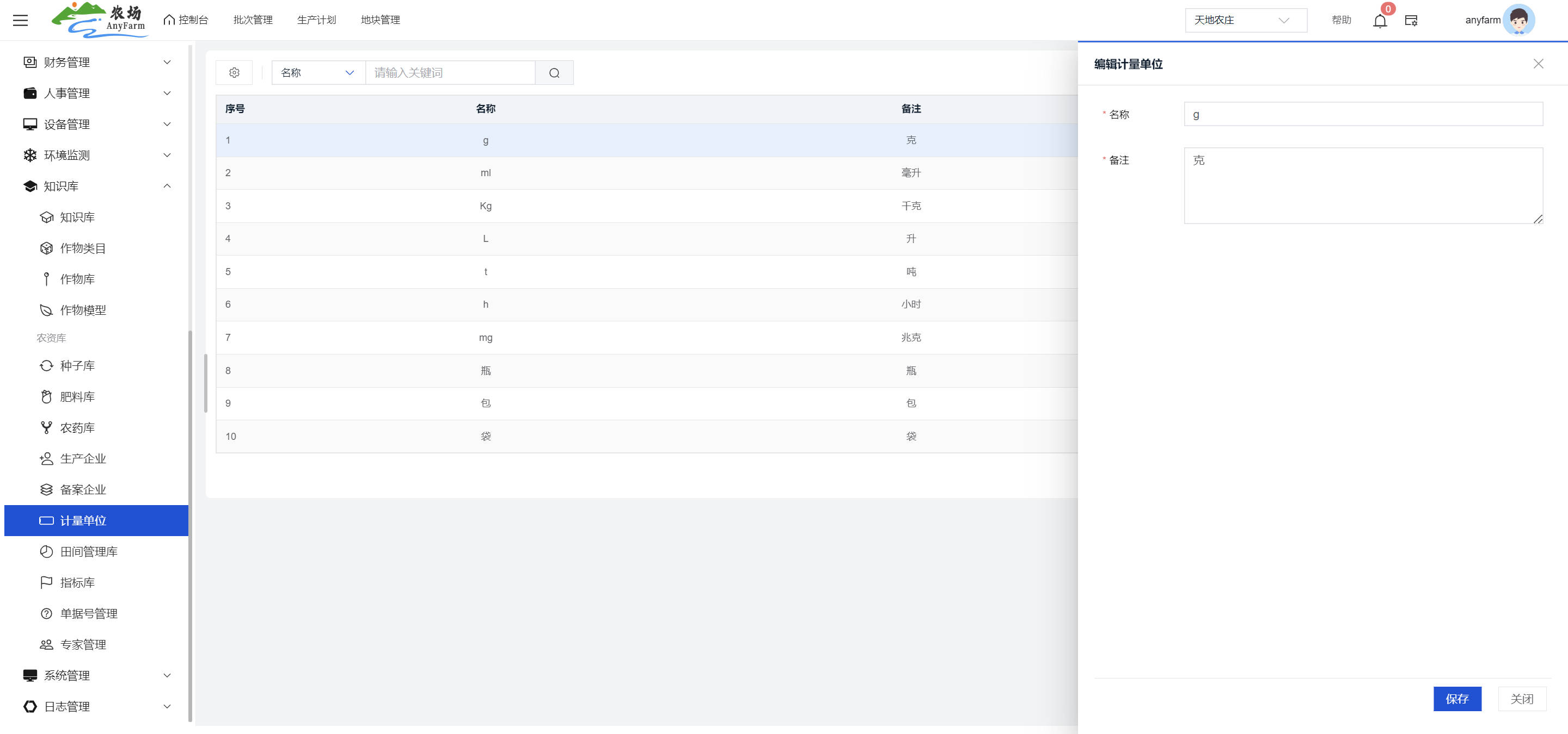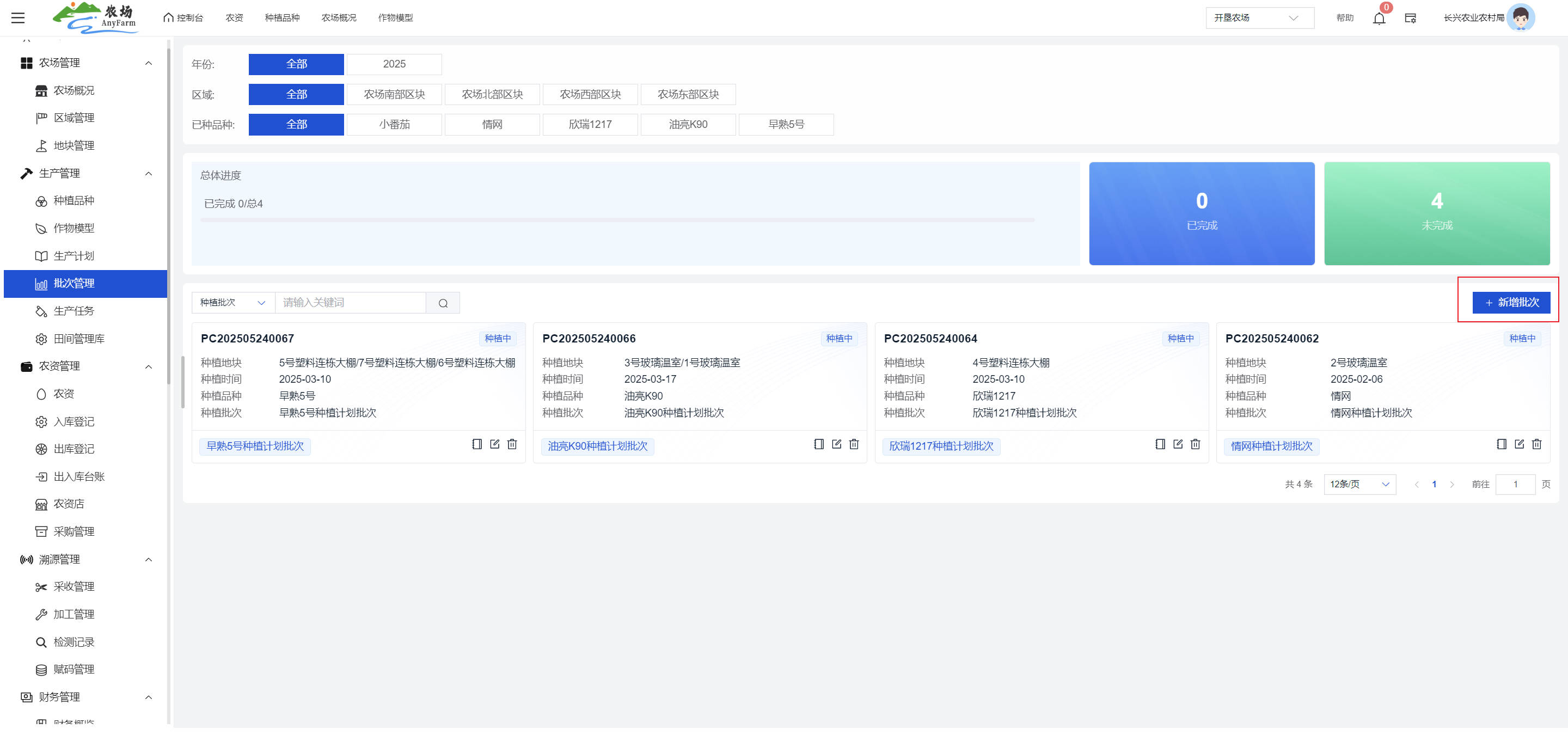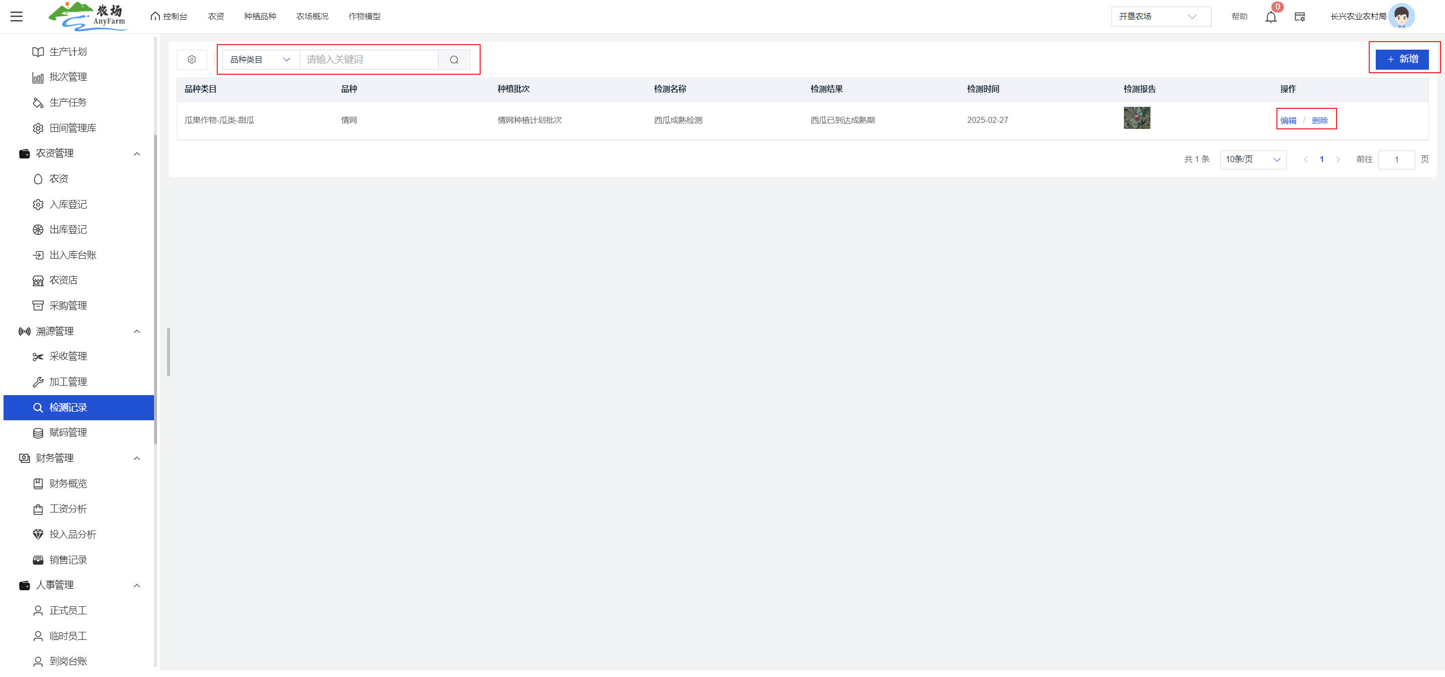 一、平台简介 AnyFarm农场管理平台是利用物联网、大数据、人工智能等现代信息技术,对农业生产进行全方位、全过程的智能化管理和控制。它通过传感器等设备,实时监测农田环境、作物生长、土壤墒情等信息,并通过数据分析和智能决策,实现精准灌溉、施肥、病虫害防治等操作,从而提高农业生产效率,降低资源消耗,保障农产品质量。 二、产品优势 1.全流程数据化管理,提升生产效率: * 优势: * 系统覆盖农场管理的各个环节,实现数据统一采集、存储和分析。 * 通过数据分析,优化生产计划,减少资源浪费,提高生产效率。 * 实时监测农场环境和生产状态,及时发现并解决问题。 * 体现: * 从农场基础信息录入,到生产计划制定,再到农产品溯源,全程数据化管理。 * 通过数据分析,实现精准施肥、精准灌溉等操作,提高资源利用率。 2. 智能化决策支持,降低生产风险: * 优势: * 利用机器学习模型,实现农产品质量预测、产量预测、病虫害预警等功能。 * 为农场管理者提供科学的决策依据,降低生产风险。 * 通过数据分析,预测市场行情,帮助农场及时调整生产策略。 * 体现: * 通过模型训练,预测农产品产量和质量,提前做好准备。 * 通过病虫害预警模型,及时发现并处理病虫害,减少损失。 3. 全程可追溯,保障农产品质量安全: * 优势: * 实现农产品从生产到销售的全程可追溯,保障产品质量安全。 * 消费者可以通过溯源码查询农产品生产信息,增强信任感。 * 提高农产品品牌价值,增强市场竞争力。 * 体现: * 记录农产品生产、加工、检测等信息,并与溯源码关联。 * 消费者可以通过手机扫描溯源码,了解农产品详细信息。 三、业务流程 流程说明: 1. 基础信息管理 * 农场管理: 对已添加的农场进行管理,包括信息修改、删除等操作。 * 员工管理: 录入和管理农场员工信息,包括姓名、工号、职位、联系方式等。 * 区域管理: 划分农场区域,如种植区、养殖区、办公区等,方便后续管理。 * 地块管理: 将农场区域进一步细分为地块,记录地块编号、面积、种植作物等信息。 * 设备管理: 录入和管理农场使用的各种设备,如灌溉设备、施肥设备、监测设备等。 * 计量单位: 设置系统中使用的计量单位,如面积单位、重量单位等。 * 指标库: 建立农产品质量、环境监测等相关指标库,为后续数据分析提供基础。 2. 生产管理 * 添加品种: 录入农场种植或养殖的品种信息,包括品种名称、特性、生长周期等。 * 品种管理: 对已添加的品种进行管理,包括信息修改、删除等操作。 * 添加农资: 录入农场使用的农资信息,如种子、肥料、农药等。 * 农资管理: 对已添加的农资进行管理,包括信息修改、删除等操作。 * 农资店: 如果农场有自己的农资店,则可以录入和管理农资店的信息。 * 农资出入库: 记录农资的出入库情况,实现农资库存管理。 * 生产计划: 制定农场的生产计划,包括种植或养殖时间、产量目标、农资使用计划等。 * 批次管理: 对农产品进行批次管理,记录批次信息、生产过程、质量检测等。 * 生产任务: 根据生产计划,生成具体的生产任务,分配给员工执行。 3. 溯源管理 * 采收管理: 记录农产品的采收情况,包括采收时间、产量、质量等。 * 加工管理: 如果农产品需要进行加工,则记录加工过程和相关信息。 * 检测记录: 记录农产品质量检测、环境监测等数据。 * 赋码管理: 对农产品进行赋码,实现产品溯源。 四、操作指南 4.1农场概况 界面功能概述: 该界面作为农场的首页及控制台界面,为用户呈现了农场的整体概况信息。在这里,用户能够清晰地查看到农场的数量、各个地块的数量、当前在职的员工人数、实时的天气状况等重要信息。同时,该界面还为用户提供了便捷的操作入口,例如可以进行农场的管理操作以及新增员工等常用功能,方便用户对农场的基本信息进行快速的了解和管理。  4.1.1.1 农场概况 界面功能概述: 用户可以点击标红的地方跳转到农场管理跳转到农场管理界面。  用户点击界面中标红的区域即可跳转到农场管理界面。在该界面中,用户可以全面了解农场的各项详细信息,如农场的占地面积、具体的种植区域划分、在职员工的数量及基本信息、各类设备的运行情况、今日和明日的农事安排等。这些信息的展示有助于用户对农场的整体运营状况有一个清晰的认识,同时也为后续的管理决策提供了有力的数据支持。此外,用户还可以在该界面进行一些基础的管理操作,如编辑农场的基本信息、调整设备的设置等,以确保农场的各项工作能够顺利进行。  4.1.1.2 农场农事 界面功能概述: 用户可以通过这里看到该农场的农事情况,例如施药、灌溉、施肥等常见的农事活动。  4.1.1.3 新增用户 界面元素功能概述: 该界面主要用于用户进行新增用户以及添加用户权限的操作。在农场的日常运营中,可能需要不断添加新的员工或管理人员,并为他们分配相应的权限,以便他们能够顺利地完成各自的工作任务。通过该界面,用户可以方便地完成这些操作,确保农场的人力资源管理更加高效和有序。  左侧搜索栏 :此搜索栏为用户提供了一个便捷的方式,允许用户在输入框内输入关键字,例如部门名称的关键词,从而快速搜索到特定的部门。这对于拥有多个部门的大型农场来说,能够大大提高用户查找部门的效率,节省时间。 顶部搜索栏:在这里,用户可以在输入框内