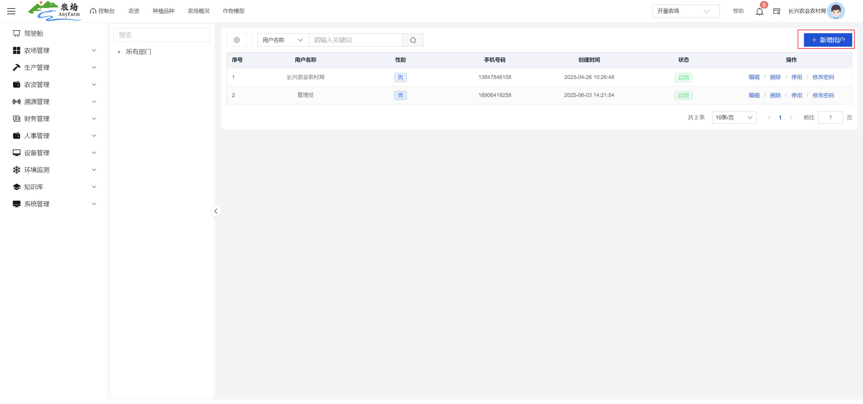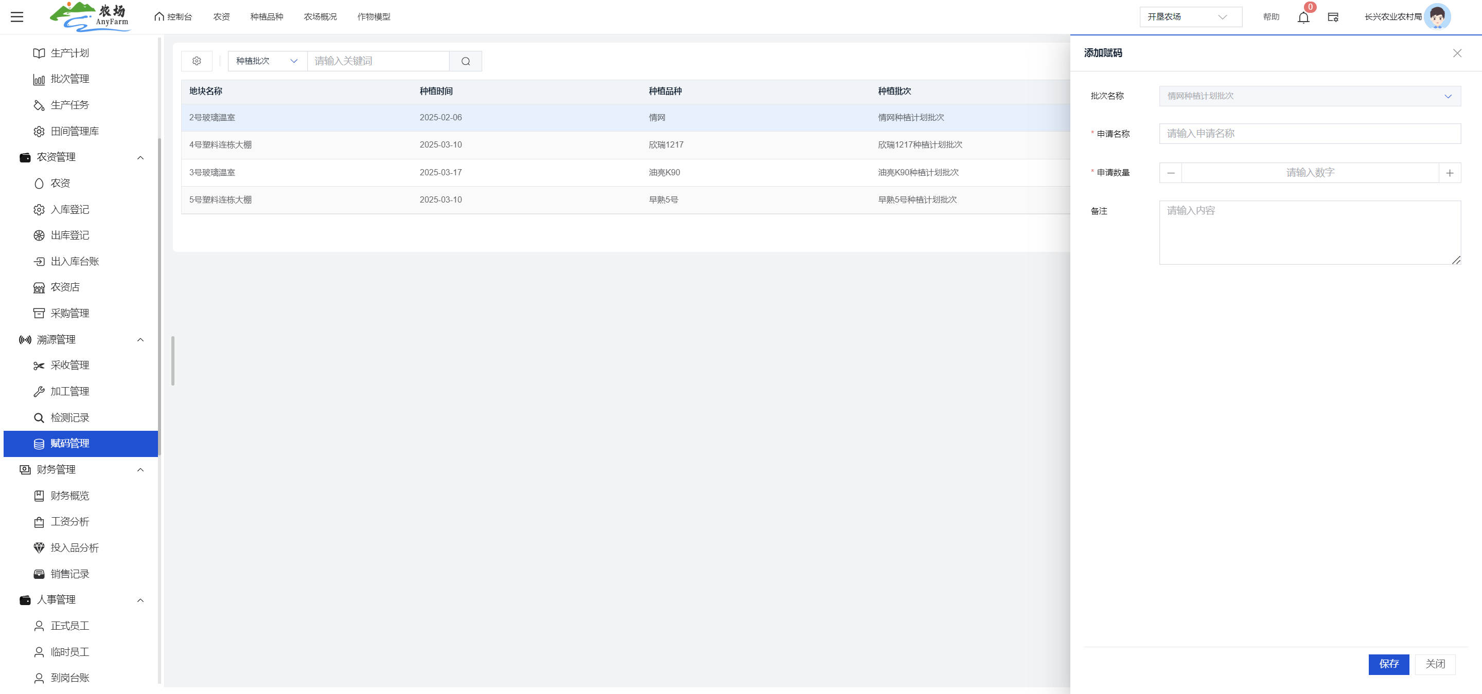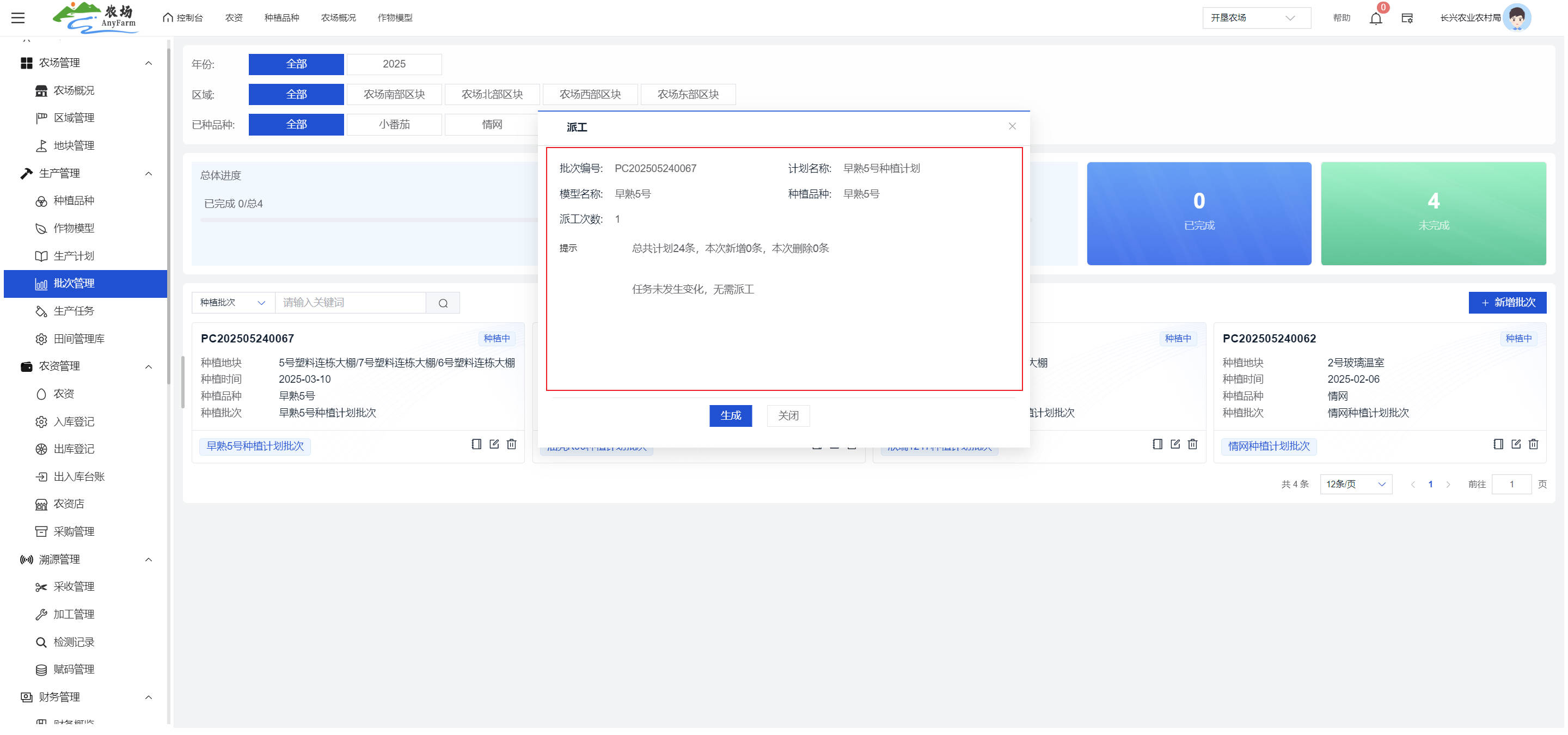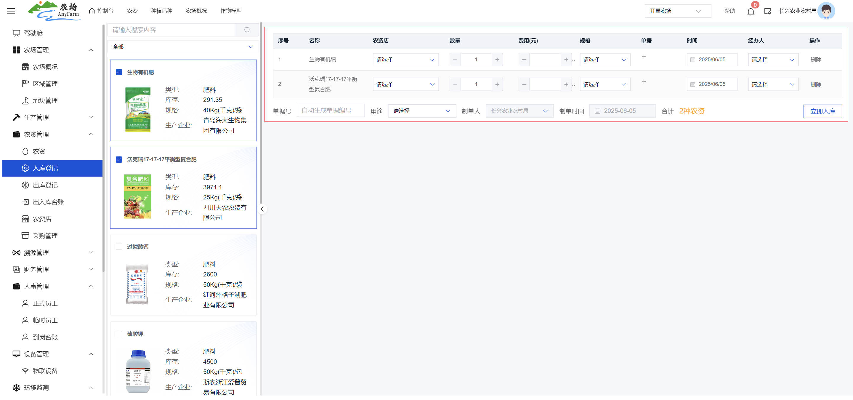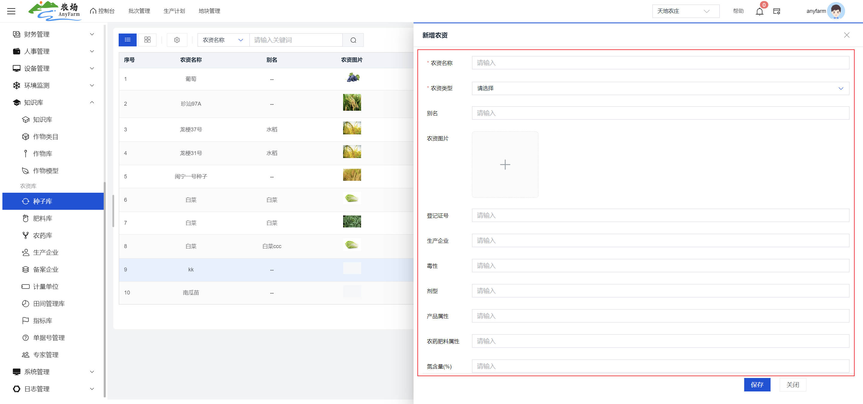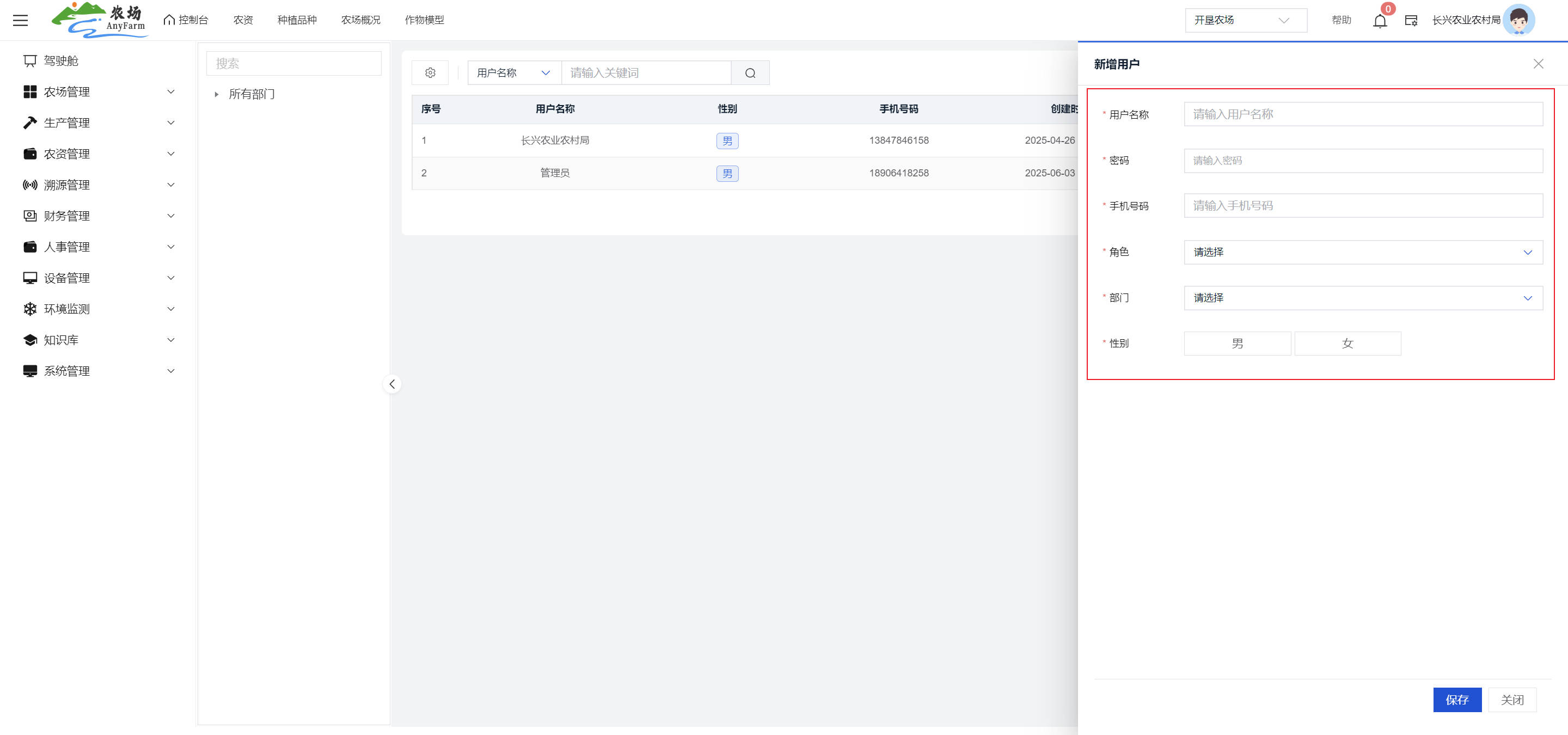 一、平台简介 AnyFarm农场管理平台是利用物联网、大数据、人工智能等现代信息技术,对农业生产进行全方位、全过程的智能化管理和控制。它通过传感器等设备,实时监测农田环境、作物生长、土壤墒情等信息,并通过数据分析和智能决策,实现精准灌溉、施肥、病虫害防治等操作,从而提高农业生产效率,降低资源消耗,保障农产品质量。 二、产品优势 1.全流程数据化管理,提升生产效率: * 优势: * 系统覆盖农场管理的各个环节,实现数据统一采集、存储和分析。 * 通过数据分析,优化生产计划,减少资源浪费,提高生产效率。 * 实时监测农场环境和生产状态,及时发现并解决问题。 * 体现: * 从农场基础信息录入,到生产计划制定,再到农产品溯源,全程数据化管理。 * 通过数据分析,实现精准施肥、精准灌溉等操作,提高资源利用率。 2. 智能化决策支持,降低生产风险: * 优势: * 利用机器学习模型,实现农产品质量预测、产量预测、病虫害预警等功能。 * 为农场管理者提供科学的决策依据,降低生产风险。 * 通过数据分析,预测市场行情,帮助农场及时调整生产策略。 * 体现: * 通过模型训练,预测农产品产量和质量,提前做好准备。 * 通过病虫害预警模型,及时发现并处理病虫害,减少损失。 3. 全程可追溯,保障农产品质量安全: * 优势: * 实现农产品从生产到销售的全程可追溯,保障产品质量安全。 * 消费者可以通过溯源码查询农产品生产信息,增强信任感。 * 提高农产品品牌价值,增强市场竞争力。 * 体现: * 记录农产品生产、加工、检测等信息,并与溯源码关联。 * 消费者可以通过手机扫描溯源码,了解农产品详细信息。 三、业务流程 流程说明: 1. 基础信息管理 * 农场管理: 对已添加的农场进行管理,包括信息修改、删除等操作。 * 员工管理: 录入和管理农场员工信息,包括姓名、工号、职位、联系方式等。 * 区域管理: 划分农场区域,如种植区、养殖区、办公区等,方便后续管理。 * 地块管理: 将农场区域进一步细分为地块,记录地块编号、面积、种植作物等信息。 * 设备管理: 录入和管理农场使用的各种设备,如灌溉设备、施肥设备、监测设备等。 * 计量单位: 设置系统中使用的计量单位,如面积单位、重量单位等。 * 指标库: 建立农产品质量、环境监测等相关指标库,为后续数据分析提供基础。 2. 生产管理 * 添加品种: 录入农场种植或养殖的品种信息,包括品种名称、特性、生长周期等。 * 品种管理: 对已添加的品种进行管理,包括信息修改、删除等操作。 * 添加农资: 录入农场使用的农资信息,如种子、肥料、农药等。 * 农资管理: 对已添加的农资进行管理,包括信息修改、删除等操作。 * 农资店: 如果农场有自己的农资店,则可以录入和管理农资店的信息。 * 农资出入库: 记录农资的出入库情况,实现农资库存管理。 * 生产计划: 制定农场的生产计划,包括种植或养殖时间、产量目标、农资使用计划等。 * 批次管理: 对农产品进行批次管理,记录批次信息、生产过程、质量检测等。 * 生产任务: 根据生产计划,生成具体的生产任务,分配给员工执行。 3. 溯源管理 * 采收管理: 记录农产品的采收情况,包括采收时间、产量、质量等。 * 加工管理: 如果农产品需要进行加工,则记录加工过程和相关信息。 * 检测记录: 记录农产品质量检测、环境监测等数据。 * 赋码管理: 对农产品进行赋码,实现产品溯源。 四、操作指南 4.1农场概况 界面功能概述: 该界面作为农场的首页及控制台界面,为用户呈现了农场的整体概况信息。在这里,用户能够清晰地查看到农场的数量、各个地块的数量、当前在职的员工人数、实时的天气状况等重要信息。同时,该界面还为用户提供了便捷的操作入口,例如可以进行农场的管理操作以及新增员工等常用功能,方便用户对农场的基本信息进行快速的了解和管理。  4.1.1.1 农场概况 界面功能概述: 用户可以点击标红的地方跳转到农场管理跳转到农场管理界面。  用户点击界面中标红的区域即可跳转到农场管理界面。在该界面中,用户可以全面了解农场的各项详细信息,如农场的占地面积、具体的种植区域划分、在职员工的数量及基本信息、各类设备的运行情况、今日和明日的农事安排等。这些信息的展示有助于用户对农场的整体运营状况有一个清晰的认识,同时也为后续的管理决策提供了有力的数据支持。此外,用户还可以在该界面进行一些基础的管理操作,如编辑农场的基本信息、调整设备的设置等,以确保农场的各项工作能够顺利进行。  4.1.1.2 农场农事 界面功能概述: 用户可以通过这里看到该农场的农事情况,例如施药、灌溉、施肥等常见的农事活动。  4.1.1.3 新增用户 界面元素功能概述: 该界面主要用于用户进行新增用户以及添加用户权限的操作。在农场的日常运营中,可能需要不断添加新的员工或管理人员,并为他们分配相应的权限,以便他们能够顺利地完成各自的工作任务。通过该界面,用户可以方便地完成这些操作,确保农场的人力资源管理更加高效和有序。  左侧搜索栏 :此搜索栏为用户提供了一个便捷的方式,允许用户在输入框内输入关键字,例如部门名称的关键词,从而快速搜索到特定的部门。这对于拥有多个部门的大型农场来说,能够大大提高用户查找部门的效率,节省时间。 顶部搜索栏:在这里,用户可以在输入框内