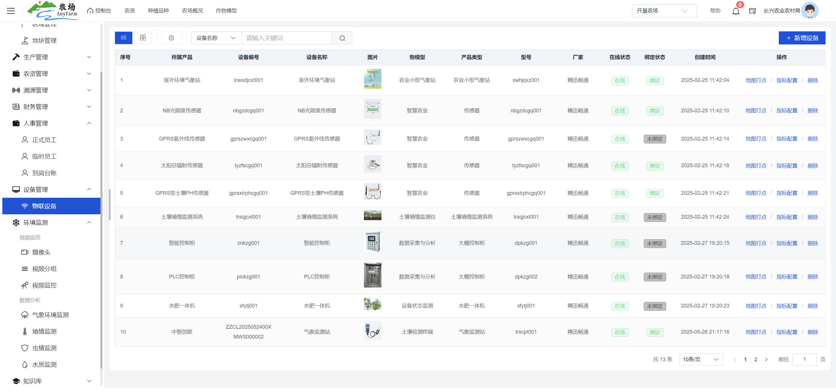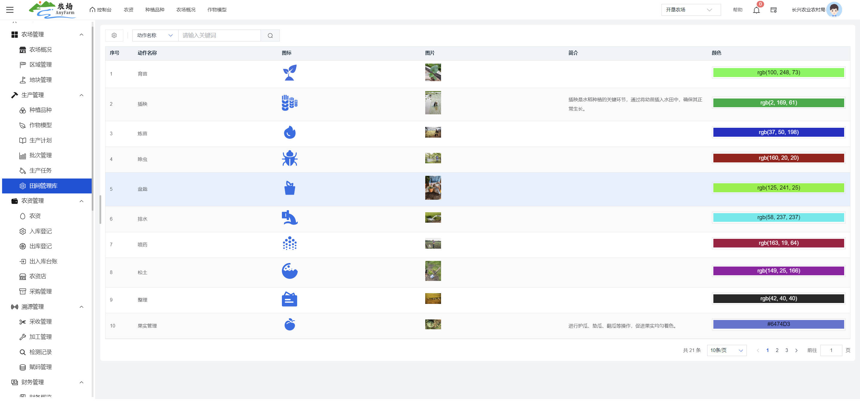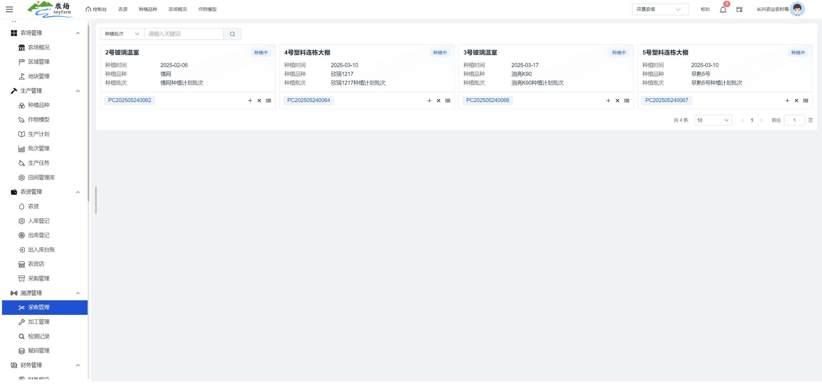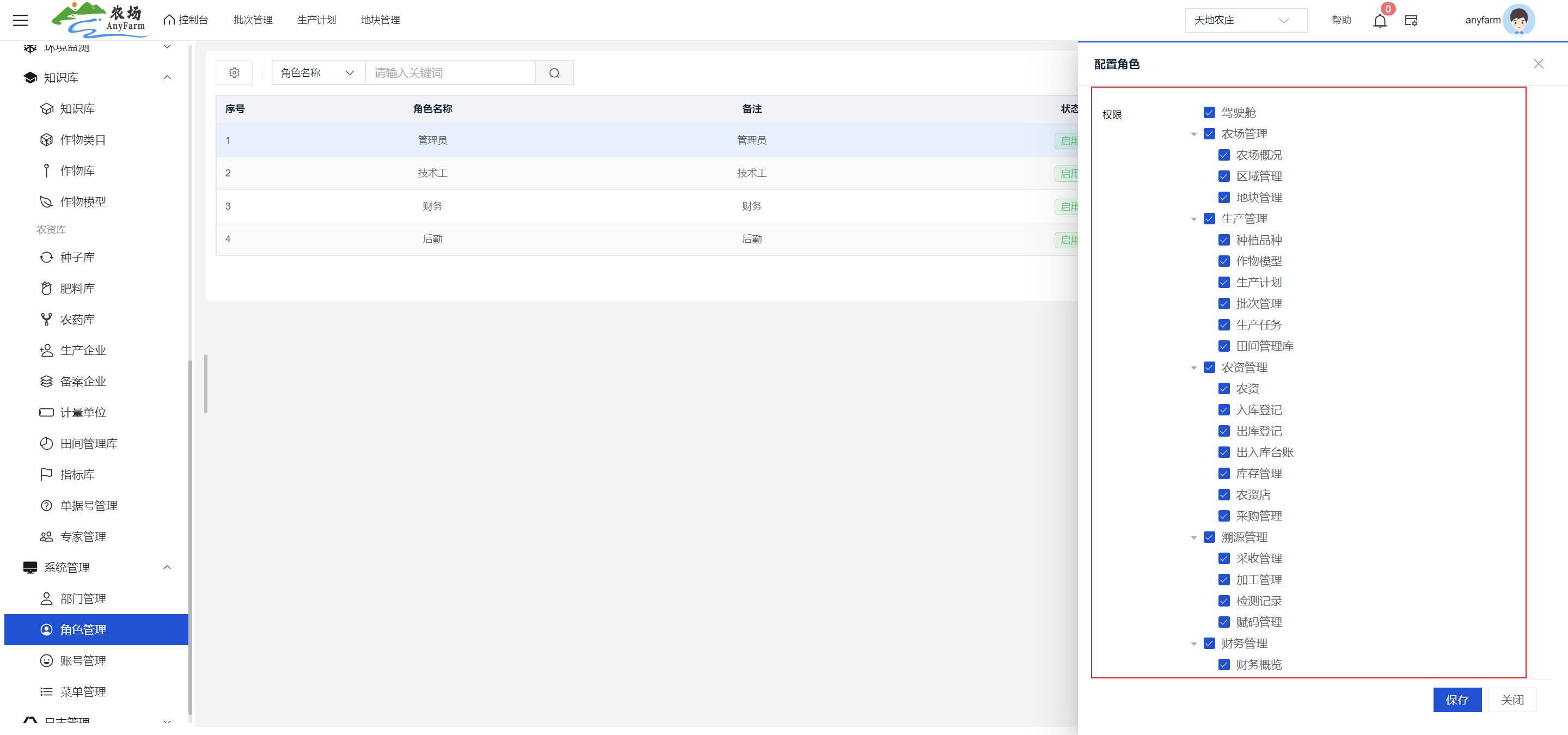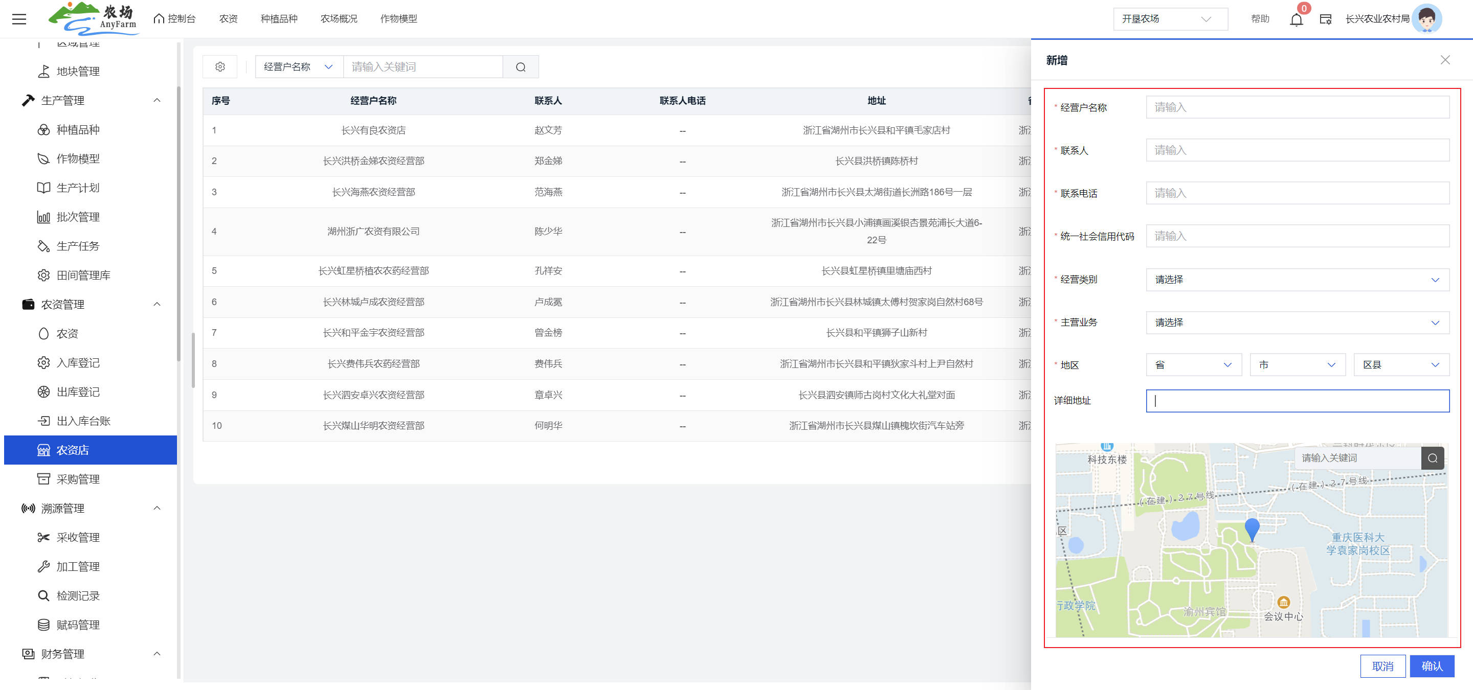 一、平台简介 AnyFarm农场管理平台是利用物联网、大数据、人工智能等现代信息技术,对农业生产进行全方位、全过程的智能化管理和控制。它通过传感器等设备,实时监测农田环境、作物生长、土壤墒情等信息,并通过数据分析和智能决策,实现精准灌溉、施肥、病虫害防治等操作,从而提高农业生产效率,降低资源消耗,保障农产品质量。 二、产品优势 1.全流程数据化管理,提升生产效率: * 优势: * 系统覆盖农场管理的各个环节,实现数据统一采集、存储和分析。 * 通过数据分析,优化生产计划,减少资源浪费,提高生产效率。 * 实时监测农场环境和生产状态,及时发现并解决问题。 * 体现: * 从农场基础信息录入,到生产计划制定,再到农产品溯源,全程数据化管理。 * 通过数据分析,实现精准施肥、精准灌溉等操作,提高资源利用率。 2. 智能化决策支持,降低生产风险: * 优势: * 利用机器学习模型,实现农产品质量预测、产量预测、病虫害预警等功能。 * 为农场管理者提供科学的决策依据,降低生产风险。 * 通过数据分析,预测市场行情,帮助农场及时调整生产策略。 * 体现: * 通过模型训练,预测农产品产量和质量,提前做好准备。 * 通过病虫害预警模型,及时发现并处理病虫害,减少损失。 3. 全程可追溯,保障农产品质量安全: * 优势: * 实现农产品从生产到销售的全程可追溯,保障产品质量安全。 * 消费者可以通过溯源码查询农产品生产信息,增强信任感。 * 提高农产品品牌价值,增强市场竞争力。 * 体现: * 记录农产品生产、加工、检测等信息,并与溯源码关联。 * 消费者可以通过手机扫描溯源码,了解农产品详细信息。 三、业务流程 流程说明: 1. 基础信息管理 * 农场管理: 对已添加的农场进行管理,包括信息修改、删除等操作。 * 员工管理: 录入和管理农场员工信息,包括姓名、工号、职位、联系方式等。 * 区域管理: 划分农场区域,如种植区、养殖区、办公区等,方便后续管理。 * 地块管理: 将农场区域进一步细分为地块,记录地块编号、面积、种植作物等信息。 * 设备管理: 录入和管理农场使用的各种设备,如灌溉设备、施肥设备、监测设备等。 * 计量单位: 设置系统中使用的计量单位,如面积单位、重量单位等。 * 指标库: 建立农产品质量、环境监测等相关指标库,为后续数据分析提供基础。 2. 生产管理 * 添加品种: 录入农场种植或养殖的品种信息,包括品种名称、特性、生长周期等。 * 品种管理: 对已添加的品种进行管理,包括信息修改、删除等操作。 * 添加农资: 录入农场使用的农资信息,如种子、肥料、农药等。 * 农资管理: 对已添加的农资进行管理,包括信息修改、删除等操作。 * 农资店: 如果农场有自己的农资店,则可以录入和管理农资店的信息。 * 农资出入库: 记录农资的出入库情况,实现农资库存管理。 * 生产计划: 制定农场的生产计划,包括种植或养殖时间、产量目标、农资使用计划等。 * 批次管理: 对农产品进行批次管理,记录批次信息、生产过程、质量检测等。 * 生产任务: 根据生产计划,生成具体的生产任务,分配给员工执行。 3. 溯源管理 * 采收管理: 记录农产品的采收情况,包括采收时间、产量、质量等。 * 加工管理: 如果农产品需要进行加工,则记录加工过程和相关信息。 * 检测记录: 记录农产品质量检测、环境监测等数据。 * 赋码管理: 对农产品进行赋码,实现产品溯源。 四、操作指南 4.1农场概况 界面功能概述: 该界面作为农场的首页及控制台界面,为用户呈现了农场的整体概况信息。在这里,用户能够清晰地查看到农场的数量、各个地块的数量、当前在职的员工人数、实时的天气状况等重要信息。同时,该界面还为用户提供了便捷的操作入口,例如可以进行农场的管理操作以及新增员工等常用功能,方便用户对农场的基本信息进行快速的了解和管理。  4.1.1.1 农场概况 界面功能概述: 用户可以点击标红的地方跳转到农场管理跳转到农场管理界面。  用户点击界面中标红的区域即可跳转到农场管理界面。在该界面中,用户可以全面了解农场的各项详细信息,如农场的占地面积、具体的种植区域划分、在职员工的数量及基本信息、各类设备的运行情况、今日和明日的农事安排等。这些信息的展示有助于用户对农场的整体运营状况有一个清晰的认识,同时也为后续的管理决策提供了有力的数据支持。此外,用户还可以在该界面进行一些基础的管理操作,如编辑农场的基本信息、调整设备的设置等,以确保农场的各项工作能够顺利进行。  4.1.1.2 农场农事 界面功能概述: 用户可以通过这里看到该农场的农事情况,例如施药、灌溉、施肥等常见的农事活动。  4.1.1.3 新增用户 界面元素功能概述: 该界面主要用于用户进行新增用户以及添加用户权限的操作。在农场的日常运营中,可能需要不断添加新的员工或管理人员,并为他们分配相应的权限,以便他们能够顺利地完成各自的工作任务。通过该界面,用户可以方便地完成这些操作,确保农场的人力资源管理更加高效和有序。  左侧搜索栏 :此搜索栏为用户提供了一个便捷的方式,允许用户在输入框内输入关键字,例如部门名称的关键词,从而快速搜索到特定的部门。这对于拥有多个部门的大型农场来说,能够大大提高用户查找部门的效率,节省时间。 顶部搜索栏:在这里,用户可以在输入框内