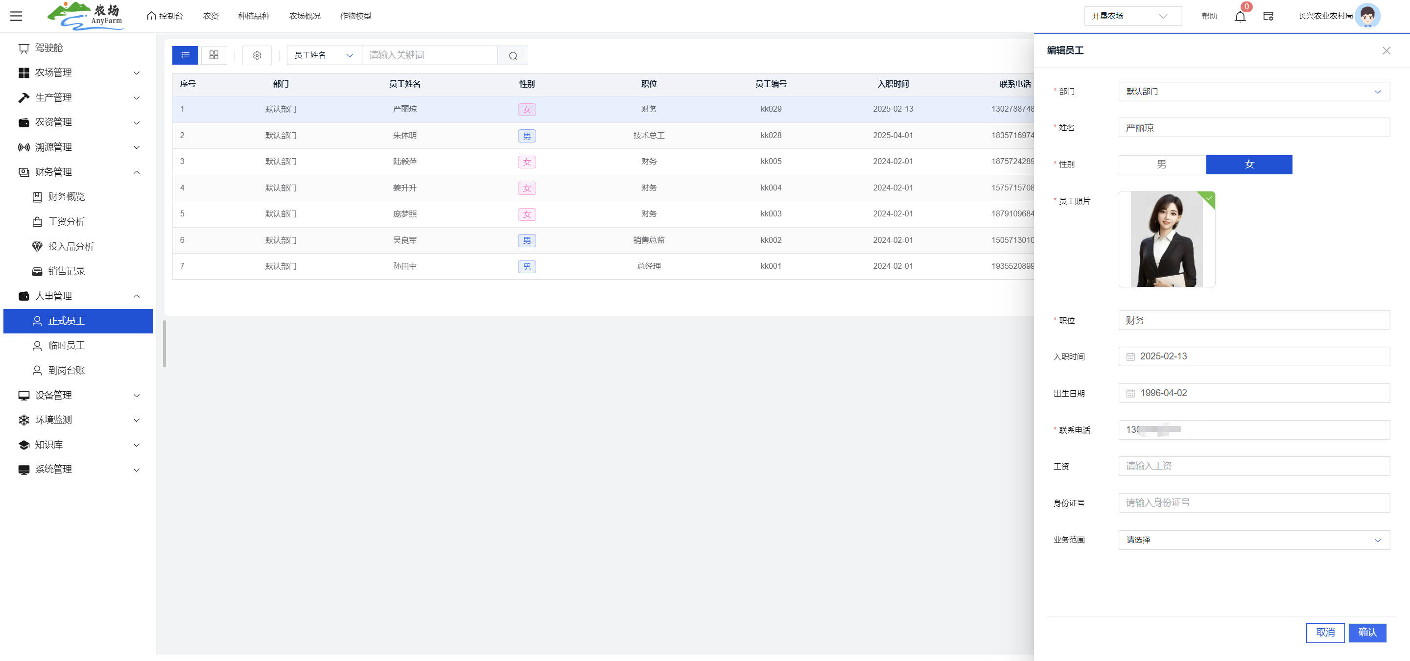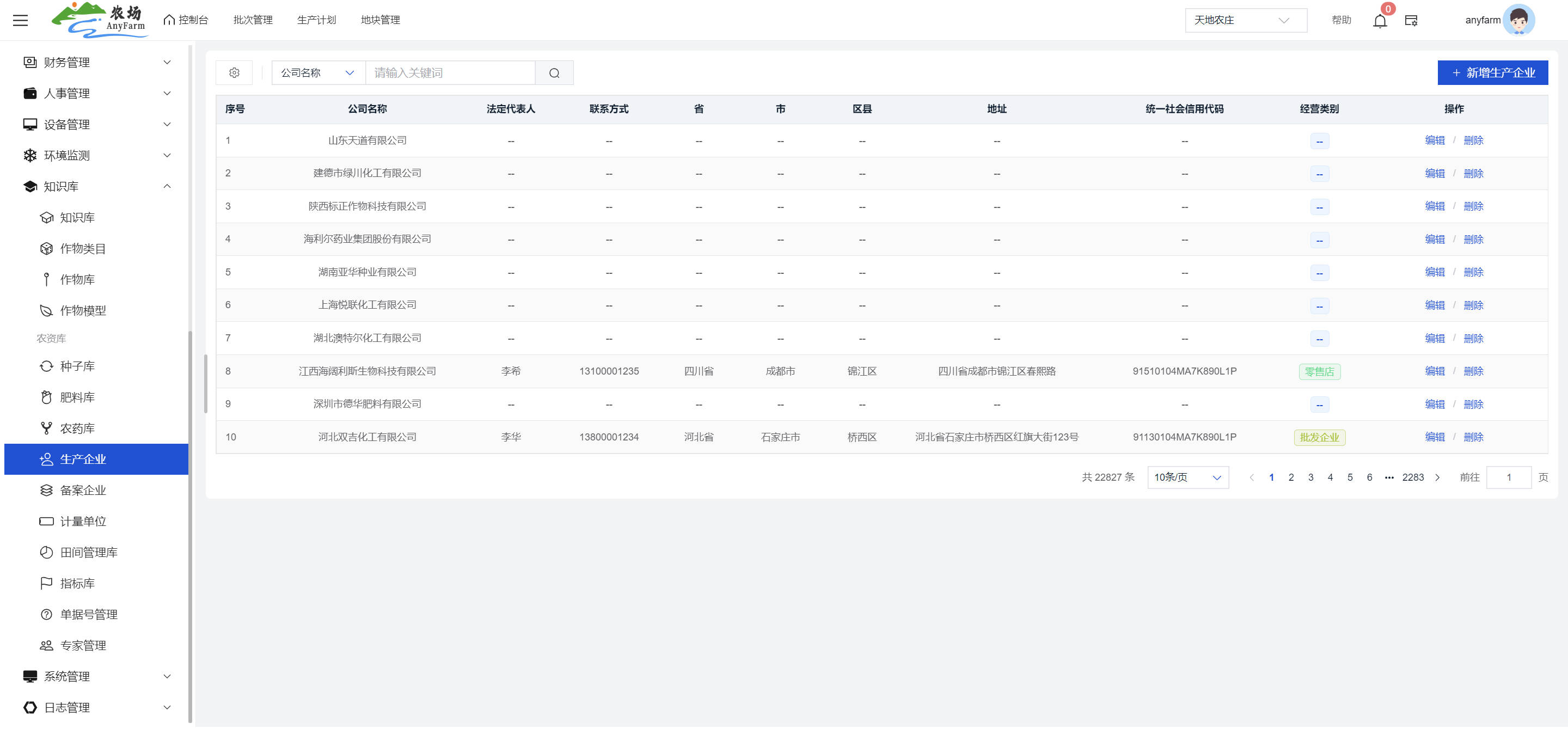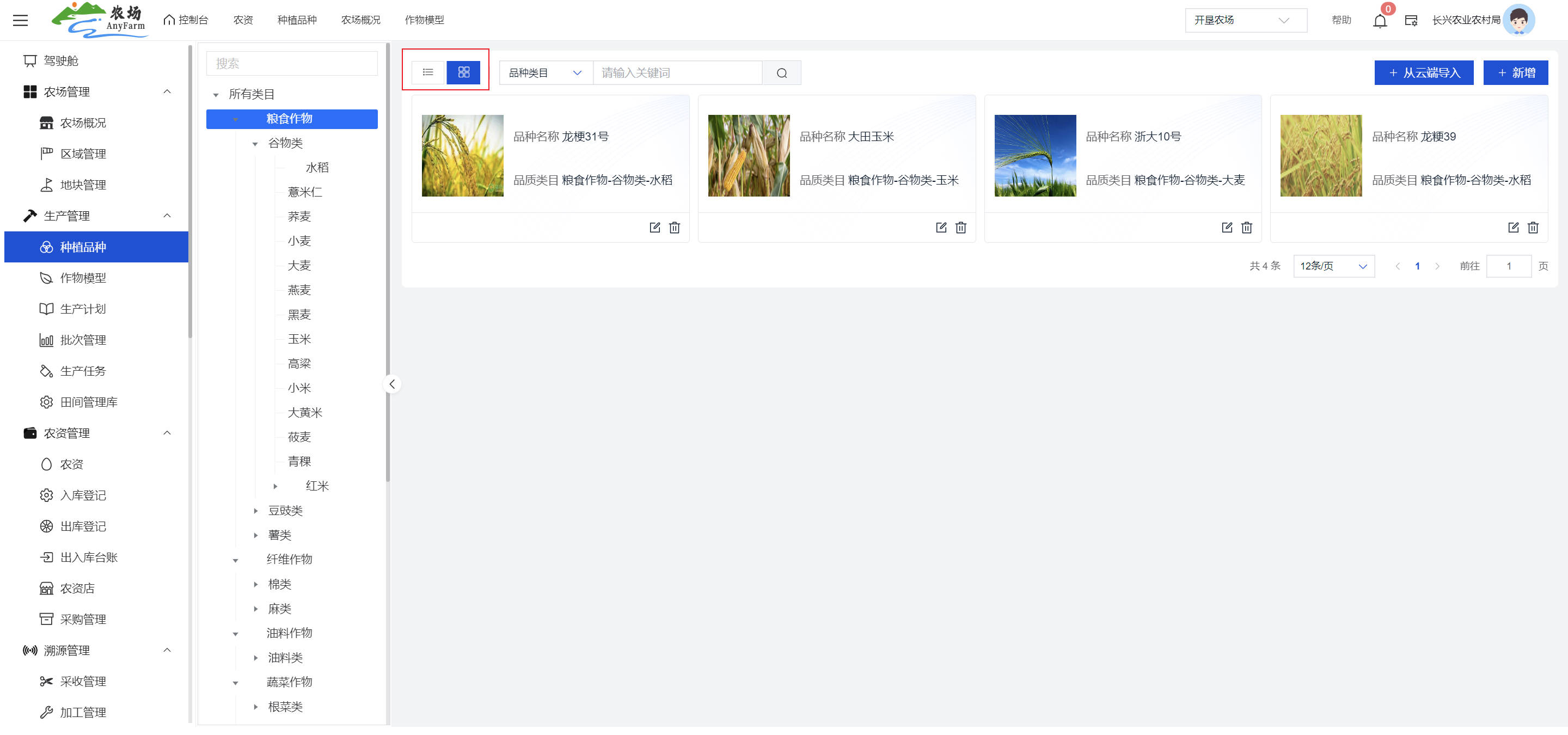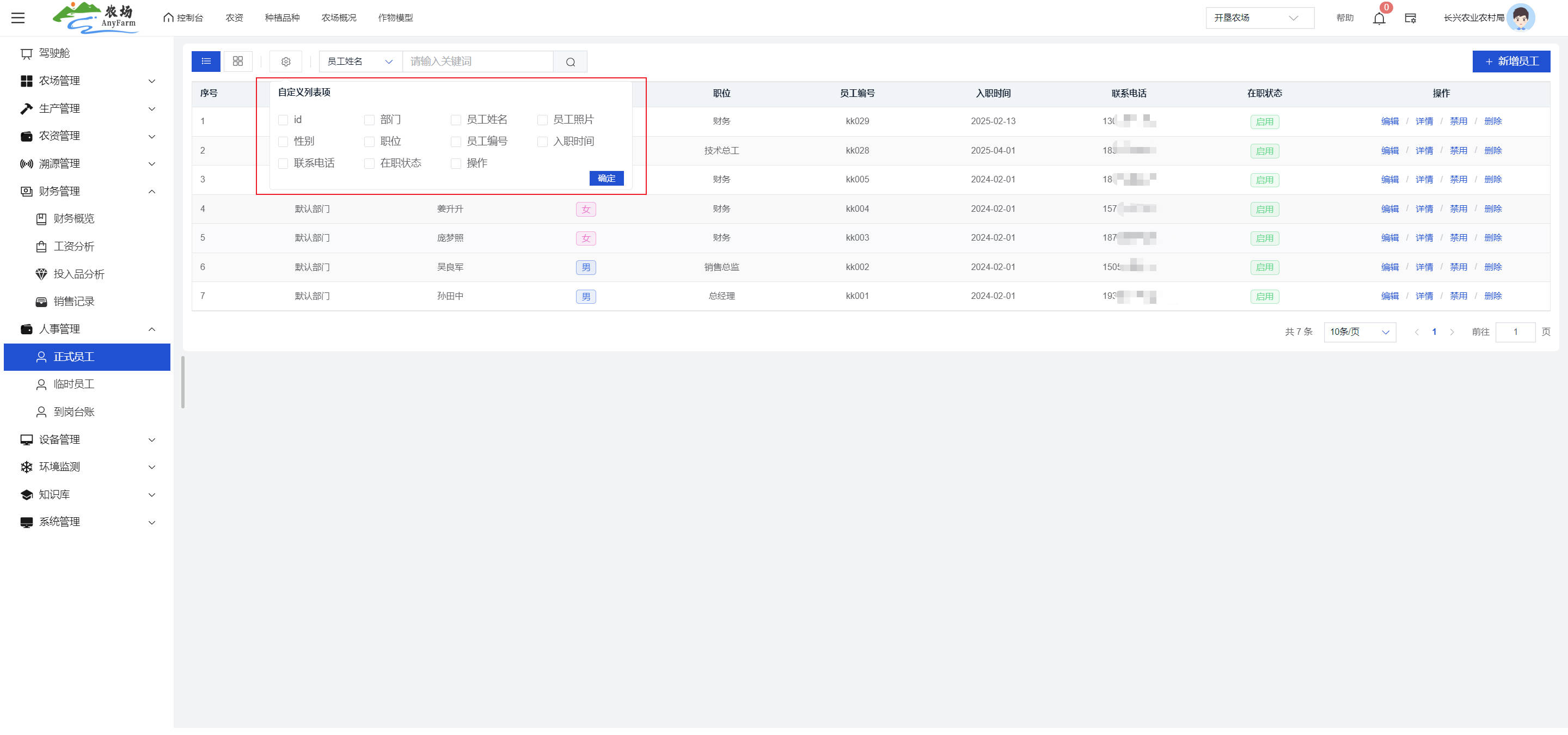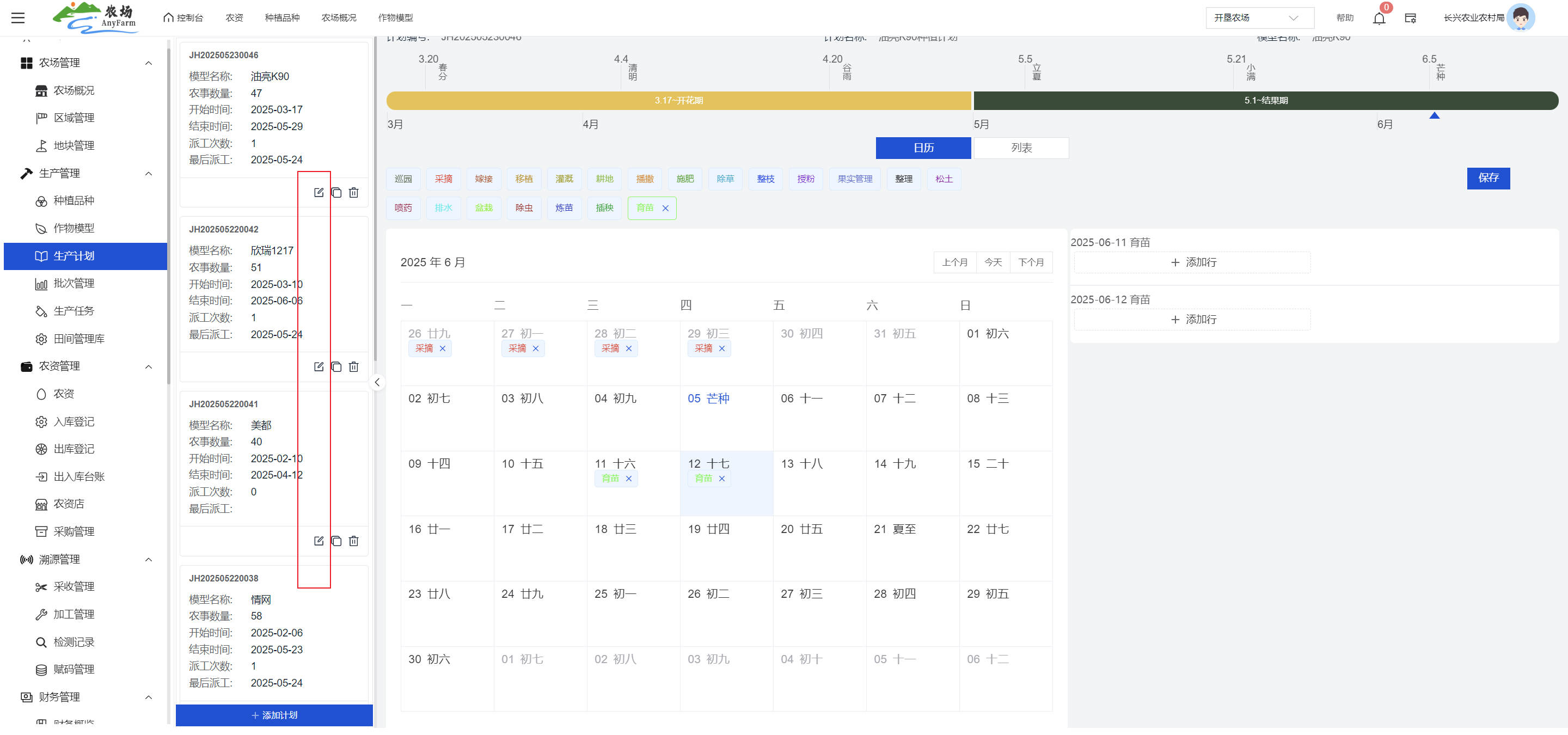 一、平台简介 AnyFarm农场管理平台是利用物联网、大数据、人工智能等现代信息技术,对农业生产进行全方位、全过程的智能化管理和控制。它通过传感器等设备,实时监测农田环境、作物生长、土壤墒情等信息,并通过数据分析和智能决策,实现精准灌溉、施肥、病虫害防治等操作,从而提高农业生产效率,降低资源消耗,保障农产品质量。 二、产品优势 1.全流程数据化管理,提升生产效率: * 优势: * 系统覆盖农场管理的各个环节,实现数据统一采集、存储和分析。 * 通过数据分析,优化生产计划,减少资源浪费,提高生产效率。 * 实时监测农场环境和生产状态,及时发现并解决问题。 * 体现: * 从农场基础信息录入,到生产计划制定,再到农产品溯源,全程数据化管理。 * 通过数据分析,实现精准施肥、精准灌溉等操作,提高资源利用率。 2. 智能化决策支持,降低生产风险: * 优势: * 利用机器学习模型,实现农产品质量预测、产量预测、病虫害预警等功能。 * 为农场管理者提供科学的决策依据,降低生产风险。 * 通过数据分析,预测市场行情,帮助农场及时调整生产策略。 * 体现: * 通过模型训练,预测农产品产量和质量,提前做好准备。 * 通过病虫害预警模型,及时发现并处理病虫害,减少损失。 3. 全程可追溯,保障农产品质量安全: * 优势: * 实现农产品从生产到销售的全程可追溯,保障产品质量安全。 * 消费者可以通过溯源码查询农产品生产信息,增强信任感。 * 提高农产品品牌价值,增强市场竞争力。 * 体现: * 记录农产品生产、加工、检测等信息,并与溯源码关联。 * 消费者可以通过手机扫描溯源码,了解农产品详细信息。 三、业务流程 流程说明: 1. 基础信息管理 * 农场管理: 对已添加的农场进行管理,包括信息修改、删除等操作。 * 员工管理: 录入和管理农场员工信息,包括姓名、工号、职位、联系方式等。 * 区域管理: 划分农场区域,如种植区、养殖区、办公区等,方便后续管理。 * 地块管理: 将农场区域进一步细分为地块,记录地块编号、面积、种植作物等信息。 * 设备管理: 录入和管理农场使用的各种设备,如灌溉设备、施肥设备、监测设备等。 * 计量单位: 设置系统中使用的计量单位,如面积单位、重量单位等。 * 指标库: 建立农产品质量、环境监测等相关指标库,为后续数据分析提供基础。 2. 生产管理 * 添加品种: 录入农场种植或养殖的品种信息,包括品种名称、特性、生长周期等。 * 品种管理: 对已添加的品种进行管理,包括信息修改、删除等操作。 * 添加农资: 录入农场使用的农资信息,如种子、肥料、农药等。 * 农资管理: 对已添加的农资进行管理,包括信息修改、删除等操作。 * 农资店: 如果农场有自己的农资店,则可以录入和管理农资店的信息。 * 农资出入库: 记录农资的出入库情况,实现农资库存管理。 * 生产计划: 制定农场的生产计划,包括种植或养殖时间、产量目标、农资使用计划等。 * 批次管理: 对农产品进行批次管理,记录批次信息、生产过程、质量检测等。 * 生产任务: 根据生产计划,生成具体的生产任务,分配给员工执行。 3. 溯源管理 * 采收管理: 记录农产品的采收情况,包括采收时间、产量、质量等。 * 加工管理: 如果农产品需要进行加工,则记录加工过程和相关信息。 * 检测记录: 记录农产品质量检测、环境监测等数据。 * 赋码管理: 对农产品进行赋码,实现产品溯源。 四、操作指南 4.1农场概况 界面功能概述: 该界面作为农场的首页及控制台界面,为用户呈现了农场的整体概况信息。在这里,用户能够清晰地查看到农场的数量、各个地块的数量、当前在职的员工人数、实时的天气状况等重要信息。同时,该界面还为用户提供了便捷的操作入口,例如可以进行农场的管理操作以及新增员工等常用功能,方便用户对农场的基本信息进行快速的了解和管理。  4.1.1.1 农场概况 界面功能概述: 用户可以点击标红的地方跳转到农场管理跳转到农场管理界面。  用户点击界面中标红的区域即可跳转到农场管理界面。在该界面中,用户可以全面了解农场的各项详细信息,如农场的占地面积、具体的种植区域划分、在职员工的数量及基本信息、各类设备的运行情况、今日和明日的农事安排等。这些信息的展示有助于用户对农场的整体运营状况有一个清晰的认识,同时也为后续的管理决策提供了有力的数据支持。此外,用户还可以在该界面进行一些基础的管理操作,如编辑农场的基本信息、调整设备的设置等,以确保农场的各项工作能够顺利进行。  4.1.1.2 农场农事 界面功能概述: 用户可以通过这里看到该农场的农事情况,例如施药、灌溉、施肥等常见的农事活动。  4.1.1.3 新增用户 界面元素功能概述: 该界面主要用于用户进行新增用户以及添加用户权限的操作。在农场的日常运营中,可能需要不断添加新的员工或管理人员,并为他们分配相应的权限,以便他们能够顺利地完成各自的工作任务。通过该界面,用户可以方便地完成这些操作,确保农场的人力资源管理更加高效和有序。  左侧搜索栏 :此搜索栏为用户提供了一个便捷的方式,允许用户在输入框内输入关键字,例如部门名称的关键词,从而快速搜索到特定的部门。这对于拥有多个部门的大型农场来说,能够大大提高用户查找部门的效率,节省时间。 顶部搜索栏:在这里,用户可以在输入框内