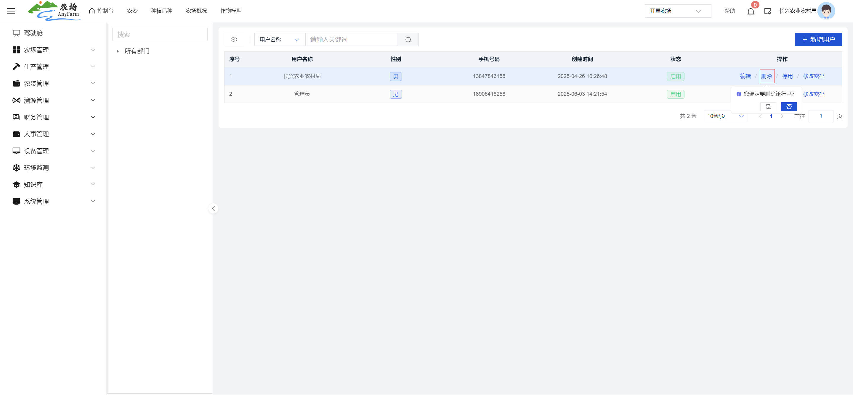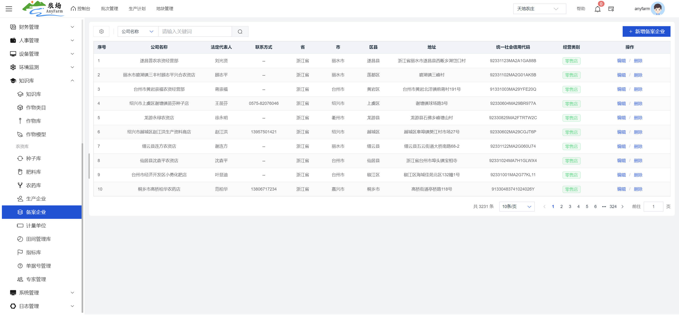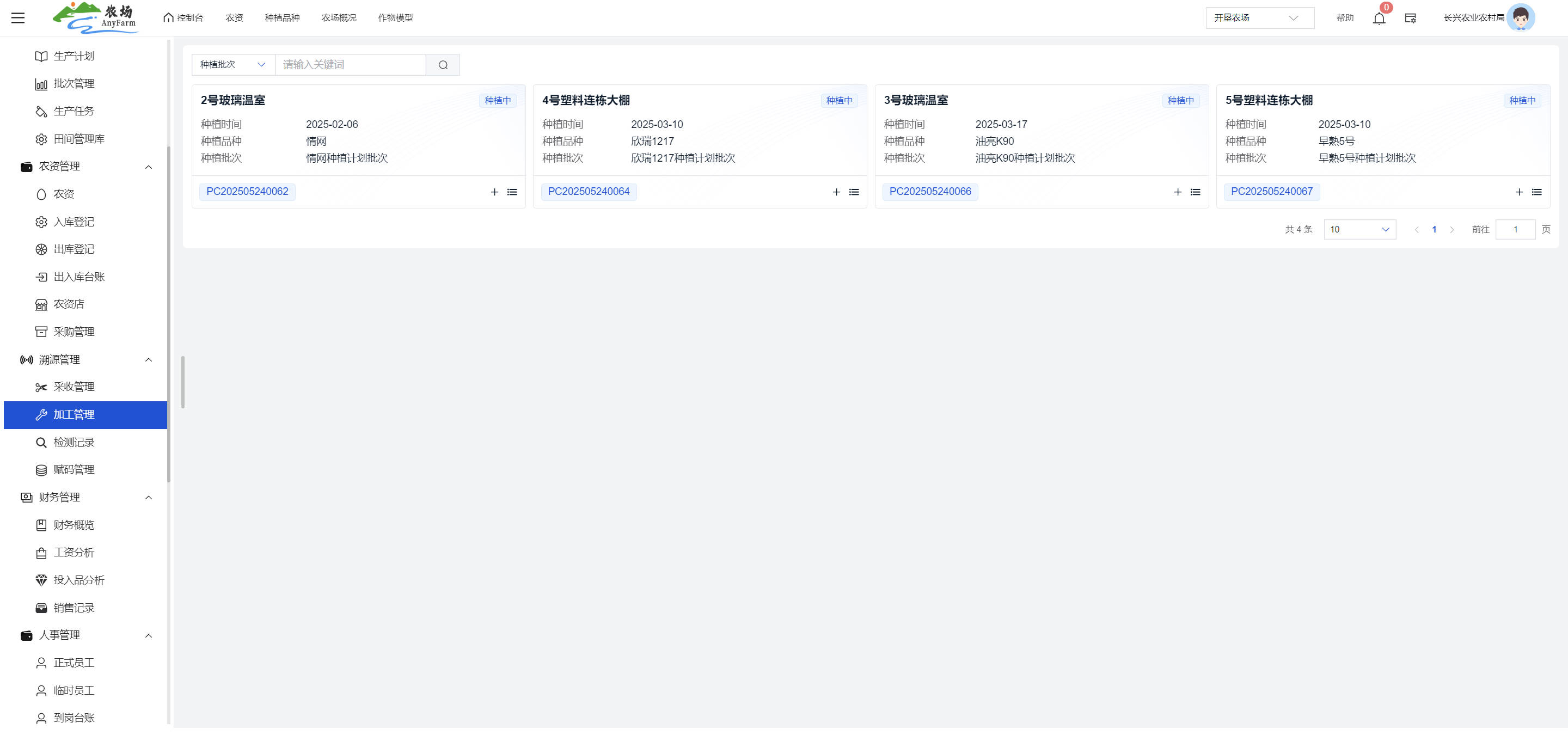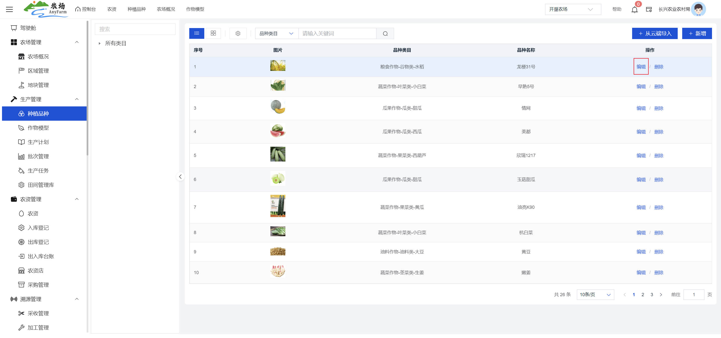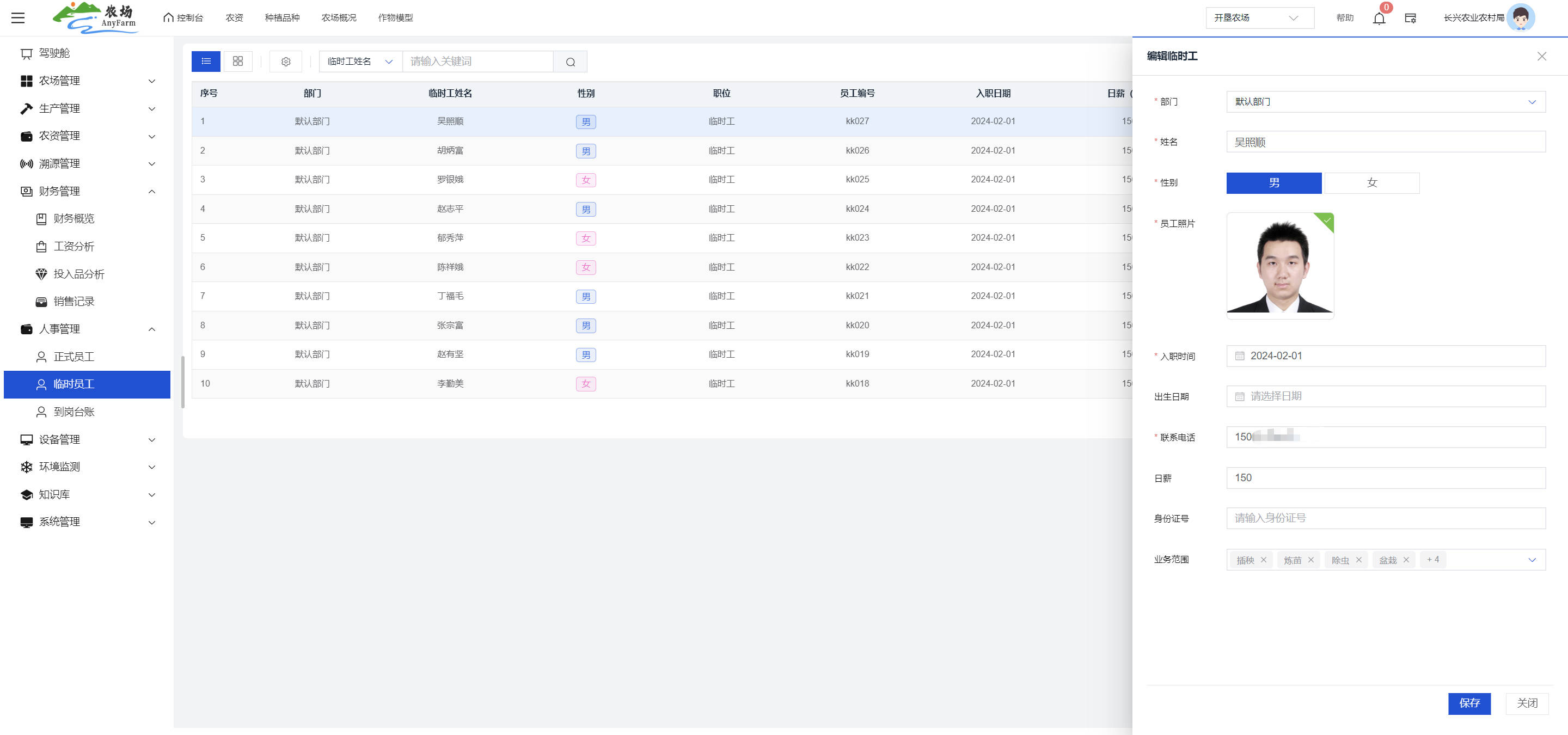 一、平台简介 AnyFarm农场管理平台是利用物联网、大数据、人工智能等现代信息技术,对农业生产进行全方位、全过程的智能化管理和控制。它通过传感器等设备,实时监测农田环境、作物生长、土壤墒情等信息,并通过数据分析和智能决策,实现精准灌溉、施肥、病虫害防治等操作,从而提高农业生产效率,降低资源消耗,保障农产品质量。 二、产品优势 1.全流程数据化管理,提升生产效率: * 优势: * 系统覆盖农场管理的各个环节,实现数据统一采集、存储和分析。 * 通过数据分析,优化生产计划,减少资源浪费,提高生产效率。 * 实时监测农场环境和生产状态,及时发现并解决问题。 * 体现: * 从农场基础信息录入,到生产计划制定,再到农产品溯源,全程数据化管理。 * 通过数据分析,实现精准施肥、精准灌溉等操作,提高资源利用率。 2. 智能化决策支持,降低生产风险: * 优势: * 利用机器学习模型,实现农产品质量预测、产量预测、病虫害预警等功能。 * 为农场管理者提供科学的决策依据,降低生产风险。 * 通过数据分析,预测市场行情,帮助农场及时调整生产策略。 * 体现: * 通过模型训练,预测农产品产量和质量,提前做好准备。 * 通过病虫害预警模型,及时发现并处理病虫害,减少损失。 3. 全程可追溯,保障农产品质量安全: * 优势: * 实现农产品从生产到销售的全程可追溯,保障产品质量安全。 * 消费者可以通过溯源码查询农产品生产信息,增强信任感。 * 提高农产品品牌价值,增强市场竞争力。 * 体现: * 记录农产品生产、加工、检测等信息,并与溯源码关联。 * 消费者可以通过手机扫描溯源码,了解农产品详细信息。 三、业务流程 流程说明: 1. 基础信息管理 * 农场管理: 对已添加的农场进行管理,包括信息修改、删除等操作。 * 员工管理: 录入和管理农场员工信息,包括姓名、工号、职位、联系方式等。 * 区域管理: 划分农场区域,如种植区、养殖区、办公区等,方便后续管理。 * 地块管理: 将农场区域进一步细分为地块,记录地块编号、面积、种植作物等信息。 * 设备管理: 录入和管理农场使用的各种设备,如灌溉设备、施肥设备、监测设备等。 * 计量单位: 设置系统中使用的计量单位,如面积单位、重量单位等。 * 指标库: 建立农产品质量、环境监测等相关指标库,为后续数据分析提供基础。 2. 生产管理 * 添加品种: 录入农场种植或养殖的品种信息,包括品种名称、特性、生长周期等。 * 品种管理: 对已添加的品种进行管理,包括信息修改、删除等操作。 * 添加农资: 录入农场使用的农资信息,如种子、肥料、农药等。 * 农资管理: 对已添加的农资进行管理,包括信息修改、删除等操作。 * 农资店: 如果农场有自己的农资店,则可以录入和管理农资店的信息。 * 农资出入库: 记录农资的出入库情况,实现农资库存管理。 * 生产计划: 制定农场的生产计划,包括种植或养殖时间、产量目标、农资使用计划等。 * 批次管理: 对农产品进行批次管理,记录批次信息、生产过程、质量检测等。 * 生产任务: 根据生产计划,生成具体的生产任务,分配给员工执行。 3. 溯源管理 * 采收管理: 记录农产品的采收情况,包括采收时间、产量、质量等。 * 加工管理: 如果农产品需要进行加工,则记录加工过程和相关信息。 * 检测记录: 记录农产品质量检测、环境监测等数据。 * 赋码管理: 对农产品进行赋码,实现产品溯源。 四、操作指南 4.1农场概况 界面功能概述: 该界面作为农场的首页及控制台界面,为用户呈现了农场的整体概况信息。在这里,用户能够清晰地查看到农场的数量、各个地块的数量、当前在职的员工人数、实时的天气状况等重要信息。同时,该界面还为用户提供了便捷的操作入口,例如可以进行农场的管理操作以及新增员工等常用功能,方便用户对农场的基本信息进行快速的了解和管理。  4.1.1.1 农场概况 界面功能概述: 用户可以点击标红的地方跳转到农场管理跳转到农场管理界面。  用户点击界面中标红的区域即可跳转到农场管理界面。在该界面中,用户可以全面了解农场的各项详细信息,如农场的占地面积、具体的种植区域划分、在职员工的数量及基本信息、各类设备的运行情况、今日和明日的农事安排等。这些信息的展示有助于用户对农场的整体运营状况有一个清晰的认识,同时也为后续的管理决策提供了有力的数据支持。此外,用户还可以在该界面进行一些基础的管理操作,如编辑农场的基本信息、调整设备的设置等,以确保农场的各项工作能够顺利进行。  4.1.1.2 农场农事 界面功能概述: 用户可以通过这里看到该农场的农事情况,例如施药、灌溉、施肥等常见的农事活动。  4.1.1.3 新增用户 界面元素功能概述: 该界面主要用于用户进行新增用户以及添加用户权限的操作。在农场的日常运营中,可能需要不断添加新的员工或管理人员,并为他们分配相应的权限,以便他们能够顺利地完成各自的工作任务。通过该界面,用户可以方便地完成这些操作,确保农场的人力资源管理更加高效和有序。  左侧搜索栏 :此搜索栏为用户提供了一个便捷的方式,允许用户在输入框内输入关键字,例如部门名称的关键词,从而快速搜索到特定的部门。这对于拥有多个部门的大型农场来说,能够大大提高用户查找部门的效率,节省时间。 顶部搜索栏:在这里,用户可以在输入框内