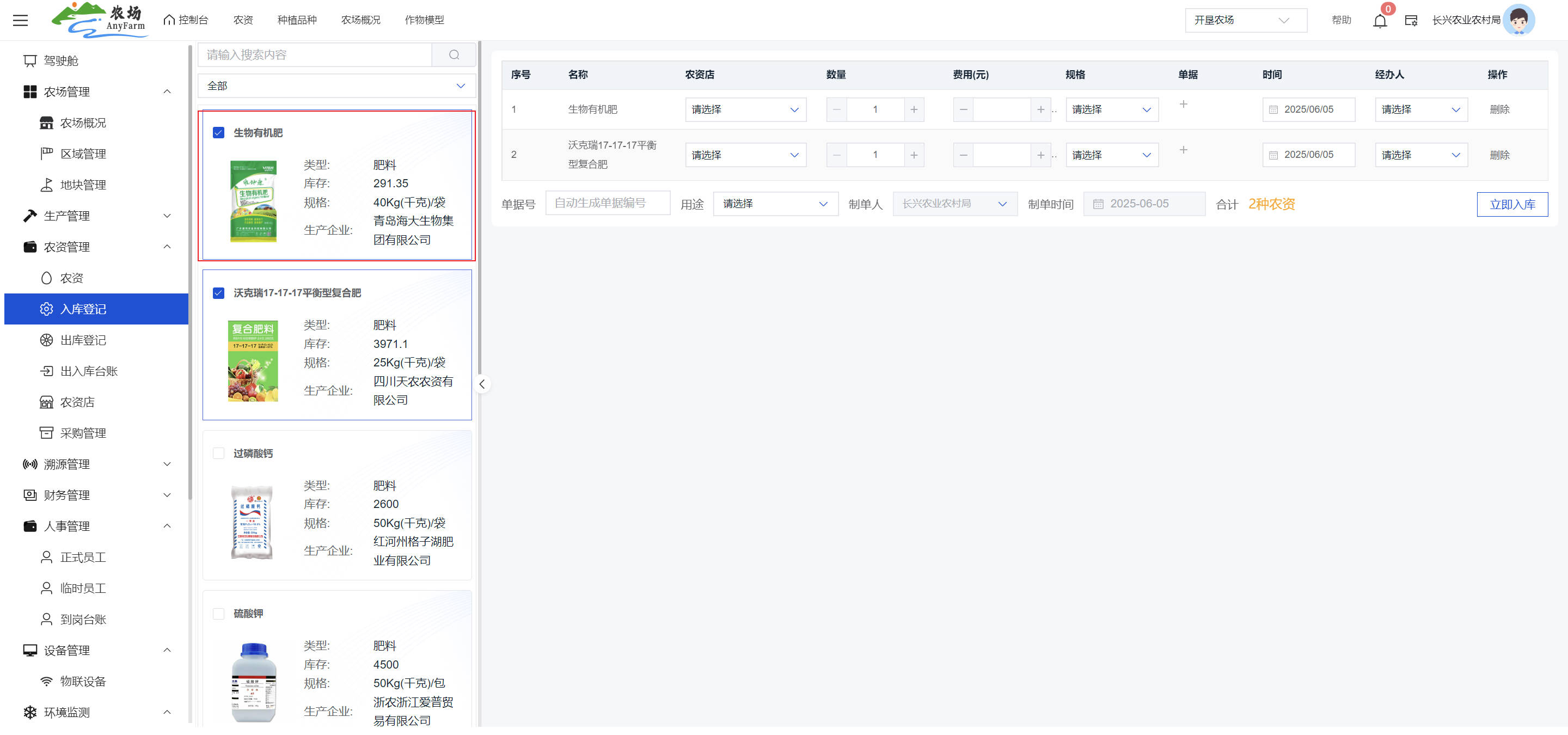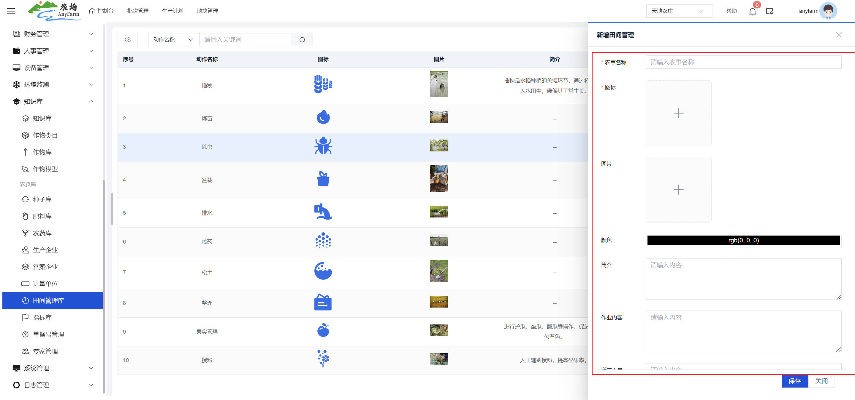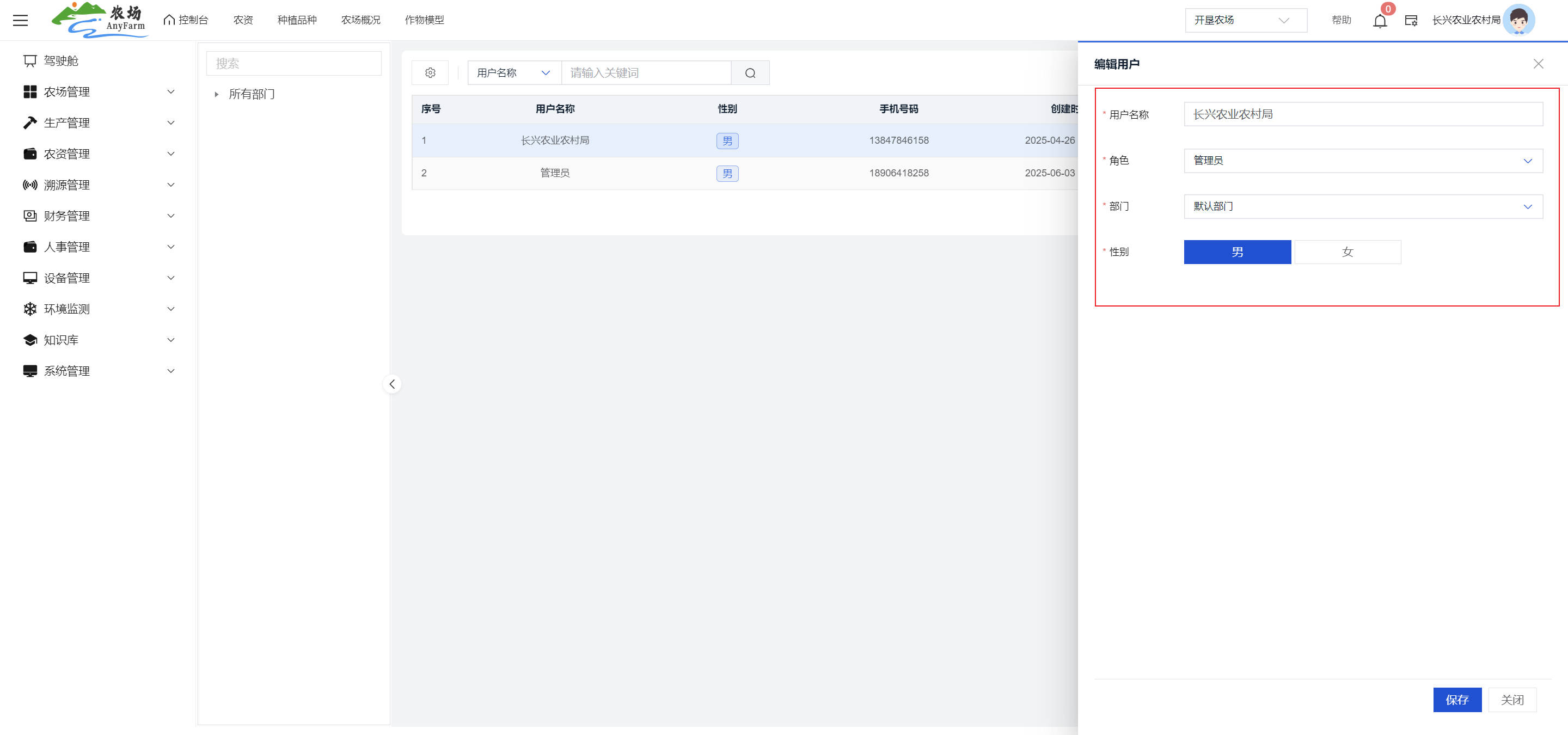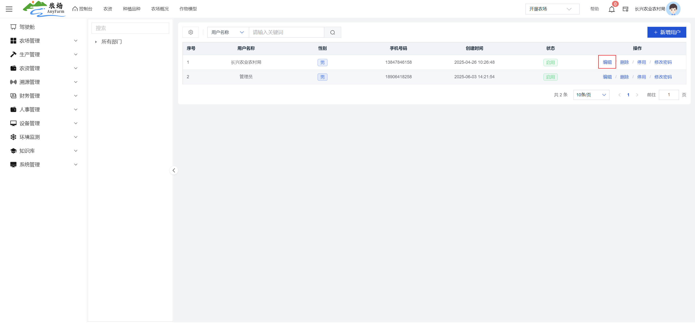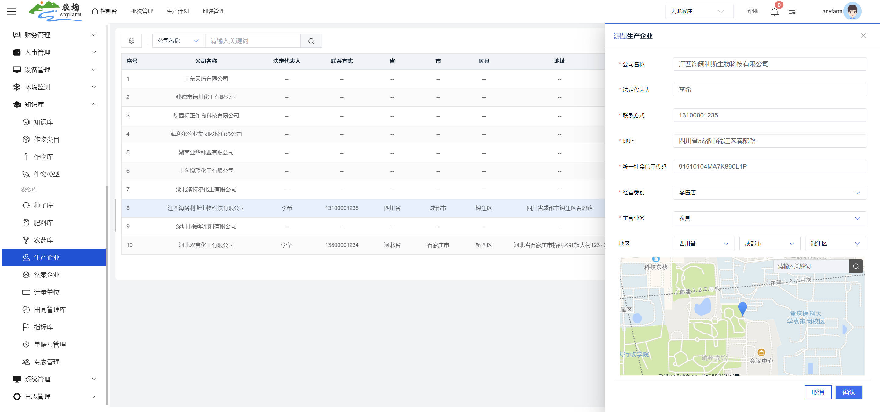 一、平台简介 AnyFarm农场管理平台是利用物联网、大数据、人工智能等现代信息技术,对农业生产进行全方位、全过程的智能化管理和控制。它通过传感器等设备,实时监测农田环境、作物生长、土壤墒情等信息,并通过数据分析和智能决策,实现精准灌溉、施肥、病虫害防治等操作,从而提高农业生产效率,降低资源消耗,保障农产品质量。 二、产品优势 1.全流程数据化管理,提升生产效率: * 优势: * 系统覆盖农场管理的各个环节,实现数据统一采集、存储和分析。 * 通过数据分析,优化生产计划,减少资源浪费,提高生产效率。 * 实时监测农场环境和生产状态,及时发现并解决问题。 * 体现: * 从农场基础信息录入,到生产计划制定,再到农产品溯源,全程数据化管理。 * 通过数据分析,实现精准施肥、精准灌溉等操作,提高资源利用率。 2. 智能化决策支持,降低生产风险: * 优势: * 利用机器学习模型,实现农产品质量预测、产量预测、病虫害预警等功能。 * 为农场管理者提供科学的决策依据,降低生产风险。 * 通过数据分析,预测市场行情,帮助农场及时调整生产策略。 * 体现: * 通过模型训练,预测农产品产量和质量,提前做好准备。 * 通过病虫害预警模型,及时发现并处理病虫害,减少损失。 3. 全程可追溯,保障农产品质量安全: * 优势: * 实现农产品从生产到销售的全程可追溯,保障产品质量安全。 * 消费者可以通过溯源码查询农产品生产信息,增强信任感。 * 提高农产品品牌价值,增强市场竞争力。 * 体现: * 记录农产品生产、加工、检测等信息,并与溯源码关联。 * 消费者可以通过手机扫描溯源码,了解农产品详细信息。 三、业务流程 流程说明: 1. 基础信息管理 * 农场管理: 对已添加的农场进行管理,包括信息修改、删除等操作。 * 员工管理: 录入和管理农场员工信息,包括姓名、工号、职位、联系方式等。 * 区域管理: 划分农场区域,如种植区、养殖区、办公区等,方便后续管理。 * 地块管理: 将农场区域进一步细分为地块,记录地块编号、面积、种植作物等信息。 * 设备管理: 录入和管理农场使用的各种设备,如灌溉设备、施肥设备、监测设备等。 * 计量单位: 设置系统中使用的计量单位,如面积单位、重量单位等。 * 指标库: 建立农产品质量、环境监测等相关指标库,为后续数据分析提供基础。 2. 生产管理 * 添加品种: 录入农场种植或养殖的品种信息,包括品种名称、特性、生长周期等。 * 品种管理: 对已添加的品种进行管理,包括信息修改、删除等操作。 * 添加农资: 录入农场使用的农资信息,如种子、肥料、农药等。 * 农资管理: 对已添加的农资进行管理,包括信息修改、删除等操作。 * 农资店: 如果农场有自己的农资店,则可以录入和管理农资店的信息。 * 农资出入库: 记录农资的出入库情况,实现农资库存管理。 * 生产计划: 制定农场的生产计划,包括种植或养殖时间、产量目标、农资使用计划等。 * 批次管理: 对农产品进行批次管理,记录批次信息、生产过程、质量检测等。 * 生产任务: 根据生产计划,生成具体的生产任务,分配给员工执行。 3. 溯源管理 * 采收管理: 记录农产品的采收情况,包括采收时间、产量、质量等。 * 加工管理: 如果农产品需要进行加工,则记录加工过程和相关信息。 * 检测记录: 记录农产品质量检测、环境监测等数据。 * 赋码管理: 对农产品进行赋码,实现产品溯源。 四、操作指南 4.1农场概况 界面功能概述: 该界面作为农场的首页及控制台界面,为用户呈现了农场的整体概况信息。在这里,用户能够清晰地查看到农场的数量、各个地块的数量、当前在职的员工人数、实时的天气状况等重要信息。同时,该界面还为用户提供了便捷的操作入口,例如可以进行农场的管理操作以及新增员工等常用功能,方便用户对农场的基本信息进行快速的了解和管理。  4.1.1.1 农场概况 界面功能概述: 用户可以点击标红的地方跳转到农场管理跳转到农场管理界面。  用户点击界面中标红的区域即可跳转到农场管理界面。在该界面中,用户可以全面了解农场的各项详细信息,如农场的占地面积、具体的种植区域划分、在职员工的数量及基本信息、各类设备的运行情况、今日和明日的农事安排等。这些信息的展示有助于用户对农场的整体运营状况有一个清晰的认识,同时也为后续的管理决策提供了有力的数据支持。此外,用户还可以在该界面进行一些基础的管理操作,如编辑农场的基本信息、调整设备的设置等,以确保农场的各项工作能够顺利进行。  4.1.1.2 农场农事 界面功能概述: 用户可以通过这里看到该农场的农事情况,例如施药、灌溉、施肥等常见的农事活动。  4.1.1.3 新增用户 界面元素功能概述: 该界面主要用于用户进行新增用户以及添加用户权限的操作。在农场的日常运营中,可能需要不断添加新的员工或管理人员,并为他们分配相应的权限,以便他们能够顺利地完成各自的工作任务。通过该界面,用户可以方便地完成这些操作,确保农场的人力资源管理更加高效和有序。  左侧搜索栏 :此搜索栏为用户提供了一个便捷的方式,允许用户在输入框内输入关键字,例如部门名称的关键词,从而快速搜索到特定的部门。这对于拥有多个部门的大型农场来说,能够大大提高用户查找部门的效率,节省时间。 顶部搜索栏:在这里,用户可以在输入框内