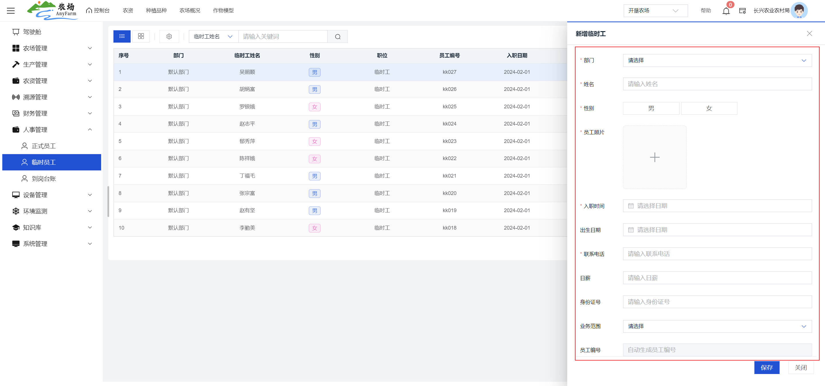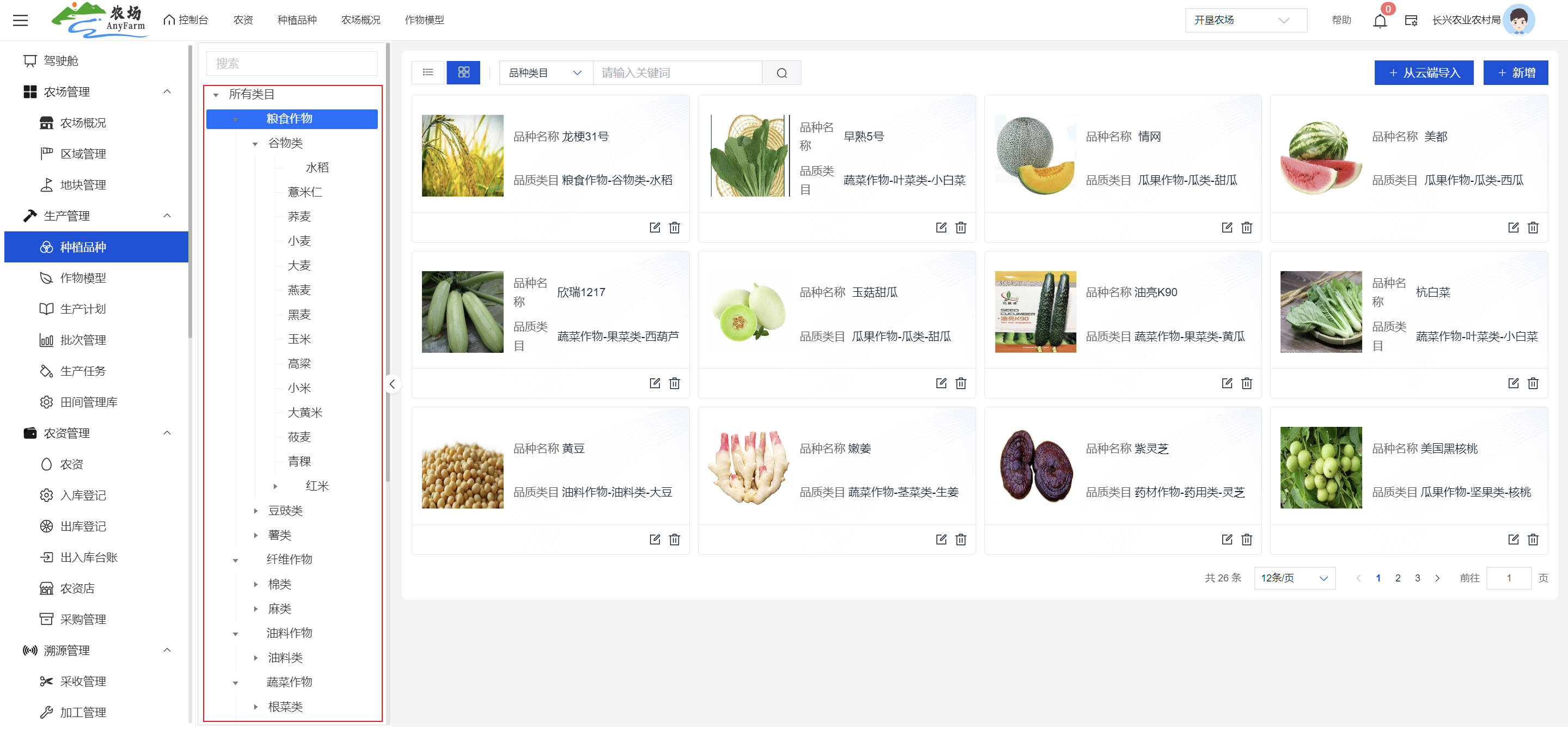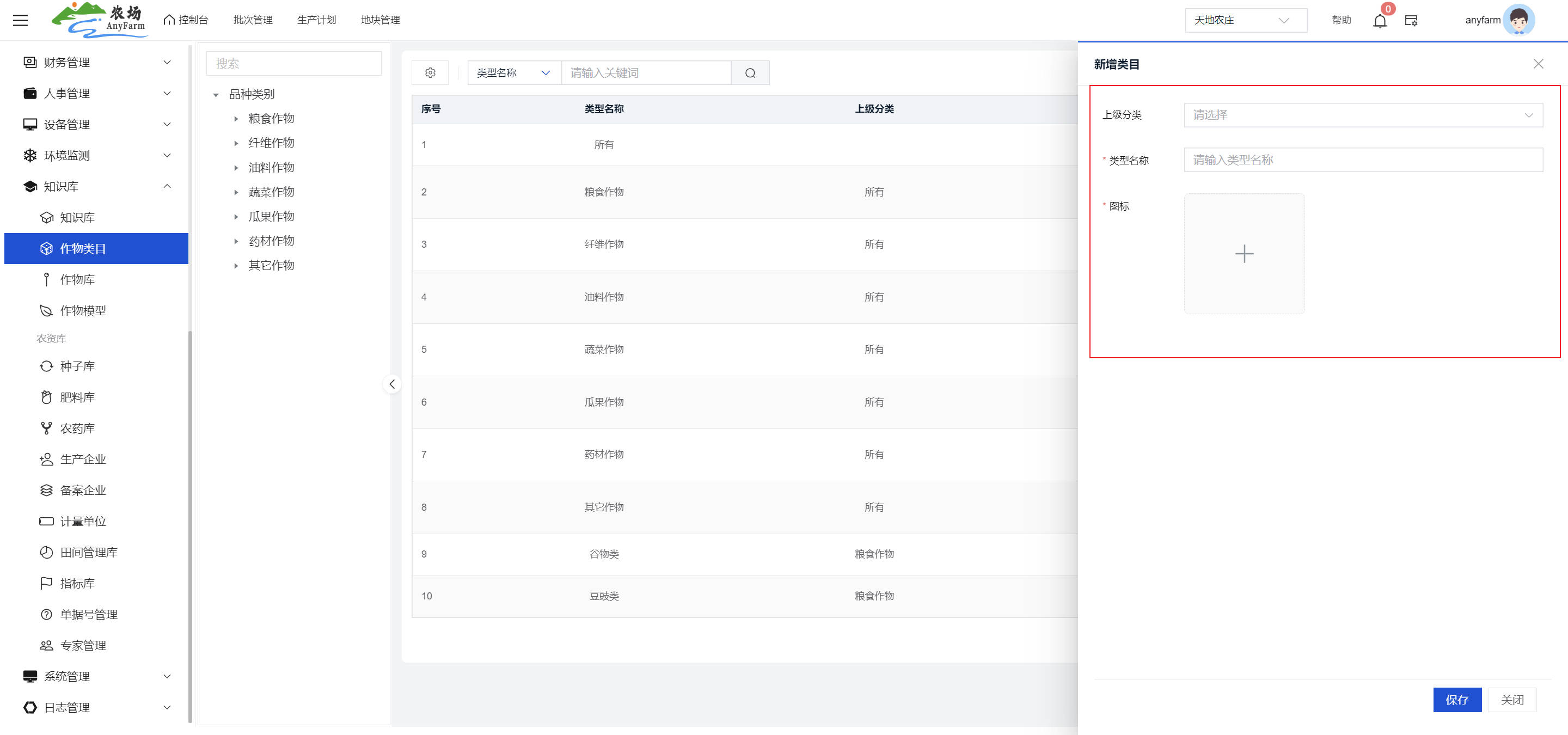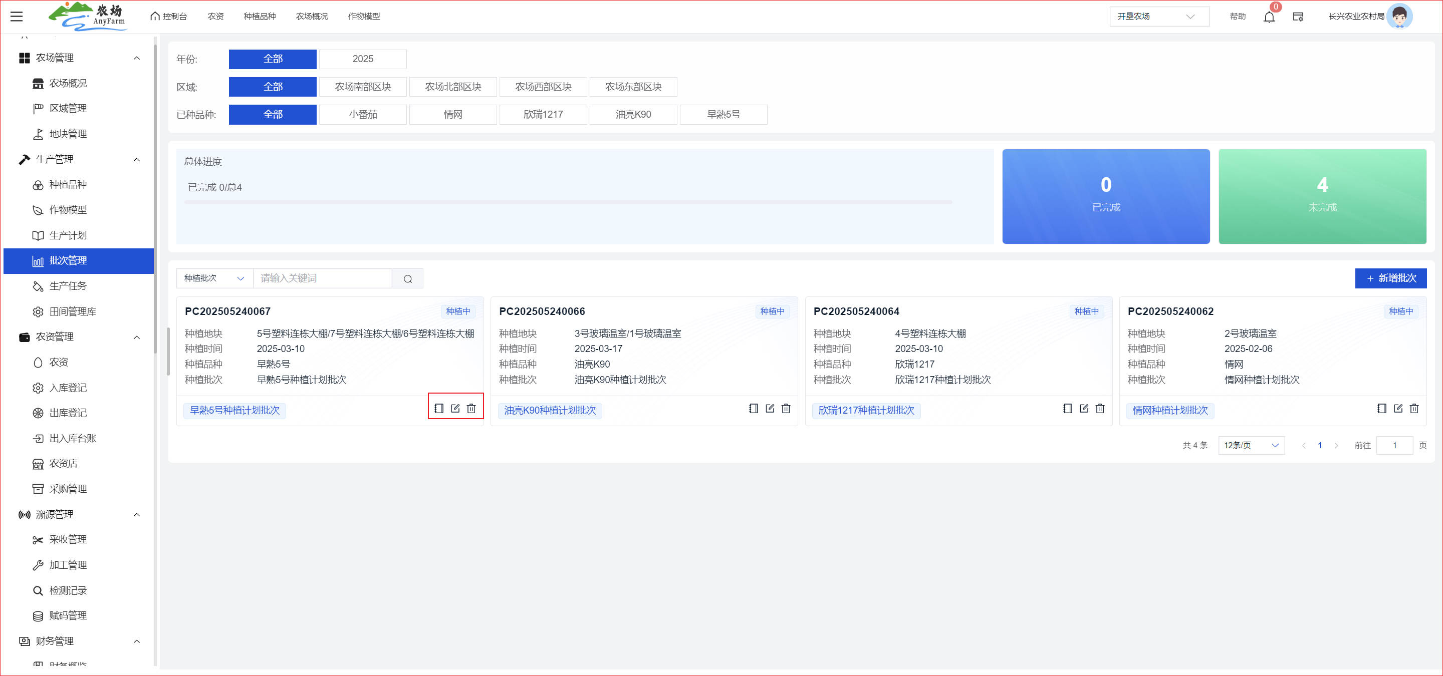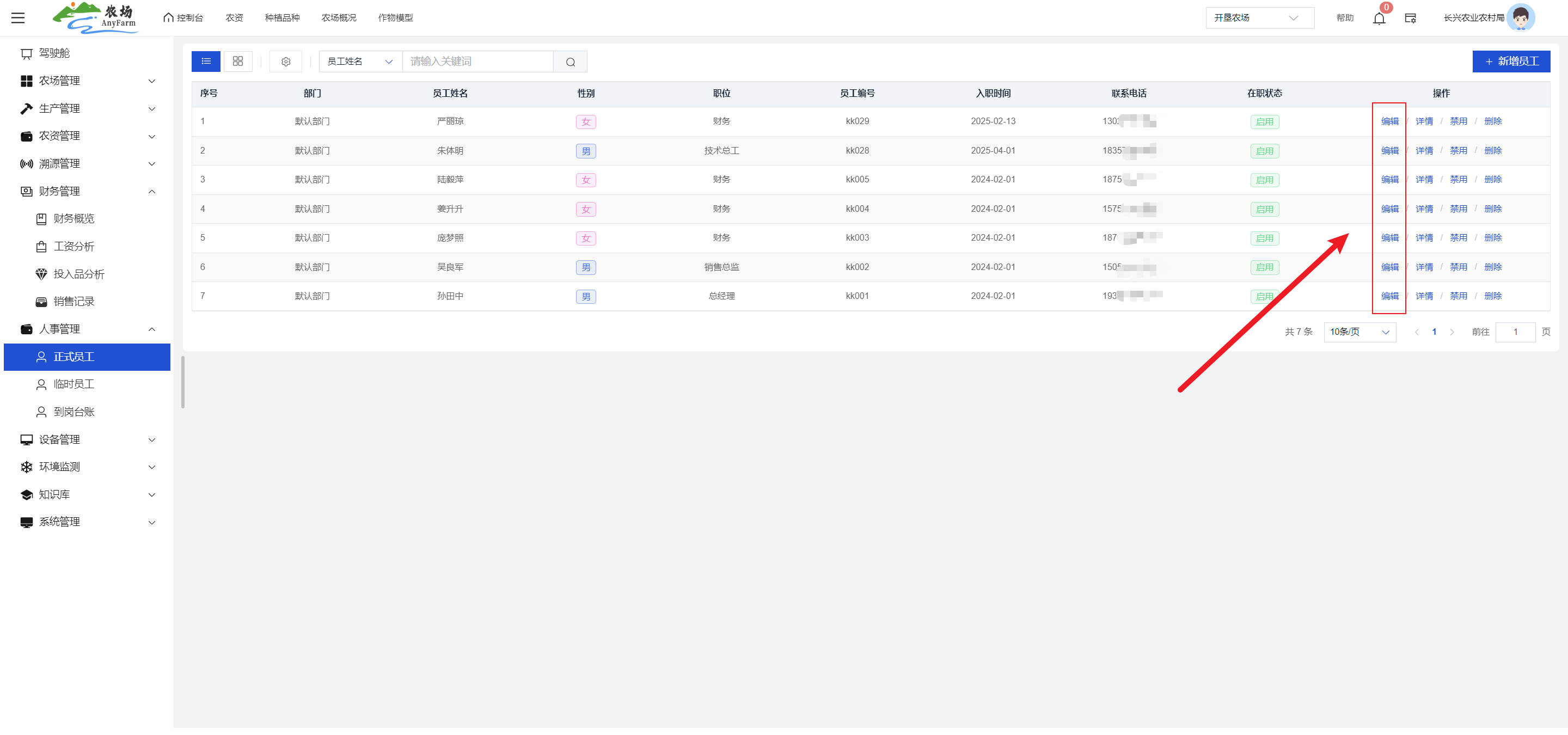 一、平台简介 AnyFarm农场管理平台是利用物联网、大数据、人工智能等现代信息技术,对农业生产进行全方位、全过程的智能化管理和控制。它通过传感器等设备,实时监测农田环境、作物生长、土壤墒情等信息,并通过数据分析和智能决策,实现精准灌溉、施肥、病虫害防治等操作,从而提高农业生产效率,降低资源消耗,保障农产品质量。 二、产品优势 1.全流程数据化管理,提升生产效率: * 优势: * 系统覆盖农场管理的各个环节,实现数据统一采集、存储和分析。 * 通过数据分析,优化生产计划,减少资源浪费,提高生产效率。 * 实时监测农场环境和生产状态,及时发现并解决问题。 * 体现: * 从农场基础信息录入,到生产计划制定,再到农产品溯源,全程数据化管理。 * 通过数据分析,实现精准施肥、精准灌溉等操作,提高资源利用率。 2. 智能化决策支持,降低生产风险: * 优势: * 利用机器学习模型,实现农产品质量预测、产量预测、病虫害预警等功能。 * 为农场管理者提供科学的决策依据,降低生产风险。 * 通过数据分析,预测市场行情,帮助农场及时调整生产策略。 * 体现: * 通过模型训练,预测农产品产量和质量,提前做好准备。 * 通过病虫害预警模型,及时发现并处理病虫害,减少损失。 3. 全程可追溯,保障农产品质量安全: * 优势: * 实现农产品从生产到销售的全程可追溯,保障产品质量安全。 * 消费者可以通过溯源码查询农产品生产信息,增强信任感。 * 提高农产品品牌价值,增强市场竞争力。 * 体现: * 记录农产品生产、加工、检测等信息,并与溯源码关联。 * 消费者可以通过手机扫描溯源码,了解农产品详细信息。 三、业务流程 流程说明: 1. 基础信息管理 * 农场管理: 对已添加的农场进行管理,包括信息修改、删除等操作。 * 员工管理: 录入和管理农场员工信息,包括姓名、工号、职位、联系方式等。 * 区域管理: 划分农场区域,如种植区、养殖区、办公区等,方便后续管理。 * 地块管理: 将农场区域进一步细分为地块,记录地块编号、面积、种植作物等信息。 * 设备管理: 录入和管理农场使用的各种设备,如灌溉设备、施肥设备、监测设备等。 * 计量单位: 设置系统中使用的计量单位,如面积单位、重量单位等。 * 指标库: 建立农产品质量、环境监测等相关指标库,为后续数据分析提供基础。 2. 生产管理 * 添加品种: 录入农场种植或养殖的品种信息,包括品种名称、特性、生长周期等。 * 品种管理: 对已添加的品种进行管理,包括信息修改、删除等操作。 * 添加农资: 录入农场使用的农资信息,如种子、肥料、农药等。 * 农资管理: 对已添加的农资进行管理,包括信息修改、删除等操作。 * 农资店: 如果农场有自己的农资店,则可以录入和管理农资店的信息。 * 农资出入库: 记录农资的出入库情况,实现农资库存管理。 * 生产计划: 制定农场的生产计划,包括种植或养殖时间、产量目标、农资使用计划等。 * 批次管理: 对农产品进行批次管理,记录批次信息、生产过程、质量检测等。 * 生产任务: 根据生产计划,生成具体的生产任务,分配给员工执行。 3. 溯源管理 * 采收管理: 记录农产品的采收情况,包括采收时间、产量、质量等。 * 加工管理: 如果农产品需要进行加工,则记录加工过程和相关信息。 * 检测记录: 记录农产品质量检测、环境监测等数据。 * 赋码管理: 对农产品进行赋码,实现产品溯源。 四、操作指南 4.1农场概况 界面功能概述: 该界面作为农场的首页及控制台界面,为用户呈现了农场的整体概况信息。在这里,用户能够清晰地查看到农场的数量、各个地块的数量、当前在职的员工人数、实时的天气状况等重要信息。同时,该界面还为用户提供了便捷的操作入口,例如可以进行农场的管理操作以及新增员工等常用功能,方便用户对农场的基本信息进行快速的了解和管理。  4.1.1.1 农场概况 界面功能概述: 用户可以点击标红的地方跳转到农场管理跳转到农场管理界面。  用户点击界面中标红的区域即可跳转到农场管理界面。在该界面中,用户可以全面了解农场的各项详细信息,如农场的占地面积、具体的种植区域划分、在职员工的数量及基本信息、各类设备的运行情况、今日和明日的农事安排等。这些信息的展示有助于用户对农场的整体运营状况有一个清晰的认识,同时也为后续的管理决策提供了有力的数据支持。此外,用户还可以在该界面进行一些基础的管理操作,如编辑农场的基本信息、调整设备的设置等,以确保农场的各项工作能够顺利进行。  4.1.1.2 农场农事 界面功能概述: 用户可以通过这里看到该农场的农事情况,例如施药、灌溉、施肥等常见的农事活动。  4.1.1.3 新增用户 界面元素功能概述: 该界面主要用于用户进行新增用户以及添加用户权限的操作。在农场的日常运营中,可能需要不断添加新的员工或管理人员,并为他们分配相应的权限,以便他们能够顺利地完成各自的工作任务。通过该界面,用户可以方便地完成这些操作,确保农场的人力资源管理更加高效和有序。  左侧搜索栏 :此搜索栏为用户提供了一个便捷的方式,允许用户在输入框内输入关键字,例如部门名称的关键词,从而快速搜索到特定的部门。这对于拥有多个部门的大型农场来说,能够大大提高用户查找部门的效率,节省时间。 顶部搜索栏:在这里,用户可以在输入框内