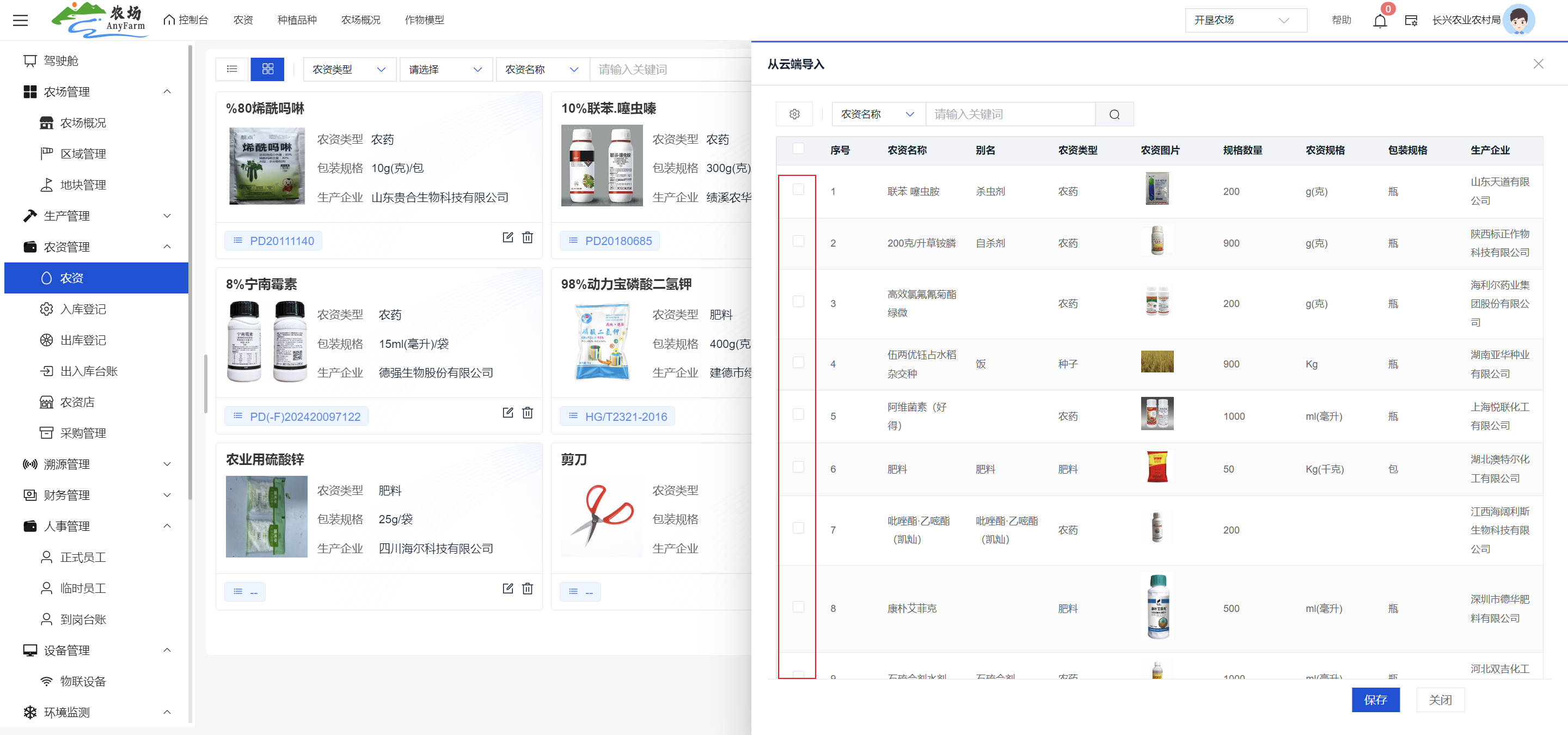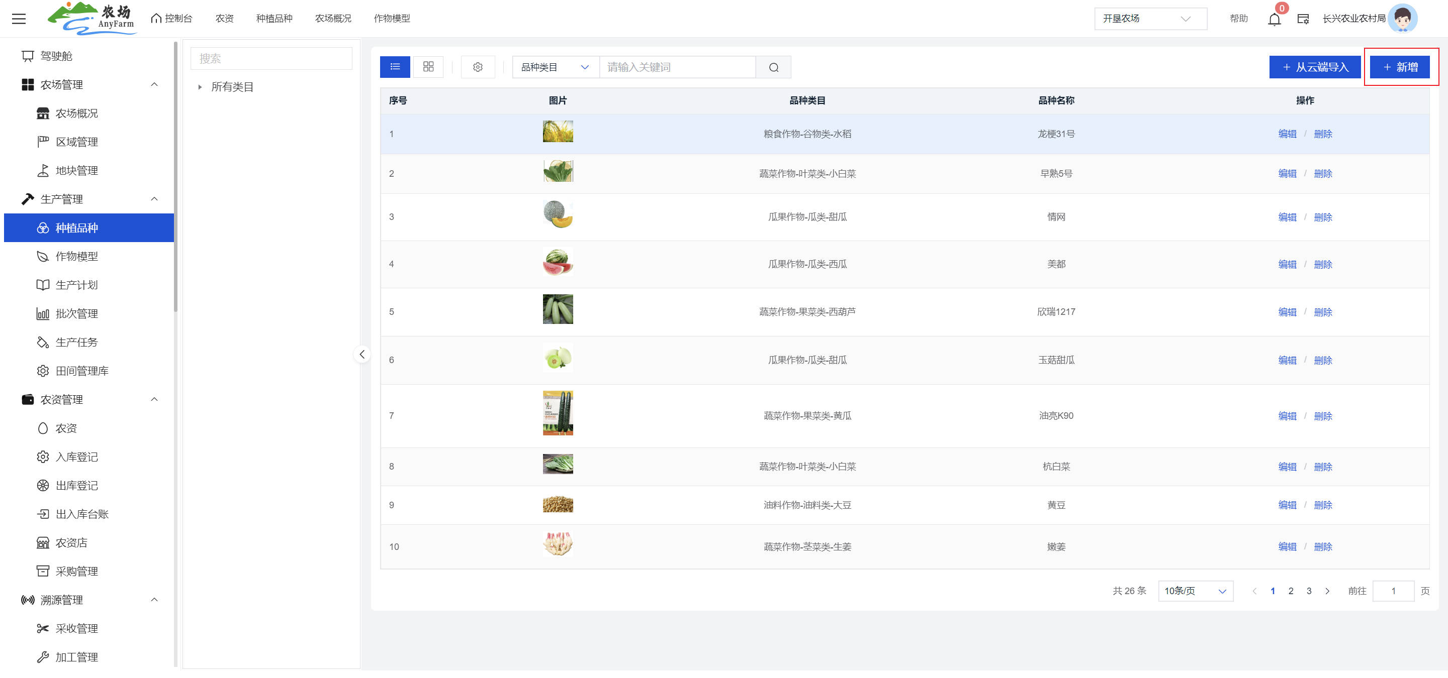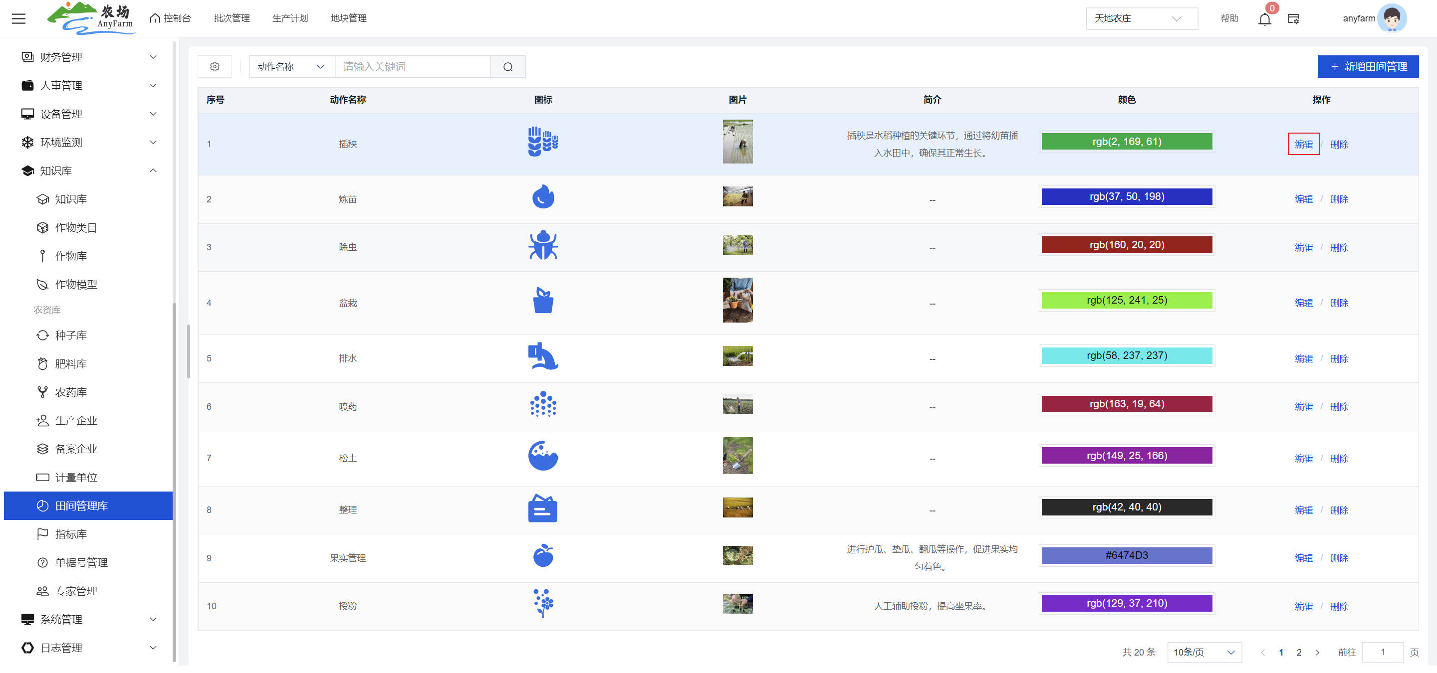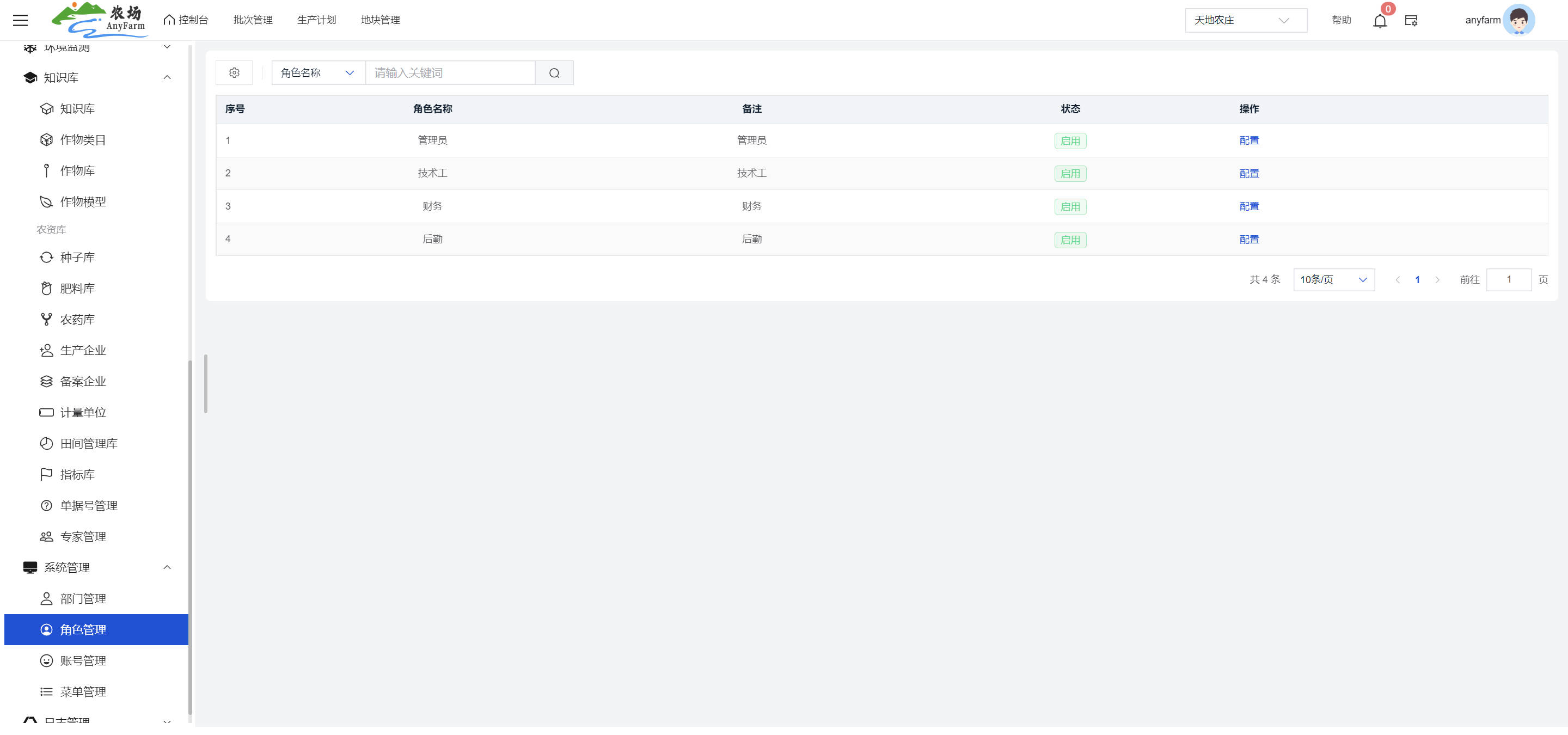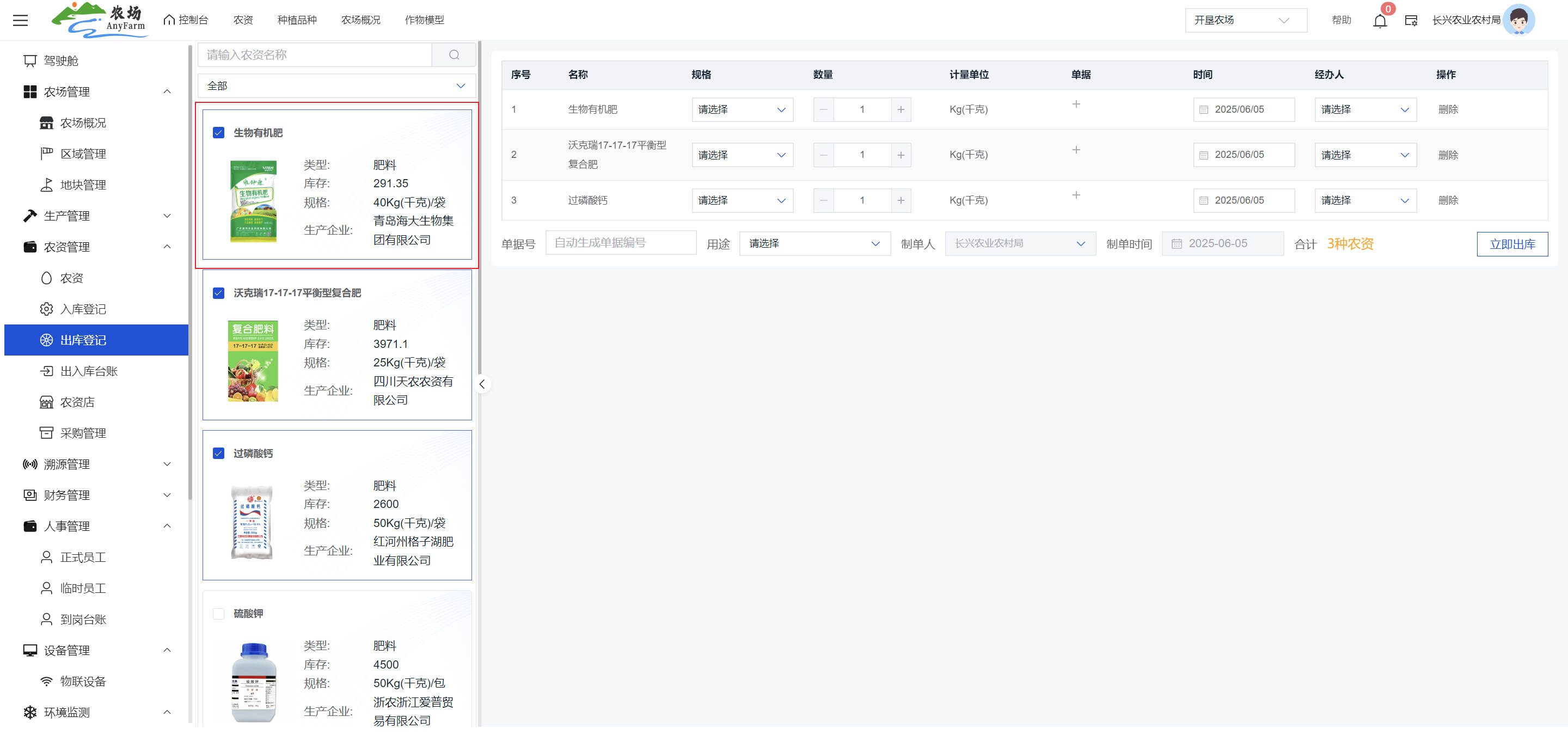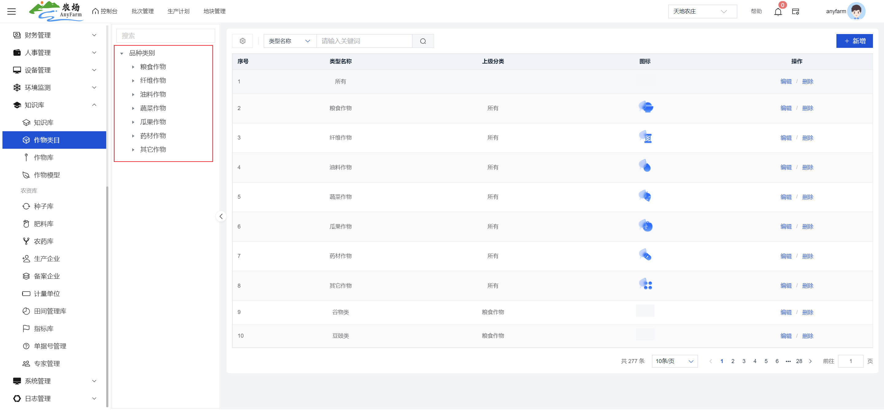 一、平台简介 AnyFarm农场管理平台是利用物联网、大数据、人工智能等现代信息技术,对农业生产进行全方位、全过程的智能化管理和控制。它通过传感器等设备,实时监测农田环境、作物生长、土壤墒情等信息,并通过数据分析和智能决策,实现精准灌溉、施肥、病虫害防治等操作,从而提高农业生产效率,降低资源消耗,保障农产品质量。 二、产品优势 1.全流程数据化管理,提升生产效率: * 优势: * 系统覆盖农场管理的各个环节,实现数据统一采集、存储和分析。 * 通过数据分析,优化生产计划,减少资源浪费,提高生产效率。 * 实时监测农场环境和生产状态,及时发现并解决问题。 * 体现: * 从农场基础信息录入,到生产计划制定,再到农产品溯源,全程数据化管理。 * 通过数据分析,实现精准施肥、精准灌溉等操作,提高资源利用率。 2. 智能化决策支持,降低生产风险: * 优势: * 利用机器学习模型,实现农产品质量预测、产量预测、病虫害预警等功能。 * 为农场管理者提供科学的决策依据,降低生产风险。 * 通过数据分析,预测市场行情,帮助农场及时调整生产策略。 * 体现: * 通过模型训练,预测农产品产量和质量,提前做好准备。 * 通过病虫害预警模型,及时发现并处理病虫害,减少损失。 3. 全程可追溯,保障农产品质量安全: * 优势: * 实现农产品从生产到销售的全程可追溯,保障产品质量安全。 * 消费者可以通过溯源码查询农产品生产信息,增强信任感。 * 提高农产品品牌价值,增强市场竞争力。 * 体现: * 记录农产品生产、加工、检测等信息,并与溯源码关联。 * 消费者可以通过手机扫描溯源码,了解农产品详细信息。 三、业务流程 流程说明: 1. 基础信息管理 * 农场管理: 对已添加的农场进行管理,包括信息修改、删除等操作。 * 员工管理: 录入和管理农场员工信息,包括姓名、工号、职位、联系方式等。 * 区域管理: 划分农场区域,如种植区、养殖区、办公区等,方便后续管理。 * 地块管理: 将农场区域进一步细分为地块,记录地块编号、面积、种植作物等信息。 * 设备管理: 录入和管理农场使用的各种设备,如灌溉设备、施肥设备、监测设备等。 * 计量单位: 设置系统中使用的计量单位,如面积单位、重量单位等。 * 指标库: 建立农产品质量、环境监测等相关指标库,为后续数据分析提供基础。 2. 生产管理 * 添加品种: 录入农场种植或养殖的品种信息,包括品种名称、特性、生长周期等。 * 品种管理: 对已添加的品种进行管理,包括信息修改、删除等操作。 * 添加农资: 录入农场使用的农资信息,如种子、肥料、农药等。 * 农资管理: 对已添加的农资进行管理,包括信息修改、删除等操作。 * 农资店: 如果农场有自己的农资店,则可以录入和管理农资店的信息。 * 农资出入库: 记录农资的出入库情况,实现农资库存管理。 * 生产计划: 制定农场的生产计划,包括种植或养殖时间、产量目标、农资使用计划等。 * 批次管理: 对农产品进行批次管理,记录批次信息、生产过程、质量检测等。 * 生产任务: 根据生产计划,生成具体的生产任务,分配给员工执行。 3. 溯源管理 * 采收管理: 记录农产品的采收情况,包括采收时间、产量、质量等。 * 加工管理: 如果农产品需要进行加工,则记录加工过程和相关信息。 * 检测记录: 记录农产品质量检测、环境监测等数据。 * 赋码管理: 对农产品进行赋码,实现产品溯源。 四、操作指南 4.1农场概况 界面功能概述: 该界面作为农场的首页及控制台界面,为用户呈现了农场的整体概况信息。在这里,用户能够清晰地查看到农场的数量、各个地块的数量、当前在职的员工人数、实时的天气状况等重要信息。同时,该界面还为用户提供了便捷的操作入口,例如可以进行农场的管理操作以及新增员工等常用功能,方便用户对农场的基本信息进行快速的了解和管理。  4.1.1.1 农场概况 界面功能概述: 用户可以点击标红的地方跳转到农场管理跳转到农场管理界面。  用户点击界面中标红的区域即可跳转到农场管理界面。在该界面中,用户可以全面了解农场的各项详细信息,如农场的占地面积、具体的种植区域划分、在职员工的数量及基本信息、各类设备的运行情况、今日和明日的农事安排等。这些信息的展示有助于用户对农场的整体运营状况有一个清晰的认识,同时也为后续的管理决策提供了有力的数据支持。此外,用户还可以在该界面进行一些基础的管理操作,如编辑农场的基本信息、调整设备的设置等,以确保农场的各项工作能够顺利进行。  4.1.1.2 农场农事 界面功能概述: 用户可以通过这里看到该农场的农事情况,例如施药、灌溉、施肥等常见的农事活动。  4.1.1.3 新增用户 界面元素功能概述: 该界面主要用于用户进行新增用户以及添加用户权限的操作。在农场的日常运营中,可能需要不断添加新的员工或管理人员,并为他们分配相应的权限,以便他们能够顺利地完成各自的工作任务。通过该界面,用户可以方便地完成这些操作,确保农场的人力资源管理更加高效和有序。  左侧搜索栏 :此搜索栏为用户提供了一个便捷的方式,允许用户在输入框内输入关键字,例如部门名称的关键词,从而快速搜索到特定的部门。这对于拥有多个部门的大型农场来说,能够大大提高用户查找部门的效率,节省时间。 顶部搜索栏:在这里,用户可以在输入框内