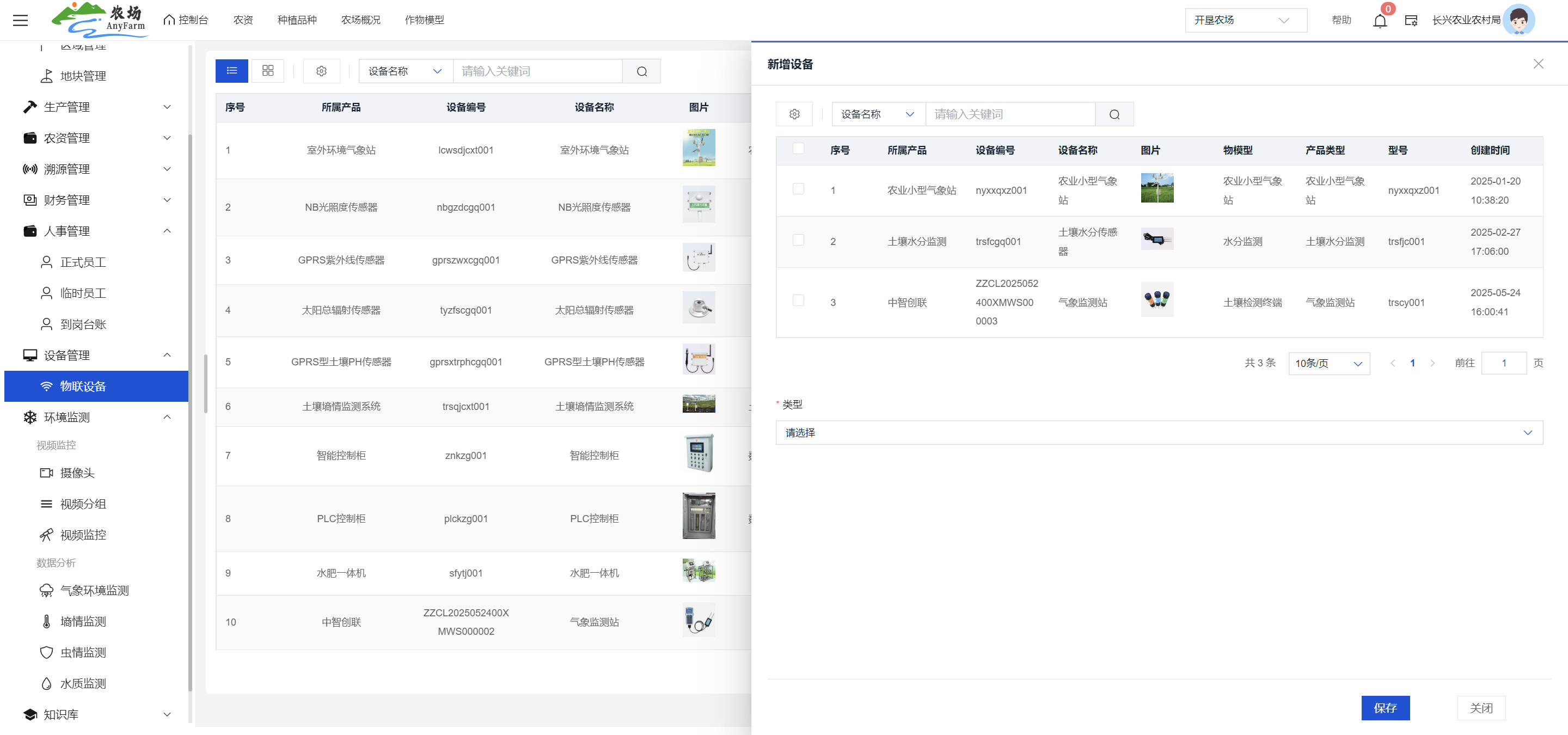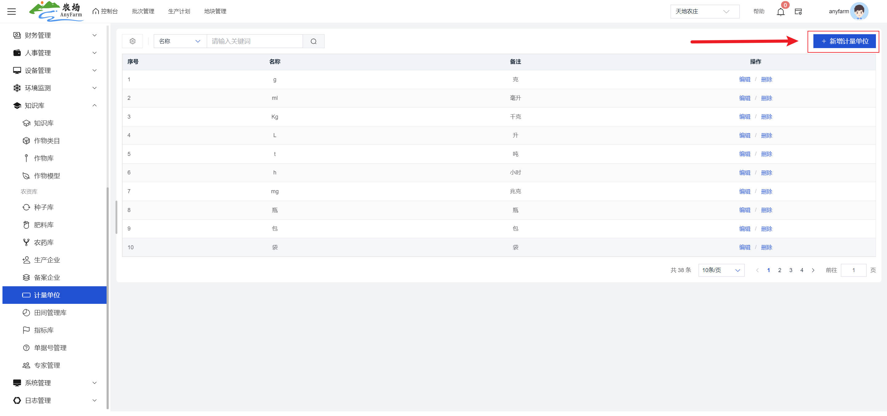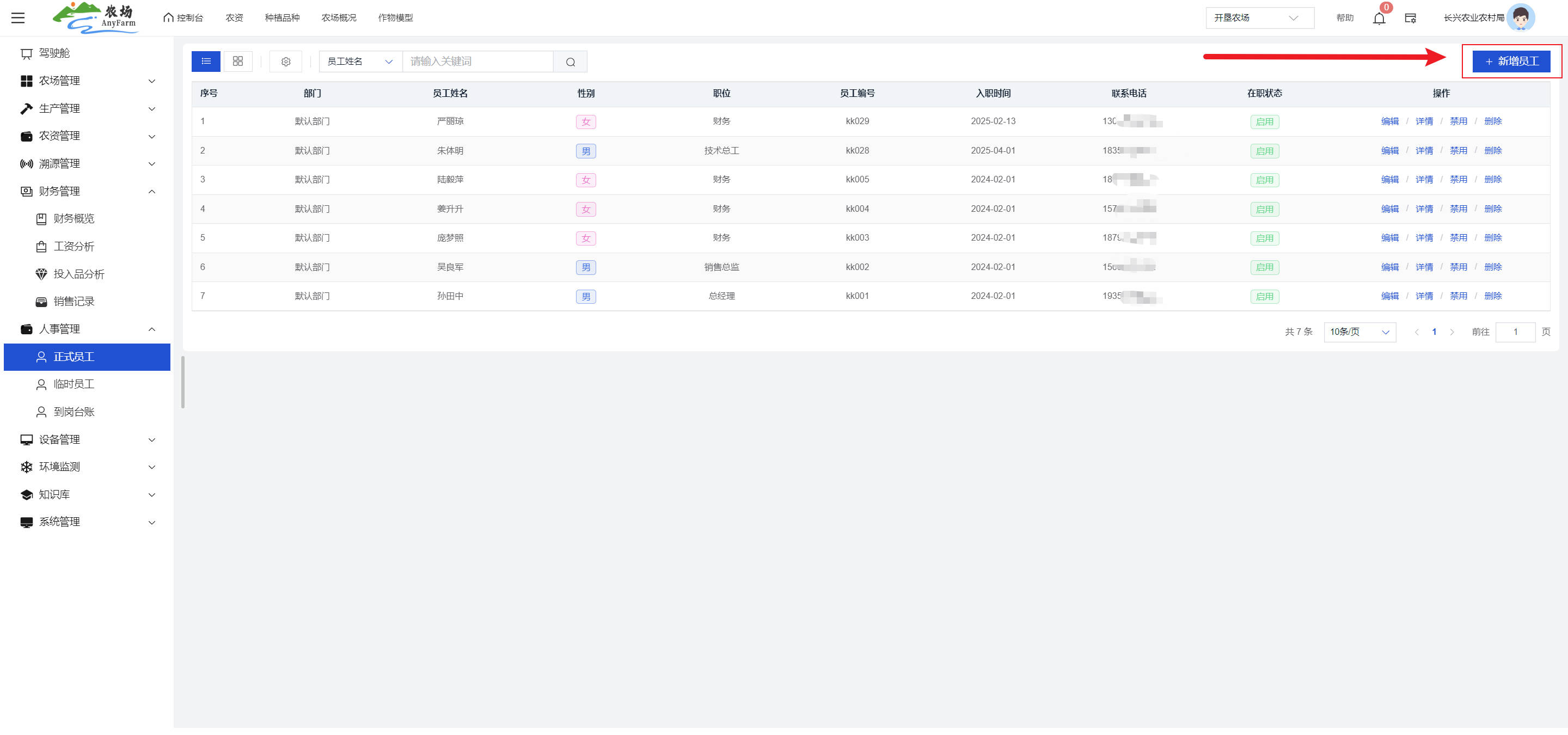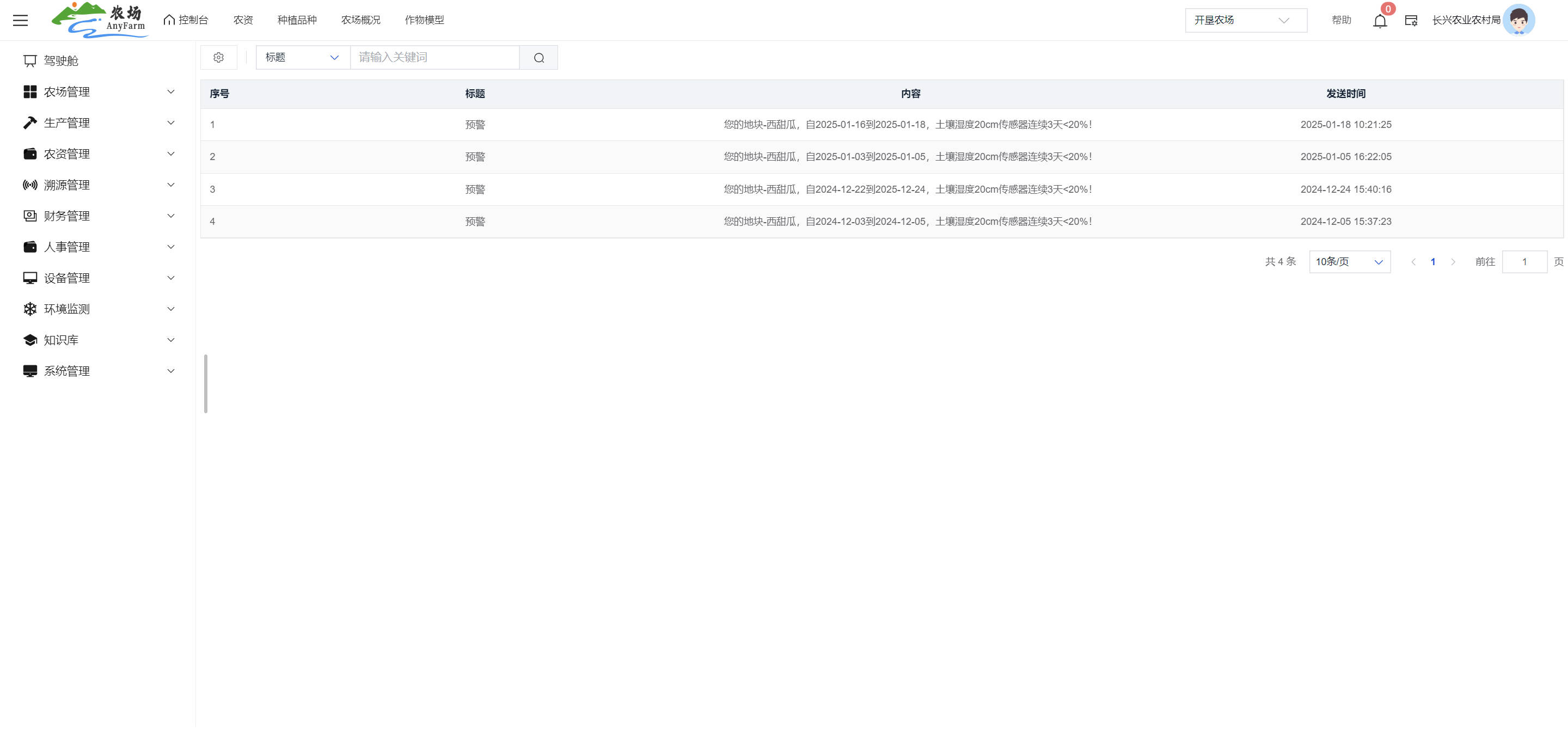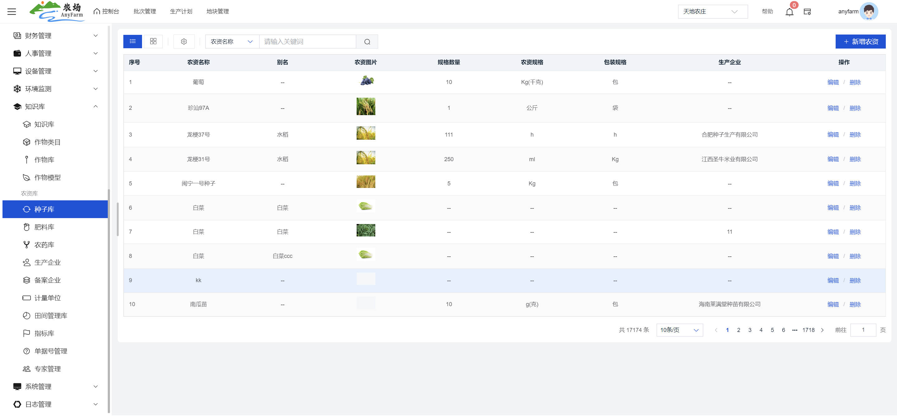 一、平台简介 AnyFarm农场管理平台是利用物联网、大数据、人工智能等现代信息技术,对农业生产进行全方位、全过程的智能化管理和控制。它通过传感器等设备,实时监测农田环境、作物生长、土壤墒情等信息,并通过数据分析和智能决策,实现精准灌溉、施肥、病虫害防治等操作,从而提高农业生产效率,降低资源消耗,保障农产品质量。 二、产品优势 1.全流程数据化管理,提升生产效率: * 优势: * 系统覆盖农场管理的各个环节,实现数据统一采集、存储和分析。 * 通过数据分析,优化生产计划,减少资源浪费,提高生产效率。 * 实时监测农场环境和生产状态,及时发现并解决问题。 * 体现: * 从农场基础信息录入,到生产计划制定,再到农产品溯源,全程数据化管理。 * 通过数据分析,实现精准施肥、精准灌溉等操作,提高资源利用率。 2. 智能化决策支持,降低生产风险: * 优势: * 利用机器学习模型,实现农产品质量预测、产量预测、病虫害预警等功能。 * 为农场管理者提供科学的决策依据,降低生产风险。 * 通过数据分析,预测市场行情,帮助农场及时调整生产策略。 * 体现: * 通过模型训练,预测农产品产量和质量,提前做好准备。 * 通过病虫害预警模型,及时发现并处理病虫害,减少损失。 3. 全程可追溯,保障农产品质量安全: * 优势: * 实现农产品从生产到销售的全程可追溯,保障产品质量安全。 * 消费者可以通过溯源码查询农产品生产信息,增强信任感。 * 提高农产品品牌价值,增强市场竞争力。 * 体现: * 记录农产品生产、加工、检测等信息,并与溯源码关联。 * 消费者可以通过手机扫描溯源码,了解农产品详细信息。 三、业务流程 流程说明: 1. 基础信息管理 * 农场管理: 对已添加的农场进行管理,包括信息修改、删除等操作。 * 员工管理: 录入和管理农场员工信息,包括姓名、工号、职位、联系方式等。 * 区域管理: 划分农场区域,如种植区、养殖区、办公区等,方便后续管理。 * 地块管理: 将农场区域进一步细分为地块,记录地块编号、面积、种植作物等信息。 * 设备管理: 录入和管理农场使用的各种设备,如灌溉设备、施肥设备、监测设备等。 * 计量单位: 设置系统中使用的计量单位,如面积单位、重量单位等。 * 指标库: 建立农产品质量、环境监测等相关指标库,为后续数据分析提供基础。 2. 生产管理 * 添加品种: 录入农场种植或养殖的品种信息,包括品种名称、特性、生长周期等。 * 品种管理: 对已添加的品种进行管理,包括信息修改、删除等操作。 * 添加农资: 录入农场使用的农资信息,如种子、肥料、农药等。 * 农资管理: 对已添加的农资进行管理,包括信息修改、删除等操作。 * 农资店: 如果农场有自己的农资店,则可以录入和管理农资店的信息。 * 农资出入库: 记录农资的出入库情况,实现农资库存管理。 * 生产计划: 制定农场的生产计划,包括种植或养殖时间、产量目标、农资使用计划等。 * 批次管理: 对农产品进行批次管理,记录批次信息、生产过程、质量检测等。 * 生产任务: 根据生产计划,生成具体的生产任务,分配给员工执行。 3. 溯源管理 * 采收管理: 记录农产品的采收情况,包括采收时间、产量、质量等。 * 加工管理: 如果农产品需要进行加工,则记录加工过程和相关信息。 * 检测记录: 记录农产品质量检测、环境监测等数据。 * 赋码管理: 对农产品进行赋码,实现产品溯源。 四、操作指南 4.1农场概况 界面功能概述: 该界面作为农场的首页及控制台界面,为用户呈现了农场的整体概况信息。在这里,用户能够清晰地查看到农场的数量、各个地块的数量、当前在职的员工人数、实时的天气状况等重要信息。同时,该界面还为用户提供了便捷的操作入口,例如可以进行农场的管理操作以及新增员工等常用功能,方便用户对农场的基本信息进行快速的了解和管理。  4.1.1.1 农场概况 界面功能概述: 用户可以点击标红的地方跳转到农场管理跳转到农场管理界面。  用户点击界面中标红的区域即可跳转到农场管理界面。在该界面中,用户可以全面了解农场的各项详细信息,如农场的占地面积、具体的种植区域划分、在职员工的数量及基本信息、各类设备的运行情况、今日和明日的农事安排等。这些信息的展示有助于用户对农场的整体运营状况有一个清晰的认识,同时也为后续的管理决策提供了有力的数据支持。此外,用户还可以在该界面进行一些基础的管理操作,如编辑农场的基本信息、调整设备的设置等,以确保农场的各项工作能够顺利进行。  4.1.1.2 农场农事 界面功能概述: 用户可以通过这里看到该农场的农事情况,例如施药、灌溉、施肥等常见的农事活动。  4.1.1.3 新增用户 界面元素功能概述: 该界面主要用于用户进行新增用户以及添加用户权限的操作。在农场的日常运营中,可能需要不断添加新的员工或管理人员,并为他们分配相应的权限,以便他们能够顺利地完成各自的工作任务。通过该界面,用户可以方便地完成这些操作,确保农场的人力资源管理更加高效和有序。  左侧搜索栏 :此搜索栏为用户提供了一个便捷的方式,允许用户在输入框内输入关键字,例如部门名称的关键词,从而快速搜索到特定的部门。这对于拥有多个部门的大型农场来说,能够大大提高用户查找部门的效率,节省时间。 顶部搜索栏:在这里,用户可以在输入框内