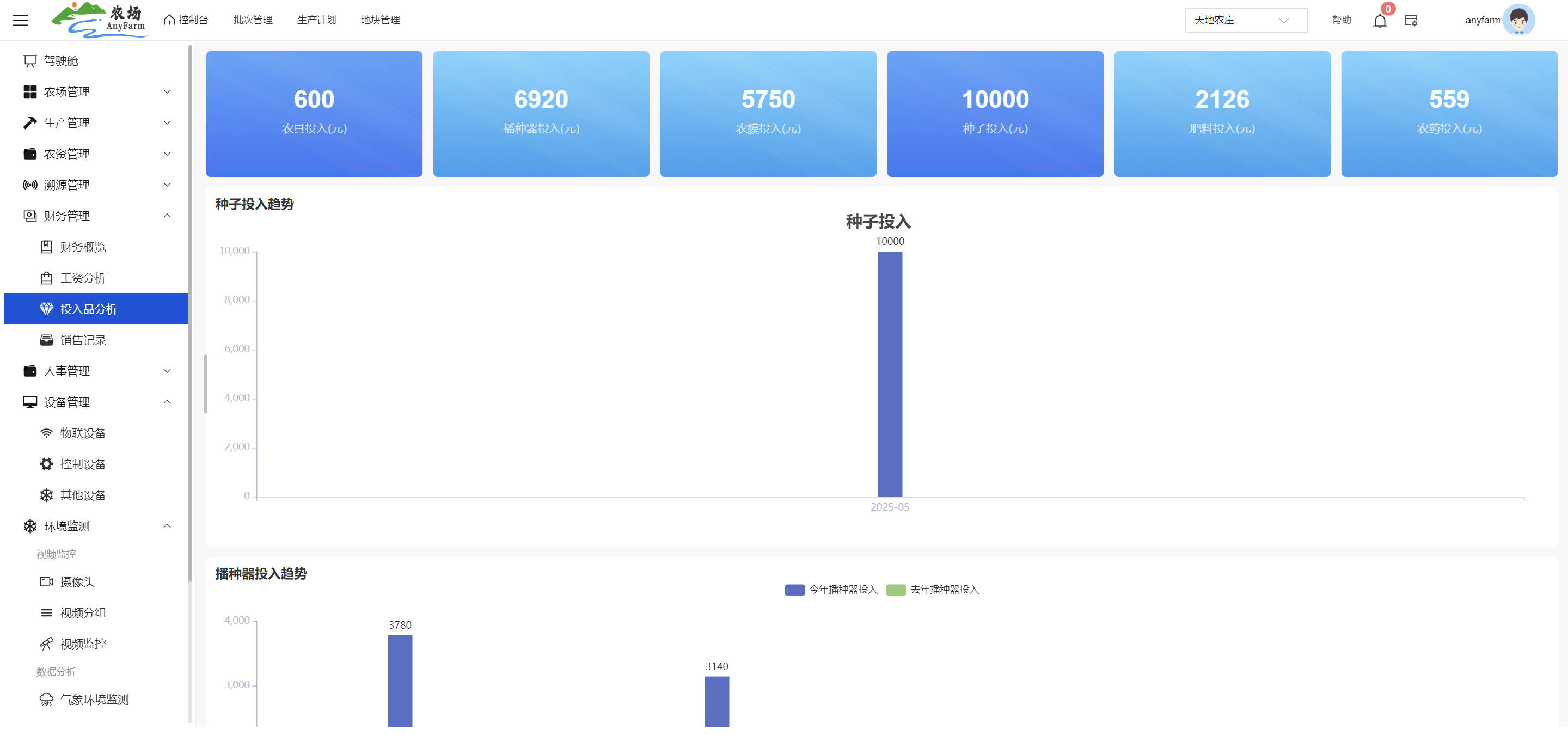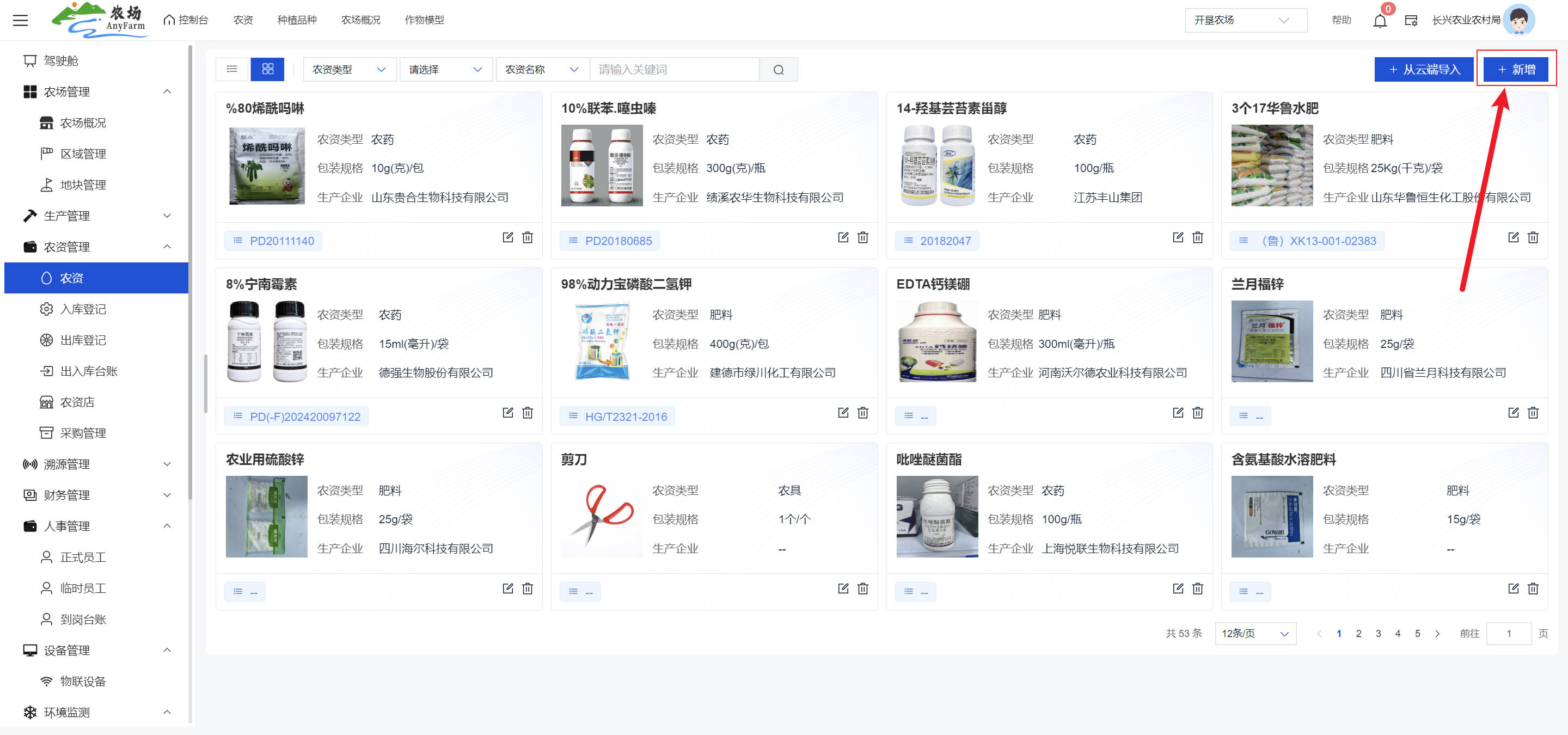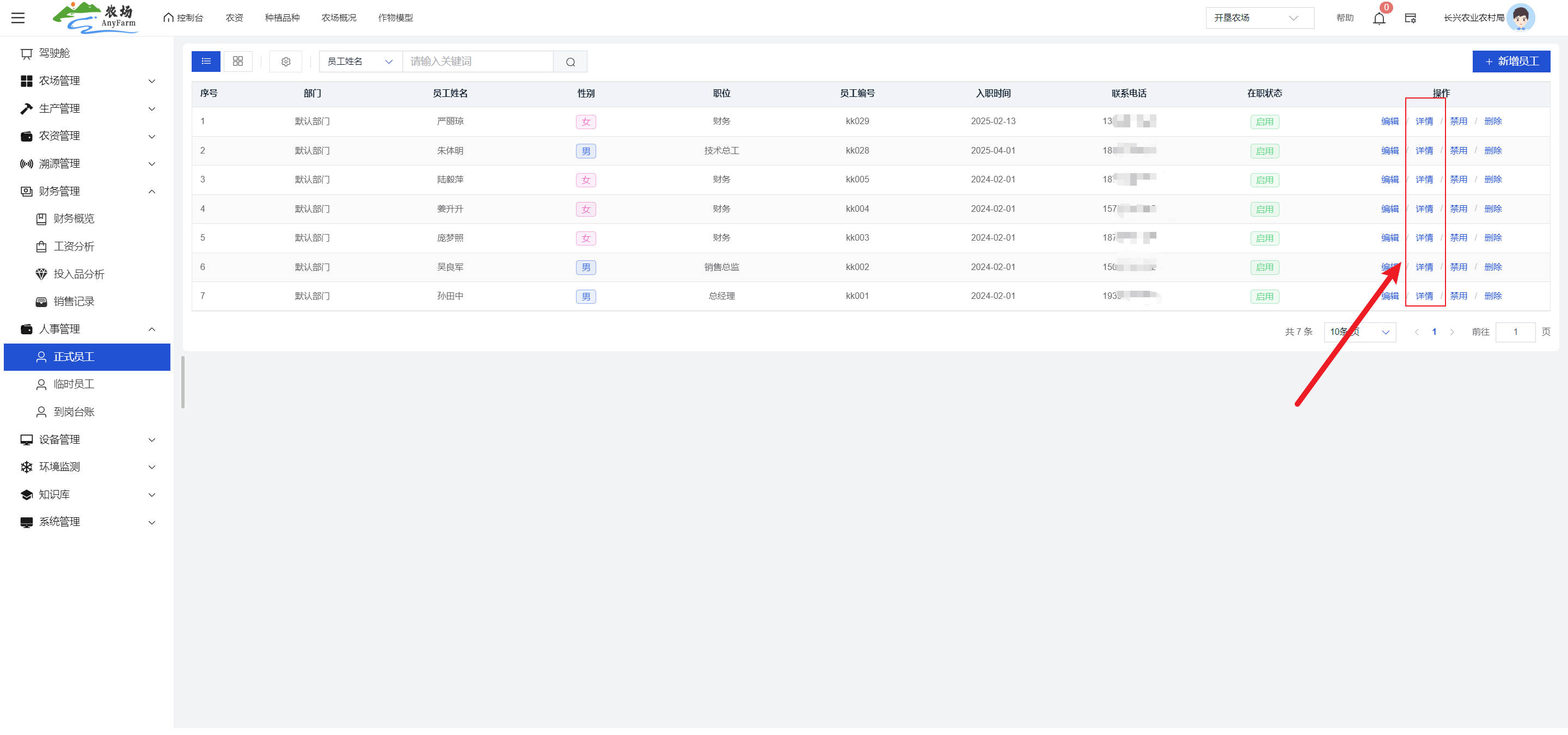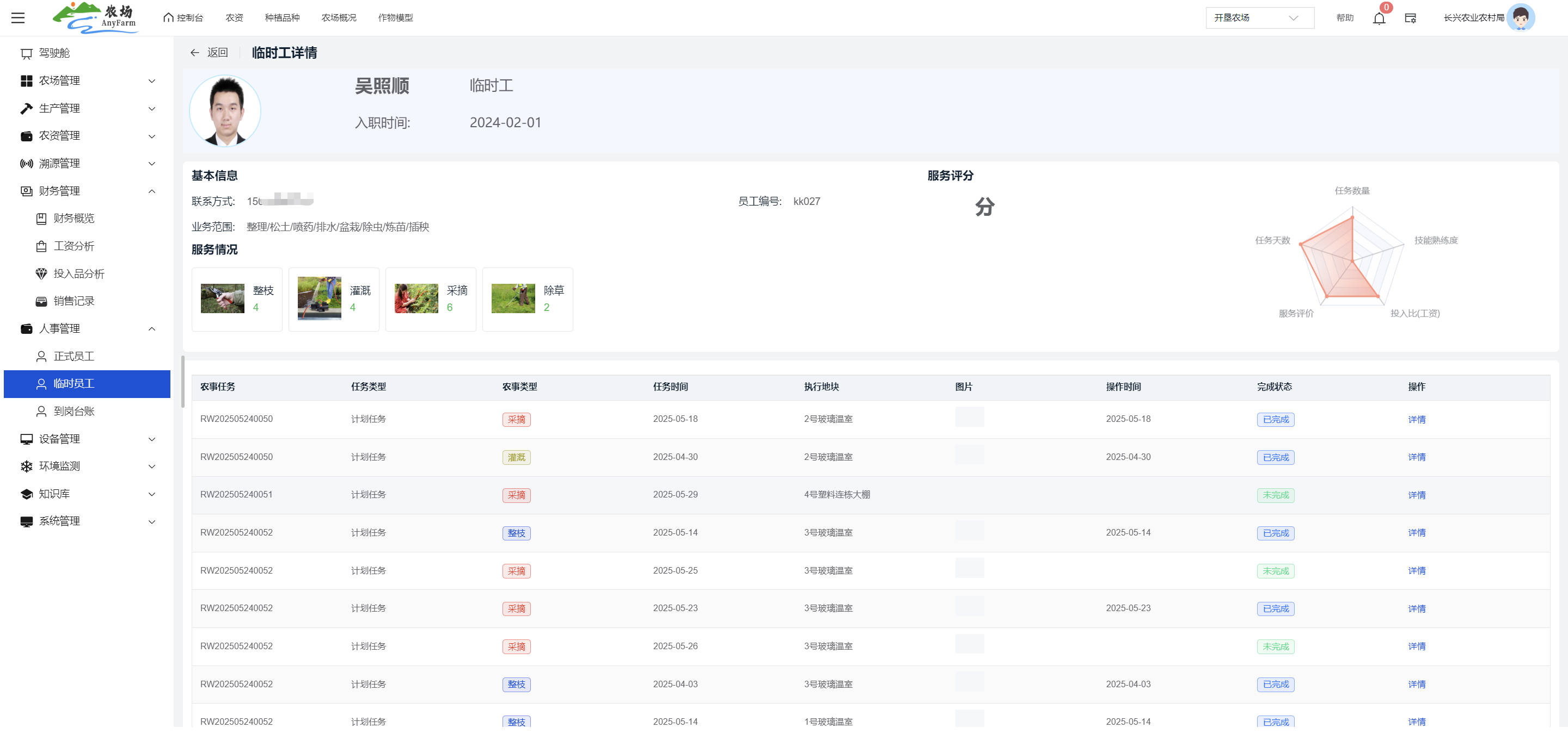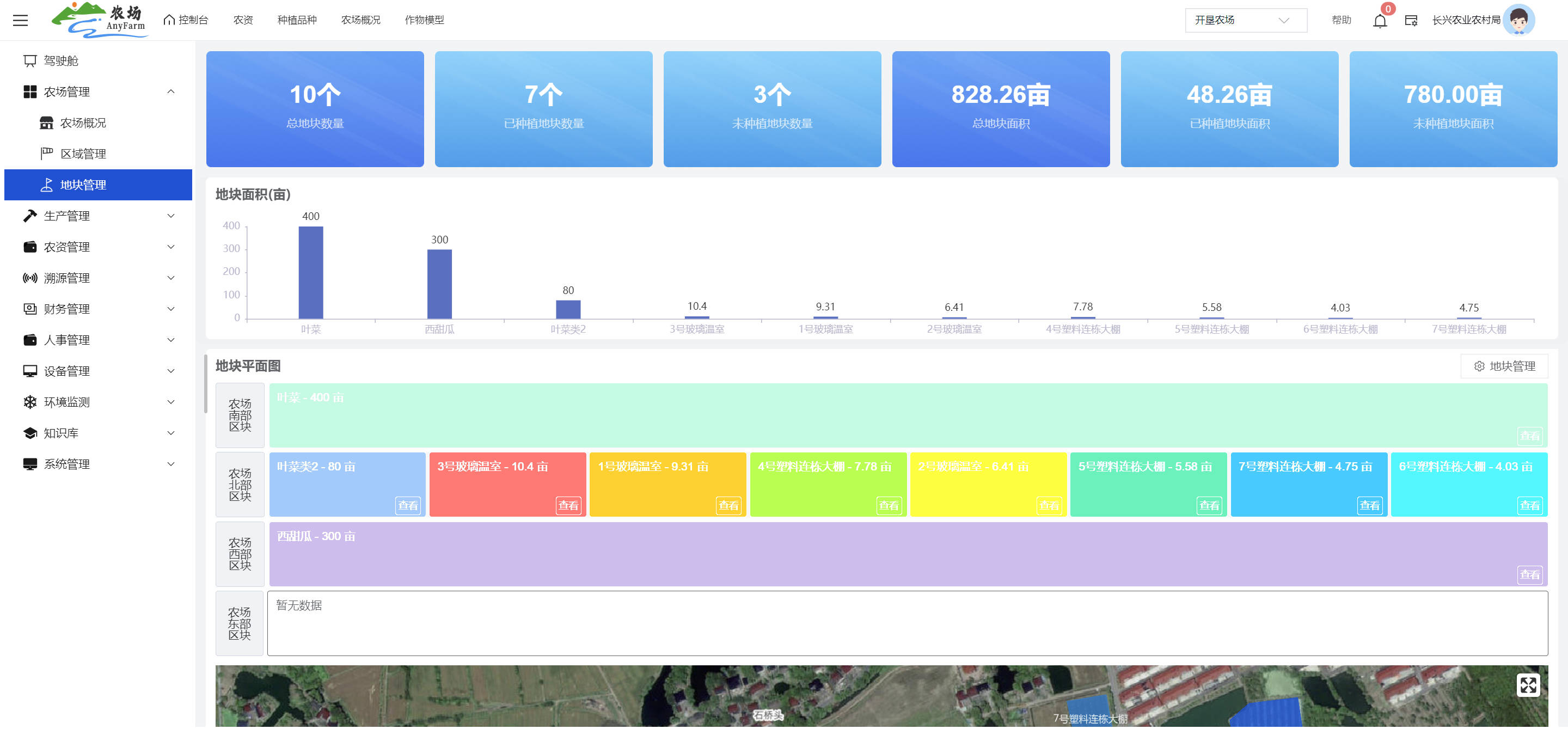 一、平台简介 AnyFarm农场管理平台是利用物联网、大数据、人工智能等现代信息技术,对农业生产进行全方位、全过程的智能化管理和控制。它通过传感器等设备,实时监测农田环境、作物生长、土壤墒情等信息,并通过数据分析和智能决策,实现精准灌溉、施肥、病虫害防治等操作,从而提高农业生产效率,降低资源消耗,保障农产品质量。 二、产品优势 1.全流程数据化管理,提升生产效率: * 优势: * 系统覆盖农场管理的各个环节,实现数据统一采集、存储和分析。 * 通过数据分析,优化生产计划,减少资源浪费,提高生产效率。 * 实时监测农场环境和生产状态,及时发现并解决问题。 * 体现: * 从农场基础信息录入,到生产计划制定,再到农产品溯源,全程数据化管理。 * 通过数据分析,实现精准施肥、精准灌溉等操作,提高资源利用率。 2. 智能化决策支持,降低生产风险: * 优势: * 利用机器学习模型,实现农产品质量预测、产量预测、病虫害预警等功能。 * 为农场管理者提供科学的决策依据,降低生产风险。 * 通过数据分析,预测市场行情,帮助农场及时调整生产策略。 * 体现: * 通过模型训练,预测农产品产量和质量,提前做好准备。 * 通过病虫害预警模型,及时发现并处理病虫害,减少损失。 3. 全程可追溯,保障农产品质量安全: * 优势: * 实现农产品从生产到销售的全程可追溯,保障产品质量安全。 * 消费者可以通过溯源码查询农产品生产信息,增强信任感。 * 提高农产品品牌价值,增强市场竞争力。 * 体现: * 记录农产品生产、加工、检测等信息,并与溯源码关联。 * 消费者可以通过手机扫描溯源码,了解农产品详细信息。 三、业务流程 流程说明: 1. 基础信息管理 * 农场管理: 对已添加的农场进行管理,包括信息修改、删除等操作。 * 员工管理: 录入和管理农场员工信息,包括姓名、工号、职位、联系方式等。 * 区域管理: 划分农场区域,如种植区、养殖区、办公区等,方便后续管理。 * 地块管理: 将农场区域进一步细分为地块,记录地块编号、面积、种植作物等信息。 * 设备管理: 录入和管理农场使用的各种设备,如灌溉设备、施肥设备、监测设备等。 * 计量单位: 设置系统中使用的计量单位,如面积单位、重量单位等。 * 指标库: 建立农产品质量、环境监测等相关指标库,为后续数据分析提供基础。 2. 生产管理 * 添加品种: 录入农场种植或养殖的品种信息,包括品种名称、特性、生长周期等。 * 品种管理: 对已添加的品种进行管理,包括信息修改、删除等操作。 * 添加农资: 录入农场使用的农资信息,如种子、肥料、农药等。 * 农资管理: 对已添加的农资进行管理,包括信息修改、删除等操作。 * 农资店: 如果农场有自己的农资店,则可以录入和管理农资店的信息。 * 农资出入库: 记录农资的出入库情况,实现农资库存管理。 * 生产计划: 制定农场的生产计划,包括种植或养殖时间、产量目标、农资使用计划等。 * 批次管理: 对农产品进行批次管理,记录批次信息、生产过程、质量检测等。 * 生产任务: 根据生产计划,生成具体的生产任务,分配给员工执行。 3. 溯源管理 * 采收管理: 记录农产品的采收情况,包括采收时间、产量、质量等。 * 加工管理: 如果农产品需要进行加工,则记录加工过程和相关信息。 * 检测记录: 记录农产品质量检测、环境监测等数据。 * 赋码管理: 对农产品进行赋码,实现产品溯源。 四、操作指南 4.1农场概况 界面功能概述: 该界面作为农场的首页及控制台界面,为用户呈现了农场的整体概况信息。在这里,用户能够清晰地查看到农场的数量、各个地块的数量、当前在职的员工人数、实时的天气状况等重要信息。同时,该界面还为用户提供了便捷的操作入口,例如可以进行农场的管理操作以及新增员工等常用功能,方便用户对农场的基本信息进行快速的了解和管理。  4.1.1.1 农场概况 界面功能概述: 用户可以点击标红的地方跳转到农场管理跳转到农场管理界面。  用户点击界面中标红的区域即可跳转到农场管理界面。在该界面中,用户可以全面了解农场的各项详细信息,如农场的占地面积、具体的种植区域划分、在职员工的数量及基本信息、各类设备的运行情况、今日和明日的农事安排等。这些信息的展示有助于用户对农场的整体运营状况有一个清晰的认识,同时也为后续的管理决策提供了有力的数据支持。此外,用户还可以在该界面进行一些基础的管理操作,如编辑农场的基本信息、调整设备的设置等,以确保农场的各项工作能够顺利进行。  4.1.1.2 农场农事 界面功能概述: 用户可以通过这里看到该农场的农事情况,例如施药、灌溉、施肥等常见的农事活动。  4.1.1.3 新增用户 界面元素功能概述: 该界面主要用于用户进行新增用户以及添加用户权限的操作。在农场的日常运营中,可能需要不断添加新的员工或管理人员,并为他们分配相应的权限,以便他们能够顺利地完成各自的工作任务。通过该界面,用户可以方便地完成这些操作,确保农场的人力资源管理更加高效和有序。  左侧搜索栏 :此搜索栏为用户提供了一个便捷的方式,允许用户在输入框内输入关键字,例如部门名称的关键词,从而快速搜索到特定的部门。这对于拥有多个部门的大型农场来说,能够大大提高用户查找部门的效率,节省时间。 顶部搜索栏:在这里,用户可以在输入框内