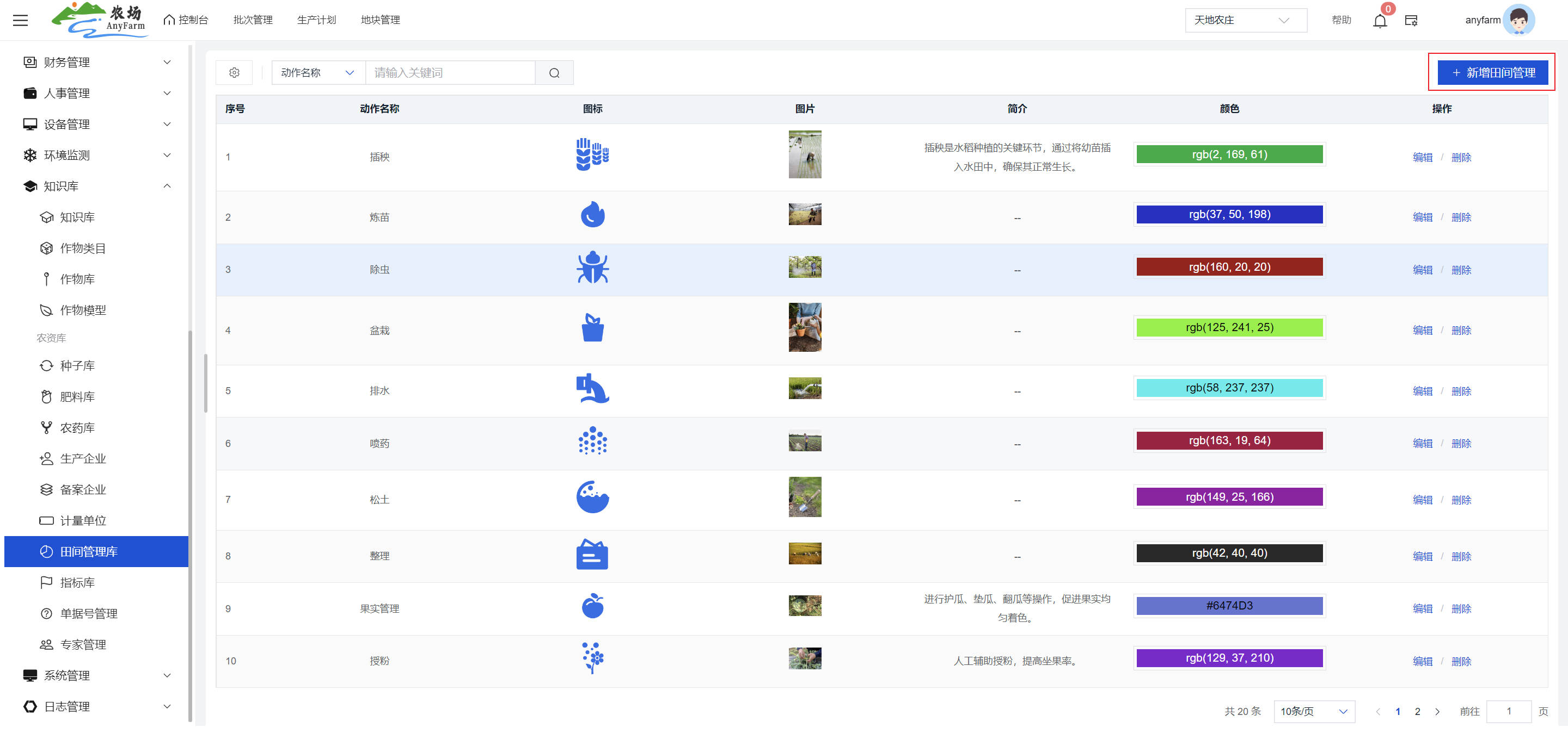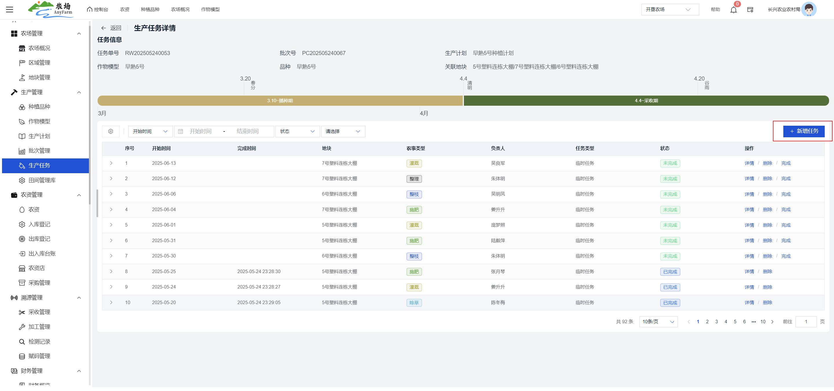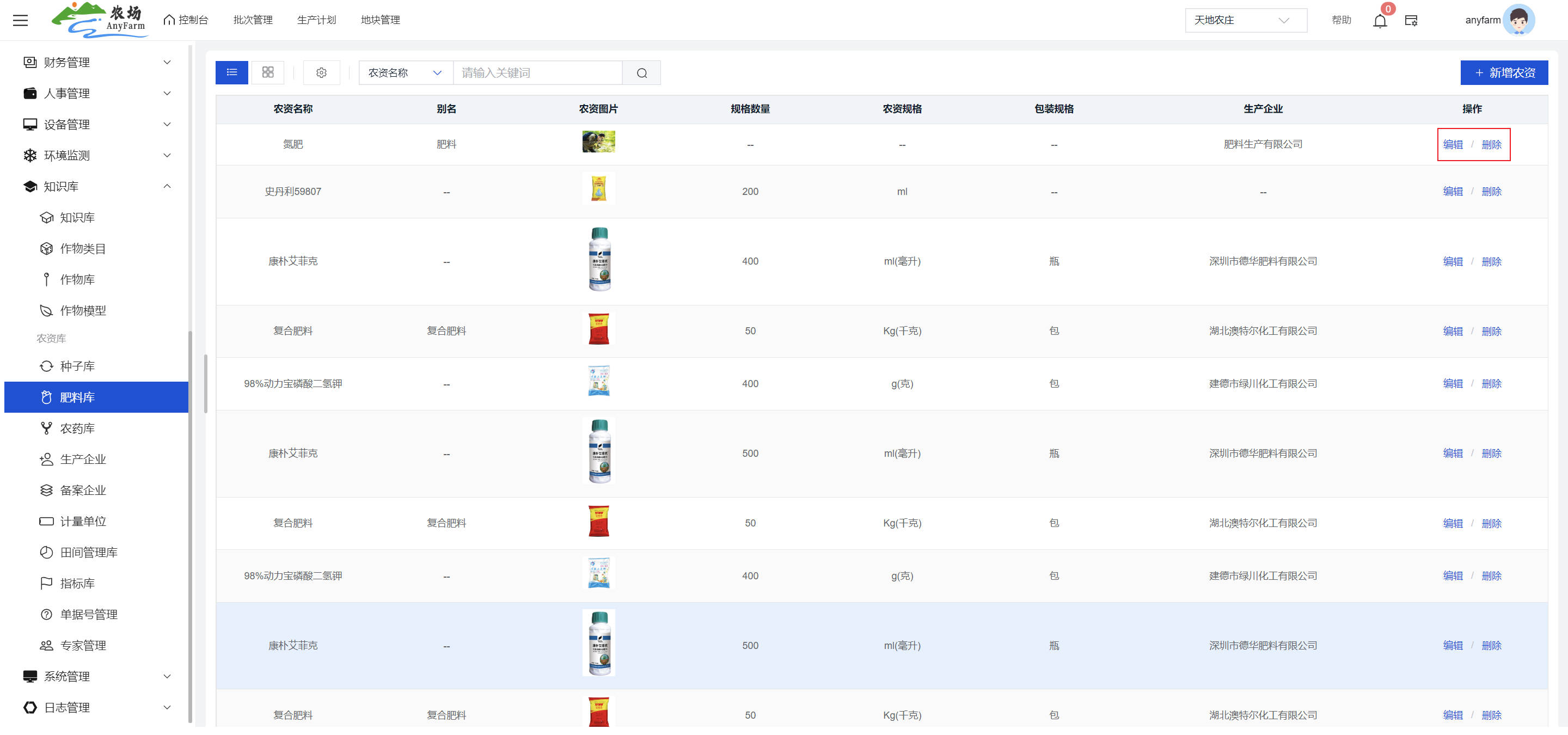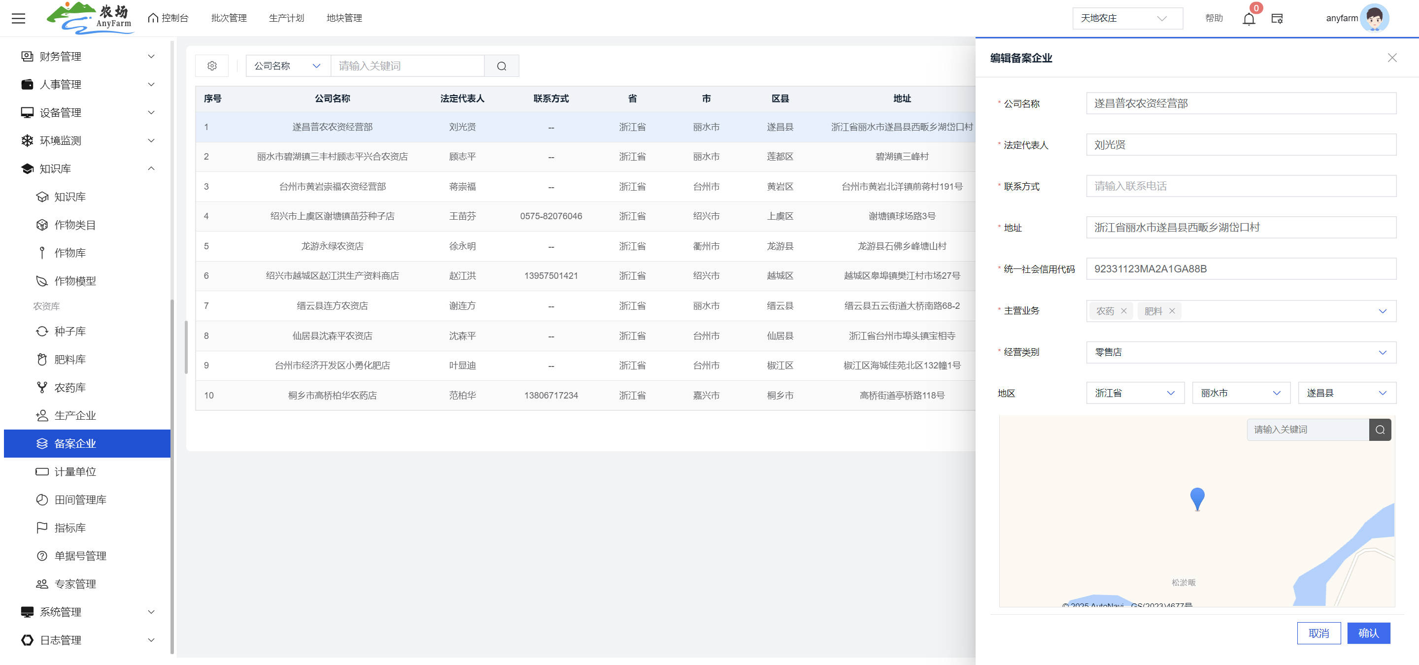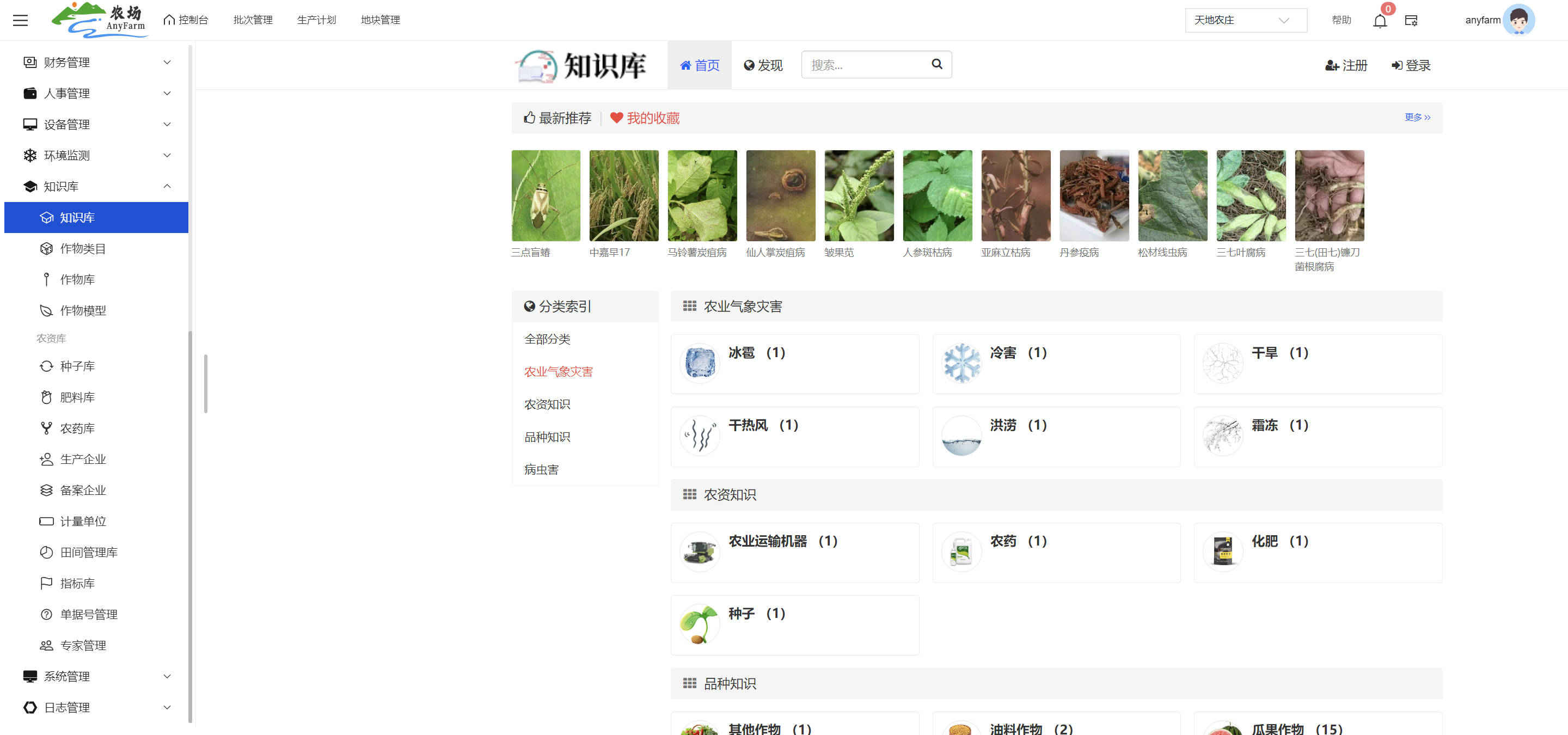一、平台简介 AnyFarm农场管理平台是利用物联网、大数据、人工智能等现代信息技术,对农业生产进行全方位、全过程的智能化管理和控制。它通过传感器等设备,实时监测农田环境、作物生长、土壤墒情等信息,并通过数据分析和智能决策,实现精准灌溉、施肥、病虫害防治等操作,从而提高农业生产效率,降低资源消耗,保障农产品质量。 二、产品优势 1.全流程数据化管理,提升生产效率: * 优势: * 系统覆盖农场管理的各个环节,实现数据统一采集、存储和分析。 * 通过数据分析,优化生产计划,减少资源浪费,提高生产效率。 * 实时监测农场环境和生产状态,及时发现并解决问题。 * 体现: * 从农场基础信息录入,到生产计划制定,再到农产品溯源,全程数据化管理。 * 通过数据分析,实现精准施肥、精准灌溉等操作,提高资源利用率。 2. 智能化决策支持,降低生产风险: * 优势: * 利用机器学习模型,实现农产品质量预测、产量预测、病虫害预警等功能。 * 为农场管理者提供科学的决策依据,降低生产风险。 * 通过数据分析,预测市场行情,帮助农场及时调整生产策略。 * 体现: * 通过模型训练,预测农产品产量和质量,提前做好准备。 * 通过病虫害预警模型,及时发现并处理病虫害,减少损失。 3. 全程可追溯,保障农产品质量安全: * 优势: * 实现农产品从生产到销售的全程可追溯,保障产品质量安全。 * 消费者可以通过溯源码查询农产品生产信息,增强信任感。 * 提高农产品品牌价值,增强市场竞争力。 * 体现: * 记录农产品生产、加工、检测等信息,并与溯源码关联。 * 消费者可以通过手机扫描溯源码,了解农产品详细信息。 三、业务流程 流程说明: 1. 基础信息管理 * 农场管理: 对已添加的农场进行管理,包括信息修改、删除等操作。 * 员工管理: 录入和管理农场员工信息,包括姓名、工号、职位、联系方式等。 * 区域管理: 划分农场区域,如种植区、养殖区、办公区等,方便后续管理。 * 地块管理: 将农场区域进一步细分为地块,记录地块编号、面积、种植作物等信息。 * 设备管理: 录入和管理农场使用的各种设备,如灌溉设备、施肥设备、监测设备等。 * 计量单位: 设置系统中使用的计量单位,如面积单位、重量单位等。 * 指标库: 建立农产品质量、环境监测等相关指标库,为后续数据分析提供基础。 2. 生产管理 * 添加品种: 录入农场种植或养殖的品种信息,包括品种名称、特性、生长周期等。 * 品种管理: 对已添加的品种进行管理,包括信息修改、删除等操作。 * 添加农资: 录入农场使用的农资信息,如种子、肥料、农药等。 * 农资管理: 对已添加的农资进行管理,包括信息修改、删除等操作。 * 农资店: 如果农场有自己的农资店,则可以录入和管理农资店的信息。 * 农资出入库: 记录农资的出入库情况,实现农资库存管理。 * 生产计划: 制定农场的生产计划,包括种植或养殖时间、产量目标、农资使用计划等。 * 批次管理: 对农产品进行批次管理,记录批次信息、生产过程、质量检测等。 * 生产任务: 根据生产计划,生成具体的生产任务,分配给员工执行。 3. 溯源管理 * 采收管理: 记录农产品的采收情况,包括采收时间、产量、质量等。 * 加工管理: 如果农产品需要进行加工,则记录加工过程和相关信息。 * 检测记录: 记录农产品质量检测、环境监测等数据。 * 赋码管理: 对农产品进行赋码,实现产品溯源。 四、操作指南 4.1农场概况 界面功能概述: 该界面作为农场的首页及控制台界面,为用户呈现了农场的整体概况信息。在这里,用户能够清晰地查看到农场的数量、各个地块的数量、当前在职的员工人数、实时的天气状况等重要信息。同时,该界面还为用户提供了便捷的操作入口,例如可以进行农场的管理操作以及新增员工等常用功能,方便用户对农场的基本信息进行快速的了解和管理。  4.1.1.1 农场概况 界面功能概述: 用户可以点击标红的地方跳转到农场管理跳转到农场管理界面。  用户点击界面中标红的区域即可跳转到农场管理界面。在该界面中,用户可以全面了解农场的各项详细信息,如农场的占地面积、具体的种植区域划分、在职员工的数量及基本信息、各类设备的运行情况、今日和明日的农事安排等。这些信息的展示有助于用户对农场的整体运营状况有一个清晰的认识,同时也为后续的管理决策提供了有力的数据支持。此外,用户还可以在该界面进行一些基础的管理操作,如编辑农场的基本信息、调整设备的设置等,以确保农场的各项工作能够顺利进行。  4.1.1.2 农场农事 界面功能概述: 用户可以通过这里看到该农场的农事情况,例如施药、灌溉、施肥等常见的农事活动。  4.1.1.3 新增用户 界面元素功能概述: 该界面主要用于用户进行新增用户以及添加用户权限的操作。在农场的日常运营中,可能需要不断添加新的员工或管理人员,并为他们分配相应的权限,以便他们能够顺利地完成各自的工作任务。通过该界面,用户可以方便地完成这些操作,确保农场的人力资源管理更加高效和有序。  左侧搜索栏 :此搜索栏为用户提供了一个便捷的方式,允许用户在输入框内输入关键字,例如部门名称的关键词,从而快速搜索到特定的部门。这对于拥有多个部门的大型农场来说,能够大大提高用户查找部门的效率,节省时间。 顶部搜索栏:在这里,用户可以在输入框内
