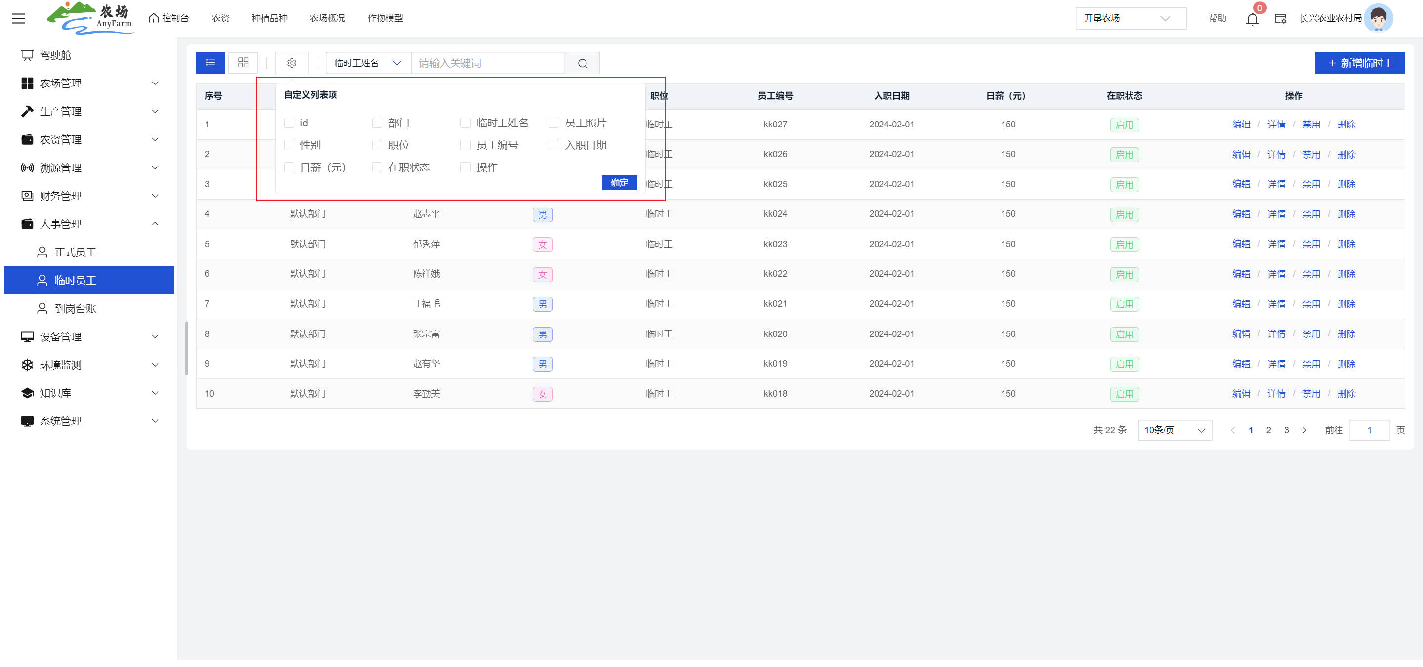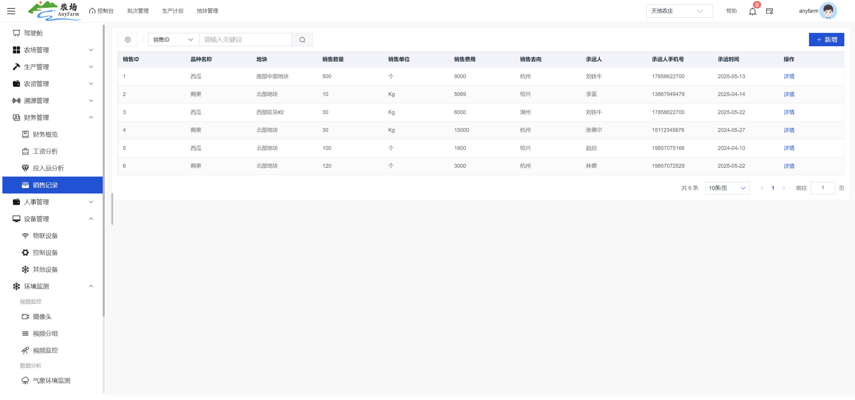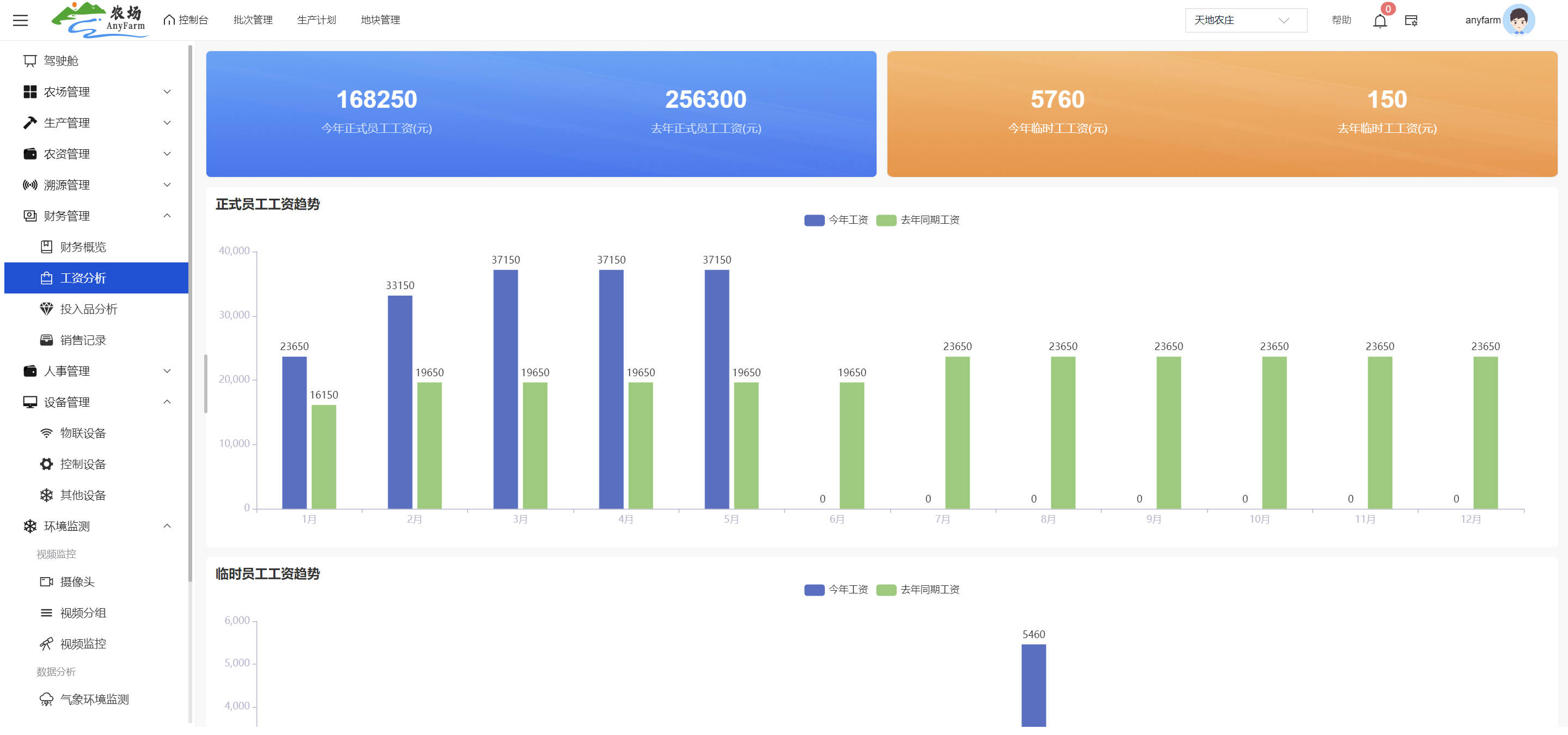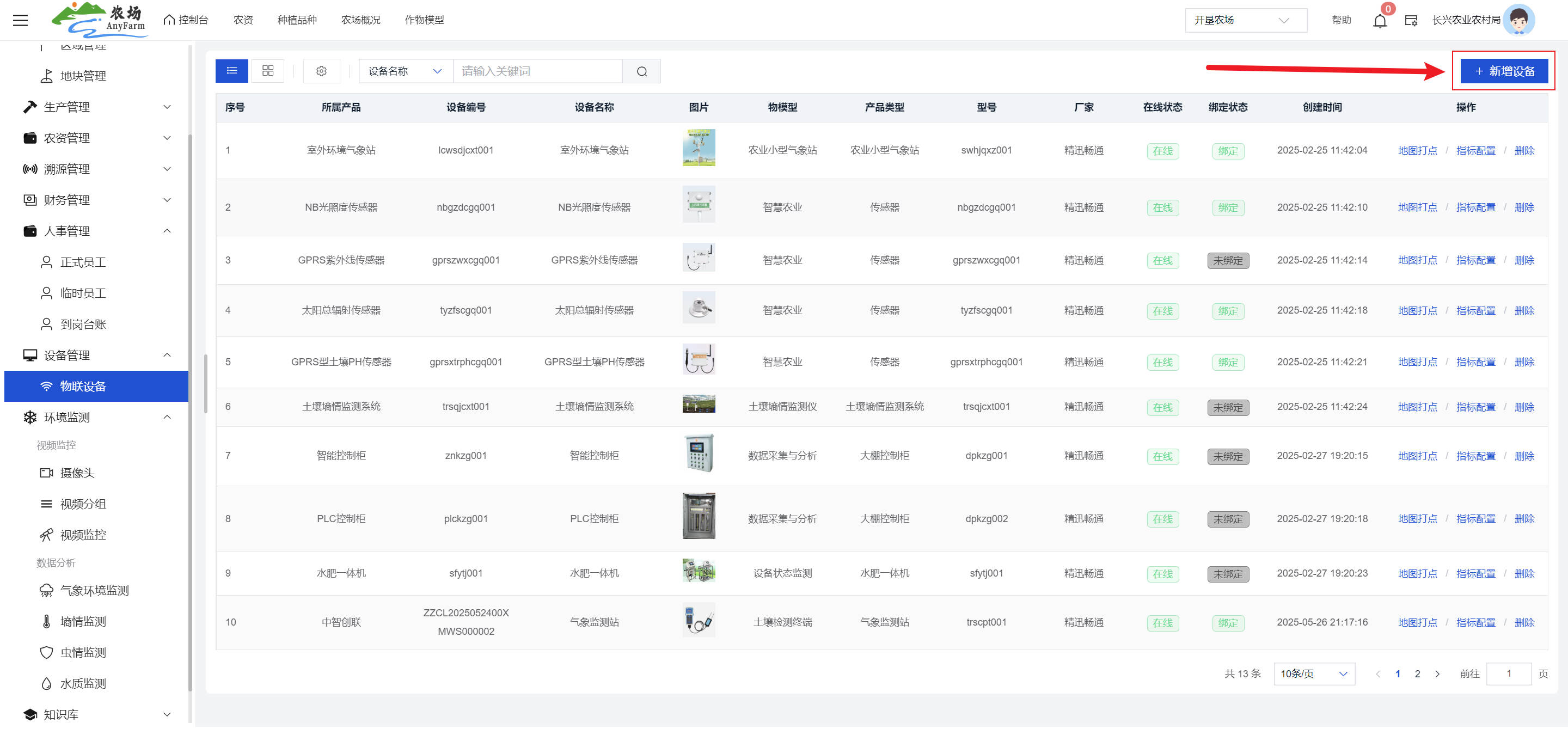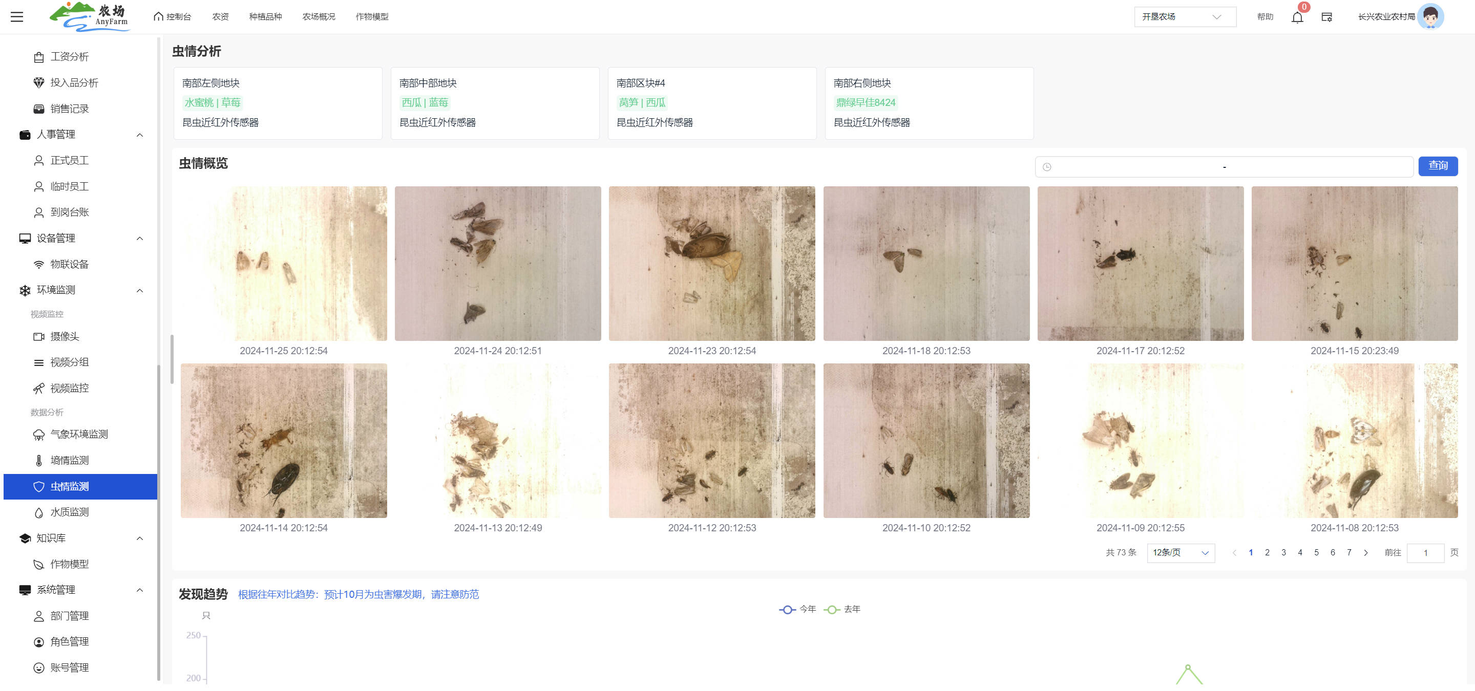 一、平台简介 AnyFarm农场管理平台是利用物联网、大数据、人工智能等现代信息技术,对农业生产进行全方位、全过程的智能化管理和控制。它通过传感器等设备,实时监测农田环境、作物生长、土壤墒情等信息,并通过数据分析和智能决策,实现精准灌溉、施肥、病虫害防治等操作,从而提高农业生产效率,降低资源消耗,保障农产品质量。 二、产品优势 1.全流程数据化管理,提升生产效率: * 优势: * 系统覆盖农场管理的各个环节,实现数据统一采集、存储和分析。 * 通过数据分析,优化生产计划,减少资源浪费,提高生产效率。 * 实时监测农场环境和生产状态,及时发现并解决问题。 * 体现: * 从农场基础信息录入,到生产计划制定,再到农产品溯源,全程数据化管理。 * 通过数据分析,实现精准施肥、精准灌溉等操作,提高资源利用率。 2. 智能化决策支持,降低生产风险: * 优势: * 利用机器学习模型,实现农产品质量预测、产量预测、病虫害预警等功能。 * 为农场管理者提供科学的决策依据,降低生产风险。 * 通过数据分析,预测市场行情,帮助农场及时调整生产策略。 * 体现: * 通过模型训练,预测农产品产量和质量,提前做好准备。 * 通过病虫害预警模型,及时发现并处理病虫害,减少损失。 3. 全程可追溯,保障农产品质量安全: * 优势: * 实现农产品从生产到销售的全程可追溯,保障产品质量安全。 * 消费者可以通过溯源码查询农产品生产信息,增强信任感。 * 提高农产品品牌价值,增强市场竞争力。 * 体现: * 记录农产品生产、加工、检测等信息,并与溯源码关联。 * 消费者可以通过手机扫描溯源码,了解农产品详细信息。 三、业务流程 流程说明: 1. 基础信息管理 * 农场管理: 对已添加的农场进行管理,包括信息修改、删除等操作。 * 员工管理: 录入和管理农场员工信息,包括姓名、工号、职位、联系方式等。 * 区域管理: 划分农场区域,如种植区、养殖区、办公区等,方便后续管理。 * 地块管理: 将农场区域进一步细分为地块,记录地块编号、面积、种植作物等信息。 * 设备管理: 录入和管理农场使用的各种设备,如灌溉设备、施肥设备、监测设备等。 * 计量单位: 设置系统中使用的计量单位,如面积单位、重量单位等。 * 指标库: 建立农产品质量、环境监测等相关指标库,为后续数据分析提供基础。 2. 生产管理 * 添加品种: 录入农场种植或养殖的品种信息,包括品种名称、特性、生长周期等。 * 品种管理: 对已添加的品种进行管理,包括信息修改、删除等操作。 * 添加农资: 录入农场使用的农资信息,如种子、肥料、农药等。 * 农资管理: 对已添加的农资进行管理,包括信息修改、删除等操作。 * 农资店: 如果农场有自己的农资店,则可以录入和管理农资店的信息。 * 农资出入库: 记录农资的出入库情况,实现农资库存管理。 * 生产计划: 制定农场的生产计划,包括种植或养殖时间、产量目标、农资使用计划等。 * 批次管理: 对农产品进行批次管理,记录批次信息、生产过程、质量检测等。 * 生产任务: 根据生产计划,生成具体的生产任务,分配给员工执行。 3. 溯源管理 * 采收管理: 记录农产品的采收情况,包括采收时间、产量、质量等。 * 加工管理: 如果农产品需要进行加工,则记录加工过程和相关信息。 * 检测记录: 记录农产品质量检测、环境监测等数据。 * 赋码管理: 对农产品进行赋码,实现产品溯源。 四、操作指南 4.1农场概况 界面功能概述: 该界面作为农场的首页及控制台界面,为用户呈现了农场的整体概况信息。在这里,用户能够清晰地查看到农场的数量、各个地块的数量、当前在职的员工人数、实时的天气状况等重要信息。同时,该界面还为用户提供了便捷的操作入口,例如可以进行农场的管理操作以及新增员工等常用功能,方便用户对农场的基本信息进行快速的了解和管理。  4.1.1.1 农场概况 界面功能概述: 用户可以点击标红的地方跳转到农场管理跳转到农场管理界面。  用户点击界面中标红的区域即可跳转到农场管理界面。在该界面中,用户可以全面了解农场的各项详细信息,如农场的占地面积、具体的种植区域划分、在职员工的数量及基本信息、各类设备的运行情况、今日和明日的农事安排等。这些信息的展示有助于用户对农场的整体运营状况有一个清晰的认识,同时也为后续的管理决策提供了有力的数据支持。此外,用户还可以在该界面进行一些基础的管理操作,如编辑农场的基本信息、调整设备的设置等,以确保农场的各项工作能够顺利进行。  4.1.1.2 农场农事 界面功能概述: 用户可以通过这里看到该农场的农事情况,例如施药、灌溉、施肥等常见的农事活动。  4.1.1.3 新增用户 界面元素功能概述: 该界面主要用于用户进行新增用户以及添加用户权限的操作。在农场的日常运营中,可能需要不断添加新的员工或管理人员,并为他们分配相应的权限,以便他们能够顺利地完成各自的工作任务。通过该界面,用户可以方便地完成这些操作,确保农场的人力资源管理更加高效和有序。  左侧搜索栏 :此搜索栏为用户提供了一个便捷的方式,允许用户在输入框内输入关键字,例如部门名称的关键词,从而快速搜索到特定的部门。这对于拥有多个部门的大型农场来说,能够大大提高用户查找部门的效率,节省时间。 顶部搜索栏:在这里,用户可以在输入框内