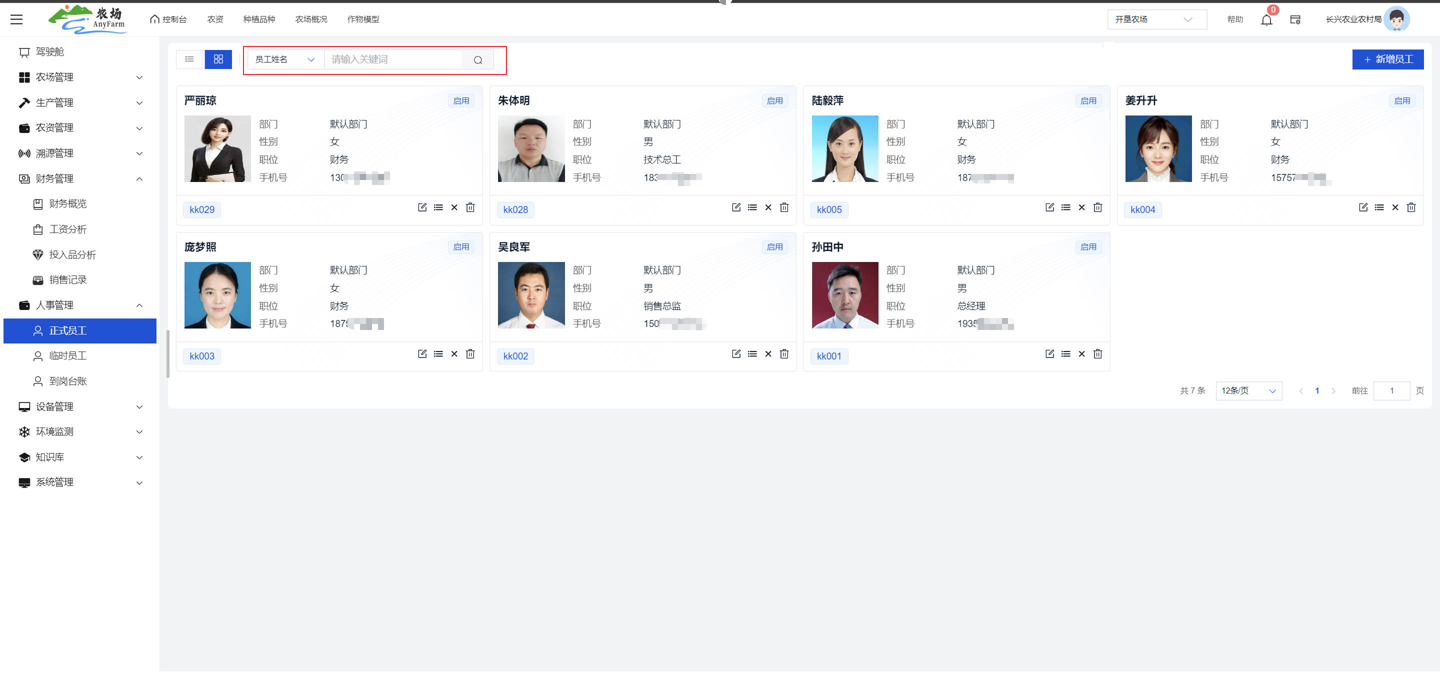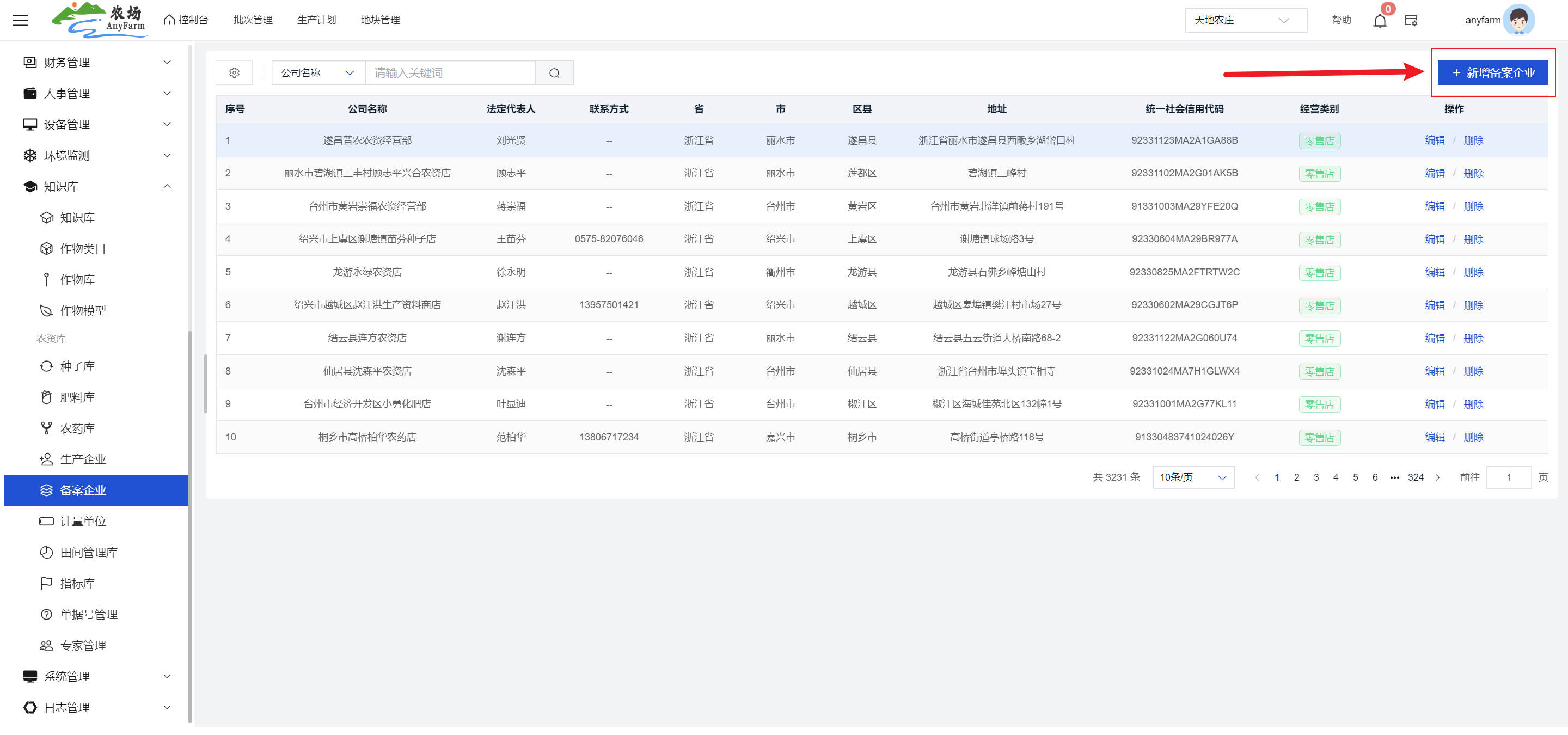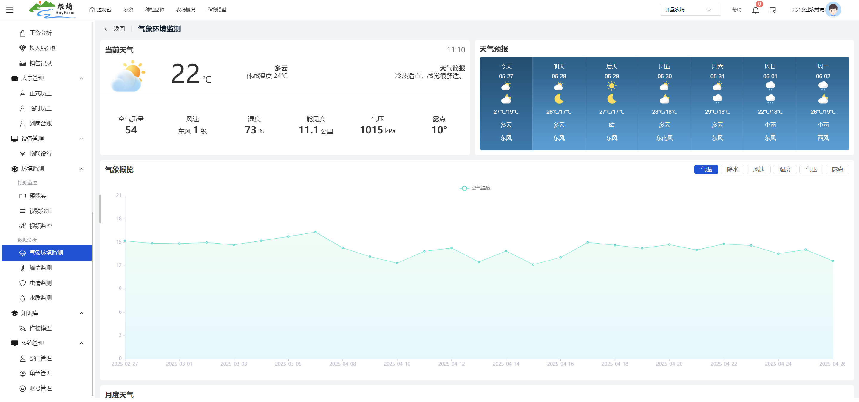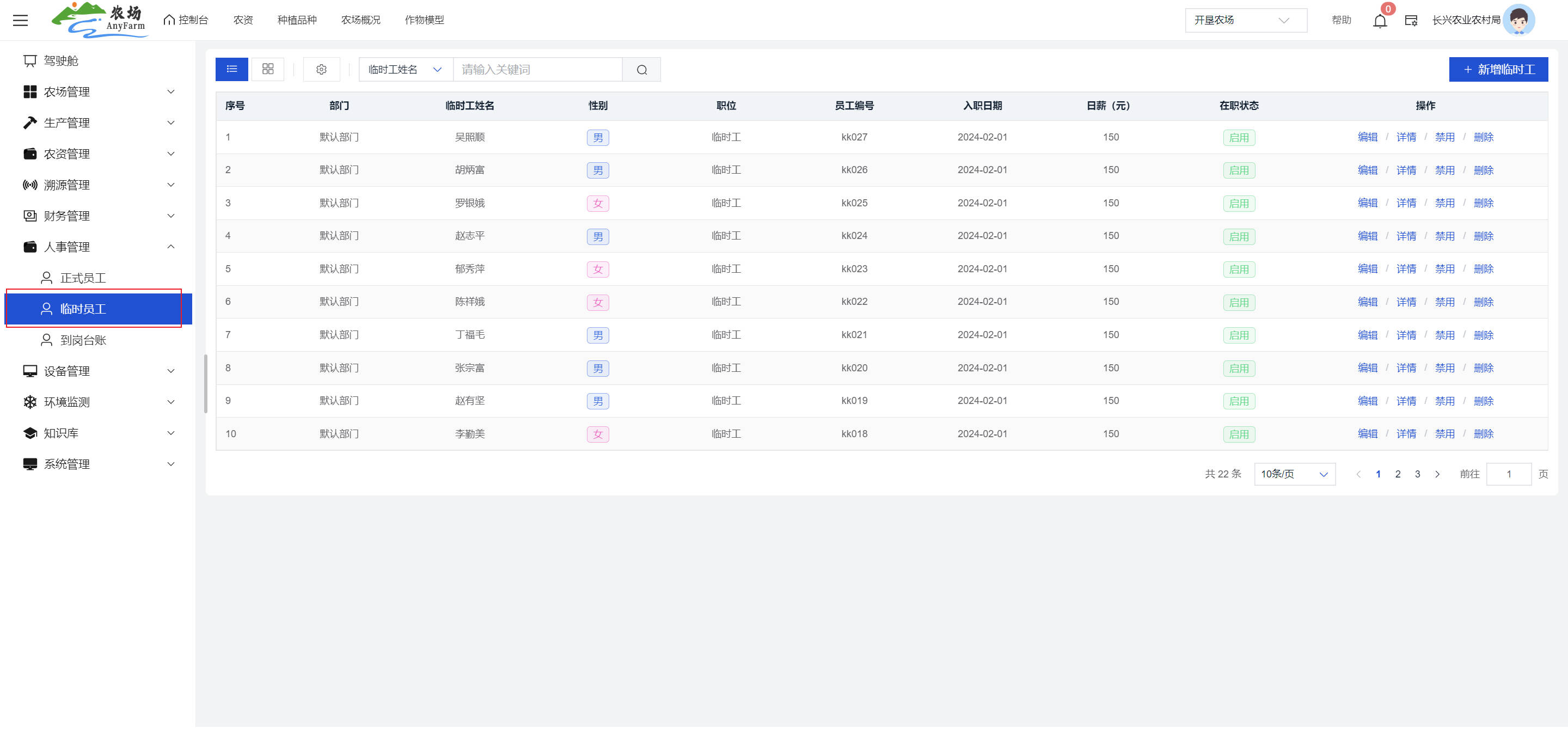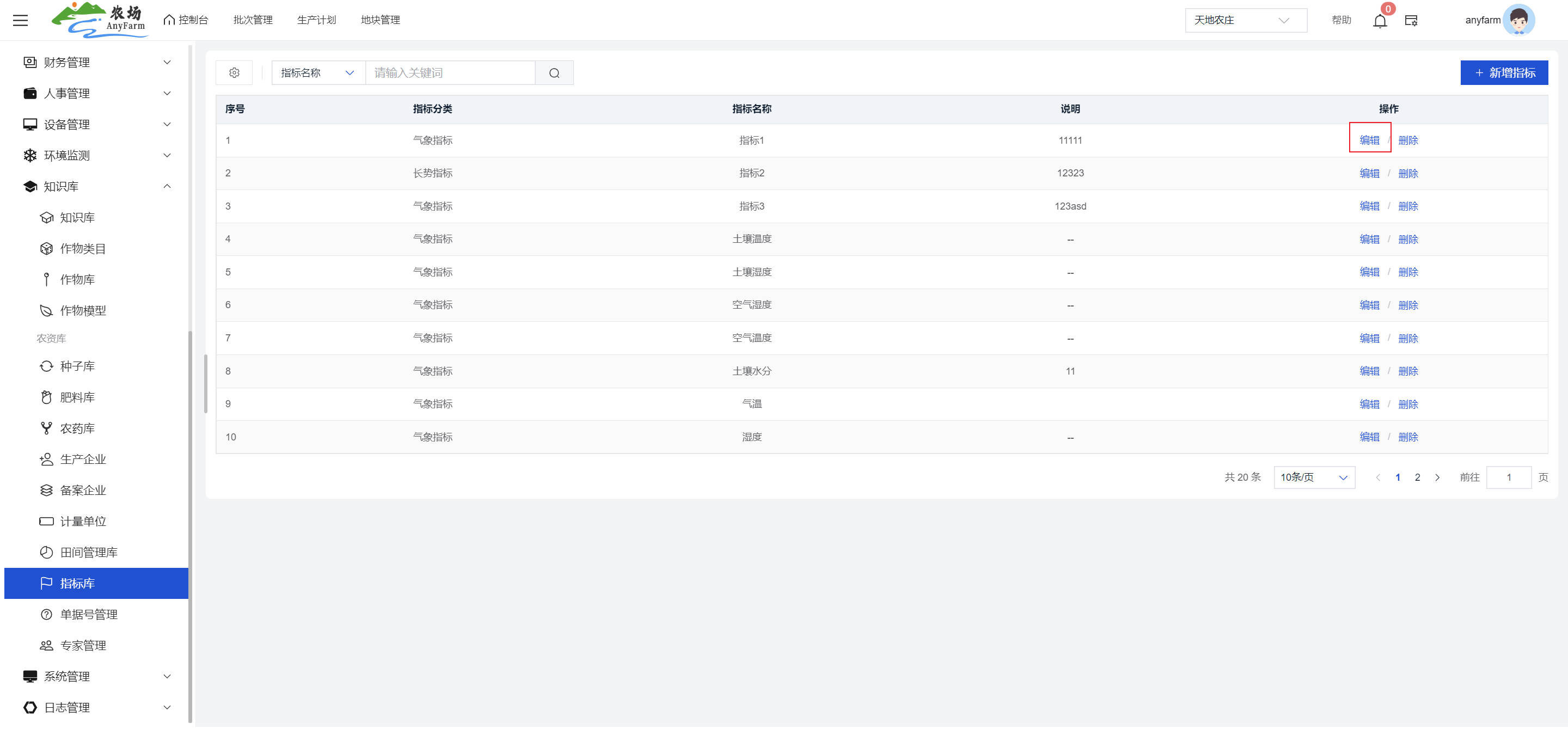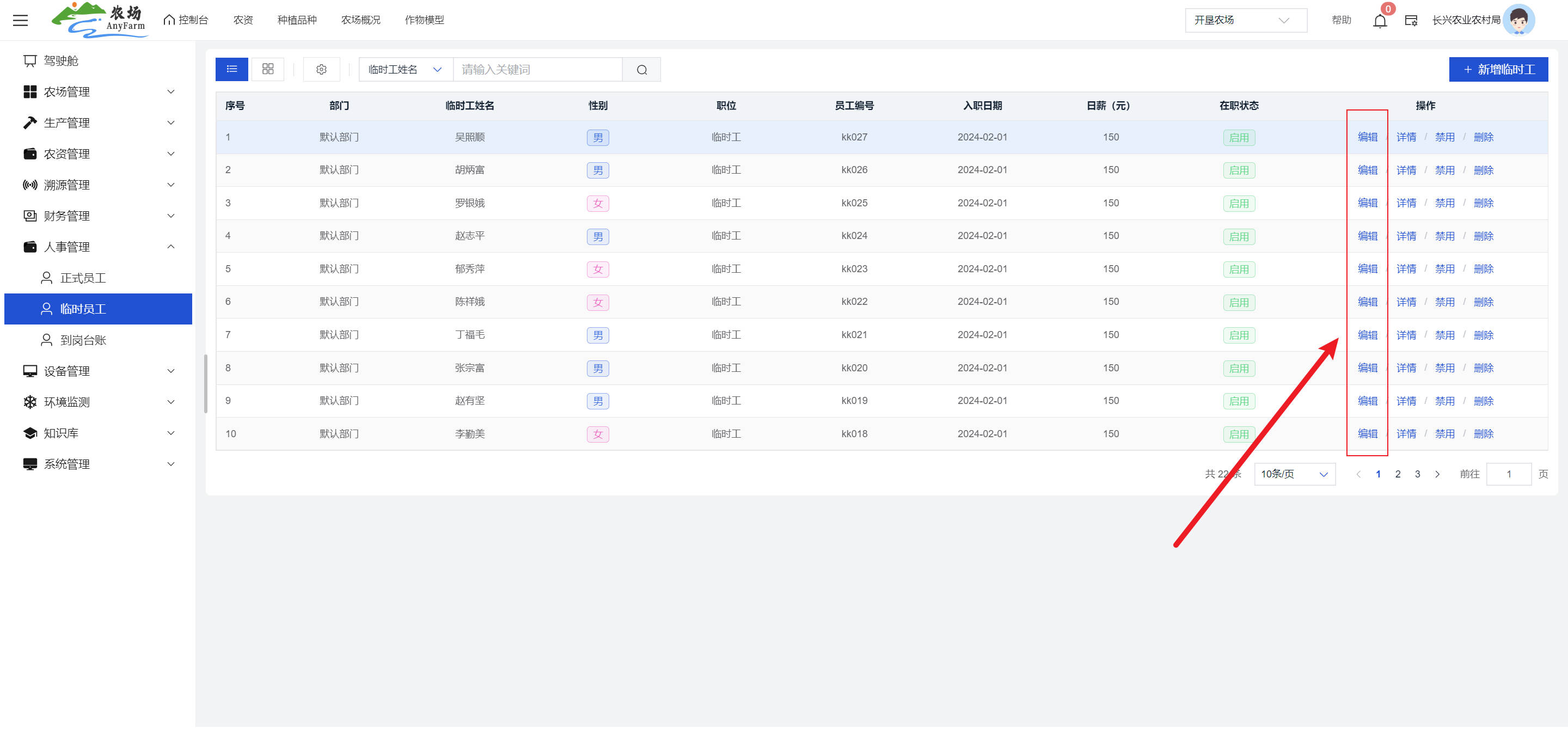 一、平台简介 AnyFarm农场管理平台是利用物联网、大数据、人工智能等现代信息技术,对农业生产进行全方位、全过程的智能化管理和控制。它通过传感器等设备,实时监测农田环境、作物生长、土壤墒情等信息,并通过数据分析和智能决策,实现精准灌溉、施肥、病虫害防治等操作,从而提高农业生产效率,降低资源消耗,保障农产品质量。 二、产品优势 1.全流程数据化管理,提升生产效率: * 优势: * 系统覆盖农场管理的各个环节,实现数据统一采集、存储和分析。 * 通过数据分析,优化生产计划,减少资源浪费,提高生产效率。 * 实时监测农场环境和生产状态,及时发现并解决问题。 * 体现: * 从农场基础信息录入,到生产计划制定,再到农产品溯源,全程数据化管理。 * 通过数据分析,实现精准施肥、精准灌溉等操作,提高资源利用率。 2. 智能化决策支持,降低生产风险: * 优势: * 利用机器学习模型,实现农产品质量预测、产量预测、病虫害预警等功能。 * 为农场管理者提供科学的决策依据,降低生产风险。 * 通过数据分析,预测市场行情,帮助农场及时调整生产策略。 * 体现: * 通过模型训练,预测农产品产量和质量,提前做好准备。 * 通过病虫害预警模型,及时发现并处理病虫害,减少损失。 3. 全程可追溯,保障农产品质量安全: * 优势: * 实现农产品从生产到销售的全程可追溯,保障产品质量安全。 * 消费者可以通过溯源码查询农产品生产信息,增强信任感。 * 提高农产品品牌价值,增强市场竞争力。 * 体现: * 记录农产品生产、加工、检测等信息,并与溯源码关联。 * 消费者可以通过手机扫描溯源码,了解农产品详细信息。 三、业务流程 流程说明: 1. 基础信息管理 * 农场管理: 对已添加的农场进行管理,包括信息修改、删除等操作。 * 员工管理: 录入和管理农场员工信息,包括姓名、工号、职位、联系方式等。 * 区域管理: 划分农场区域,如种植区、养殖区、办公区等,方便后续管理。 * 地块管理: 将农场区域进一步细分为地块,记录地块编号、面积、种植作物等信息。 * 设备管理: 录入和管理农场使用的各种设备,如灌溉设备、施肥设备、监测设备等。 * 计量单位: 设置系统中使用的计量单位,如面积单位、重量单位等。 * 指标库: 建立农产品质量、环境监测等相关指标库,为后续数据分析提供基础。 2. 生产管理 * 添加品种: 录入农场种植或养殖的品种信息,包括品种名称、特性、生长周期等。 * 品种管理: 对已添加的品种进行管理,包括信息修改、删除等操作。 * 添加农资: 录入农场使用的农资信息,如种子、肥料、农药等。 * 农资管理: 对已添加的农资进行管理,包括信息修改、删除等操作。 * 农资店: 如果农场有自己的农资店,则可以录入和管理农资店的信息。 * 农资出入库: 记录农资的出入库情况,实现农资库存管理。 * 生产计划: 制定农场的生产计划,包括种植或养殖时间、产量目标、农资使用计划等。 * 批次管理: 对农产品进行批次管理,记录批次信息、生产过程、质量检测等。 * 生产任务: 根据生产计划,生成具体的生产任务,分配给员工执行。 3. 溯源管理 * 采收管理: 记录农产品的采收情况,包括采收时间、产量、质量等。 * 加工管理: 如果农产品需要进行加工,则记录加工过程和相关信息。 * 检测记录: 记录农产品质量检测、环境监测等数据。 * 赋码管理: 对农产品进行赋码,实现产品溯源。 四、操作指南 4.1农场概况 界面功能概述: 该界面作为农场的首页及控制台界面,为用户呈现了农场的整体概况信息。在这里,用户能够清晰地查看到农场的数量、各个地块的数量、当前在职的员工人数、实时的天气状况等重要信息。同时,该界面还为用户提供了便捷的操作入口,例如可以进行农场的管理操作以及新增员工等常用功能,方便用户对农场的基本信息进行快速的了解和管理。  4.1.1.1 农场概况 界面功能概述: 用户可以点击标红的地方跳转到农场管理跳转到农场管理界面。  用户点击界面中标红的区域即可跳转到农场管理界面。在该界面中,用户可以全面了解农场的各项详细信息,如农场的占地面积、具体的种植区域划分、在职员工的数量及基本信息、各类设备的运行情况、今日和明日的农事安排等。这些信息的展示有助于用户对农场的整体运营状况有一个清晰的认识,同时也为后续的管理决策提供了有力的数据支持。此外,用户还可以在该界面进行一些基础的管理操作,如编辑农场的基本信息、调整设备的设置等,以确保农场的各项工作能够顺利进行。  4.1.1.2 农场农事 界面功能概述: 用户可以通过这里看到该农场的农事情况,例如施药、灌溉、施肥等常见的农事活动。  4.1.1.3 新增用户 界面元素功能概述: 该界面主要用于用户进行新增用户以及添加用户权限的操作。在农场的日常运营中,可能需要不断添加新的员工或管理人员,并为他们分配相应的权限,以便他们能够顺利地完成各自的工作任务。通过该界面,用户可以方便地完成这些操作,确保农场的人力资源管理更加高效和有序。  左侧搜索栏 :此搜索栏为用户提供了一个便捷的方式,允许用户在输入框内输入关键字,例如部门名称的关键词,从而快速搜索到特定的部门。这对于拥有多个部门的大型农场来说,能够大大提高用户查找部门的效率,节省时间。 顶部搜索栏:在这里,用户可以在输入框内