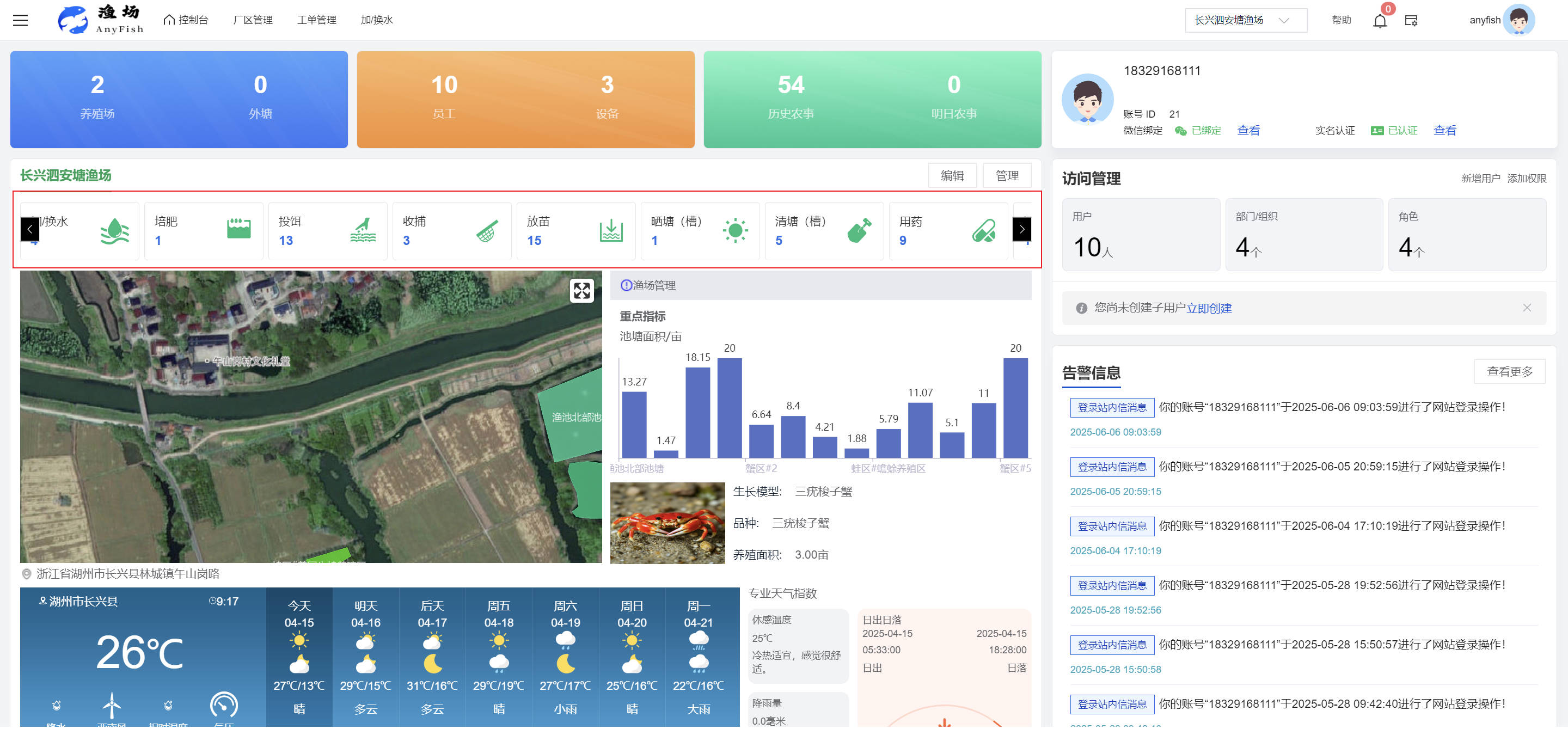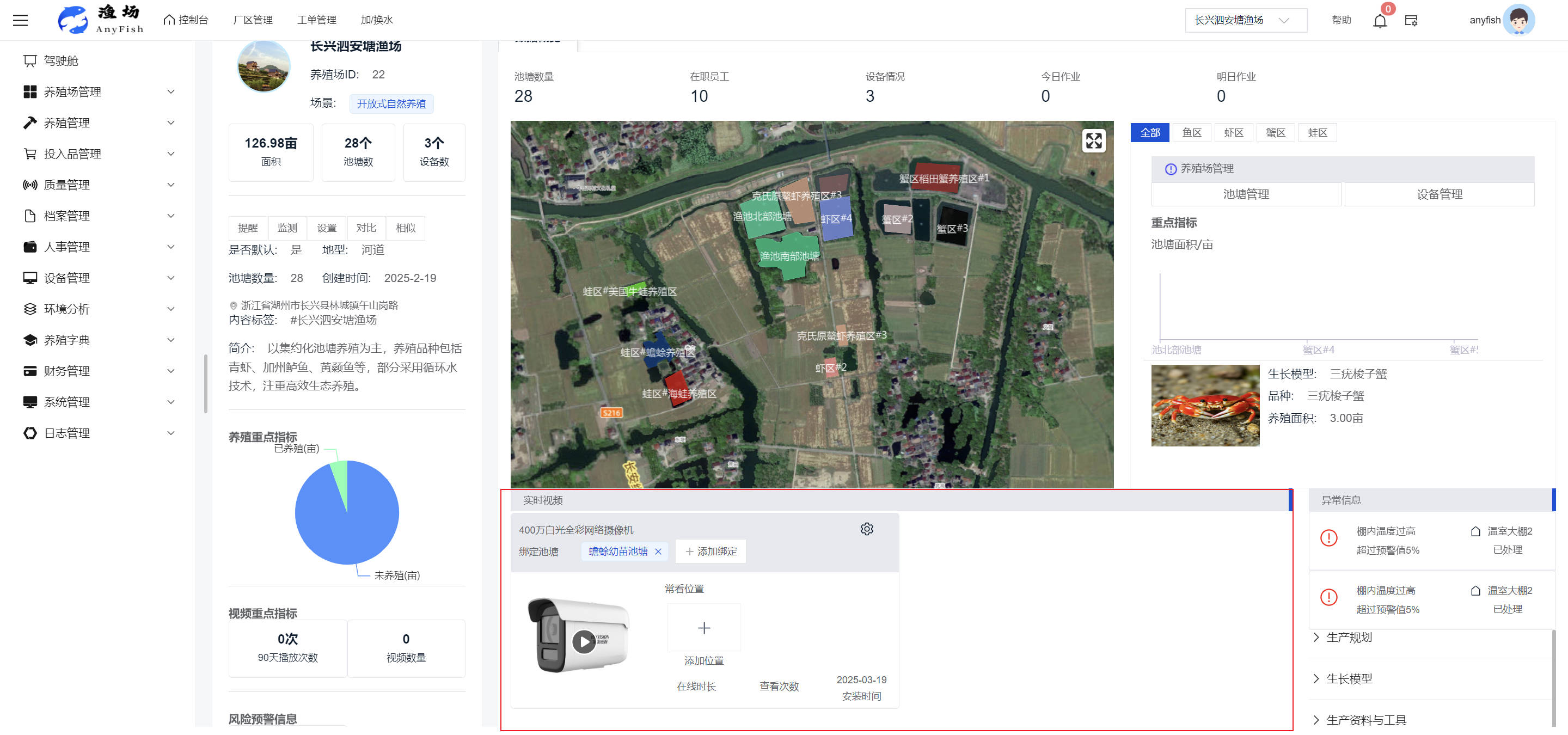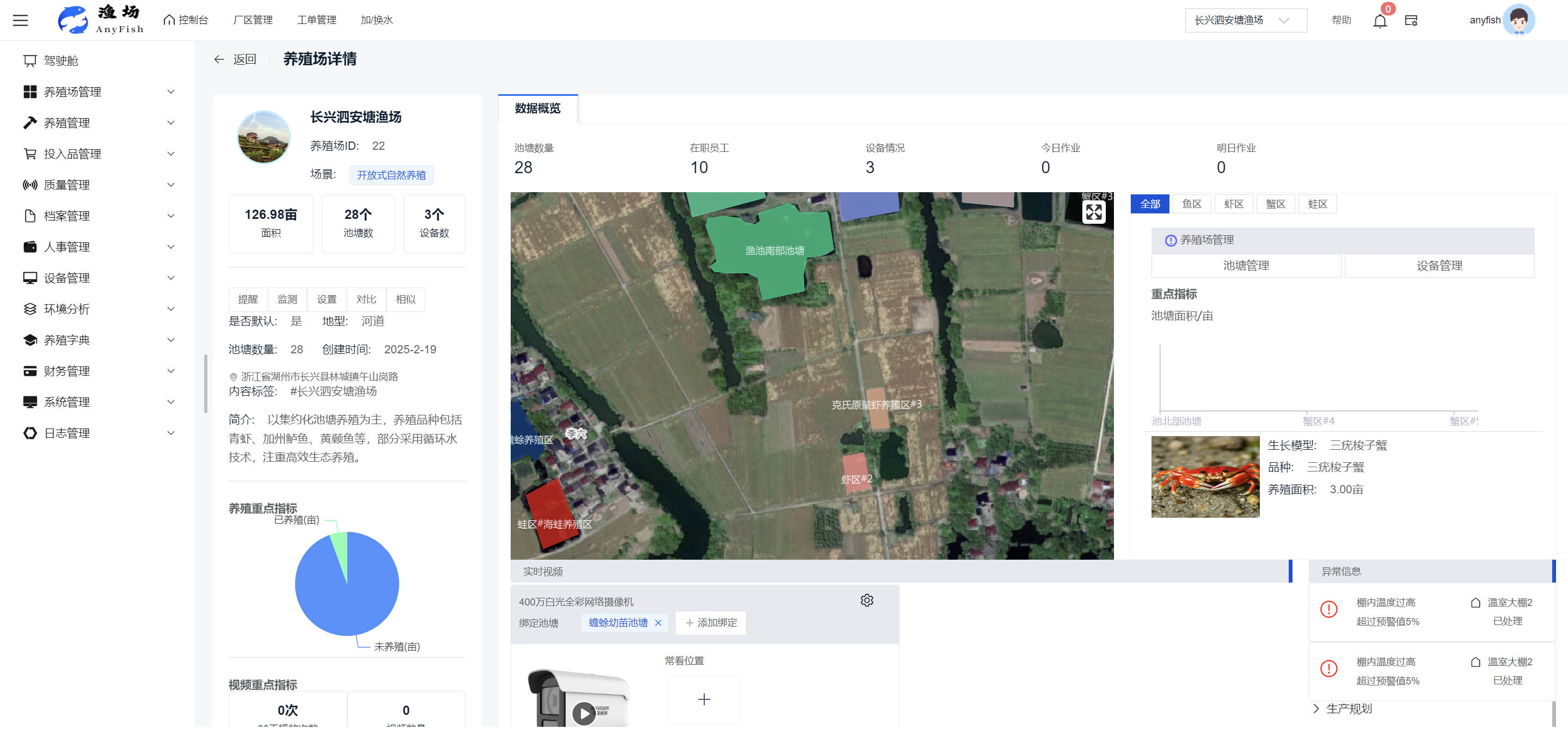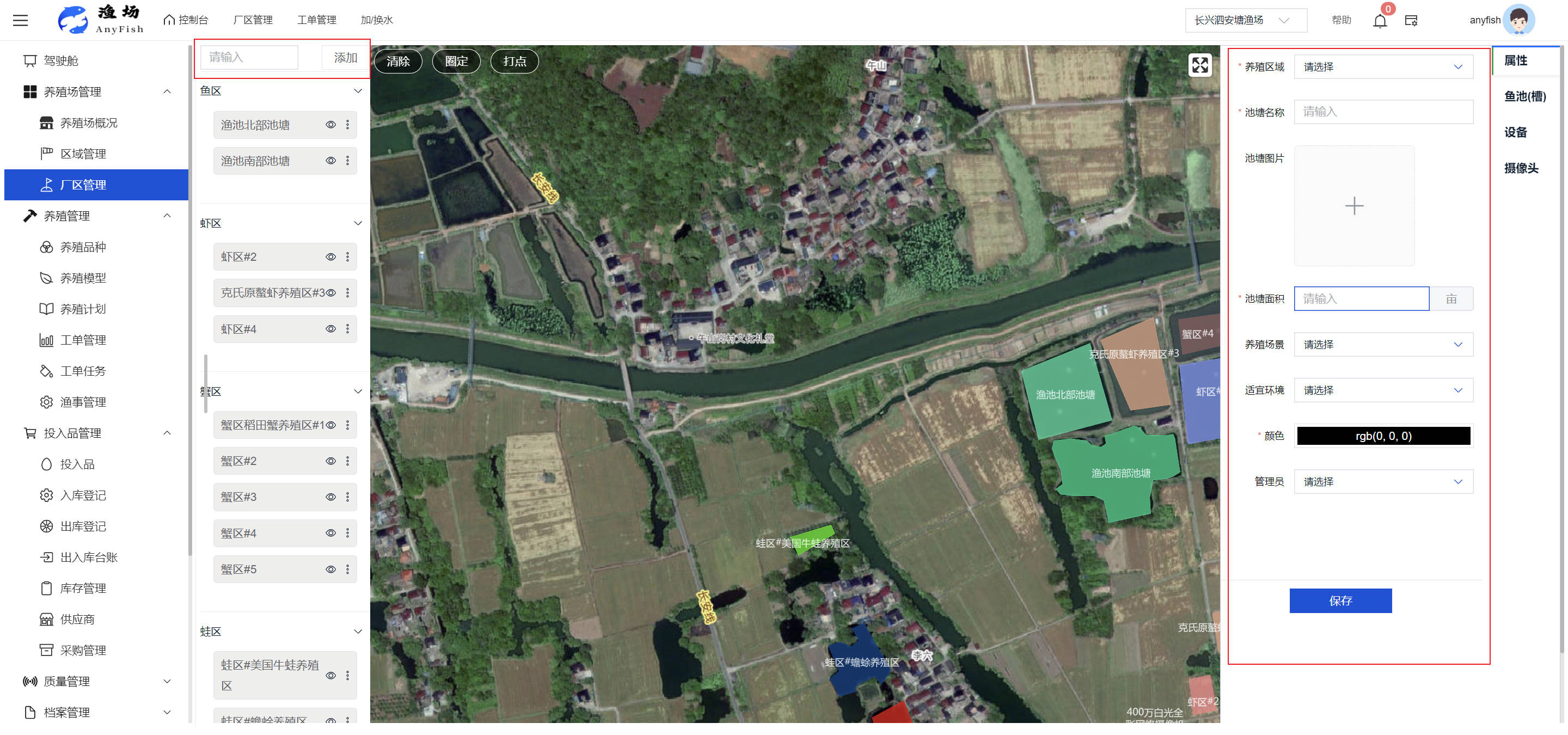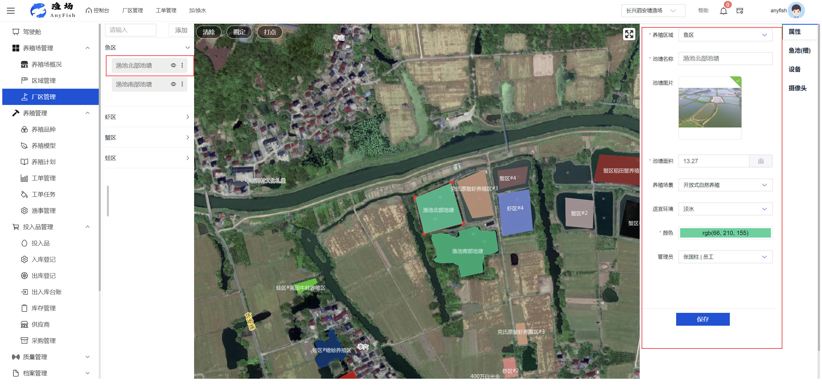 一、操作指南 1.1渔场概况 界面功能概述: 该界面作为渔场的首页及控制台界面,为用户呈现了渔场的整体概况信息。在这里,用户能够清晰地查看到渔场的数量、各个厂区的数量、当前在职的员工人数、实时的天气状况、已安装的摄像头设备数量以及是否存在离线设备等重要信息。同时,该界面还为用户提供了便捷的操作入口,例如可以进行渔场的管理操作以及新增员工等常用功能,方便用户对渔场的基本信息进行快速的了解和管理。  4.1.1.1 渔场概况 界面功能概述: 用户可以点击标红的地方跳转到渔场管理跳转到渔场管理界面。  用户点击界面中标红的区域即可跳转到渔场管理界面。在该界面中,用户可以全面了解渔场的各项详细信息,如渔场的占地面积、具体的养殖区域划分、在职员工的数量及基本信息、各类设备的运行情况、今日和明日的农事安排等。这些信息的展示有助于用户对渔场的整体运营状况有一个清晰的认识,同时也为后续的管理决策提供了有力的数据支持。此外,用户还可以在该界面进行一些基础的管理操作,如编辑渔场的基本信息、调整设备的设置等,以确保渔场的各项工作能够顺利进行。  4.1.1.2 渔场渔事 界面功能概述: 用户可以通过点击界面中标红的区域进入不同的渔事管理模块,例如培肥、投饵、收捕等常见的农事活动。  4.1.1.3 新增用户 界面元素功能概述: 该界面主要用于用户进行新增用户以及添加用户权限的操作。在渔场的日常运营中,可能需要不断添加新的员工或管理人员,并为他们分配相应的权限,以便他们能够顺利地完成各自的工作任务。通过该界面,用户可以方便地完成这些操作,确保渔场的人力资源管理更加高效和有序。  左侧搜索栏 :此搜索栏为用户提供了一个便捷的方式,允许用户在输入框内输入关键字,例如部门名称的关键词,从而快速搜索到特定的部门。这对于拥有多个部门的大型渔场来说,能够大大提高用户查找部门的效率,节省时间。 顶部搜索栏:在这里,用户可以在输入框内填写用户名称或关键词,以便快速搜索到特定的用户。当渔场员工数量较多时,通过关键词搜索能够迅速定位到目标用户,进而对其信息进行相应的操作,如查看、编辑或删除等。  新增用户按钮:点击该按钮后,系统会弹出一个新增用户的表单界面。  用户需要在该表单中填写完整的信息,包括但不限于用户名、密码、姓名、联系方式、所属部门、角色权限等。填写完成后,点击保存按钮,即可将新的用户成功添加到系统当中,使其能够登录并使用系统进行相关的工作操作。  编辑用户按钮:当用户需要修改员工的信息时,可以点击该按钮。  系统会跳转到员工信息编辑界面,在这里,用户可以对员工的基本信息、联系方式、角色权限等进行修改。修改完成后,点击保存按钮,即可使修改后的信息生效,确保员工的信息始终保持准确和更新。  删除按钮:如果需要删除某个员工账号,用户可以点击该删除按钮。系统会弹出一个确认对话框,提示用户是否确定要删除该员工。如果用户点击“是”,则系统将彻底删除该员工账号及其相关信息;如果用户点击“否”,则取消删除操作,员工账号保持不变。在删除员工账号时,用户需要谨慎操作,以免误删重要信息。  修改密码按钮:为了保障系统的安全性,用户可以通过点击该按钮来修改员工的密码。  在修改密码的界面中,用户需要输入新的密码并确认,然后点击保存按钮,即可完成密码的修改。修改后的密码将立即生效,员工需要使用新密码进行登录。这一功能在员工忘记密码或需要定期更新密码的情况下非常实用。  4.1.1.4 告警信息 界面功能概述: 该界面是一个渔场概况列表,主要展示渔场的基本情况以及各类告警信息。用户可以通过该界面查看渔场的详细信息,如渔场名称、位置、占地面积、当前的渔事活动等。  同时,系统会将各类告警信息以醒目的方式展示出来,包括设备故障告警、环境异常告警(如温度过高、湿度过低等)、渔事任务超时告警等。用户可以点击相应的告警信息,查看更多详细的告警内容,如告警发生的时间、具体的设备或区域、告警的严重程度等。此外,用户还可以在该界面进行一些相关的操作,如确认告警信息、查看告警处理进度、设置告警提醒方式等,以便及时处理各类问题,确保渔场的正常运营。  4.2渔场管理 4.2.1.渔场管理 摄像头管理 :用户可以在该界面中对摄像头进行添加、删除、调整位置等操作。通过合理配置摄像头,用户可以实现对渔场各个区域的实时监控,便于及时发现异常情况,保障渔场的安全。  4.2.2 厂区管理 界面功能概述 该界面是一个池塘列表,主要用于查看池塘的详细信息,包括池塘的占地面积、养殖模型、养殖面积、生长周期等。用户可以通过该界面全面了解各个池塘的基本情况,为养殖规划和渔事安排提供重要依据。同时,该界面还为用户提供了多种操作功能,如池塘管理操作、查看池塘详细信息等,方便用户对地块进行有效的管理和维护。  4.2.2.1 池塘管理:  添加旁边的搜索框(与添加按钮分开) :该搜索框允许用户输入关键词,如池塘名称、投入品名称或相关信息,进行快速搜索。通过输入关键词,系统将自动筛选出符合条件的池塘信息,方便用户在众多地块中快速找到目标池塘,提高工作效率。 添加按钮 :用户可以在右侧输入要添加的池塘信息,