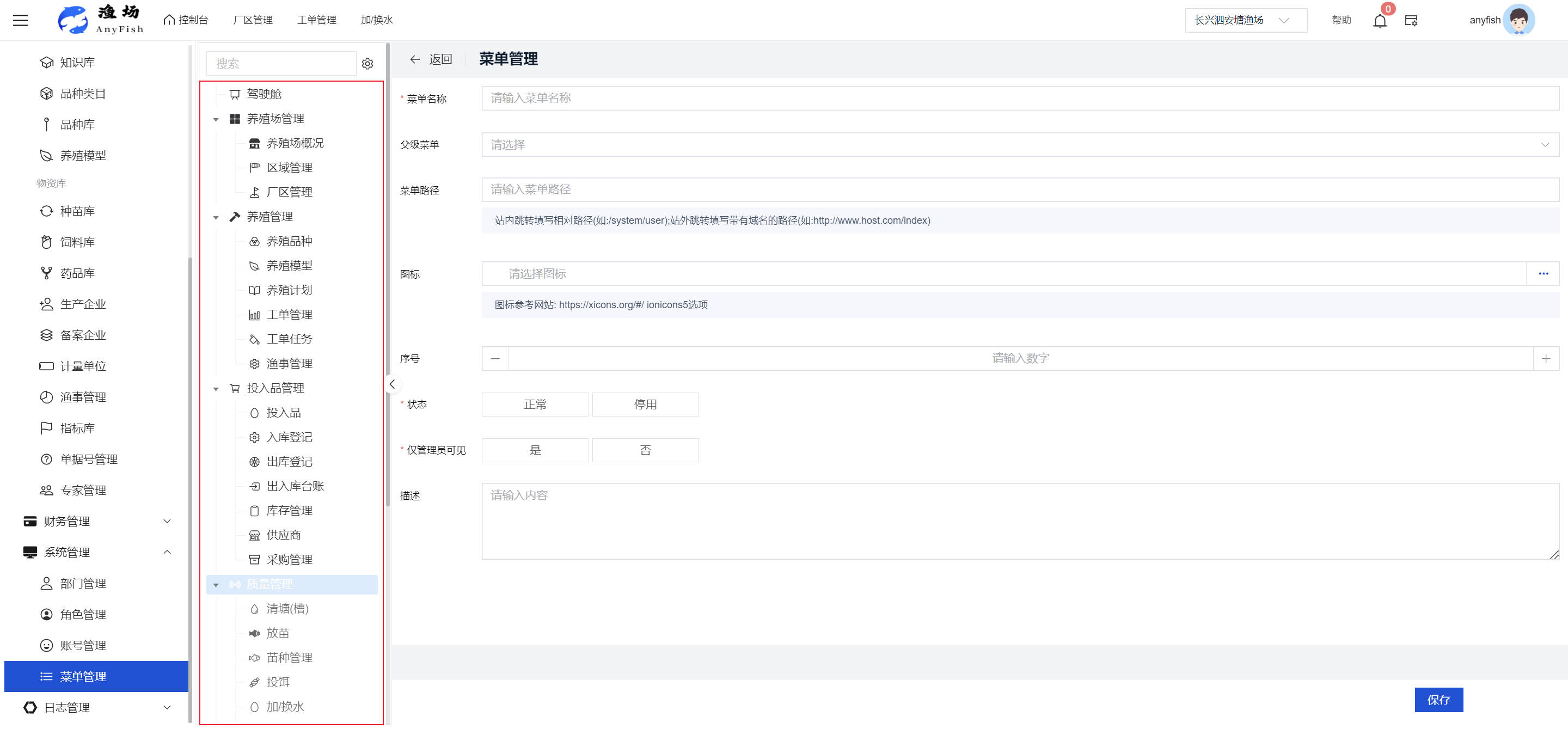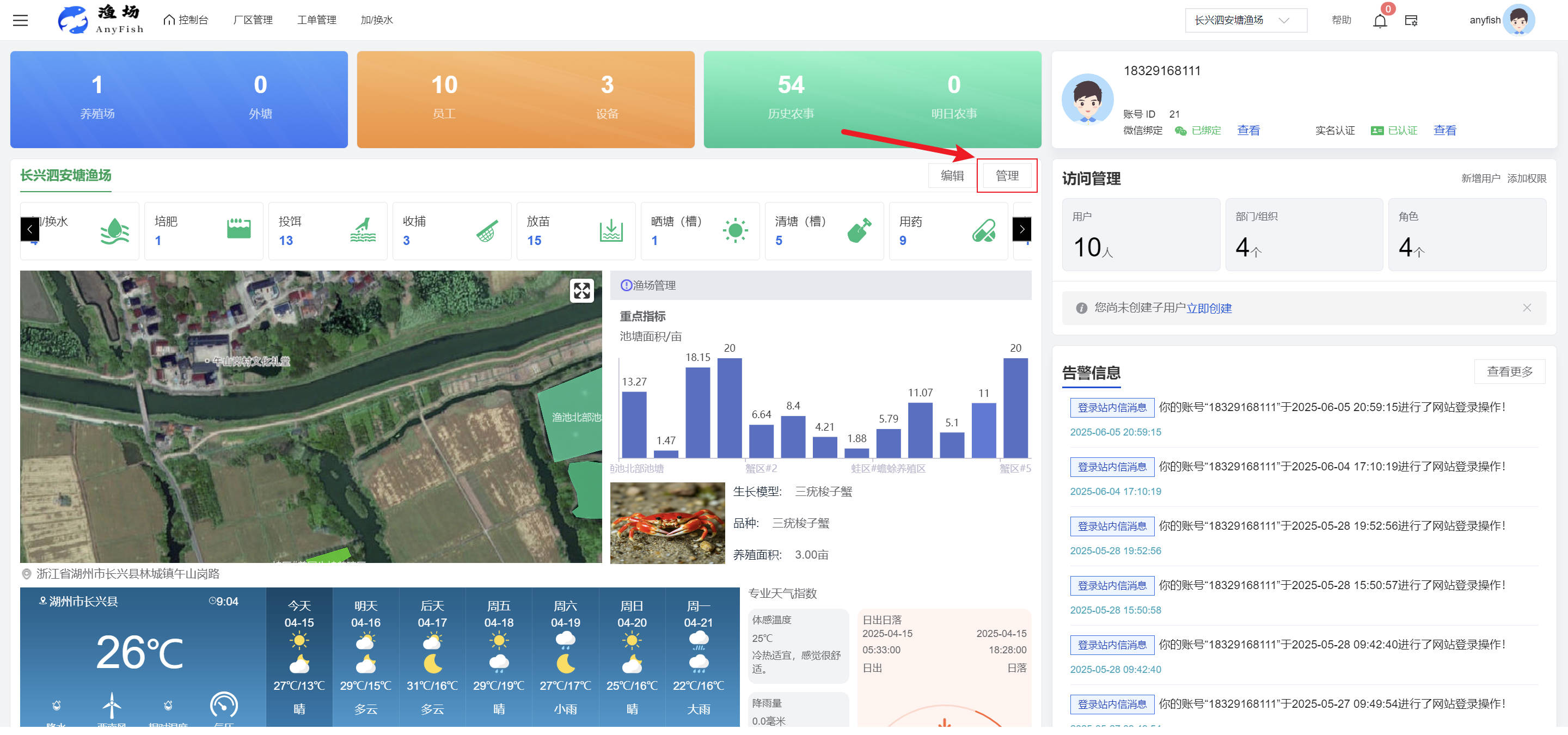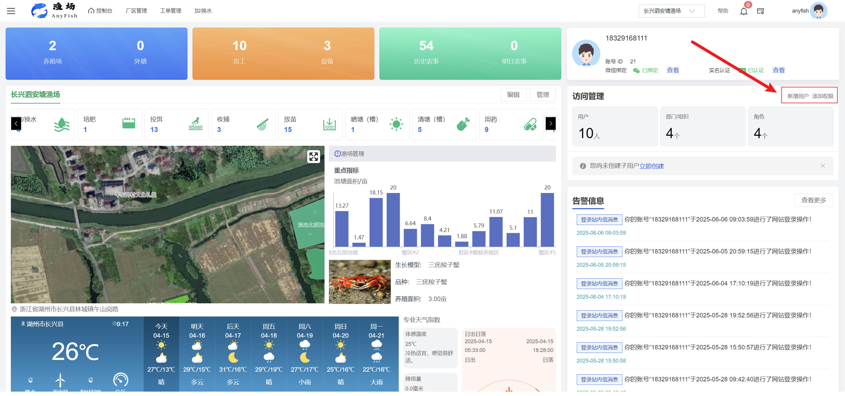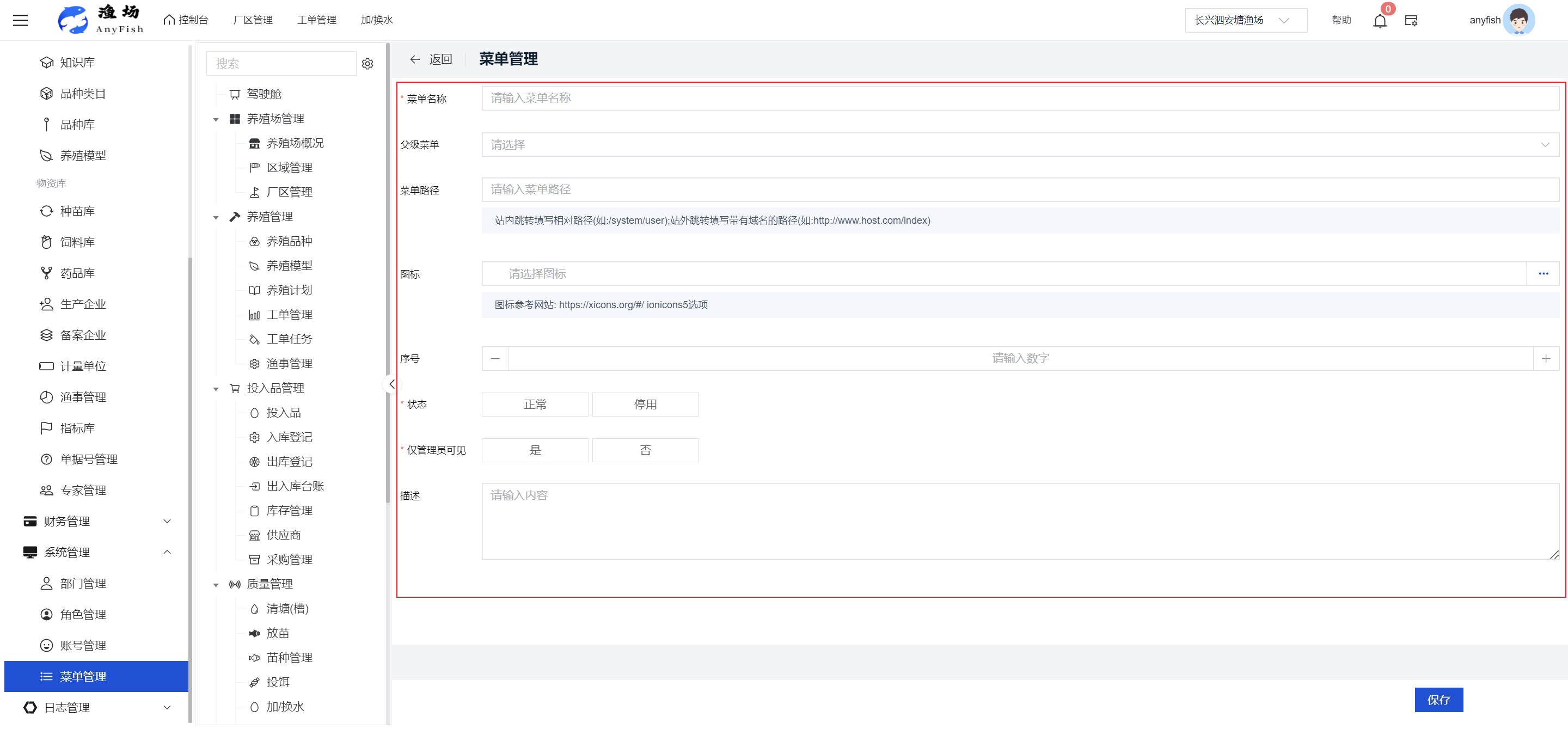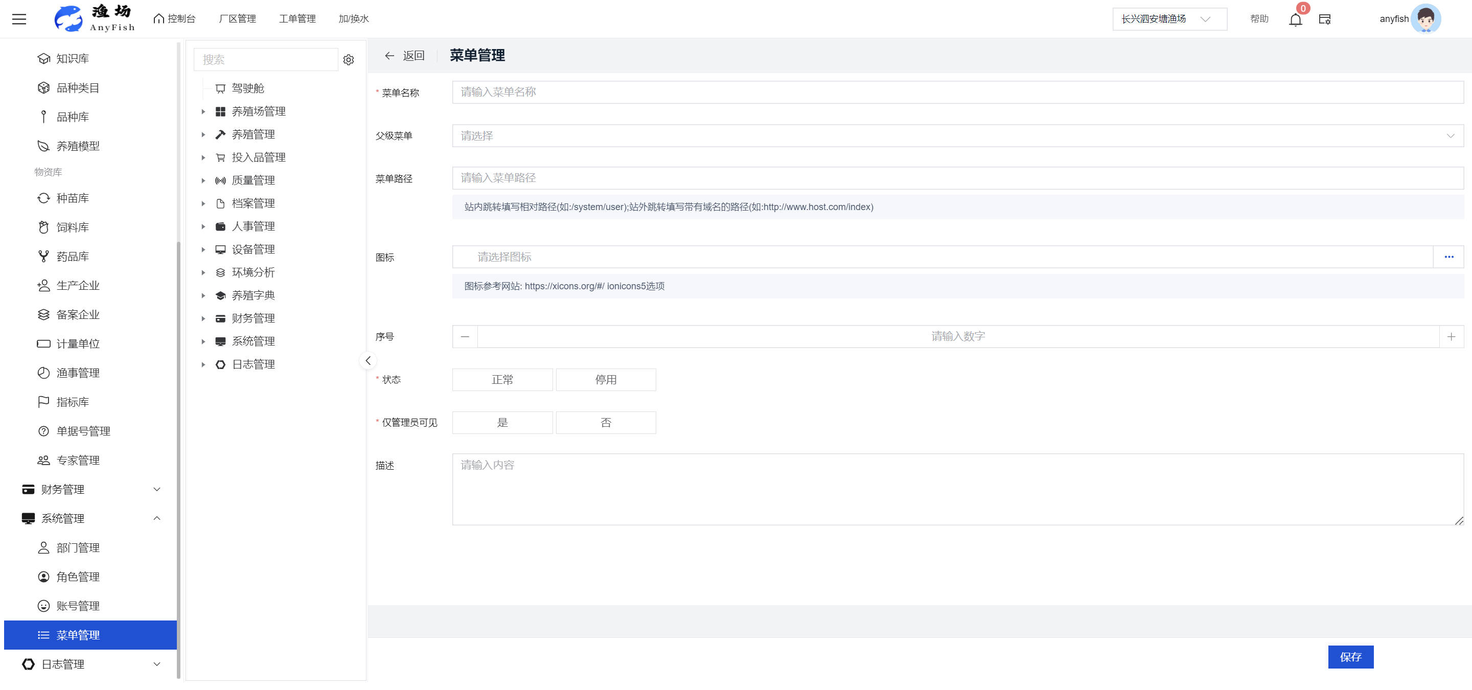 一、操作指南 1.1渔场概况 界面功能概述: 该界面作为渔场的首页及控制台界面,为用户呈现了渔场的整体概况信息。在这里,用户能够清晰地查看到渔场的数量、各个厂区的数量、当前在职的员工人数、实时的天气状况、已安装的摄像头设备数量以及是否存在离线设备等重要信息。同时,该界面还为用户提供了便捷的操作入口,例如可以进行渔场的管理操作以及新增员工等常用功能,方便用户对渔场的基本信息进行快速的了解和管理。  4.1.1.1 渔场概况 界面功能概述: 用户可以点击标红的地方跳转到渔场管理跳转到渔场管理界面。  用户点击界面中标红的区域即可跳转到渔场管理界面。在该界面中,用户可以全面了解渔场的各项详细信息,如渔场的占地面积、具体的养殖区域划分、在职员工的数量及基本信息、各类设备的运行情况、今日和明日的农事安排等。这些信息的展示有助于用户对渔场的整体运营状况有一个清晰的认识,同时也为后续的管理决策提供了有力的数据支持。此外,用户还可以在该界面进行一些基础的管理操作,如编辑渔场的基本信息、调整设备的设置等,以确保渔场的各项工作能够顺利进行。  4.1.1.2 渔场渔事 界面功能概述: 用户可以通过点击界面中标红的区域进入不同的渔事管理模块,例如培肥、投饵、收捕等常见的农事活动。  4.1.1.3 新增用户 界面元素功能概述: 该界面主要用于用户进行新增用户以及添加用户权限的操作。在渔场的日常运营中,可能需要不断添加新的员工或管理人员,并为他们分配相应的权限,以便他们能够顺利地完成各自的工作任务。通过该界面,用户可以方便地完成这些操作,确保渔场的人力资源管理更加高效和有序。  左侧搜索栏 :此搜索栏为用户提供了一个便捷的方式,允许用户在输入框内输入关键字,例如部门名称的关键词,从而快速搜索到特定的部门。这对于拥有多个部门的大型渔场来说,能够大大提高用户查找部门的效率,节省时间。 顶部搜索栏:在这里,用户可以在输入框内填写用户名称或关键词,以便快速搜索到特定的用户。当渔场员工数量较多时,通过关键词搜索能够迅速定位到目标用户,进而对其信息进行相应的操作,如查看、编辑或删除等。  新增用户按钮:点击该按钮后,系统会弹出一个新增用户的表单界面。  用户需要在该表单中填写完整的信息,包括但不限于用户名、密码、姓名、联系方式、所属部门、角色权限等。填写完成后,点击保存按钮,即可将新的用户成功添加到系统当中,使其能够登录并使用系统进行相关的工作操作。  编辑用户按钮:当用户需要修改员工的信息时,可以点击该按钮。  系统会跳转到员工信息编辑界面,在这里,用户可以对员工的基本信息、联系方式、角色权限等进行修改。修改完成后,点击保存按钮,即可使修改后的信息生效,确保员工的信息始终保持准确和更新。  删除按钮:如果需要删除某个员工账号,用户可以点击该删除按钮。系统会弹出一个确认对话框,提示用户是否确定要删除该员工。如果用户点击“是”,则系统将彻底删除该员工账号及其相关信息;如果用户点击“否”,则取消删除操作,员工账号保持不变。在删除员工账号时,用户需要谨慎操作,以免误删重要信息。  修改密码按钮:为了保障系统的安全性,用户可以通过点击该按钮来修改员工的密码。  在修改密码的界面中,用户需要输入新的密码并确认,然后点击保存按钮,即可完成密码的修改。修改后的密码将立即生效,员工需要使用新密码进行登录。这一功能在员工忘记密码或需要定期更新密码的情况下非常实用。  4.1.1.4 告警信息 界面功能概述: 该界面是一个渔场概况列表,主要展示渔场的基本情况以及各类告警信息。用户可以通过该界面查看渔场的详细信息,如渔场名称、位置、占地面积、当前的渔事活动等。  同时,系统会将各类告警信息以醒目的方式展示出来,包括设备故障告警、环境异常告警(如温度过高、湿度过低等)、渔事任务超时告警等。用户可以点击相应的告警信息,查看更多详细的告警内容,如告警发生的时间、具体的设备或区域、告警的严重程度等。此外,用户还可以在该界面进行一些相关的操作,如确认告警信息、查看告警处理进度、设置告警提醒方式等,以便及时处理各类问题,确保渔场的正常运营。  4.2渔场管理 4.2.1.渔场管理 摄像头管理 :用户可以在该界面中对摄像头进行添加、删除、调整位置等操作。通过合理配置摄像头,用户可以实现对渔场各个区域的实时监控,便于及时发现异常情况,保障渔场的安全。  4.2.2 厂区管理 界面功能概述 该界面是一个池塘列表,主要用于查看池塘的详细信息,包括池塘的占地面积、养殖模型、养殖面积、生长周期等。用户可以通过该界面全面了解各个池塘的基本情况,为养殖规划和渔事安排提供重要依据。同时,该界面还为用户提供了多种操作功能,如池塘管理操作、查看池塘详细信息等,方便用户对地块进行有效的管理和维护。  4.2.2.1 池塘管理:  添加旁边的搜索框(与添加按钮分开) :该搜索框允许用户输入关键词,如池塘名称、投入品名称或相关信息,进行快速搜索。通过输入关键词,系统将自动筛选出符合条件的池塘信息,方便用户在众多地块中快速找到目标池塘,提高工作效率。 添加按钮 :用户可以在右侧输入要添加的池塘信息,
