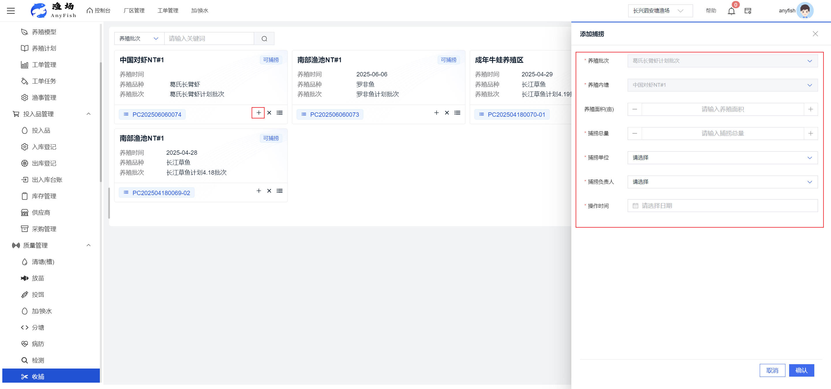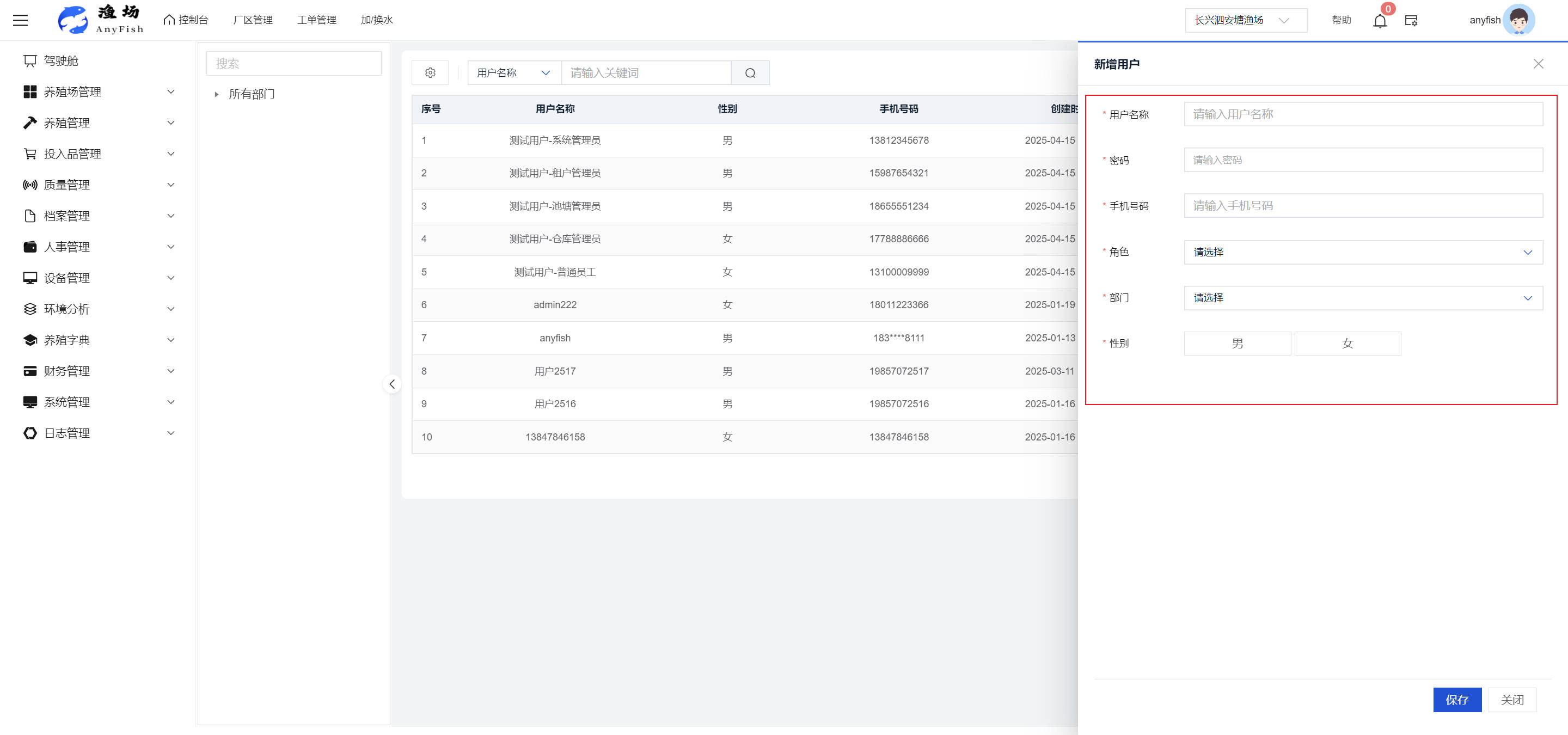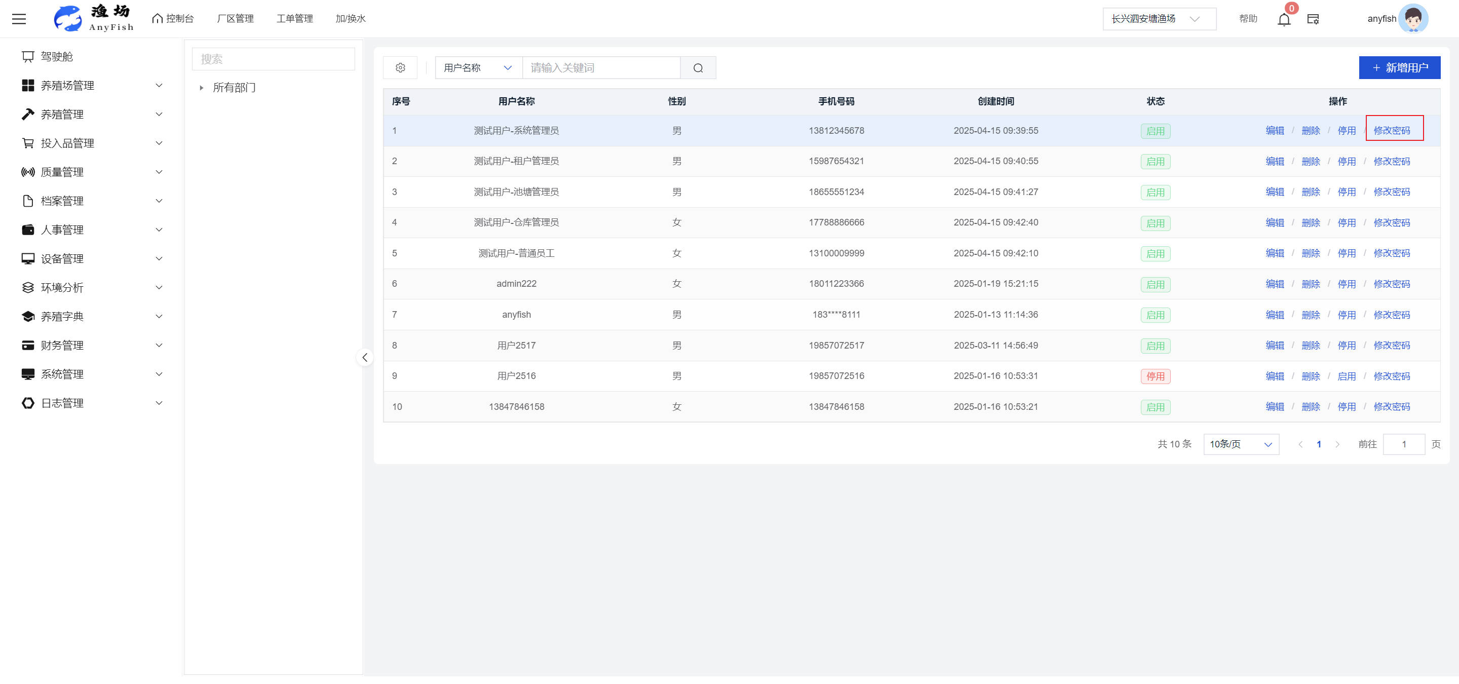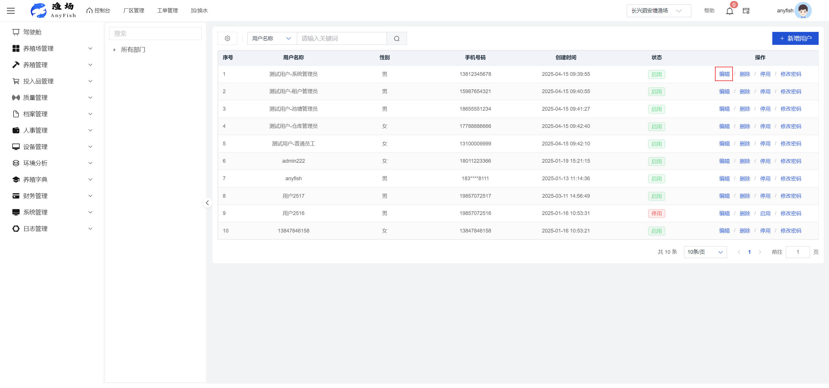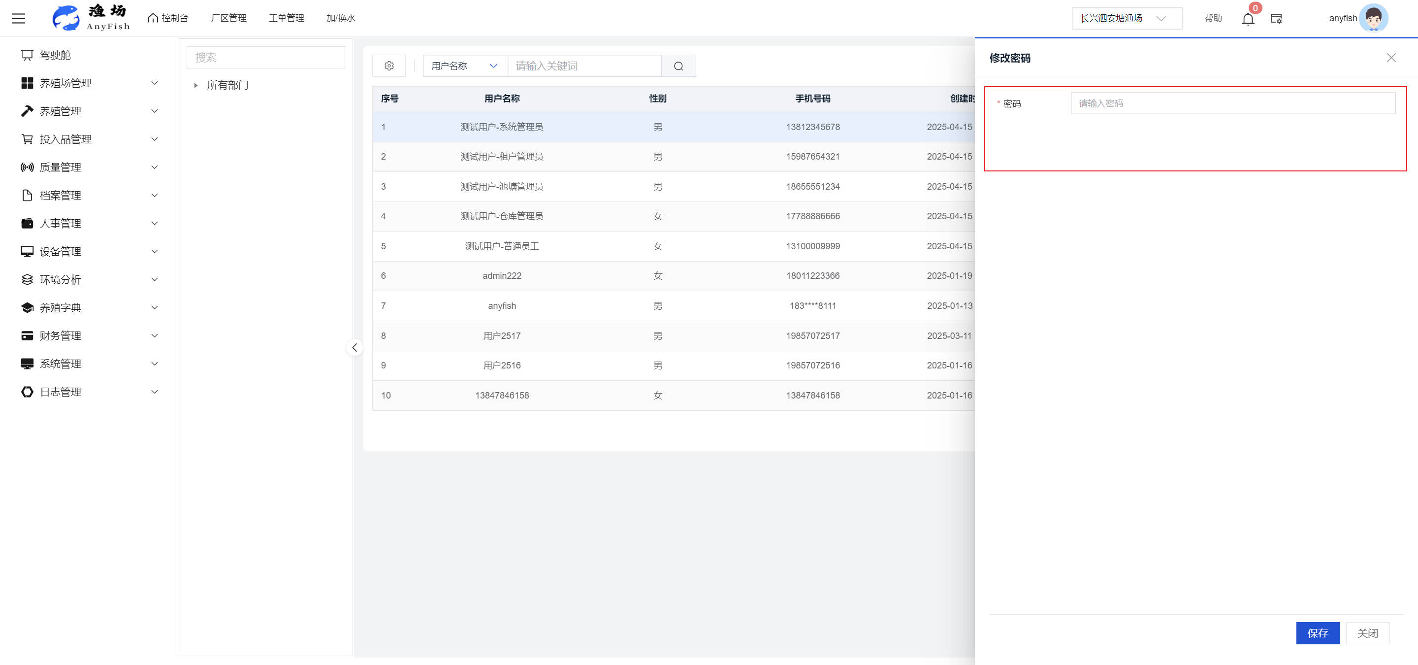 一、操作指南 1.1渔场概况 界面功能概述: 该界面作为渔场的首页及控制台界面,为用户呈现了渔场的整体概况信息。在这里,用户能够清晰地查看到渔场的数量、各个厂区的数量、当前在职的员工人数、实时的天气状况、已安装的摄像头设备数量以及是否存在离线设备等重要信息。同时,该界面还为用户提供了便捷的操作入口,例如可以进行渔场的管理操作以及新增员工等常用功能,方便用户对渔场的基本信息进行快速的了解和管理。  4.1.1.1 渔场概况 界面功能概述: 用户可以点击标红的地方跳转到渔场管理跳转到渔场管理界面。  用户点击界面中标红的区域即可跳转到渔场管理界面。在该界面中,用户可以全面了解渔场的各项详细信息,如渔场的占地面积、具体的养殖区域划分、在职员工的数量及基本信息、各类设备的运行情况、今日和明日的农事安排等。这些信息的展示有助于用户对渔场的整体运营状况有一个清晰的认识,同时也为后续的管理决策提供了有力的数据支持。此外,用户还可以在该界面进行一些基础的管理操作,如编辑渔场的基本信息、调整设备的设置等,以确保渔场的各项工作能够顺利进行。  4.1.1.2 渔场渔事 界面功能概述: 用户可以通过点击界面中标红的区域进入不同的渔事管理模块,例如培肥、投饵、收捕等常见的农事活动。  4.1.1.3 新增用户 界面元素功能概述: 该界面主要用于用户进行新增用户以及添加用户权限的操作。在渔场的日常运营中,可能需要不断添加新的员工或管理人员,并为他们分配相应的权限,以便他们能够顺利地完成各自的工作任务。通过该界面,用户可以方便地完成这些操作,确保渔场的人力资源管理更加高效和有序。  左侧搜索栏 :此搜索栏为用户提供了一个便捷的方式,允许用户在输入框内输入关键字,例如部门名称的关键词,从而快速搜索到特定的部门。这对于拥有多个部门的大型渔场来说,能够大大提高用户查找部门的效率,节省时间。 顶部搜索栏:在这里,用户可以在输入框内填写用户名称或关键词,以便快速搜索到特定的用户。当渔场员工数量较多时,通过关键词搜索能够迅速定位到目标用户,进而对其信息进行相应的操作,如查看、编辑或删除等。  新增用户按钮:点击该按钮后,系统会弹出一个新增用户的表单界面。  用户需要在该表单中填写完整的信息,包括但不限于用户名、密码、姓名、联系方式、所属部门、角色权限等。填写完成后,点击保存按钮,即可将新的用户成功添加到系统当中,使其能够登录并使用系统进行相关的工作操作。  编辑用户按钮:当用户需要修改员工的信息时,可以点击该按钮。  系统会跳转到员工信息编辑界面,在这里,用户可以对员工的基本信息、联系方式、角色权限等进行修改。修改完成后,点击保存按钮,即可使修改后的信息生效,确保员工的信息始终保持准确和更新。  删除按钮:如果需要删除某个员工账号,用户可以点击该删除按钮。系统会弹出一个确认对话框,提示用户是否确定要删除该员工。如果用户点击“是”,则系统将彻底删除该员工账号及其相关信息;如果用户点击“否”,则取消删除操作,员工账号保持不变。在删除员工账号时,用户需要谨慎操作,以免误删重要信息。  修改密码按钮:为了保障系统的安全性,用户可以通过点击该按钮来修改员工的密码。  在修改密码的界面中,用户需要输入新的密码并确认,然后点击保存按钮,即可完成密码的修改。修改后的密码将立即生效,员工需要使用新密码进行登录。这一功能在员工忘记密码或需要定期更新密码的情况下非常实用。  4.1.1.4 告警信息 界面功能概述: 该界面是一个渔场概况列表,主要展示渔场的基本情况以及各类告警信息。用户可以通过该界面查看渔场的详细信息,如渔场名称、位置、占地面积、当前的渔事活动等。  同时,系统会将各类告警信息以醒目的方式展示出来,包括设备故障告警、环境异常告警(如温度过高、湿度过低等)、渔事任务超时告警等。用户可以点击相应的告警信息,查看更多详细的告警内容,如告警发生的时间、具体的设备或区域、告警的严重程度等。此外,用户还可以在该界面进行一些相关的操作,如确认告警信息、查看告警处理进度、设置告警提醒方式等,以便及时处理各类问题,确保渔场的正常运营。  4.2渔场管理 4.2.1.渔场管理 摄像头管理 :用户可以在该界面中对摄像头进行添加、删除、调整位置等操作。通过合理配置摄像头,用户可以实现对渔场各个区域的实时监控,便于及时发现异常情况,保障渔场的安全。  4.2.2 厂区管理 界面功能概述 该界面是一个池塘列表,主要用于查看池塘的详细信息,包括池塘的占地面积、养殖模型、养殖面积、生长周期等。用户可以通过该界面全面了解各个池塘的基本情况,为养殖规划和渔事安排提供重要依据。同时,该界面还为用户提供了多种操作功能,如池塘管理操作、查看池塘详细信息等,方便用户对地块进行有效的管理和维护。  4.2.2.1 池塘管理:  添加旁边的搜索框(与添加按钮分开) :该搜索框允许用户输入关键词,如池塘名称、投入品名称或相关信息,进行快速搜索。通过输入关键词,系统将自动筛选出符合条件的池塘信息,方便用户在众多地块中快速找到目标池塘,提高工作效率。 添加按钮 :用户可以在右侧输入要添加的池塘信息,