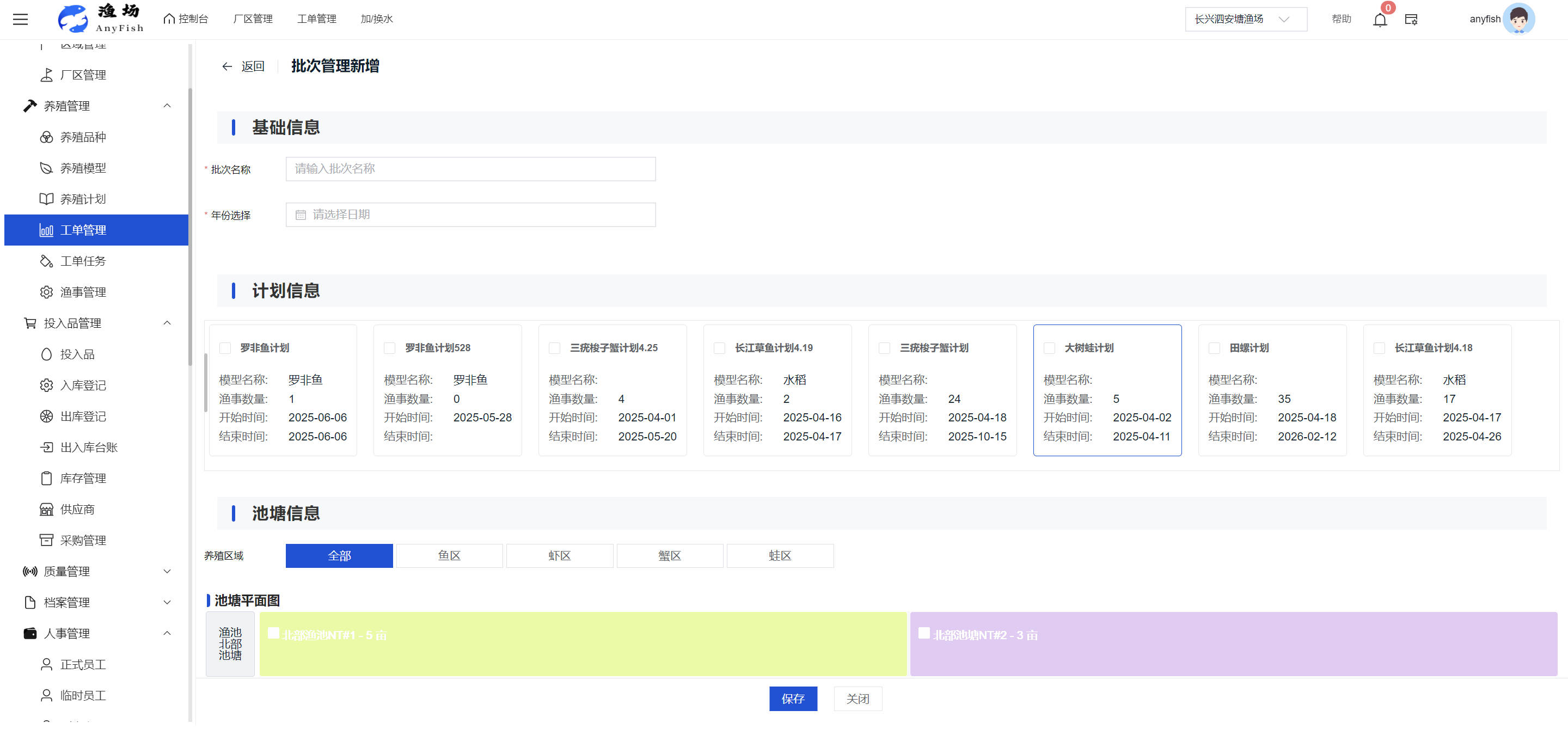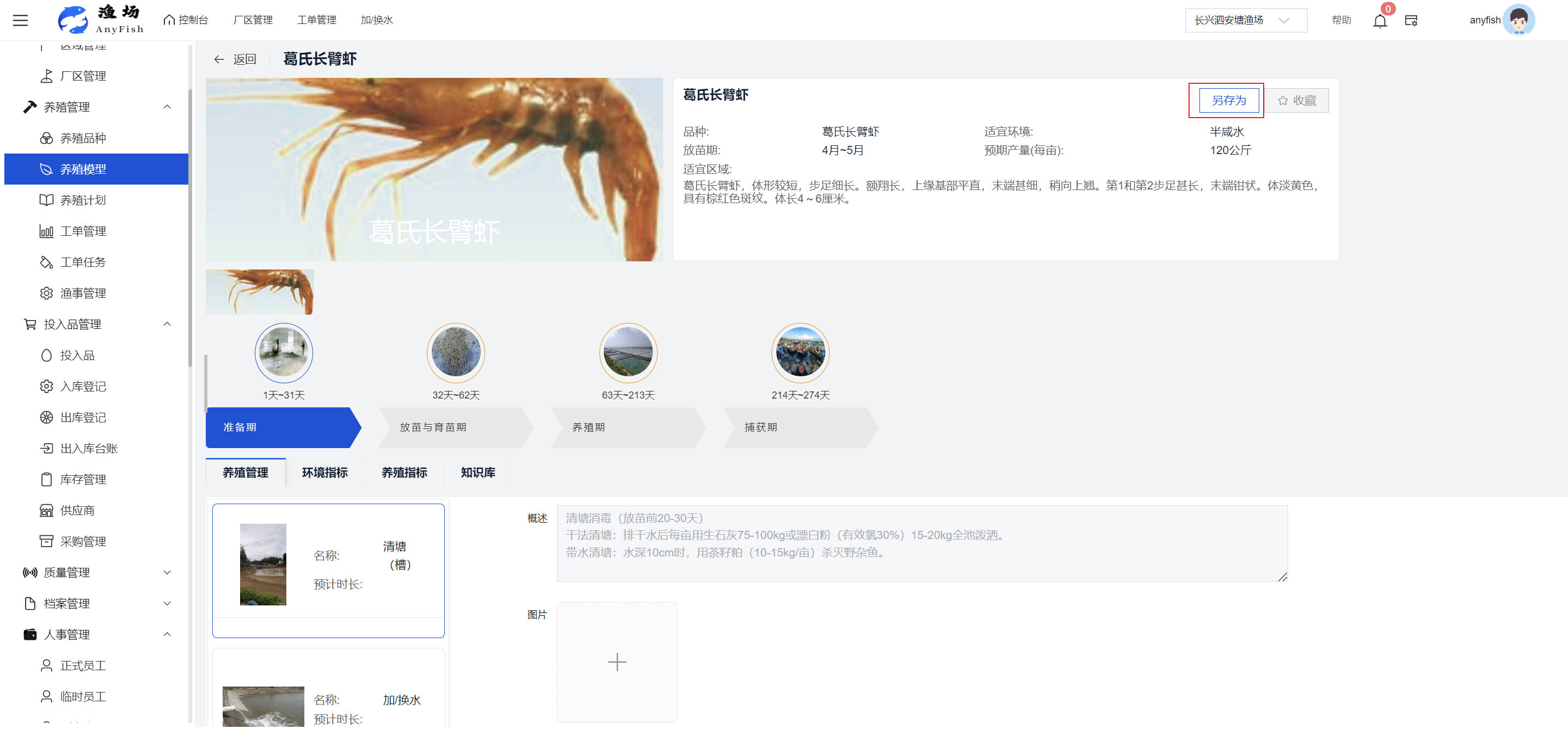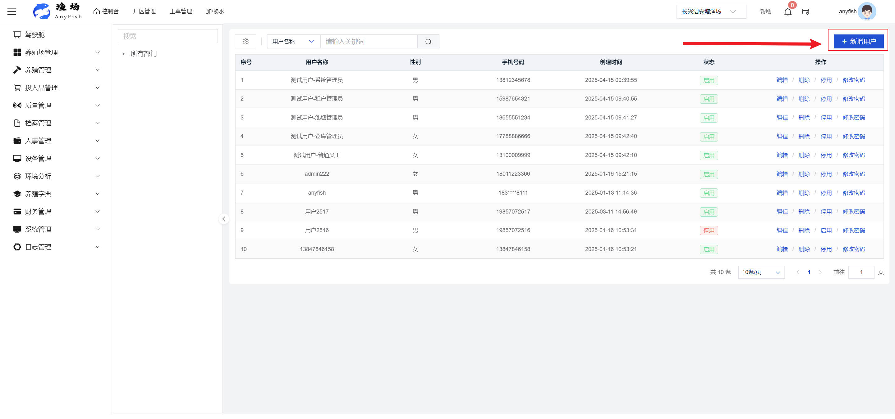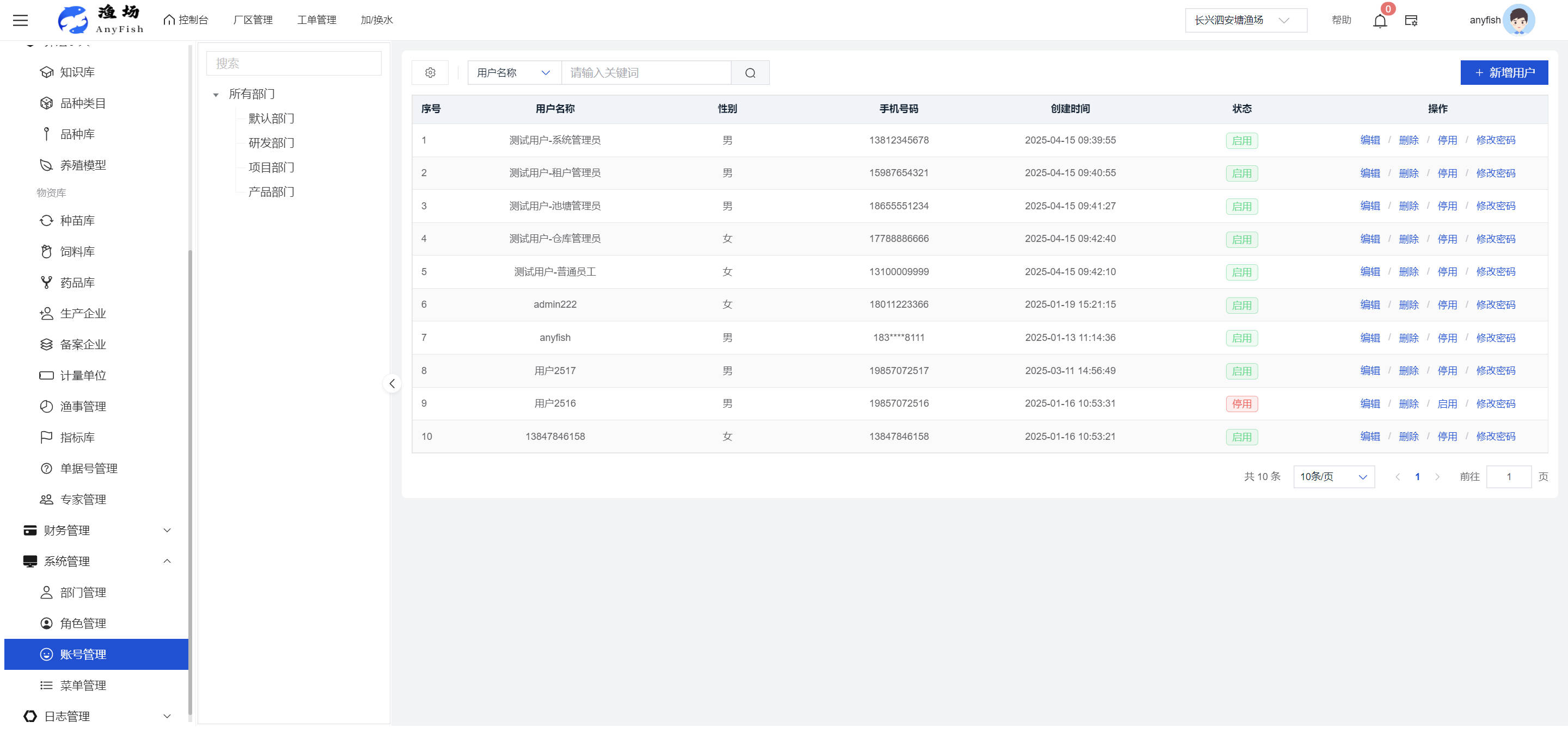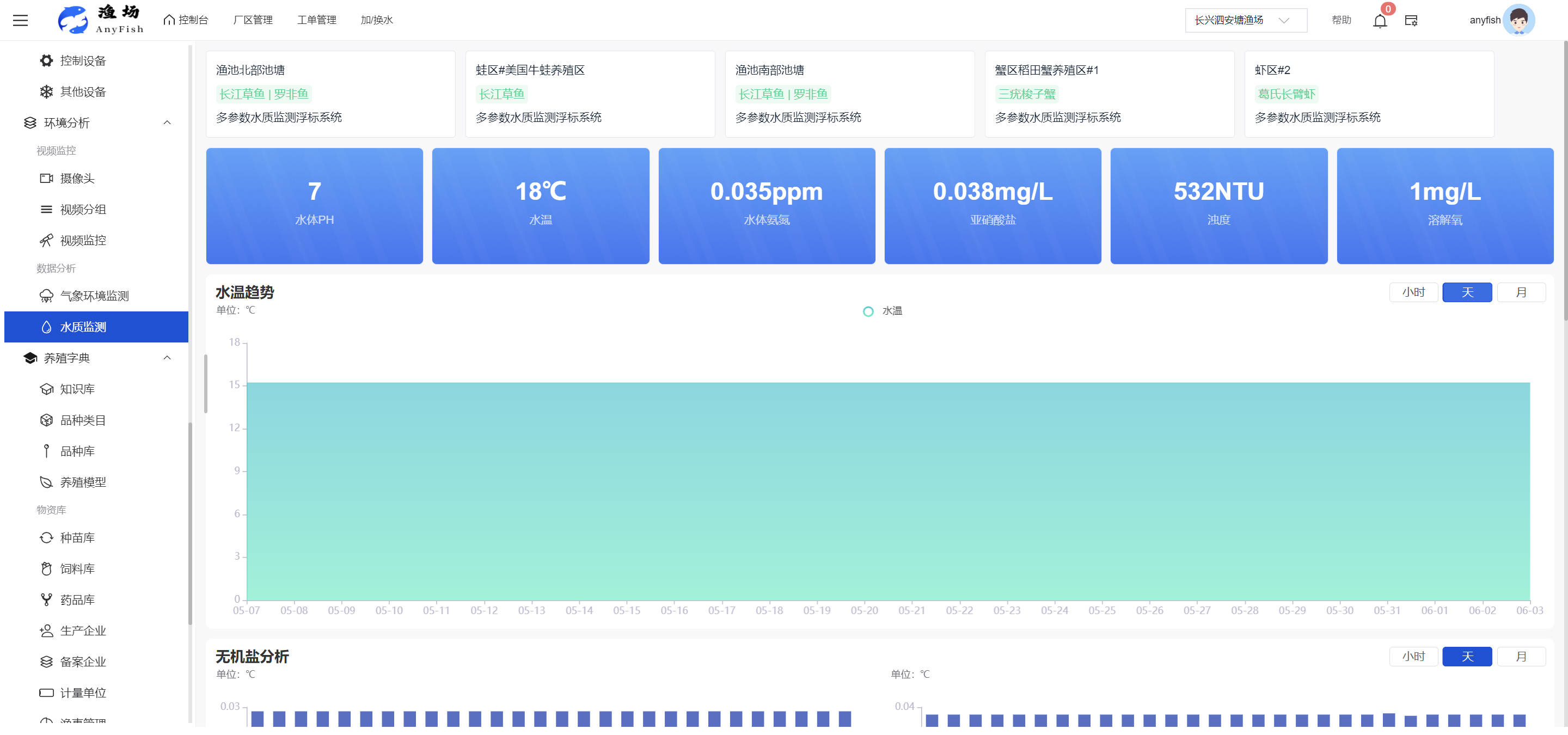 一、操作指南 1.1渔场概况 界面功能概述: 该界面作为渔场的首页及控制台界面,为用户呈现了渔场的整体概况信息。在这里,用户能够清晰地查看到渔场的数量、各个厂区的数量、当前在职的员工人数、实时的天气状况、已安装的摄像头设备数量以及是否存在离线设备等重要信息。同时,该界面还为用户提供了便捷的操作入口,例如可以进行渔场的管理操作以及新增员工等常用功能,方便用户对渔场的基本信息进行快速的了解和管理。  4.1.1.1 渔场概况 界面功能概述: 用户可以点击标红的地方跳转到渔场管理跳转到渔场管理界面。  用户点击界面中标红的区域即可跳转到渔场管理界面。在该界面中,用户可以全面了解渔场的各项详细信息,如渔场的占地面积、具体的养殖区域划分、在职员工的数量及基本信息、各类设备的运行情况、今日和明日的农事安排等。这些信息的展示有助于用户对渔场的整体运营状况有一个清晰的认识,同时也为后续的管理决策提供了有力的数据支持。此外,用户还可以在该界面进行一些基础的管理操作,如编辑渔场的基本信息、调整设备的设置等,以确保渔场的各项工作能够顺利进行。  4.1.1.2 渔场渔事 界面功能概述: 用户可以通过点击界面中标红的区域进入不同的渔事管理模块,例如培肥、投饵、收捕等常见的农事活动。  4.1.1.3 新增用户 界面元素功能概述: 该界面主要用于用户进行新增用户以及添加用户权限的操作。在渔场的日常运营中,可能需要不断添加新的员工或管理人员,并为他们分配相应的权限,以便他们能够顺利地完成各自的工作任务。通过该界面,用户可以方便地完成这些操作,确保渔场的人力资源管理更加高效和有序。  左侧搜索栏 :此搜索栏为用户提供了一个便捷的方式,允许用户在输入框内输入关键字,例如部门名称的关键词,从而快速搜索到特定的部门。这对于拥有多个部门的大型渔场来说,能够大大提高用户查找部门的效率,节省时间。 顶部搜索栏:在这里,用户可以在输入框内填写用户名称或关键词,以便快速搜索到特定的用户。当渔场员工数量较多时,通过关键词搜索能够迅速定位到目标用户,进而对其信息进行相应的操作,如查看、编辑或删除等。  新增用户按钮:点击该按钮后,系统会弹出一个新增用户的表单界面。  用户需要在该表单中填写完整的信息,包括但不限于用户名、密码、姓名、联系方式、所属部门、角色权限等。填写完成后,点击保存按钮,即可将新的用户成功添加到系统当中,使其能够登录并使用系统进行相关的工作操作。  编辑用户按钮:当用户需要修改员工的信息时,可以点击该按钮。  系统会跳转到员工信息编辑界面,在这里,用户可以对员工的基本信息、联系方式、角色权限等进行修改。修改完成后,点击保存按钮,即可使修改后的信息生效,确保员工的信息始终保持准确和更新。  删除按钮:如果需要删除某个员工账号,用户可以点击该删除按钮。系统会弹出一个确认对话框,提示用户是否确定要删除该员工。如果用户点击“是”,则系统将彻底删除该员工账号及其相关信息;如果用户点击“否”,则取消删除操作,员工账号保持不变。在删除员工账号时,用户需要谨慎操作,以免误删重要信息。  修改密码按钮:为了保障系统的安全性,用户可以通过点击该按钮来修改员工的密码。  在修改密码的界面中,用户需要输入新的密码并确认,然后点击保存按钮,即可完成密码的修改。修改后的密码将立即生效,员工需要使用新密码进行登录。这一功能在员工忘记密码或需要定期更新密码的情况下非常实用。  4.1.1.4 告警信息 界面功能概述: 该界面是一个渔场概况列表,主要展示渔场的基本情况以及各类告警信息。用户可以通过该界面查看渔场的详细信息,如渔场名称、位置、占地面积、当前的渔事活动等。  同时,系统会将各类告警信息以醒目的方式展示出来,包括设备故障告警、环境异常告警(如温度过高、湿度过低等)、渔事任务超时告警等。用户可以点击相应的告警信息,查看更多详细的告警内容,如告警发生的时间、具体的设备或区域、告警的严重程度等。此外,用户还可以在该界面进行一些相关的操作,如确认告警信息、查看告警处理进度、设置告警提醒方式等,以便及时处理各类问题,确保渔场的正常运营。  4.2渔场管理 4.2.1.渔场管理 摄像头管理 :用户可以在该界面中对摄像头进行添加、删除、调整位置等操作。通过合理配置摄像头,用户可以实现对渔场各个区域的实时监控,便于及时发现异常情况,保障渔场的安全。  4.2.2 厂区管理 界面功能概述 该界面是一个池塘列表,主要用于查看池塘的详细信息,包括池塘的占地面积、养殖模型、养殖面积、生长周期等。用户可以通过该界面全面了解各个池塘的基本情况,为养殖规划和渔事安排提供重要依据。同时,该界面还为用户提供了多种操作功能,如池塘管理操作、查看池塘详细信息等,方便用户对地块进行有效的管理和维护。  4.2.2.1 池塘管理:  添加旁边的搜索框(与添加按钮分开) :该搜索框允许用户输入关键词,如池塘名称、投入品名称或相关信息,进行快速搜索。通过输入关键词,系统将自动筛选出符合条件的池塘信息,方便用户在众多地块中快速找到目标池塘,提高工作效率。 添加按钮 :用户可以在右侧输入要添加的池塘信息,