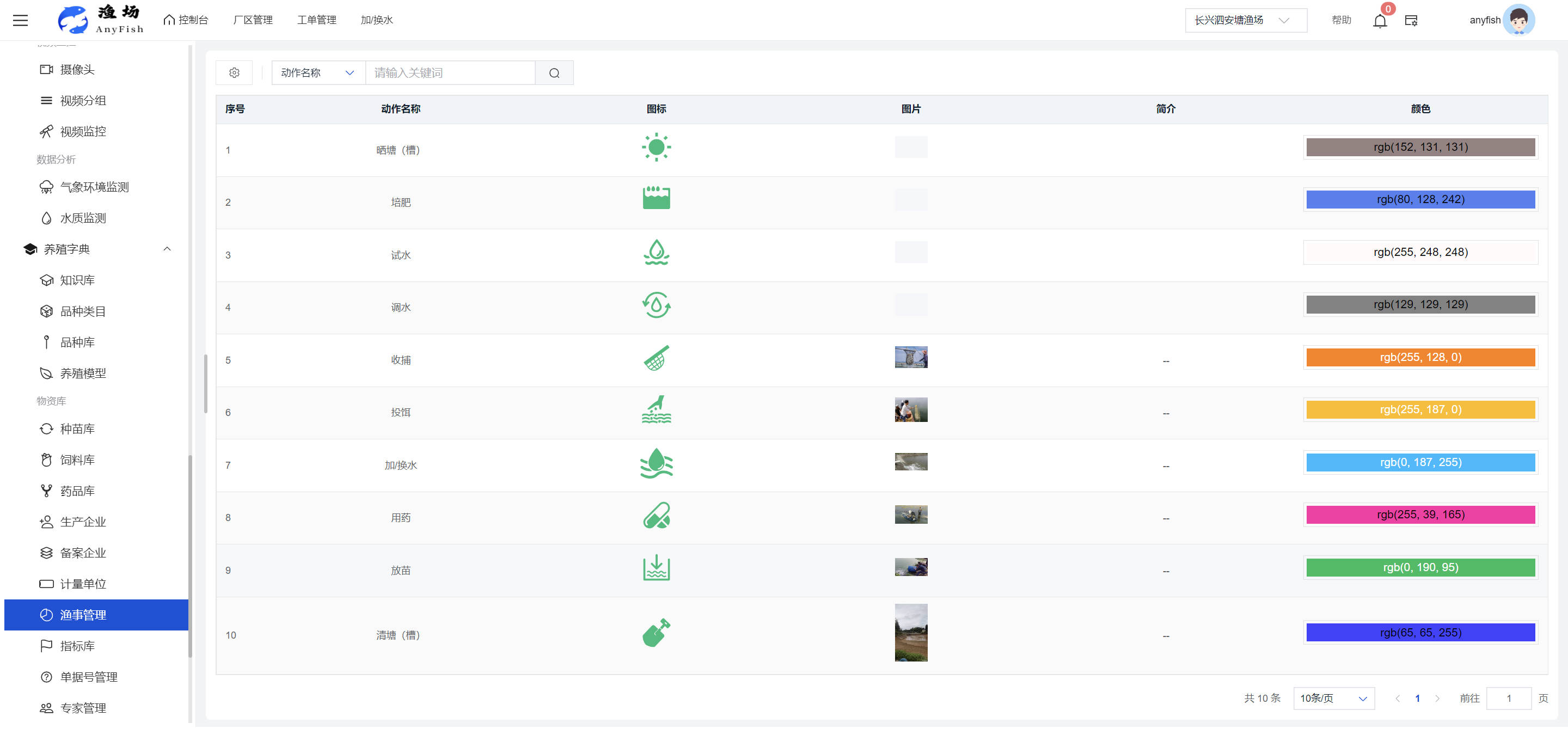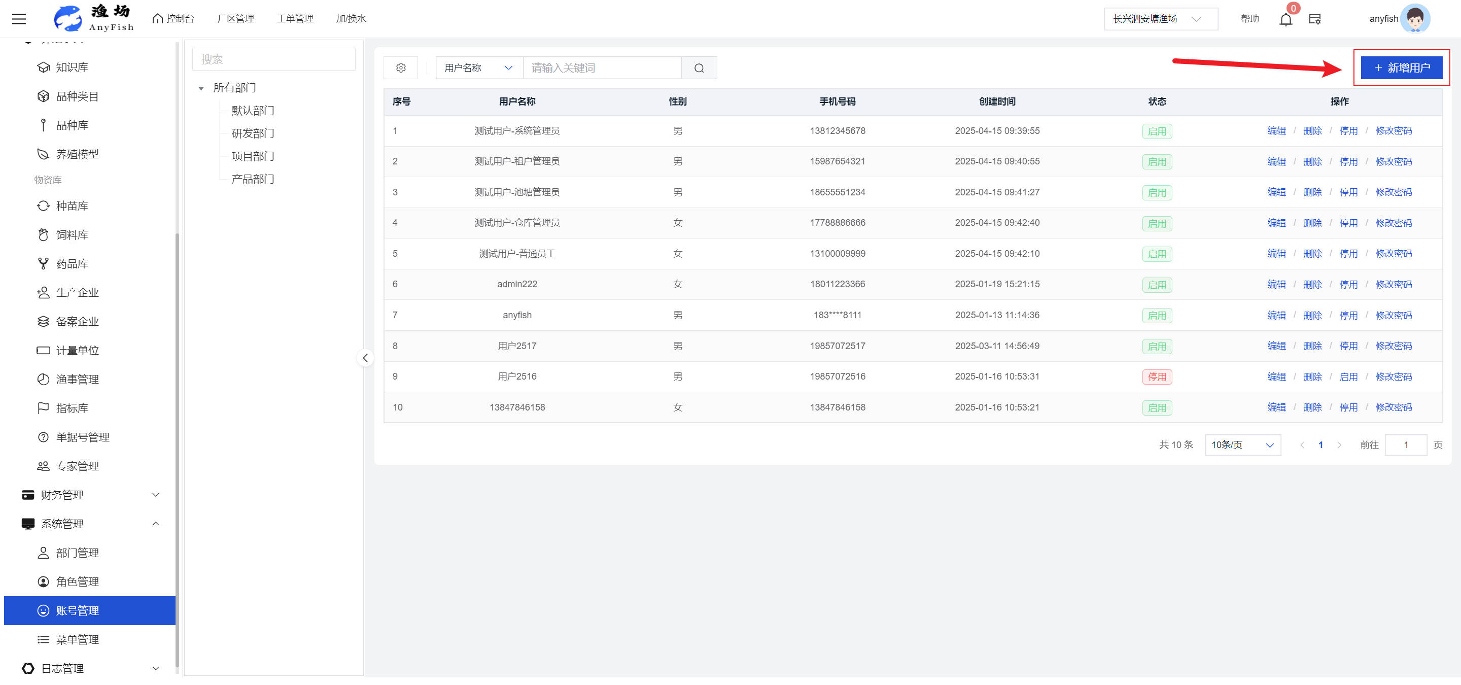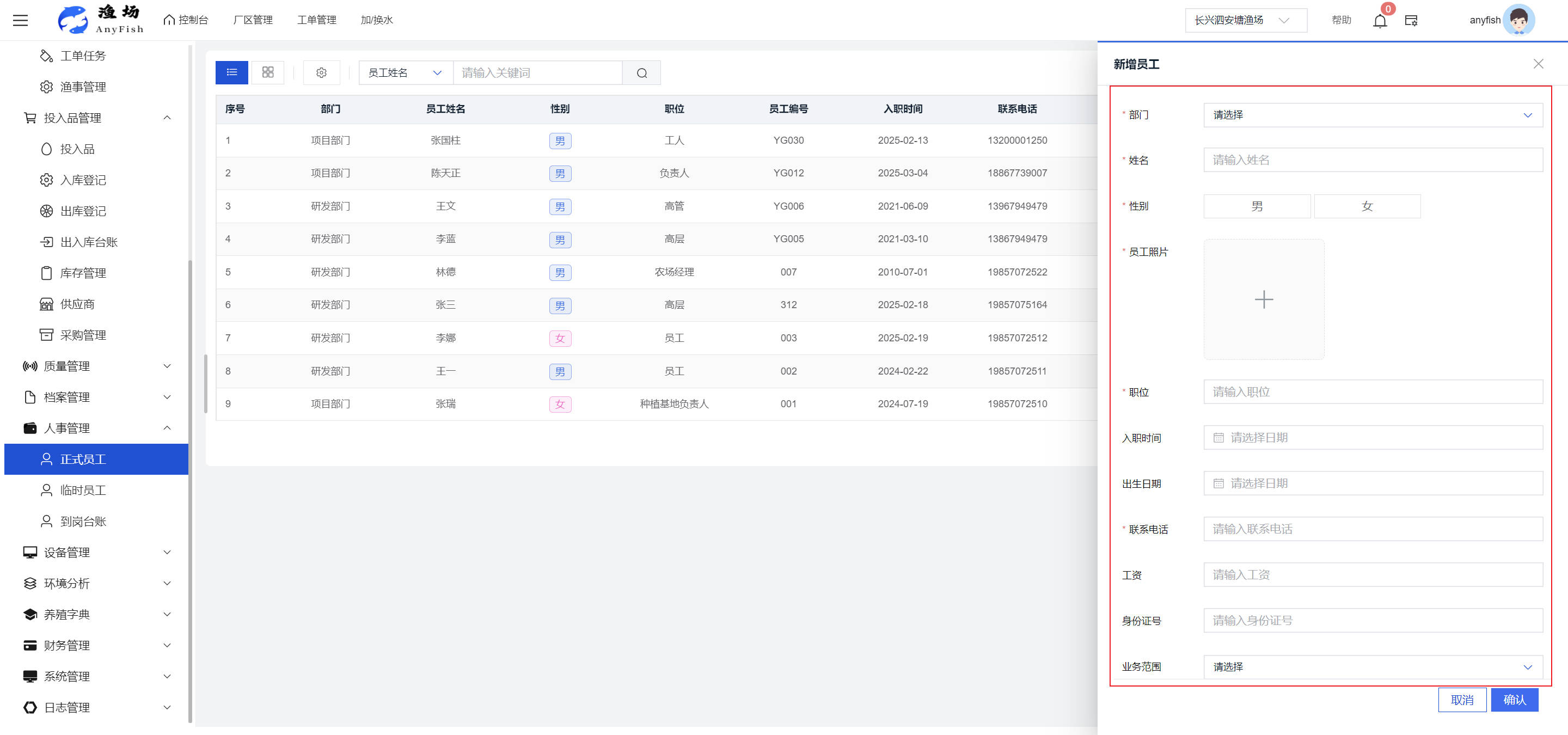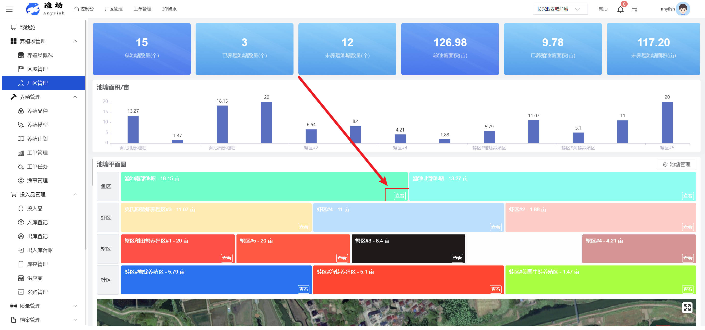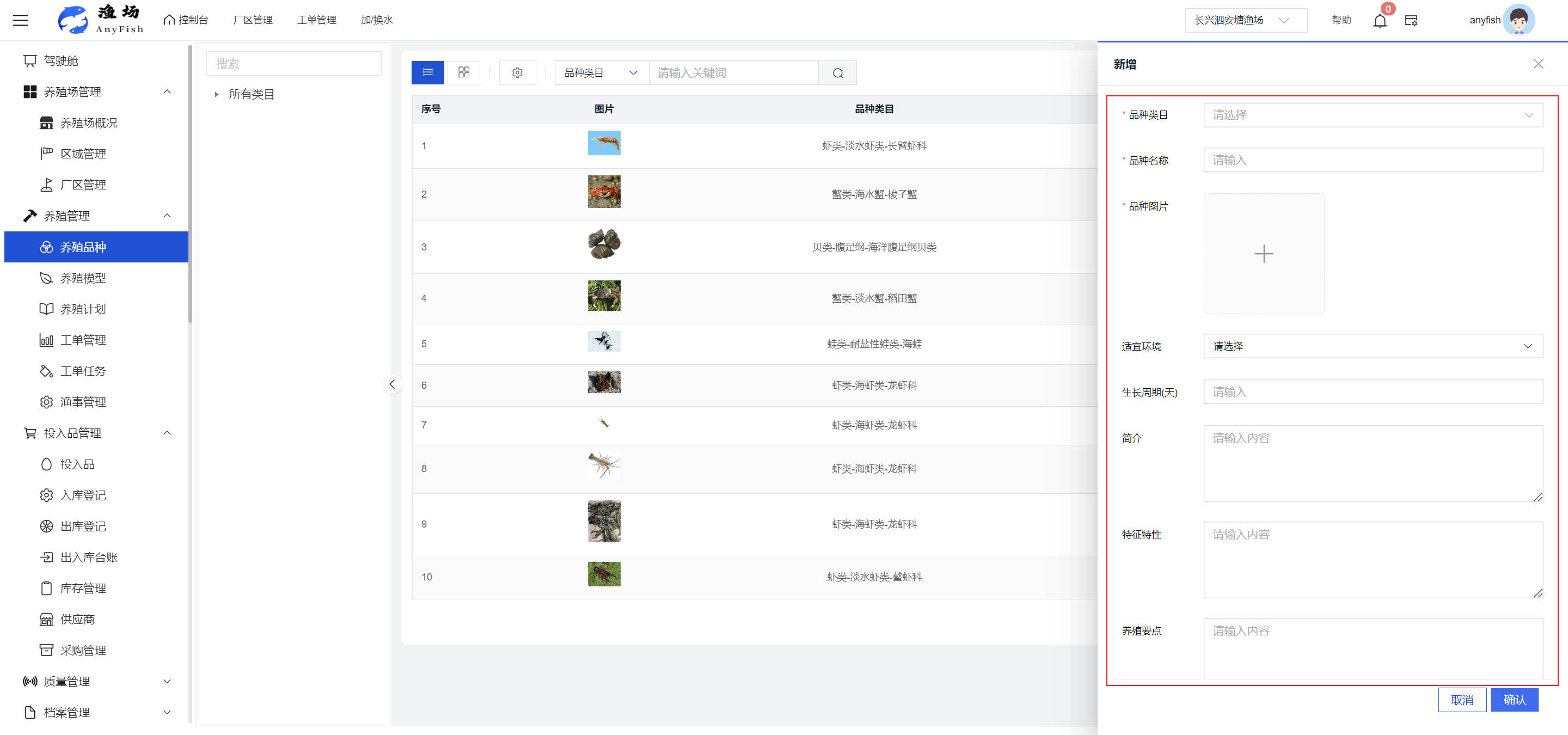 一、操作指南 1.1渔场概况 界面功能概述: 该界面作为渔场的首页及控制台界面,为用户呈现了渔场的整体概况信息。在这里,用户能够清晰地查看到渔场的数量、各个厂区的数量、当前在职的员工人数、实时的天气状况、已安装的摄像头设备数量以及是否存在离线设备等重要信息。同时,该界面还为用户提供了便捷的操作入口,例如可以进行渔场的管理操作以及新增员工等常用功能,方便用户对渔场的基本信息进行快速的了解和管理。  4.1.1.1 渔场概况 界面功能概述: 用户可以点击标红的地方跳转到渔场管理跳转到渔场管理界面。  用户点击界面中标红的区域即可跳转到渔场管理界面。在该界面中,用户可以全面了解渔场的各项详细信息,如渔场的占地面积、具体的养殖区域划分、在职员工的数量及基本信息、各类设备的运行情况、今日和明日的农事安排等。这些信息的展示有助于用户对渔场的整体运营状况有一个清晰的认识,同时也为后续的管理决策提供了有力的数据支持。此外,用户还可以在该界面进行一些基础的管理操作,如编辑渔场的基本信息、调整设备的设置等,以确保渔场的各项工作能够顺利进行。  4.1.1.2 渔场渔事 界面功能概述: 用户可以通过点击界面中标红的区域进入不同的渔事管理模块,例如培肥、投饵、收捕等常见的农事活动。  4.1.1.3 新增用户 界面元素功能概述: 该界面主要用于用户进行新增用户以及添加用户权限的操作。在渔场的日常运营中,可能需要不断添加新的员工或管理人员,并为他们分配相应的权限,以便他们能够顺利地完成各自的工作任务。通过该界面,用户可以方便地完成这些操作,确保渔场的人力资源管理更加高效和有序。  左侧搜索栏 :此搜索栏为用户提供了一个便捷的方式,允许用户在输入框内输入关键字,例如部门名称的关键词,从而快速搜索到特定的部门。这对于拥有多个部门的大型渔场来说,能够大大提高用户查找部门的效率,节省时间。 顶部搜索栏:在这里,用户可以在输入框内填写用户名称或关键词,以便快速搜索到特定的用户。当渔场员工数量较多时,通过关键词搜索能够迅速定位到目标用户,进而对其信息进行相应的操作,如查看、编辑或删除等。  新增用户按钮:点击该按钮后,系统会弹出一个新增用户的表单界面。  用户需要在该表单中填写完整的信息,包括但不限于用户名、密码、姓名、联系方式、所属部门、角色权限等。填写完成后,点击保存按钮,即可将新的用户成功添加到系统当中,使其能够登录并使用系统进行相关的工作操作。  编辑用户按钮:当用户需要修改员工的信息时,可以点击该按钮。  系统会跳转到员工信息编辑界面,在这里,用户可以对员工的基本信息、联系方式、角色权限等进行修改。修改完成后,点击保存按钮,即可使修改后的信息生效,确保员工的信息始终保持准确和更新。  删除按钮:如果需要删除某个员工账号,用户可以点击该删除按钮。系统会弹出一个确认对话框,提示用户是否确定要删除该员工。如果用户点击“是”,则系统将彻底删除该员工账号及其相关信息;如果用户点击“否”,则取消删除操作,员工账号保持不变。在删除员工账号时,用户需要谨慎操作,以免误删重要信息。  修改密码按钮:为了保障系统的安全性,用户可以通过点击该按钮来修改员工的密码。  在修改密码的界面中,用户需要输入新的密码并确认,然后点击保存按钮,即可完成密码的修改。修改后的密码将立即生效,员工需要使用新密码进行登录。这一功能在员工忘记密码或需要定期更新密码的情况下非常实用。  4.1.1.4 告警信息 界面功能概述: 该界面是一个渔场概况列表,主要展示渔场的基本情况以及各类告警信息。用户可以通过该界面查看渔场的详细信息,如渔场名称、位置、占地面积、当前的渔事活动等。  同时,系统会将各类告警信息以醒目的方式展示出来,包括设备故障告警、环境异常告警(如温度过高、湿度过低等)、渔事任务超时告警等。用户可以点击相应的告警信息,查看更多详细的告警内容,如告警发生的时间、具体的设备或区域、告警的严重程度等。此外,用户还可以在该界面进行一些相关的操作,如确认告警信息、查看告警处理进度、设置告警提醒方式等,以便及时处理各类问题,确保渔场的正常运营。  4.2渔场管理 4.2.1.渔场管理 摄像头管理 :用户可以在该界面中对摄像头进行添加、删除、调整位置等操作。通过合理配置摄像头,用户可以实现对渔场各个区域的实时监控,便于及时发现异常情况,保障渔场的安全。  4.2.2 厂区管理 界面功能概述 该界面是一个池塘列表,主要用于查看池塘的详细信息,包括池塘的占地面积、养殖模型、养殖面积、生长周期等。用户可以通过该界面全面了解各个池塘的基本情况,为养殖规划和渔事安排提供重要依据。同时,该界面还为用户提供了多种操作功能,如池塘管理操作、查看池塘详细信息等,方便用户对地块进行有效的管理和维护。  4.2.2.1 池塘管理:  添加旁边的搜索框(与添加按钮分开) :该搜索框允许用户输入关键词,如池塘名称、投入品名称或相关信息,进行快速搜索。通过输入关键词,系统将自动筛选出符合条件的池塘信息,方便用户在众多地块中快速找到目标池塘,提高工作效率。 添加按钮 :用户可以在右侧输入要添加的池塘信息,