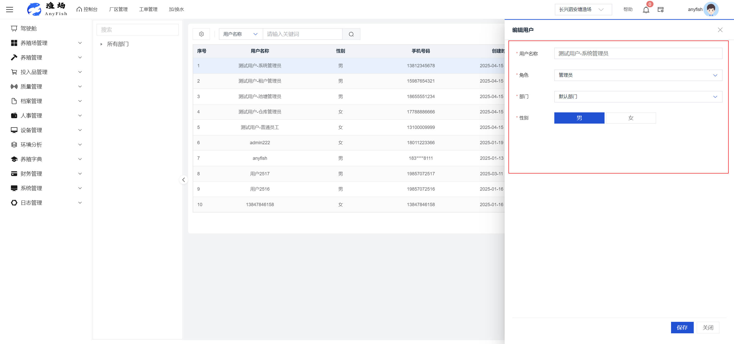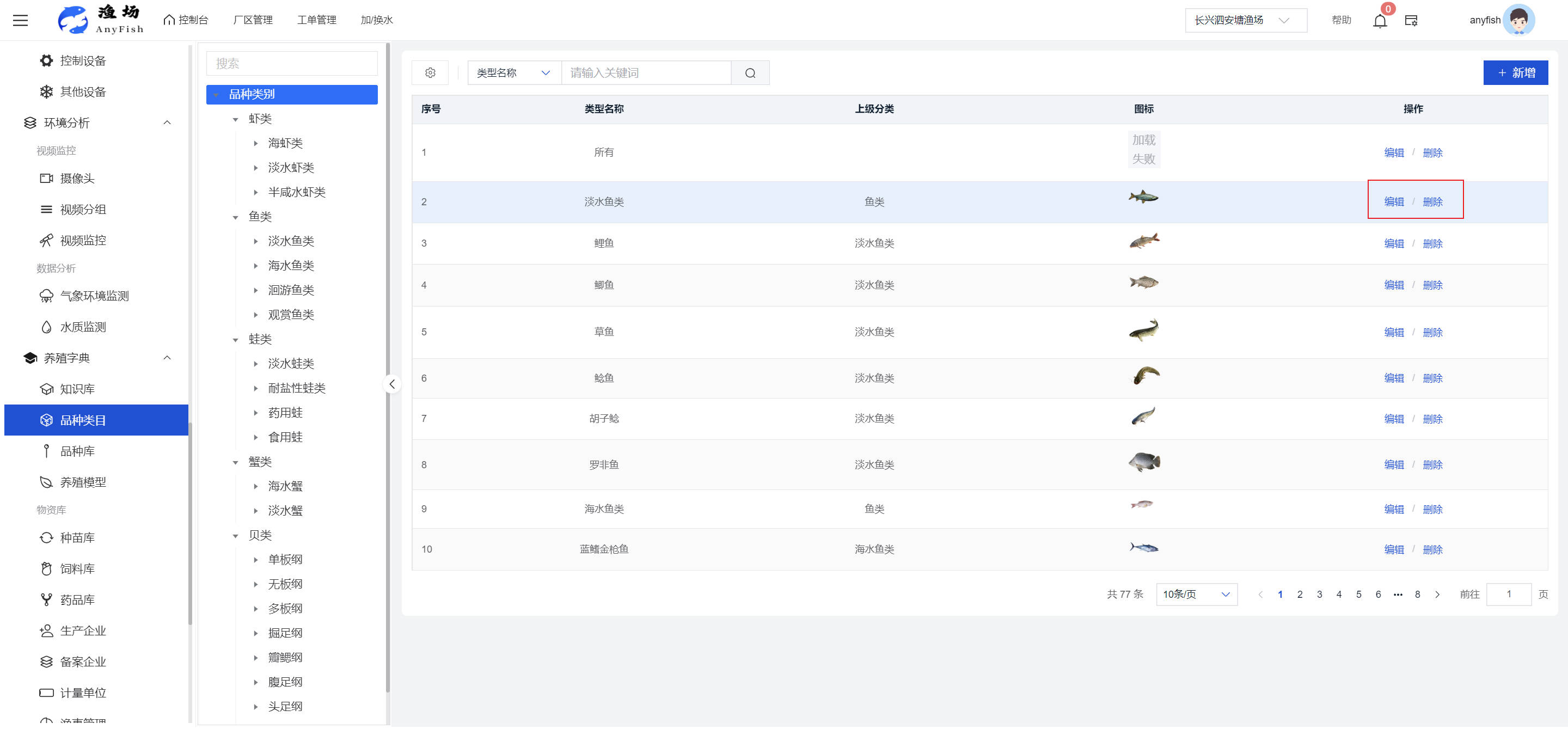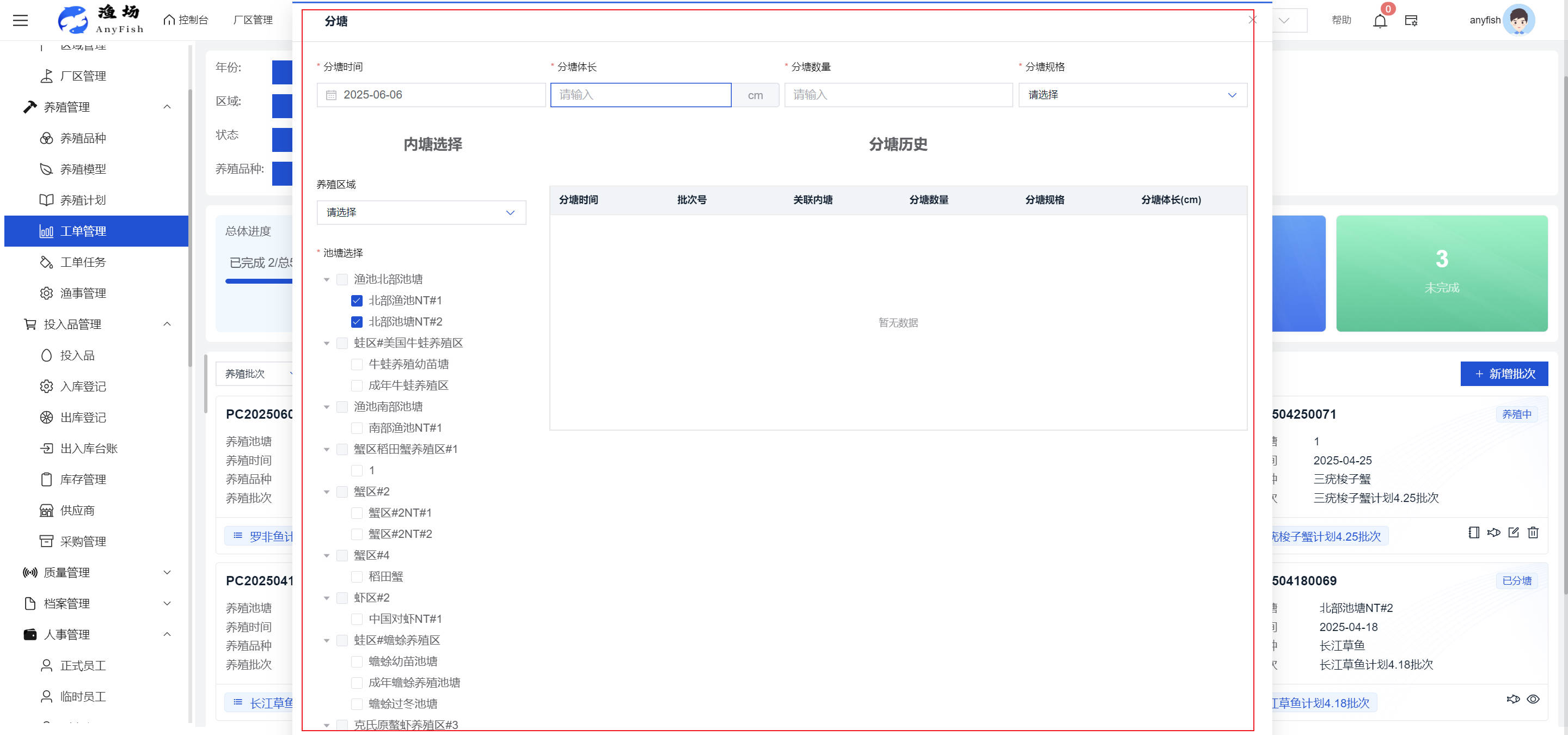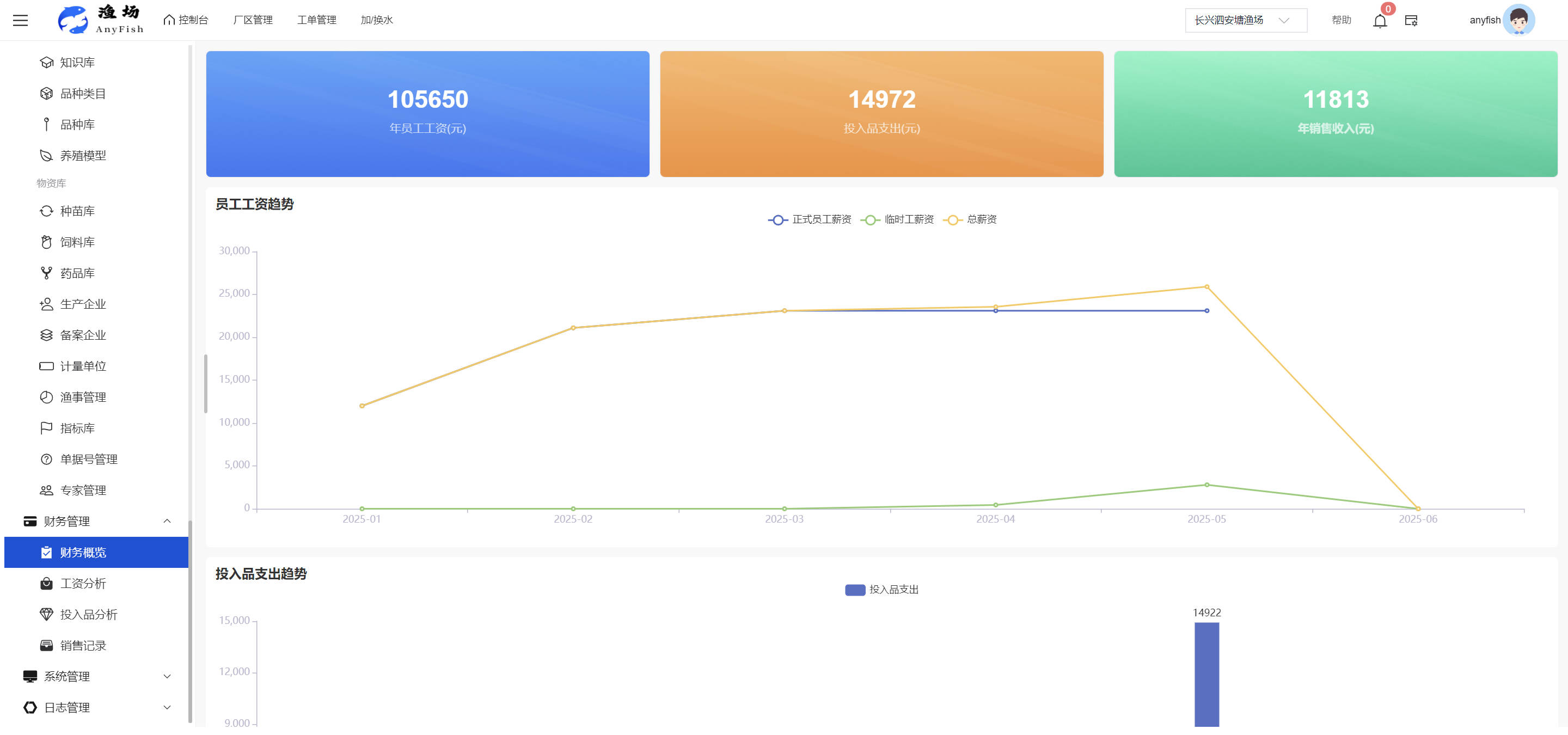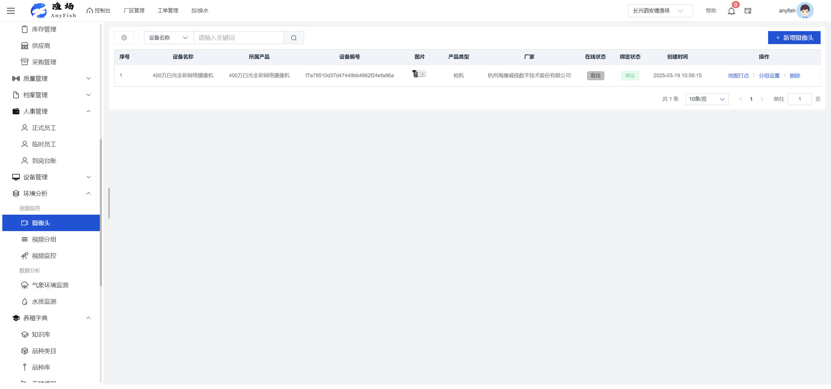 一、操作指南 1.1渔场概况 界面功能概述: 该界面作为渔场的首页及控制台界面,为用户呈现了渔场的整体概况信息。在这里,用户能够清晰地查看到渔场的数量、各个厂区的数量、当前在职的员工人数、实时的天气状况、已安装的摄像头设备数量以及是否存在离线设备等重要信息。同时,该界面还为用户提供了便捷的操作入口,例如可以进行渔场的管理操作以及新增员工等常用功能,方便用户对渔场的基本信息进行快速的了解和管理。  4.1.1.1 渔场概况 界面功能概述: 用户可以点击标红的地方跳转到渔场管理跳转到渔场管理界面。  用户点击界面中标红的区域即可跳转到渔场管理界面。在该界面中,用户可以全面了解渔场的各项详细信息,如渔场的占地面积、具体的养殖区域划分、在职员工的数量及基本信息、各类设备的运行情况、今日和明日的农事安排等。这些信息的展示有助于用户对渔场的整体运营状况有一个清晰的认识,同时也为后续的管理决策提供了有力的数据支持。此外,用户还可以在该界面进行一些基础的管理操作,如编辑渔场的基本信息、调整设备的设置等,以确保渔场的各项工作能够顺利进行。  4.1.1.2 渔场渔事 界面功能概述: 用户可以通过点击界面中标红的区域进入不同的渔事管理模块,例如培肥、投饵、收捕等常见的农事活动。  4.1.1.3 新增用户 界面元素功能概述: 该界面主要用于用户进行新增用户以及添加用户权限的操作。在渔场的日常运营中,可能需要不断添加新的员工或管理人员,并为他们分配相应的权限,以便他们能够顺利地完成各自的工作任务。通过该界面,用户可以方便地完成这些操作,确保渔场的人力资源管理更加高效和有序。  左侧搜索栏 :此搜索栏为用户提供了一个便捷的方式,允许用户在输入框内输入关键字,例如部门名称的关键词,从而快速搜索到特定的部门。这对于拥有多个部门的大型渔场来说,能够大大提高用户查找部门的效率,节省时间。 顶部搜索栏:在这里,用户可以在输入框内填写用户名称或关键词,以便快速搜索到特定的用户。当渔场员工数量较多时,通过关键词搜索能够迅速定位到目标用户,进而对其信息进行相应的操作,如查看、编辑或删除等。  新增用户按钮:点击该按钮后,系统会弹出一个新增用户的表单界面。  用户需要在该表单中填写完整的信息,包括但不限于用户名、密码、姓名、联系方式、所属部门、角色权限等。填写完成后,点击保存按钮,即可将新的用户成功添加到系统当中,使其能够登录并使用系统进行相关的工作操作。  编辑用户按钮:当用户需要修改员工的信息时,可以点击该按钮。  系统会跳转到员工信息编辑界面,在这里,用户可以对员工的基本信息、联系方式、角色权限等进行修改。修改完成后,点击保存按钮,即可使修改后的信息生效,确保员工的信息始终保持准确和更新。  删除按钮:如果需要删除某个员工账号,用户可以点击该删除按钮。系统会弹出一个确认对话框,提示用户是否确定要删除该员工。如果用户点击“是”,则系统将彻底删除该员工账号及其相关信息;如果用户点击“否”,则取消删除操作,员工账号保持不变。在删除员工账号时,用户需要谨慎操作,以免误删重要信息。  修改密码按钮:为了保障系统的安全性,用户可以通过点击该按钮来修改员工的密码。  在修改密码的界面中,用户需要输入新的密码并确认,然后点击保存按钮,即可完成密码的修改。修改后的密码将立即生效,员工需要使用新密码进行登录。这一功能在员工忘记密码或需要定期更新密码的情况下非常实用。  4.1.1.4 告警信息 界面功能概述: 该界面是一个渔场概况列表,主要展示渔场的基本情况以及各类告警信息。用户可以通过该界面查看渔场的详细信息,如渔场名称、位置、占地面积、当前的渔事活动等。  同时,系统会将各类告警信息以醒目的方式展示出来,包括设备故障告警、环境异常告警(如温度过高、湿度过低等)、渔事任务超时告警等。用户可以点击相应的告警信息,查看更多详细的告警内容,如告警发生的时间、具体的设备或区域、告警的严重程度等。此外,用户还可以在该界面进行一些相关的操作,如确认告警信息、查看告警处理进度、设置告警提醒方式等,以便及时处理各类问题,确保渔场的正常运营。  4.2渔场管理 4.2.1.渔场管理 摄像头管理 :用户可以在该界面中对摄像头进行添加、删除、调整位置等操作。通过合理配置摄像头,用户可以实现对渔场各个区域的实时监控,便于及时发现异常情况,保障渔场的安全。  4.2.2 厂区管理 界面功能概述 该界面是一个池塘列表,主要用于查看池塘的详细信息,包括池塘的占地面积、养殖模型、养殖面积、生长周期等。用户可以通过该界面全面了解各个池塘的基本情况,为养殖规划和渔事安排提供重要依据。同时,该界面还为用户提供了多种操作功能,如池塘管理操作、查看池塘详细信息等,方便用户对地块进行有效的管理和维护。  4.2.2.1 池塘管理:  添加旁边的搜索框(与添加按钮分开) :该搜索框允许用户输入关键词,如池塘名称、投入品名称或相关信息,进行快速搜索。通过输入关键词,系统将自动筛选出符合条件的池塘信息,方便用户在众多地块中快速找到目标池塘,提高工作效率。 添加按钮 :用户可以在右侧输入要添加的池塘信息,